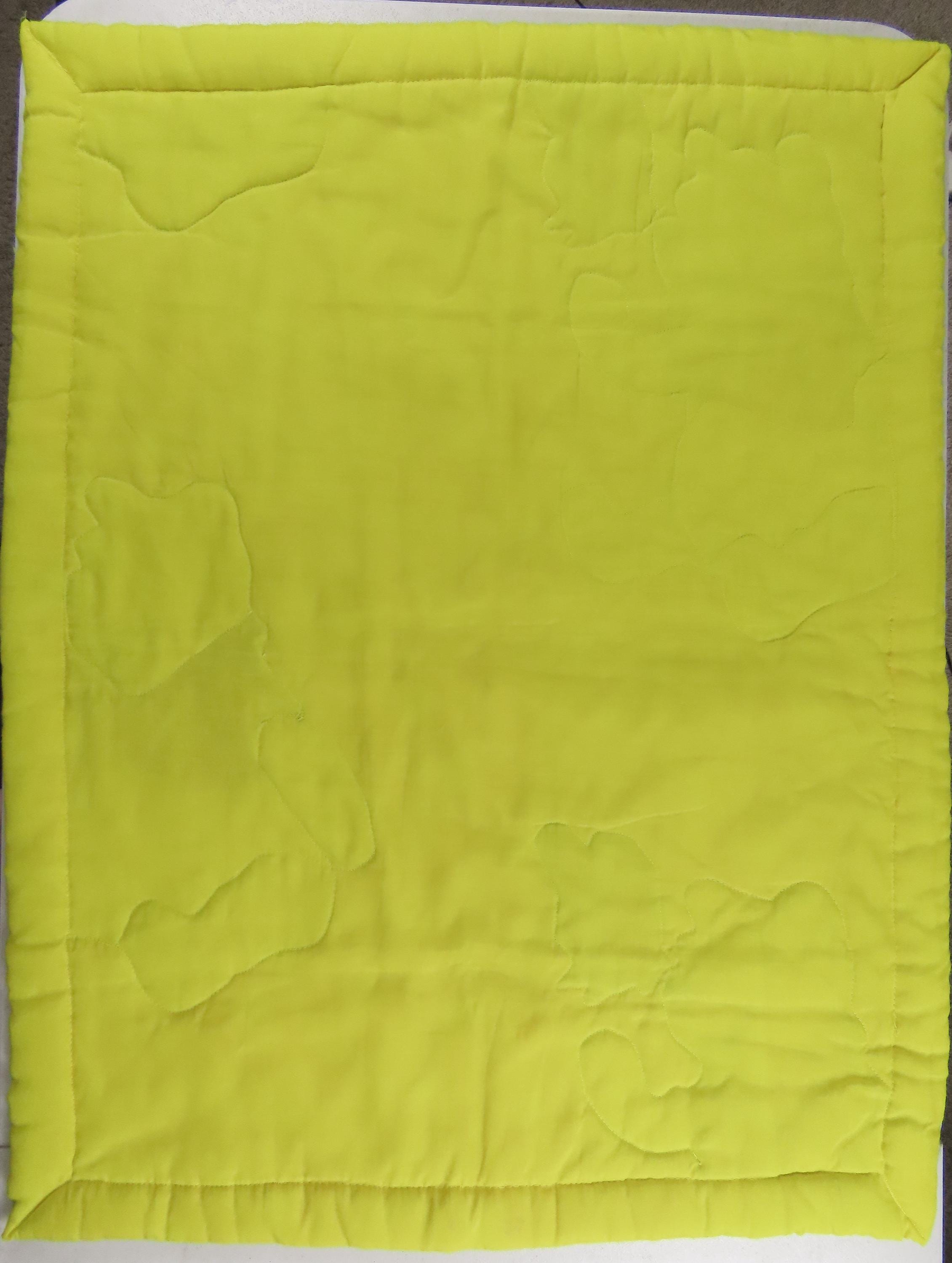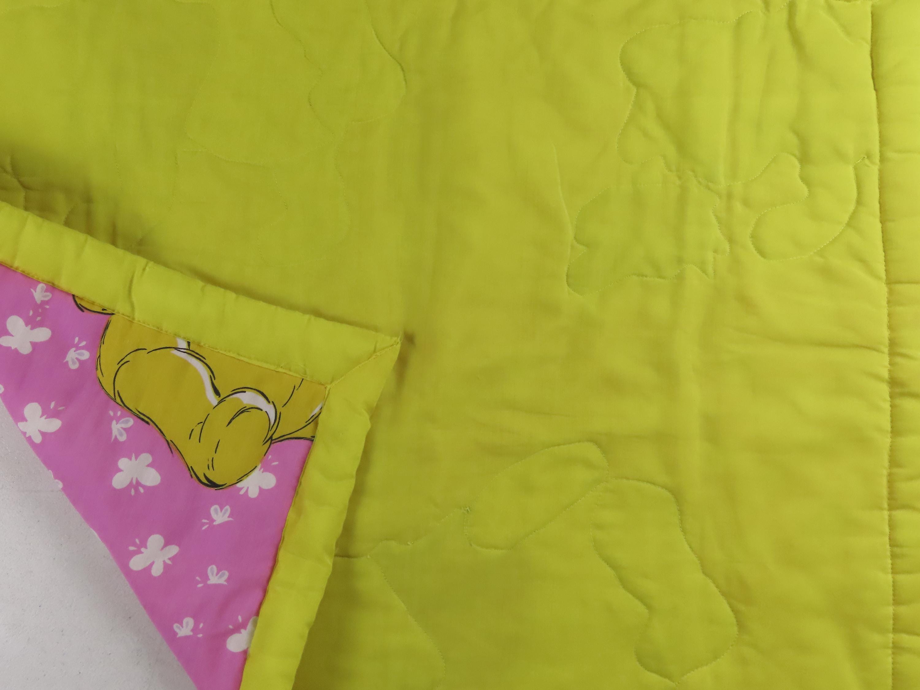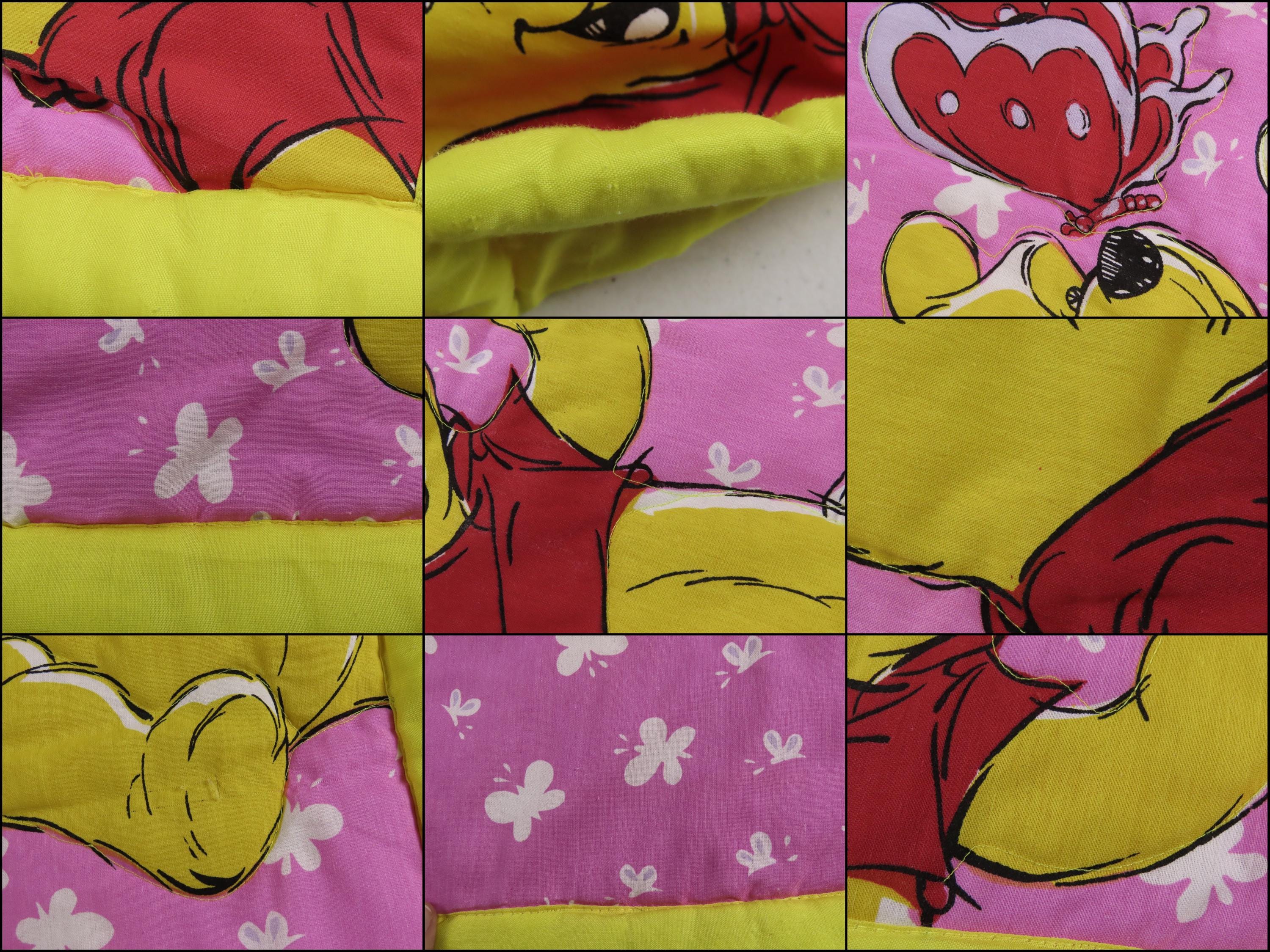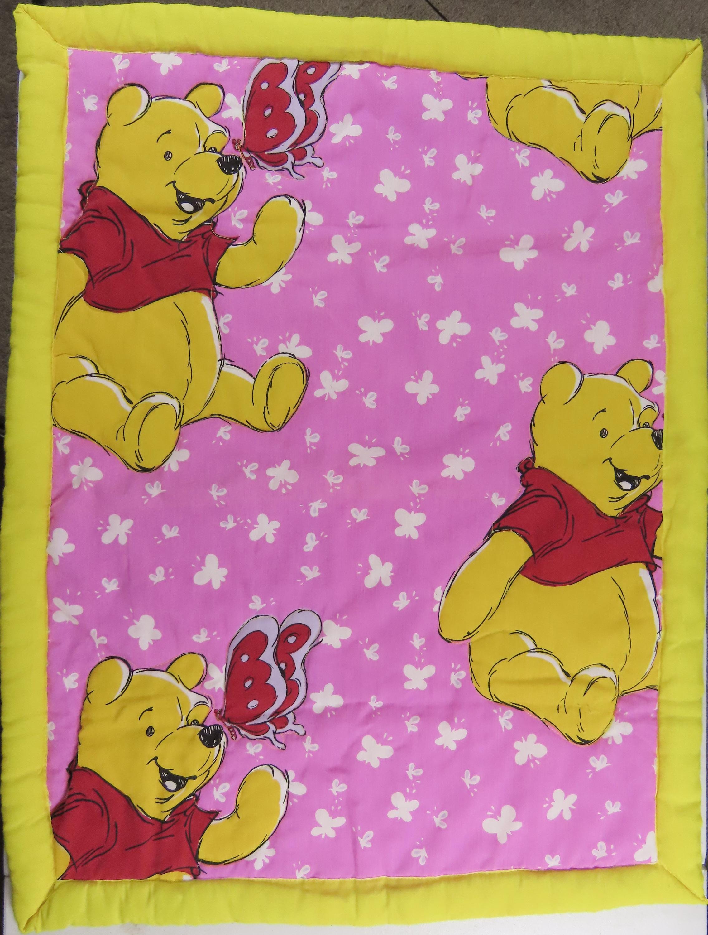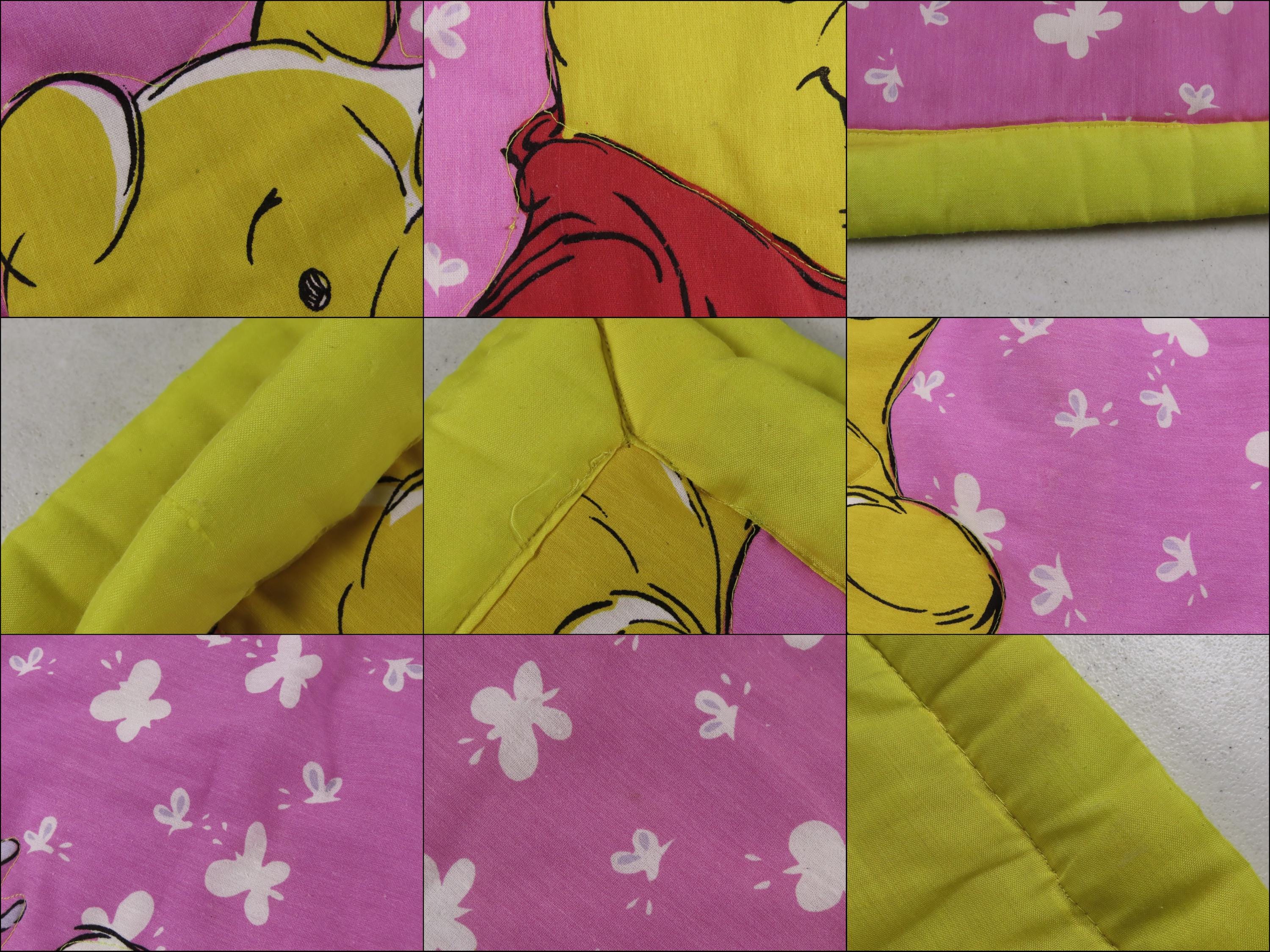 Vintage Winnie the Pooh blanket or playmat which is about 39" tall by by 29.5" wide (98 cm by 75 cm). The yellow hem is much thicker than the main part, which is why I'm not sure if it is a playmat or blanket. The main part of the blanket is not very thick. My camera had a hard time picking up the exact colors. The edges are a little uneven. It has pilling in areas, thread snags, and multiple missing thread spots. There are tiny marks, a few small stains/blemishes, and a mark/stain cluster on the edge of the backside. It has light whitish marks, some loose threads, and the colors are streaky in areas.