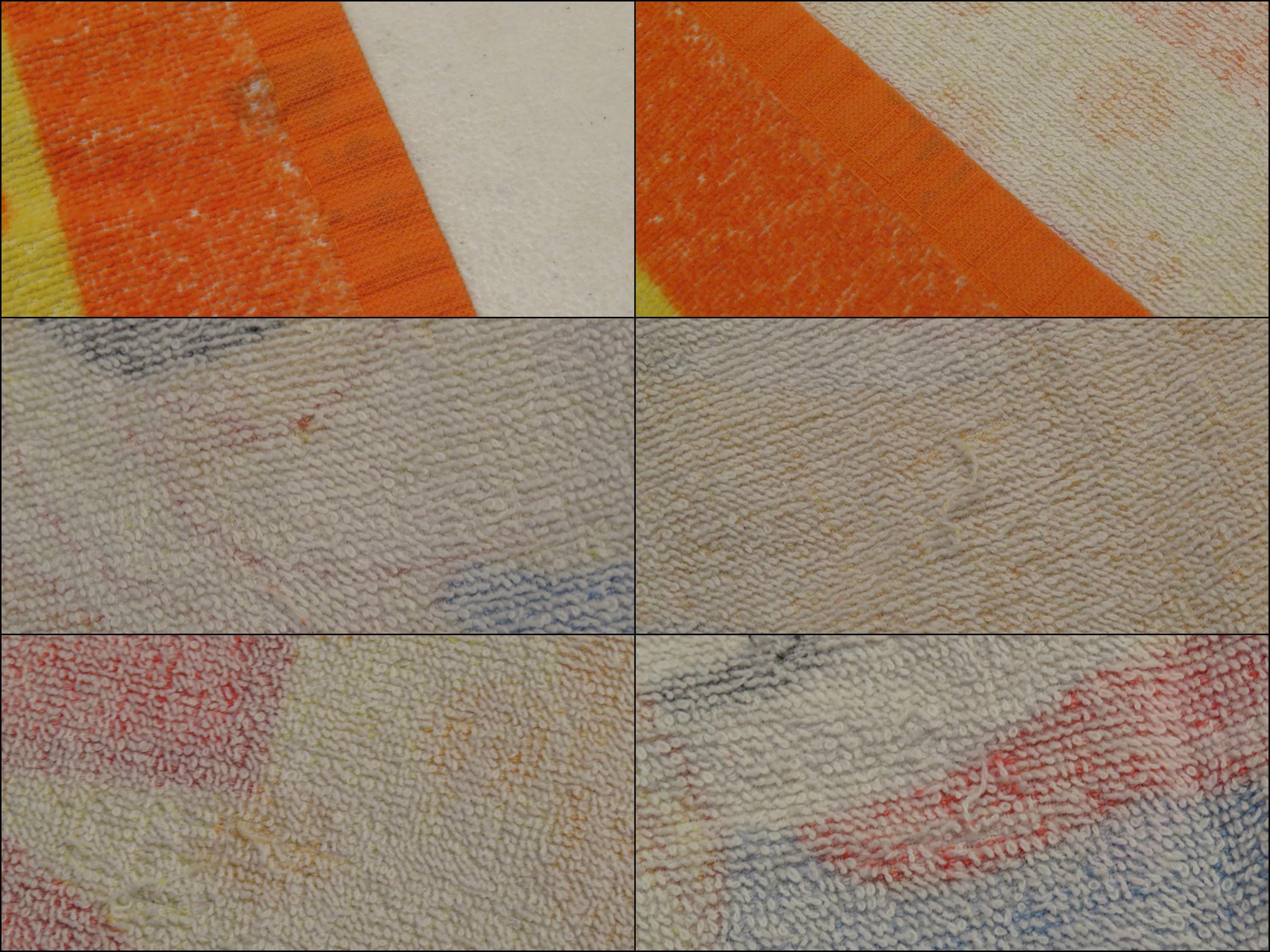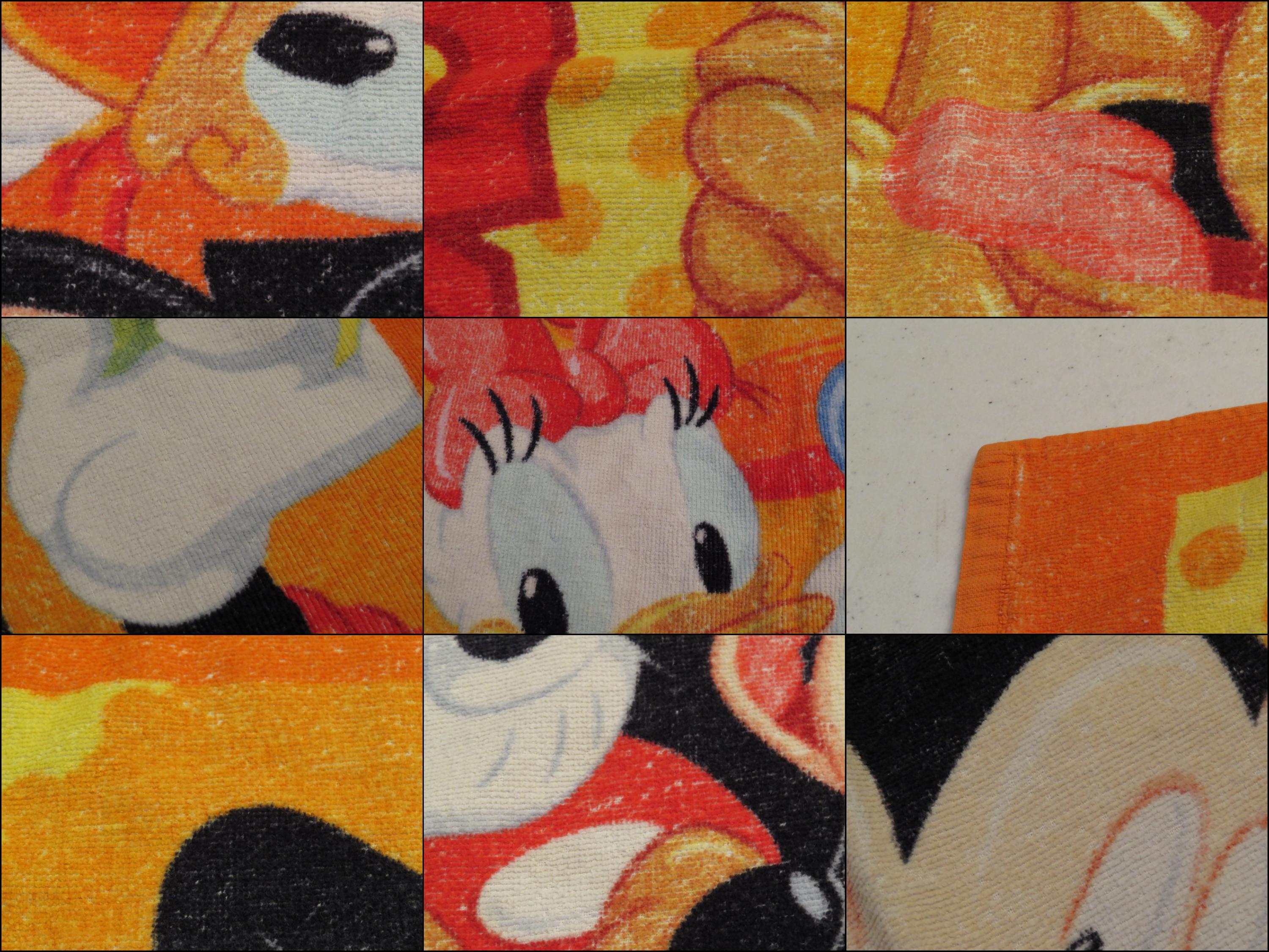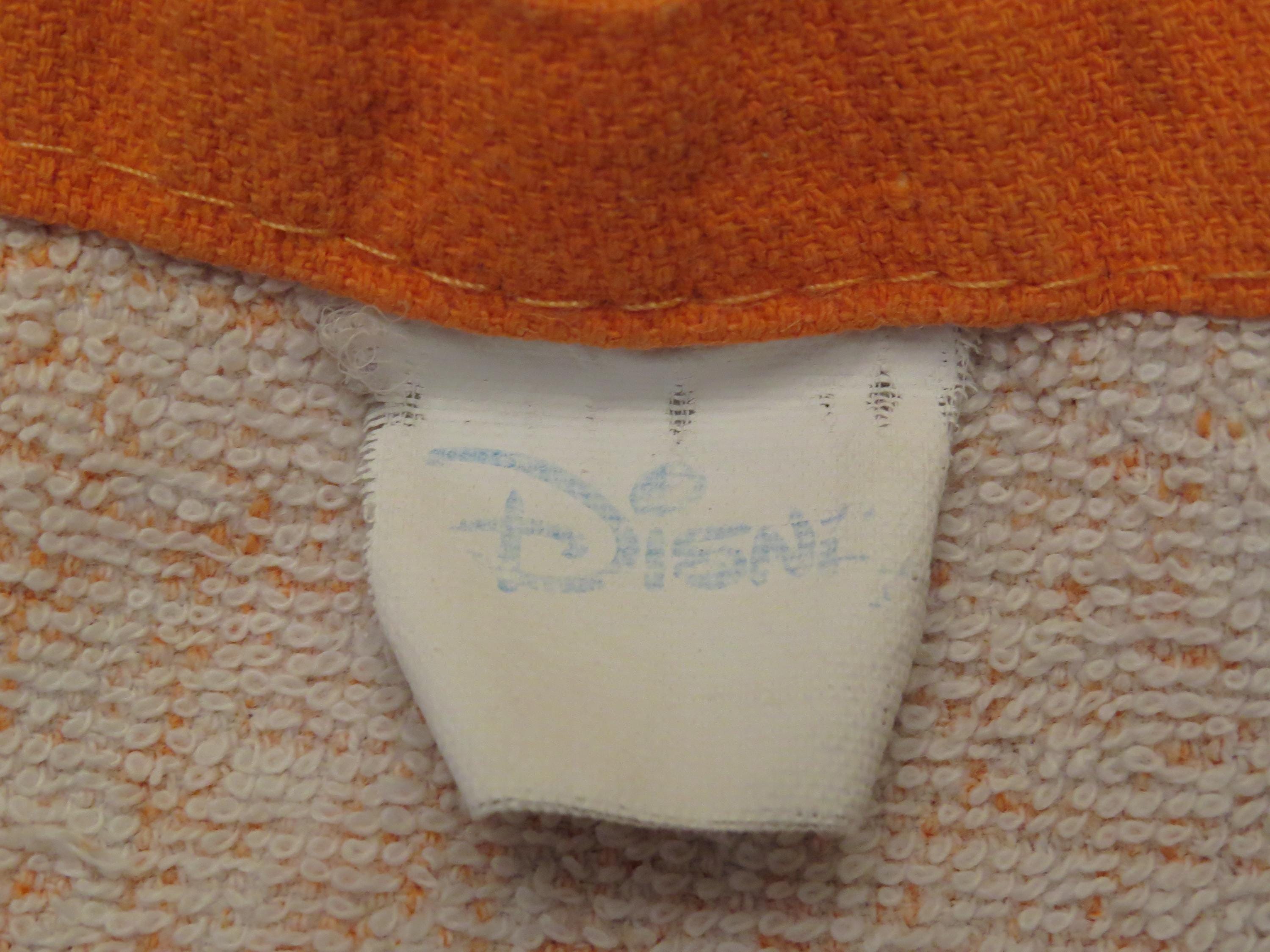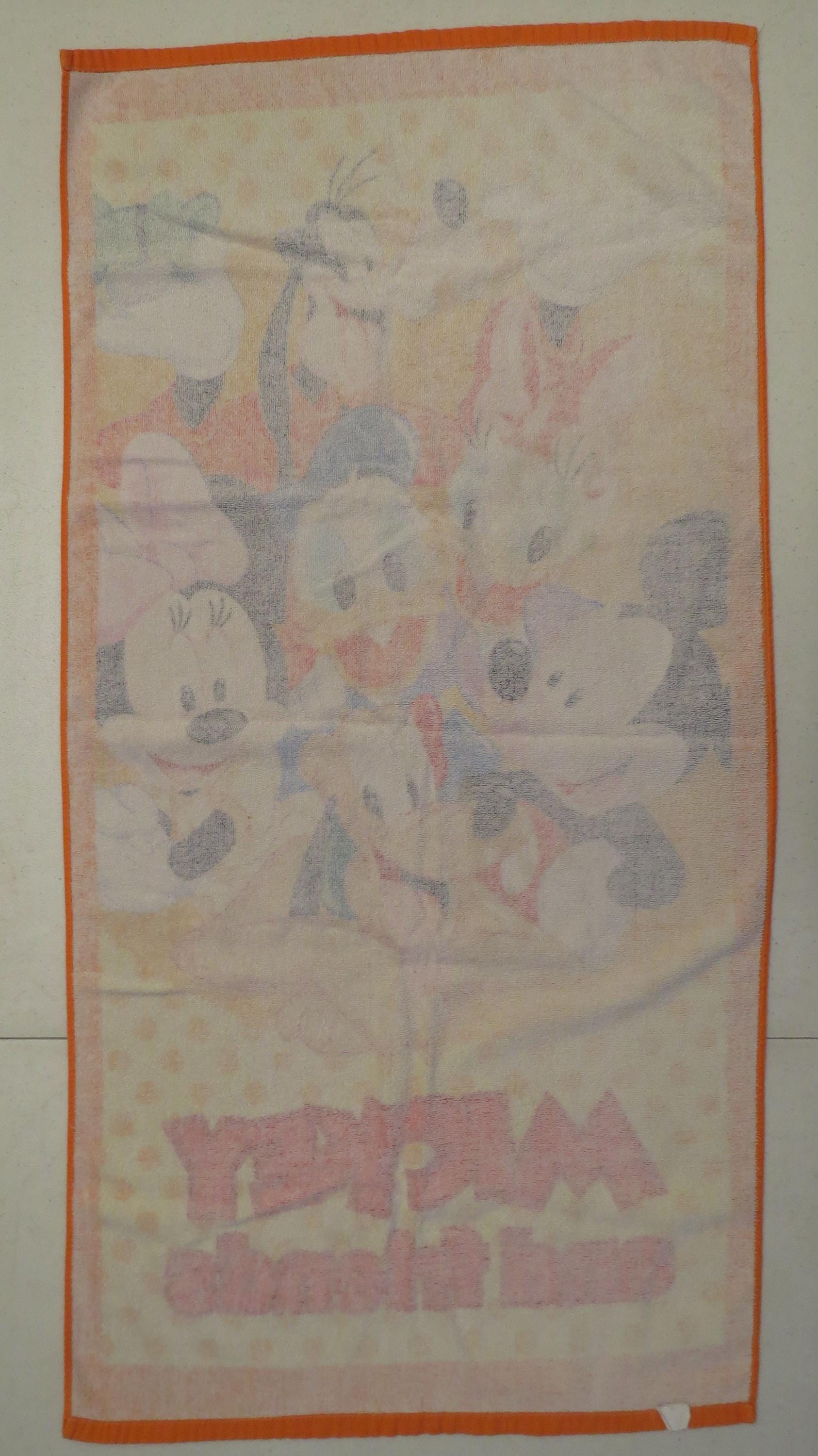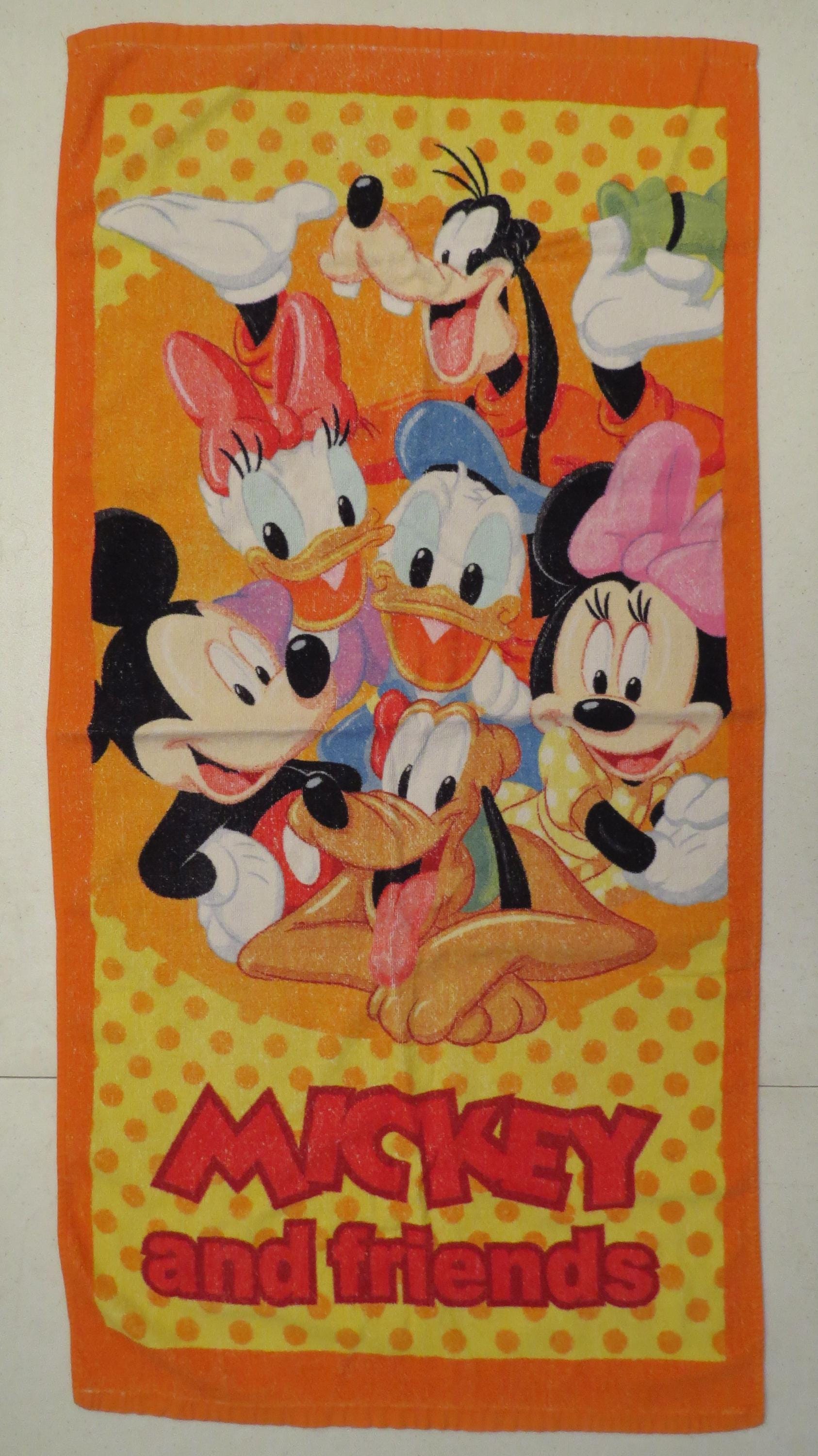 Vintage Mickey and Friends towel which is 45.5" tall by 22.5" wide (116 cm by 57 cm). The colors are faded and spotty. It has missing fiber spots, thread snags, and is worn along the edges/stitching. There are some small stains near the top edge which can also be seen slightly on the backside of the towel. It has light stains on some of the white areas like Goofy's hand and Daisy.