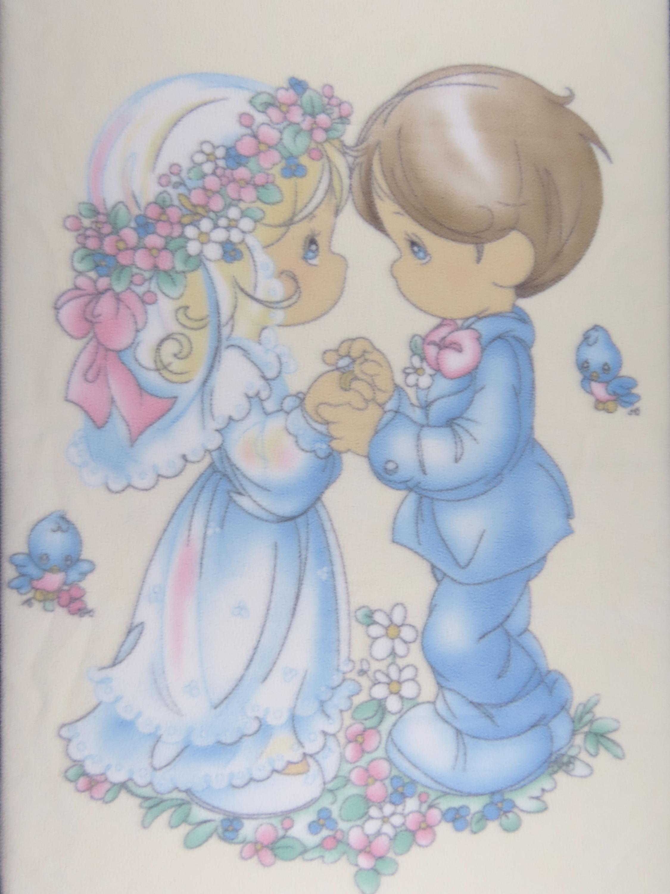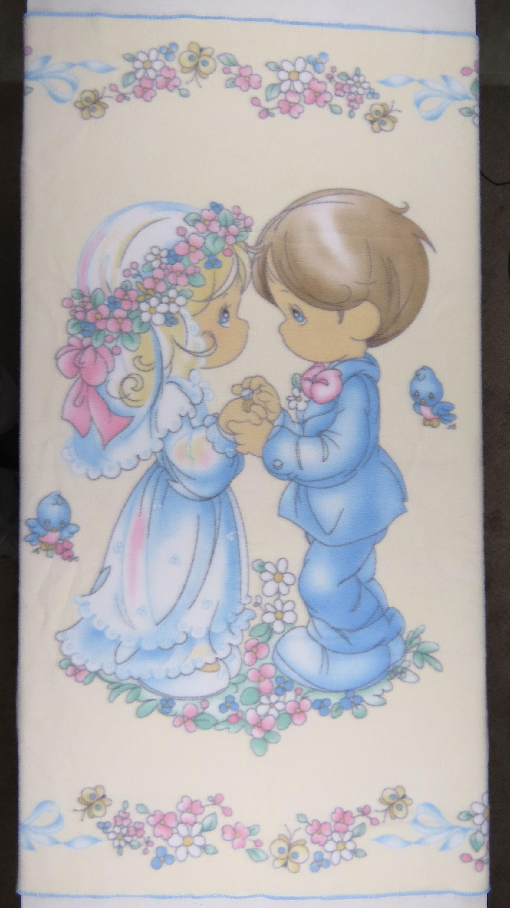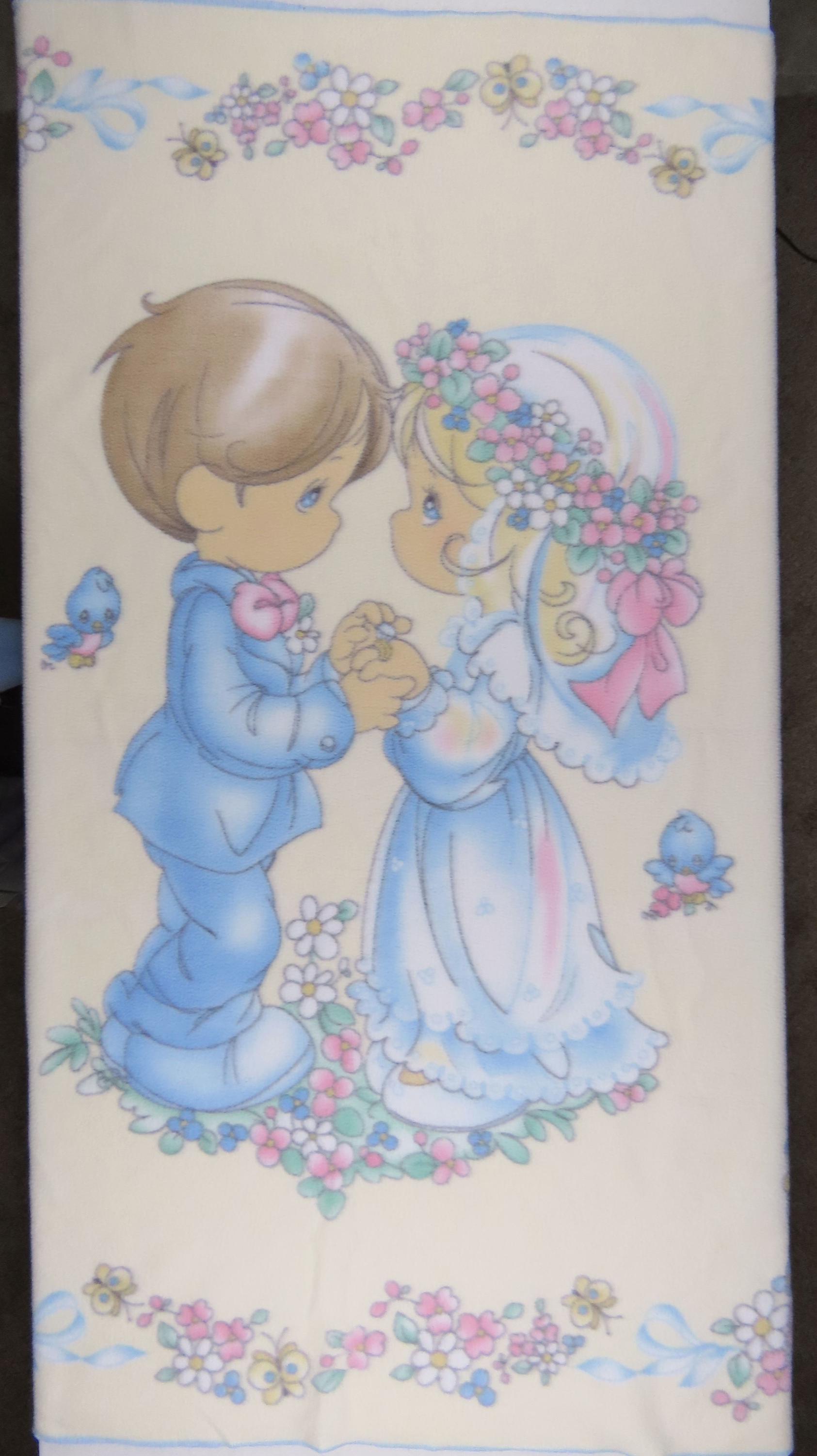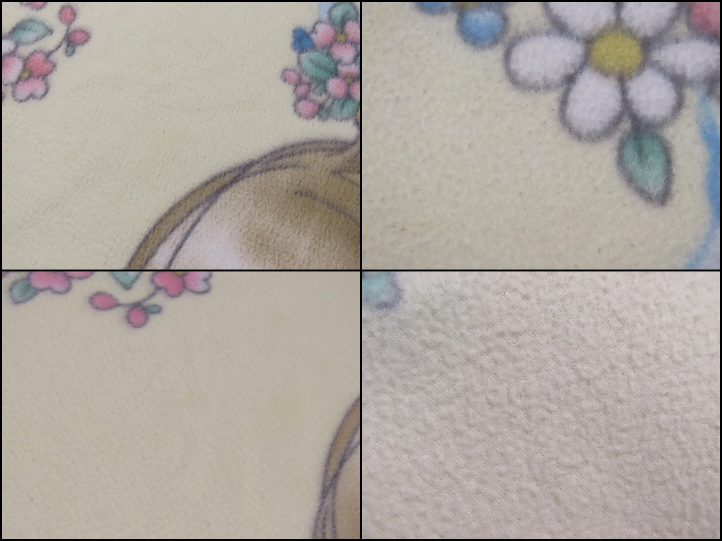 Vintage Precious Moments soft blanket (feels like fleece) which is about 58" tall by 46" wide (146 cm by 116 cm). It is a very thin material, and the design can be seen on both sides. My camera had a hard time picking up the exact colors. It is pilling, looks a little discolored in areas, and has stretched unevenly some. There are some yellowish stains, missing fiber spots, and thin spots. It has some lint stuck to the fiber tips.