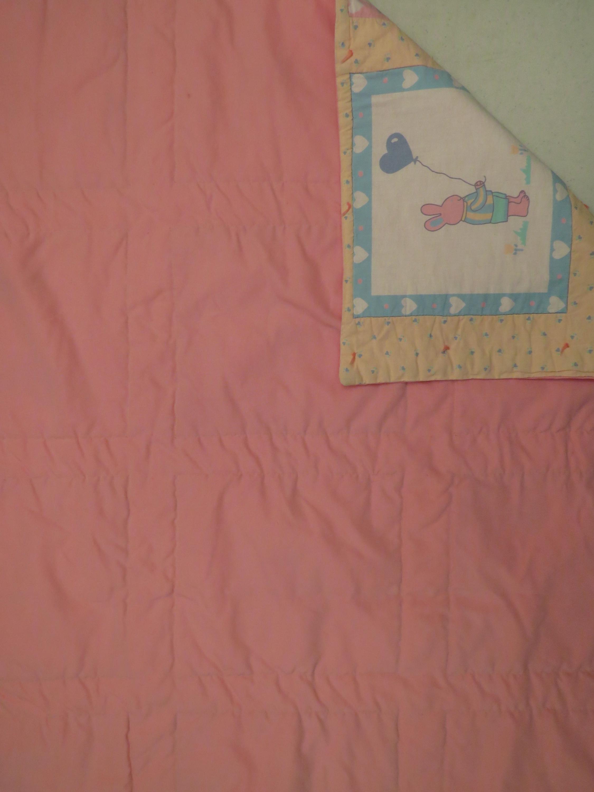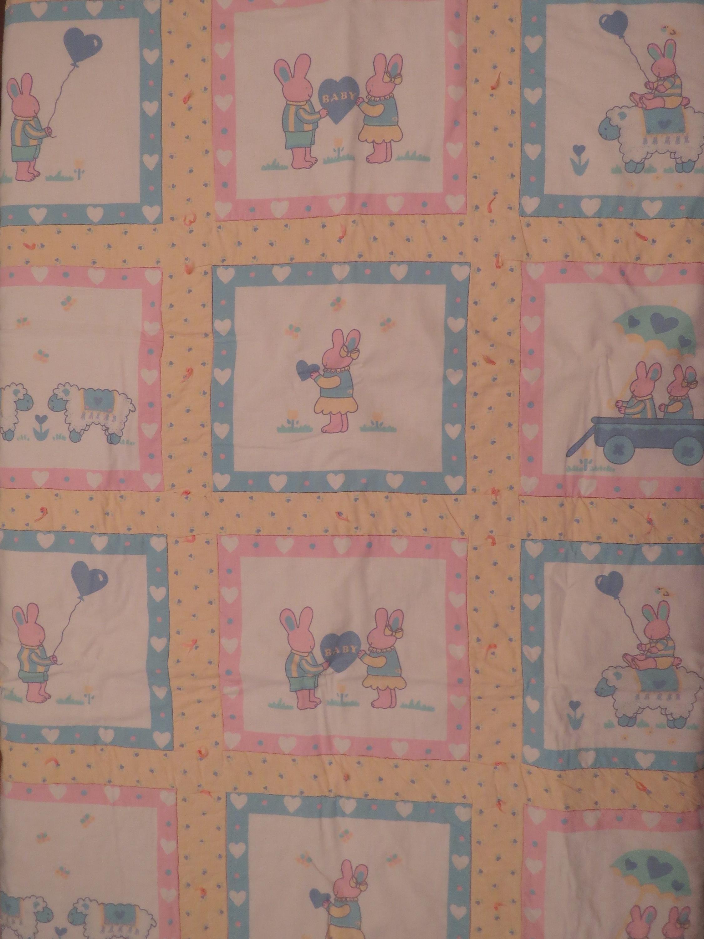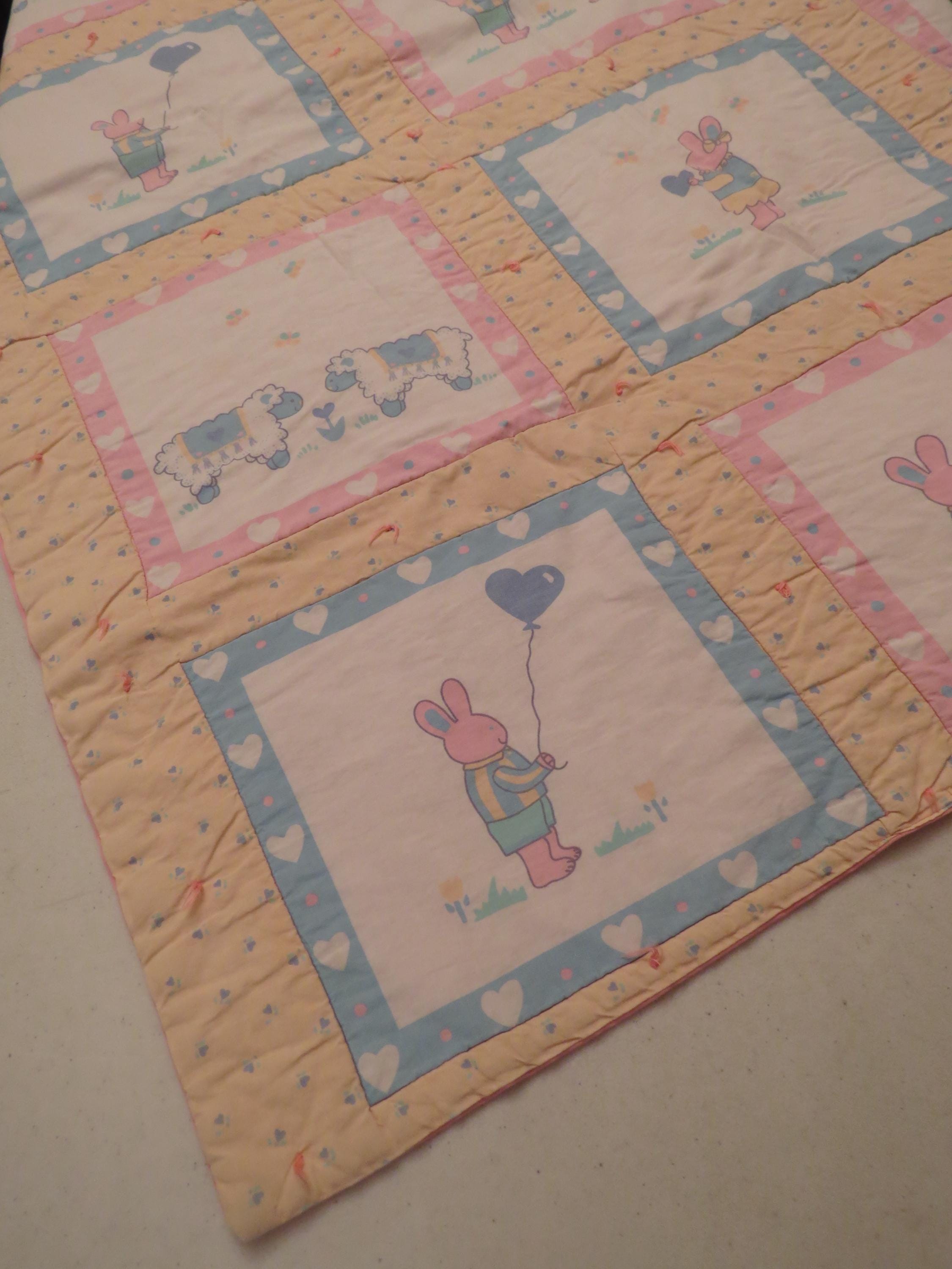Vintage Cute Bunnies small quilted blanket which is about 56" tall by 42" wide (142 cm by 107 cm). My camera had a hard time picking up the exact colors. It is sewn a little unevenly in areas, and it is worn along the edges/stitching. The fabric bunches up along the stitching some, and it does not want to lay completely flat. There are some hard creases, fold/crease lines, and a few thread snags. It has some small/tiny marks and stains. There are a few small/tiny holes on the edge, and a couple small holes towards the middle. The pink backside has a slight rough/textured feel to it. "Emily R. is written in marker on the backside at the bottom corner.