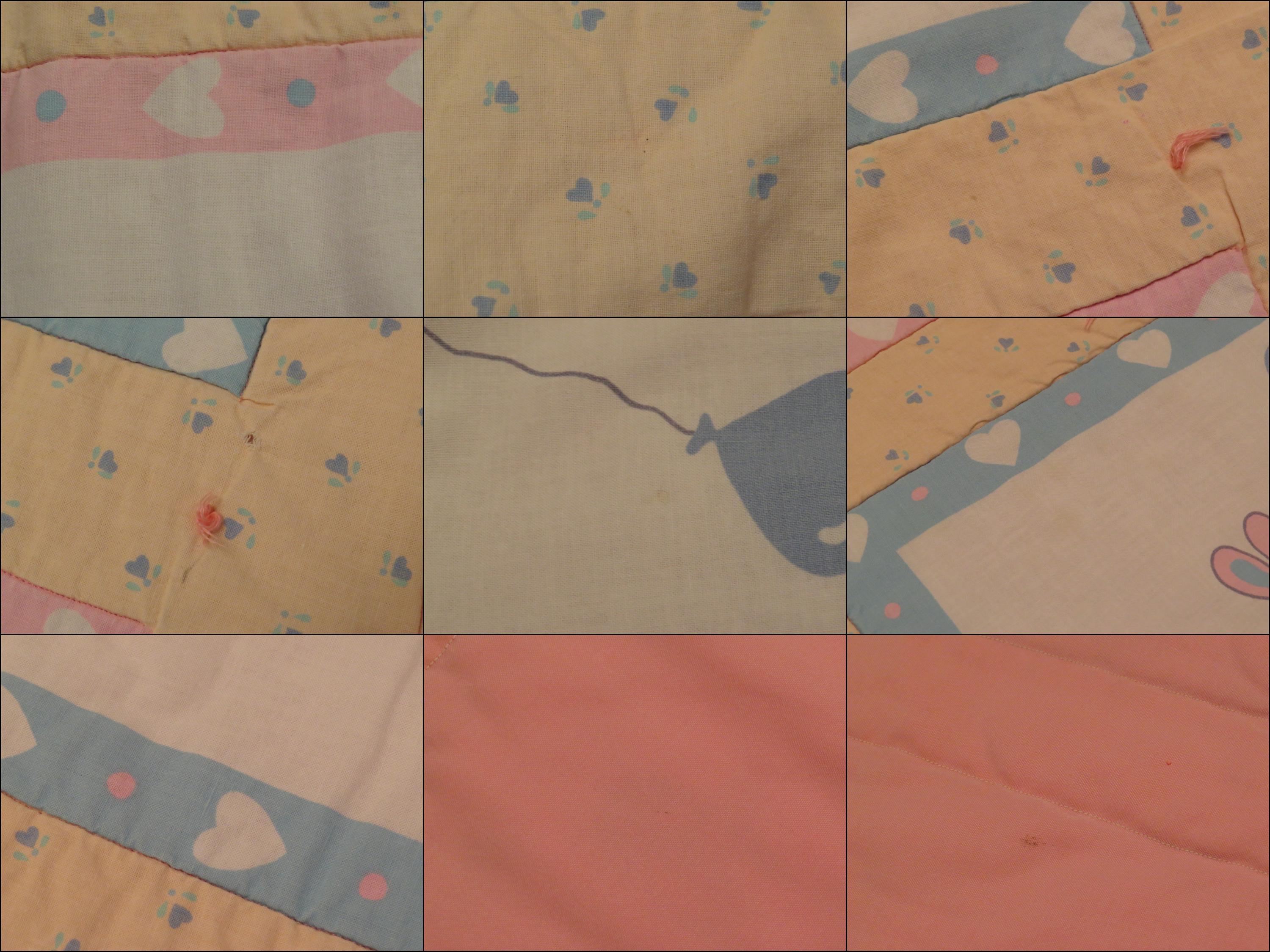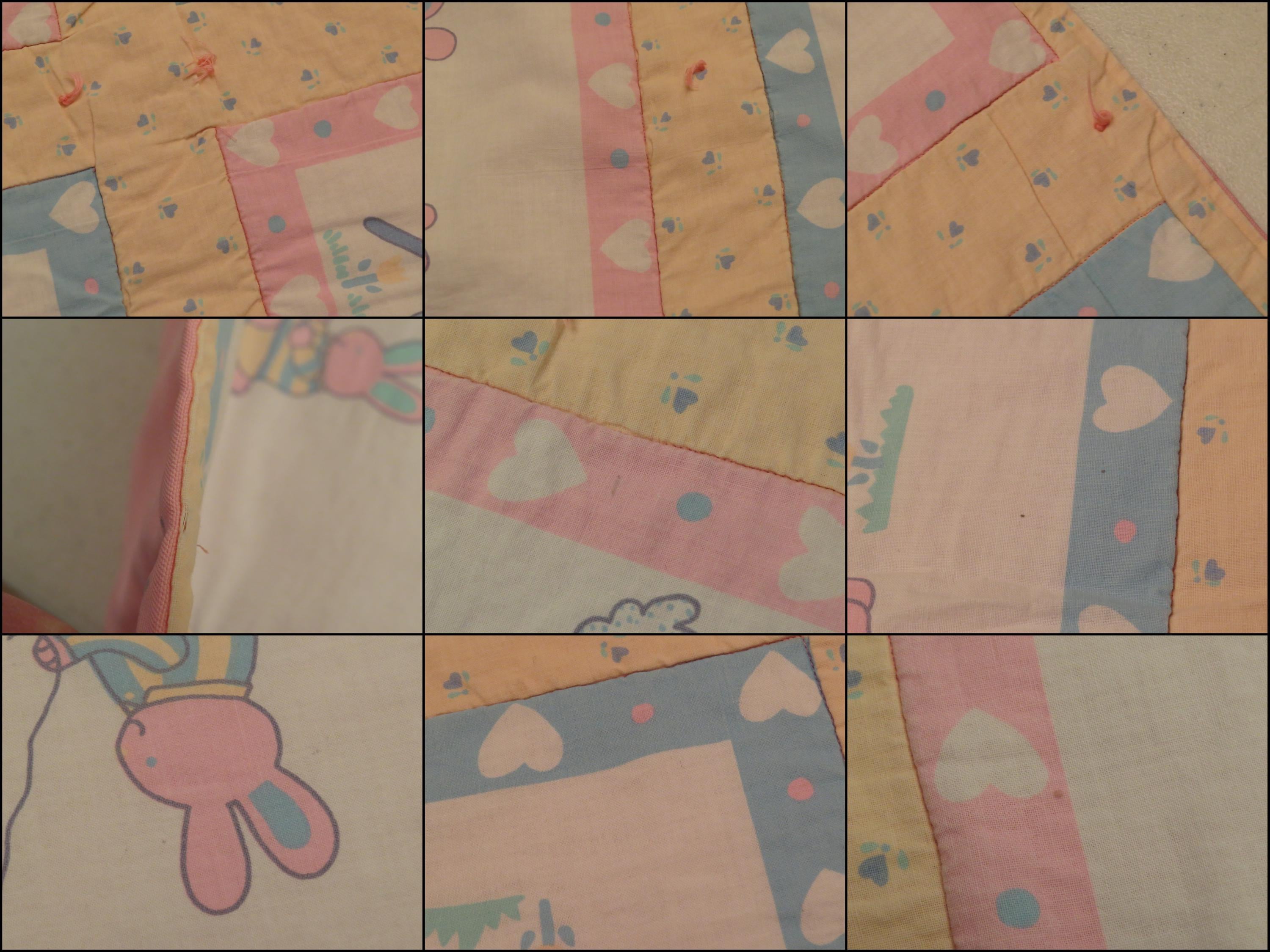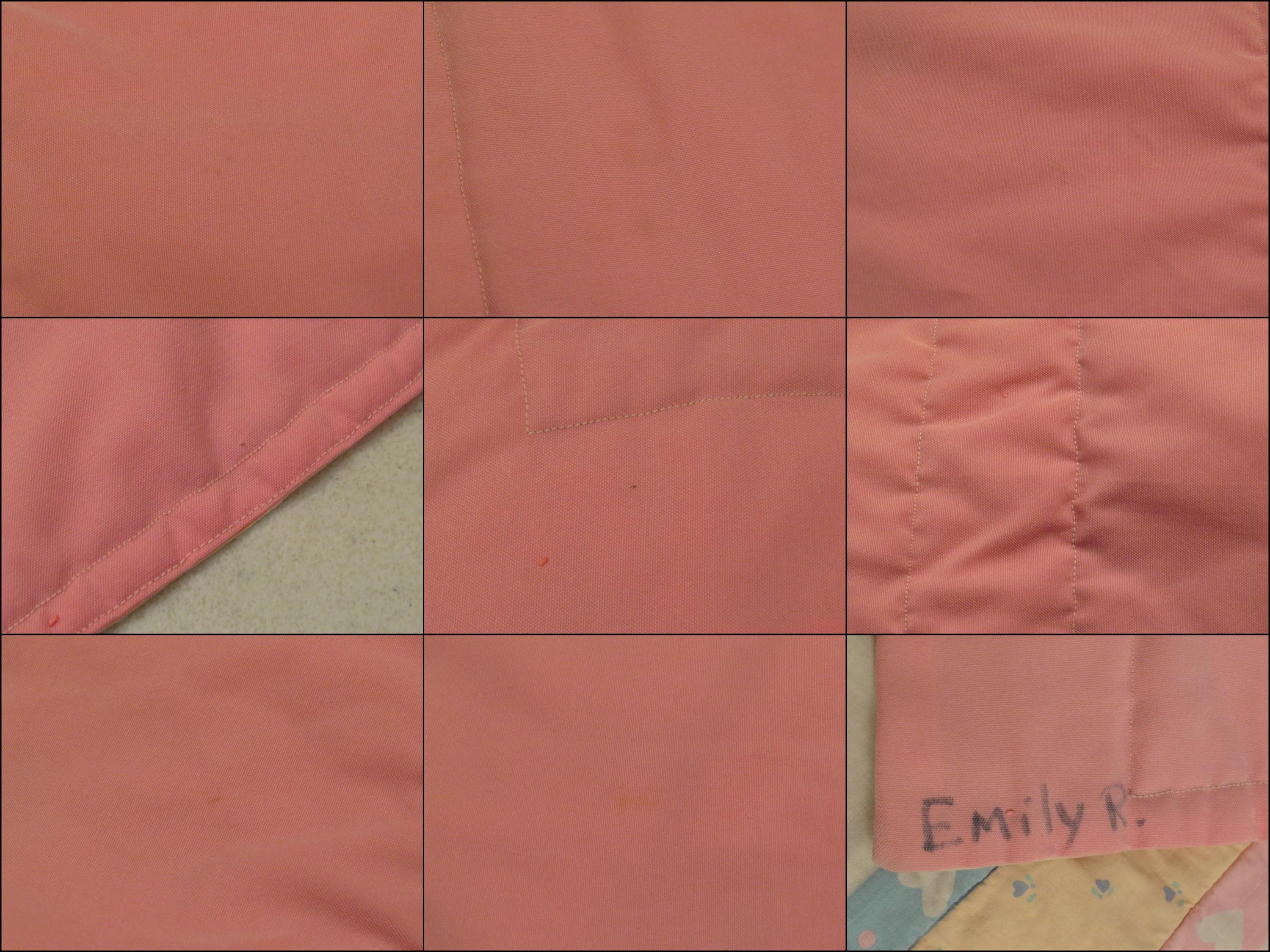 Vintage Cute Bunnies small quilted blanket which is about 56" tall by 42" wide (142 cm by 107 cm). My camera had a hard time picking up the exact colors. It is sewn a little unevenly in areas, and it is worn along the edges/stitching. The fabric bunches up along the stitching some, and it does not want to lay completely flat. There are some hard creases, fold/crease lines, and a few thread snags. It has some small/tiny marks and stains. There are a few small/tiny holes on the edge, and a couple small holes towards the middle. The pink backside has a slight rough/textured feel to it. "Emily R. is written in marker on the backside at the bottom corner.