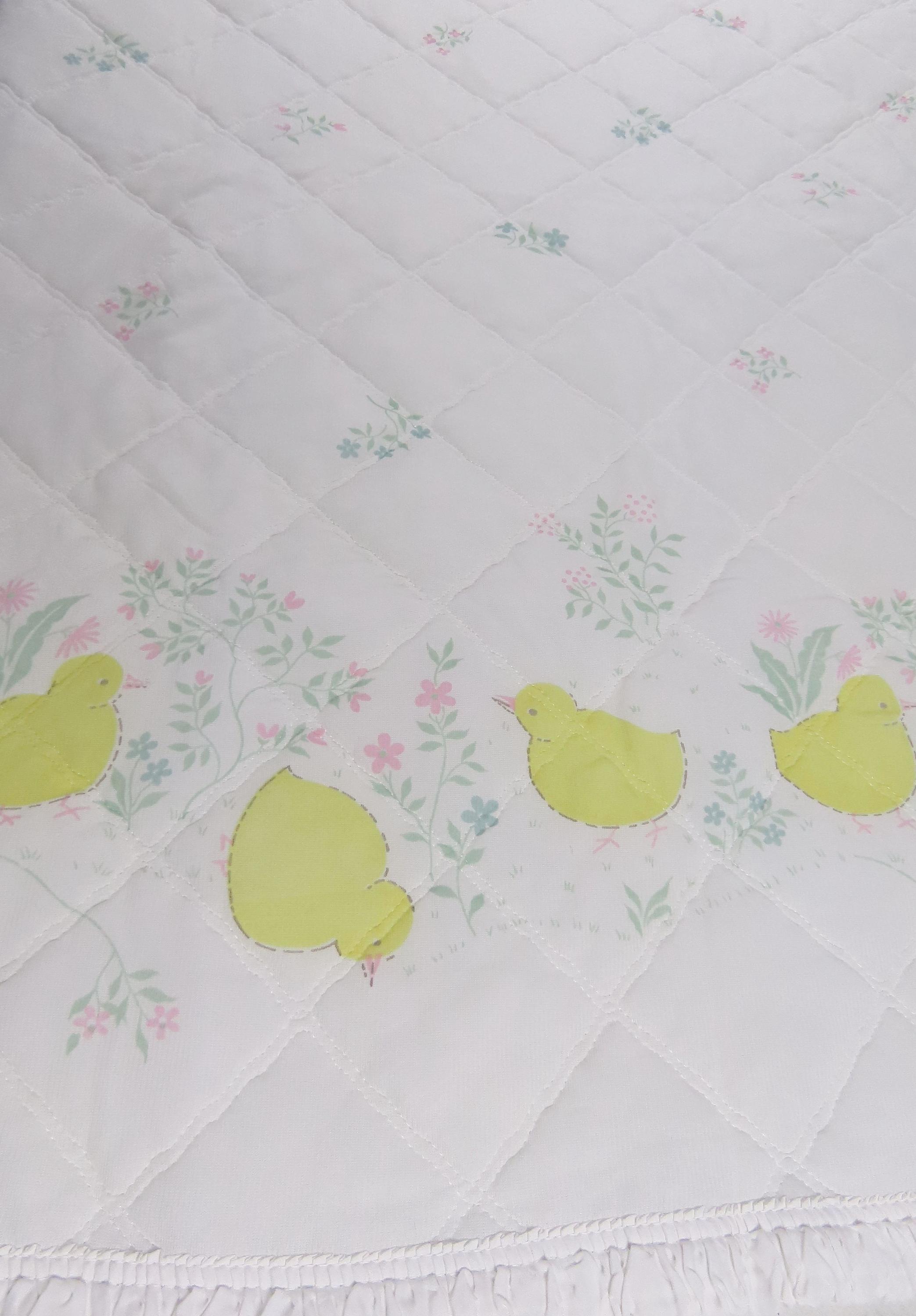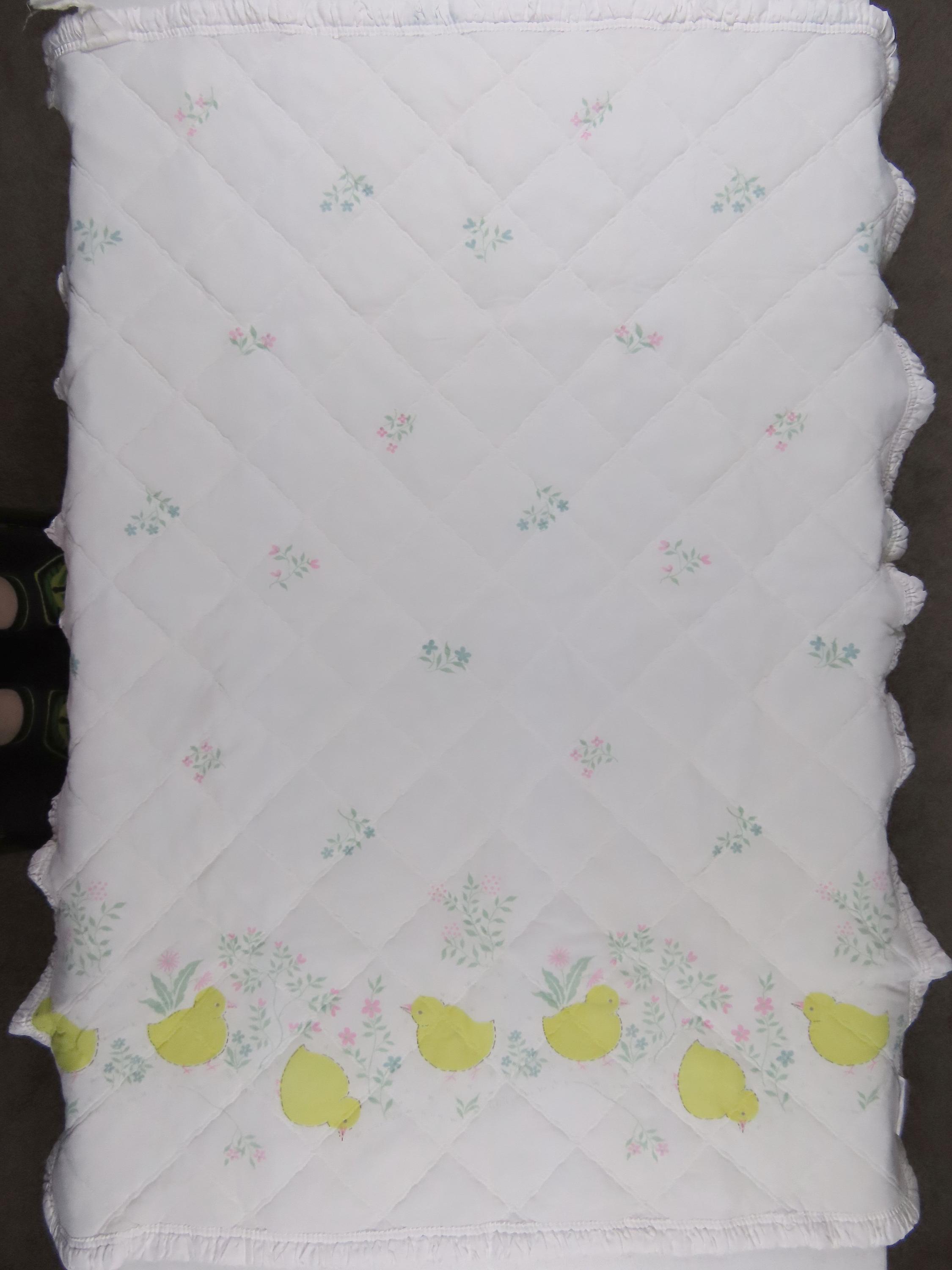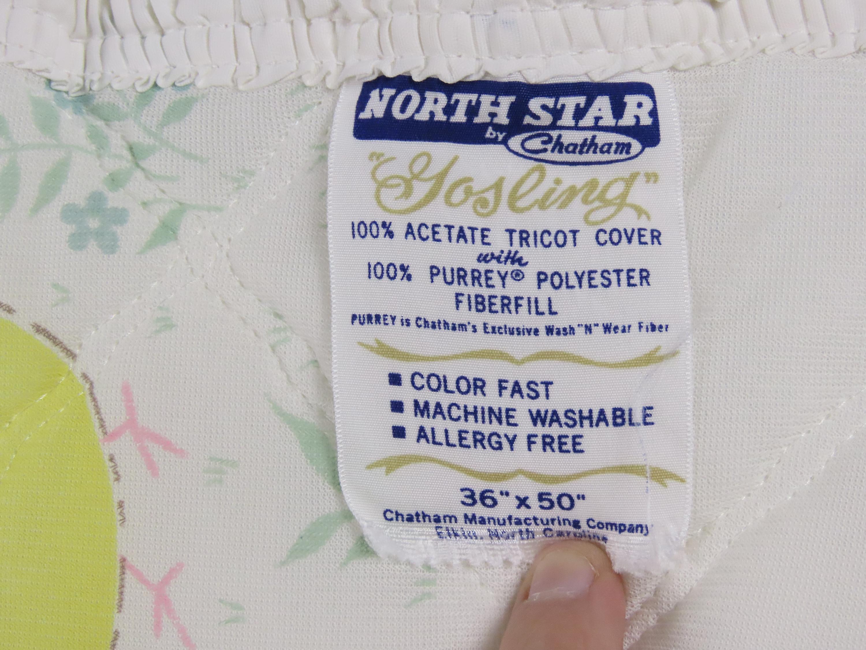 Vintage cute Chatham "Gosling" blanket which is about 49" tall by 47" wide (124 cm by 95 cm). It is 100% acetate with a 100% polyester filling. It has a smooth texture where if any part of my hand is even remotely rough it catches on it, and easy generates static. My camera had a hard time picking up the exact colors. It seems a little discolored in areas, bunches up along the stitching, and the birds are a little faded in areas. It has a small hole cluster, thin spots, and a few thread snags.