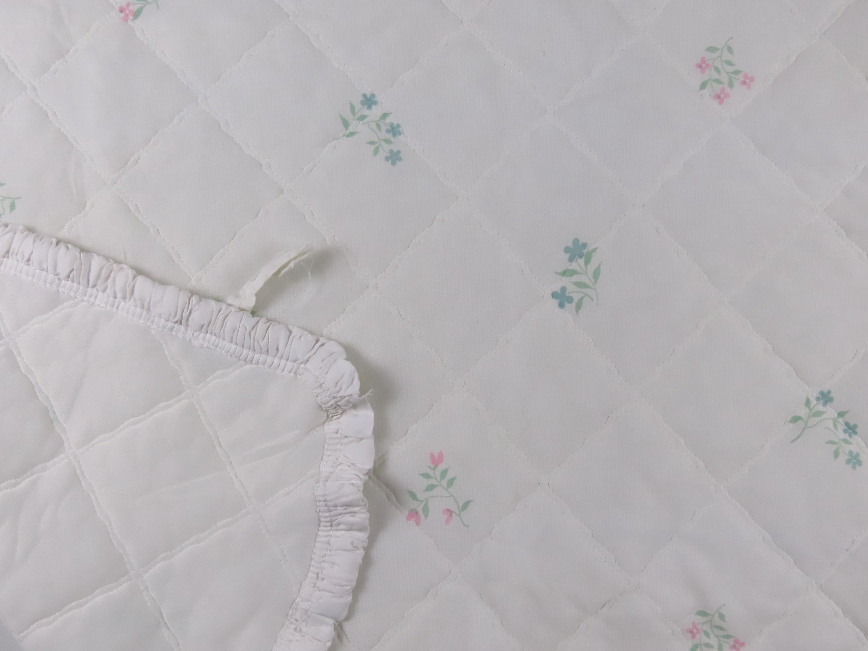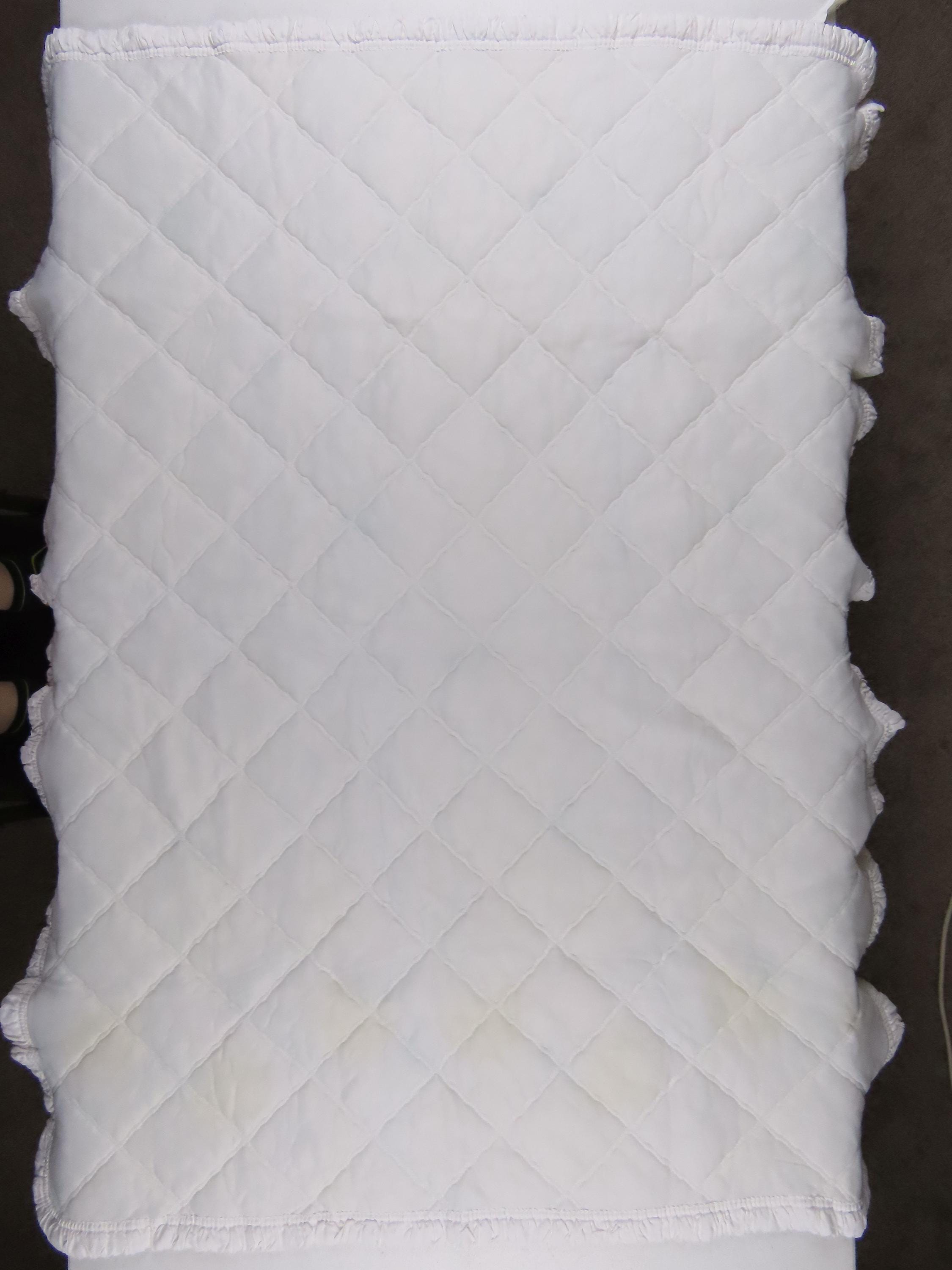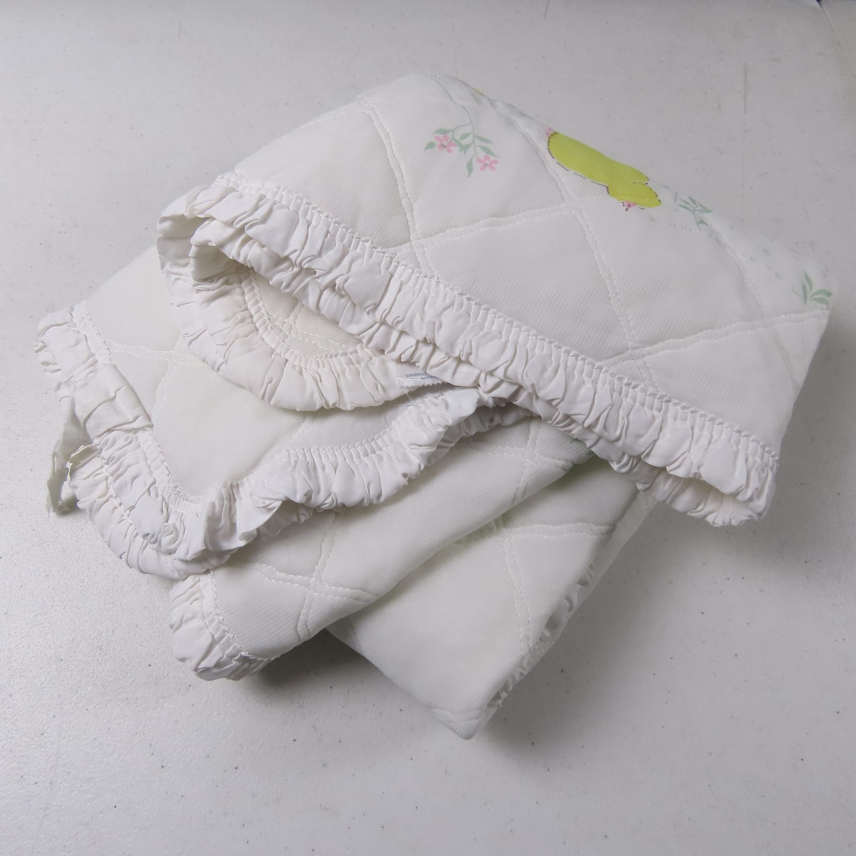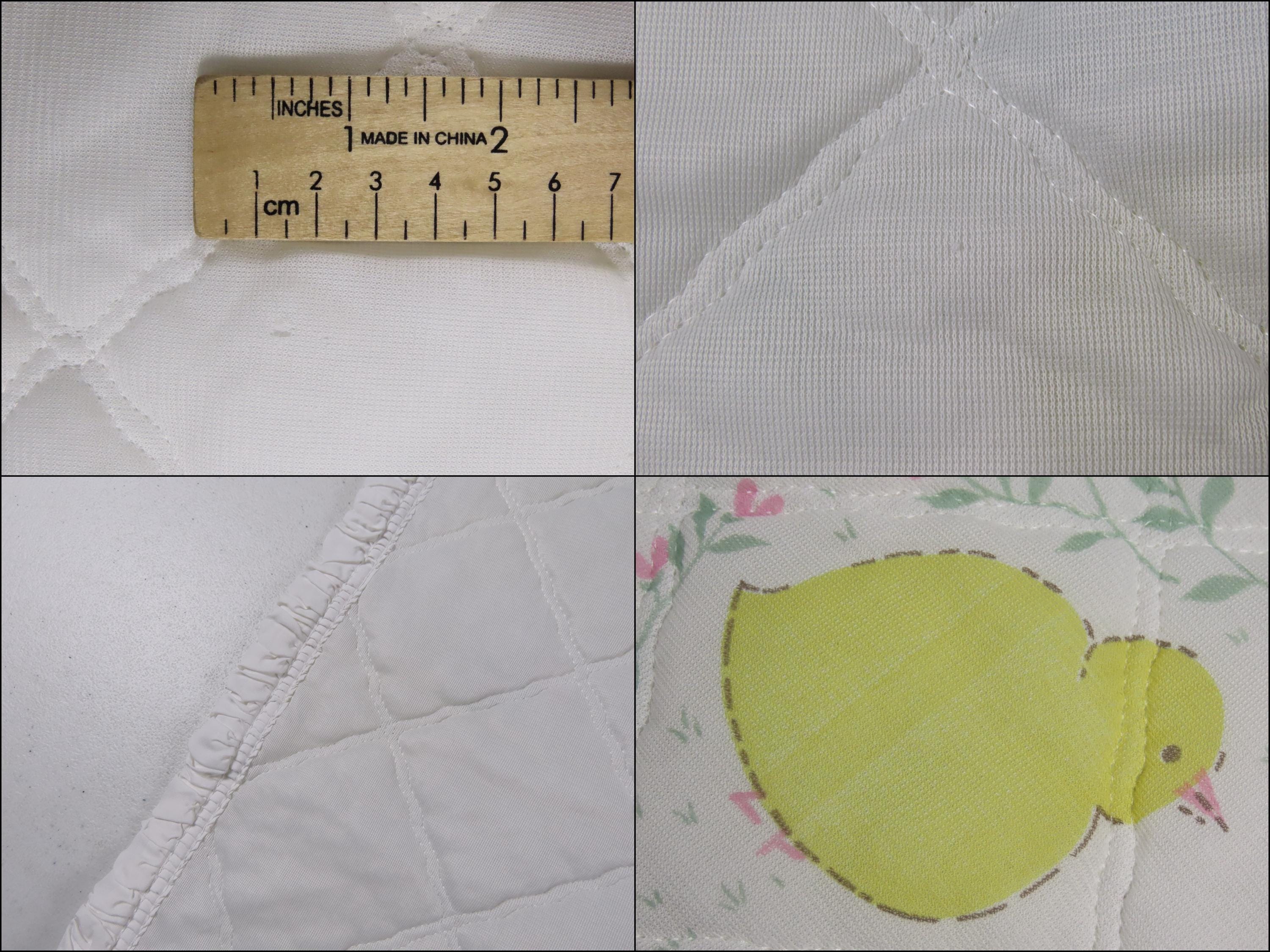 Vintage cute Chatham "Gosling" blanket which is about 49" tall by 47" wide (124 cm by 95 cm). It is 100% acetate with a 100% polyester filling. It has a smooth texture where if any part of my hand is even remotely rough it catches on it, and easy generates static. My camera had a hard time picking up the exact colors. It seems a little discolored in areas, bunches up along the stitching, and the birds are a little faded in areas. It has a small hole cluster, thin spots, and a few thread snags.