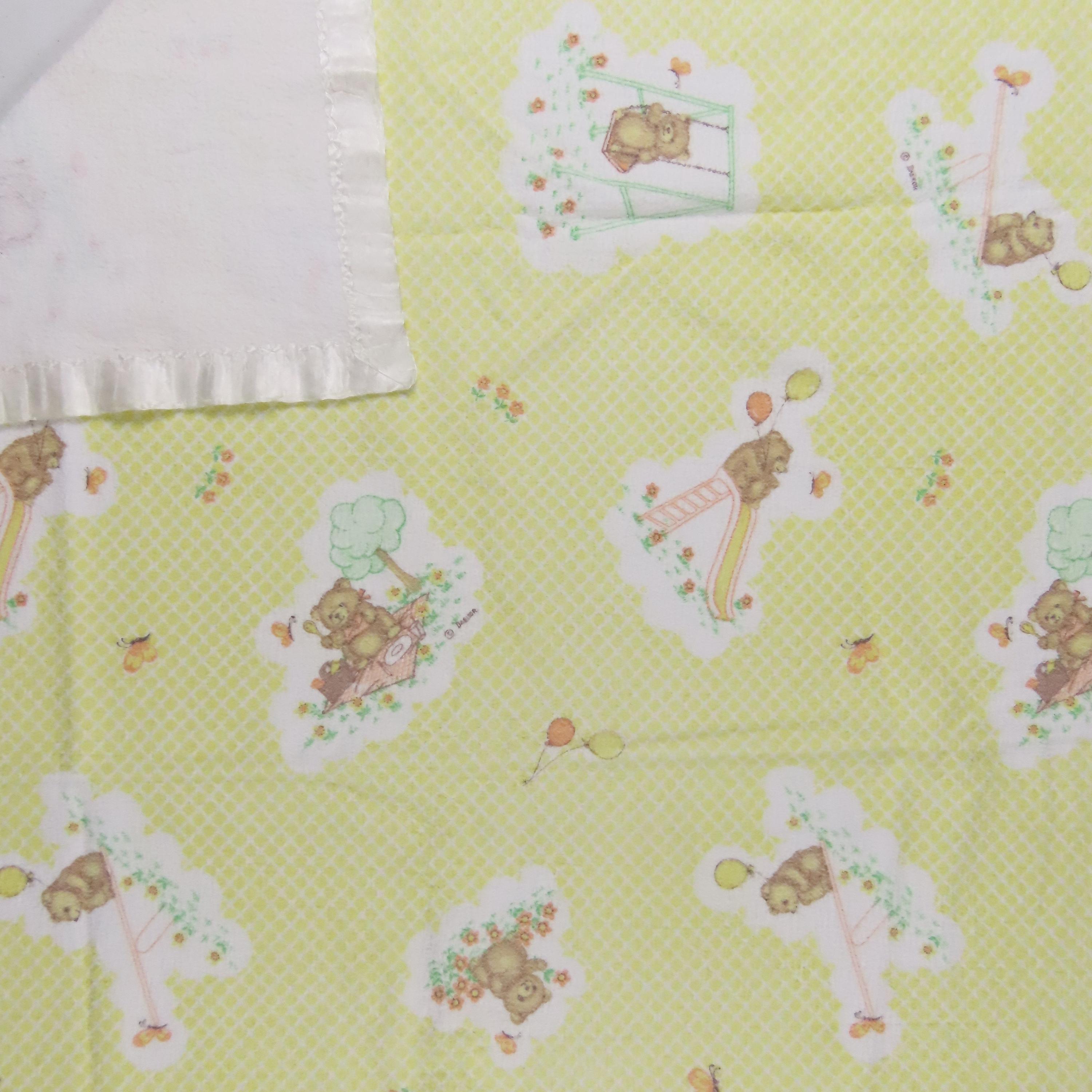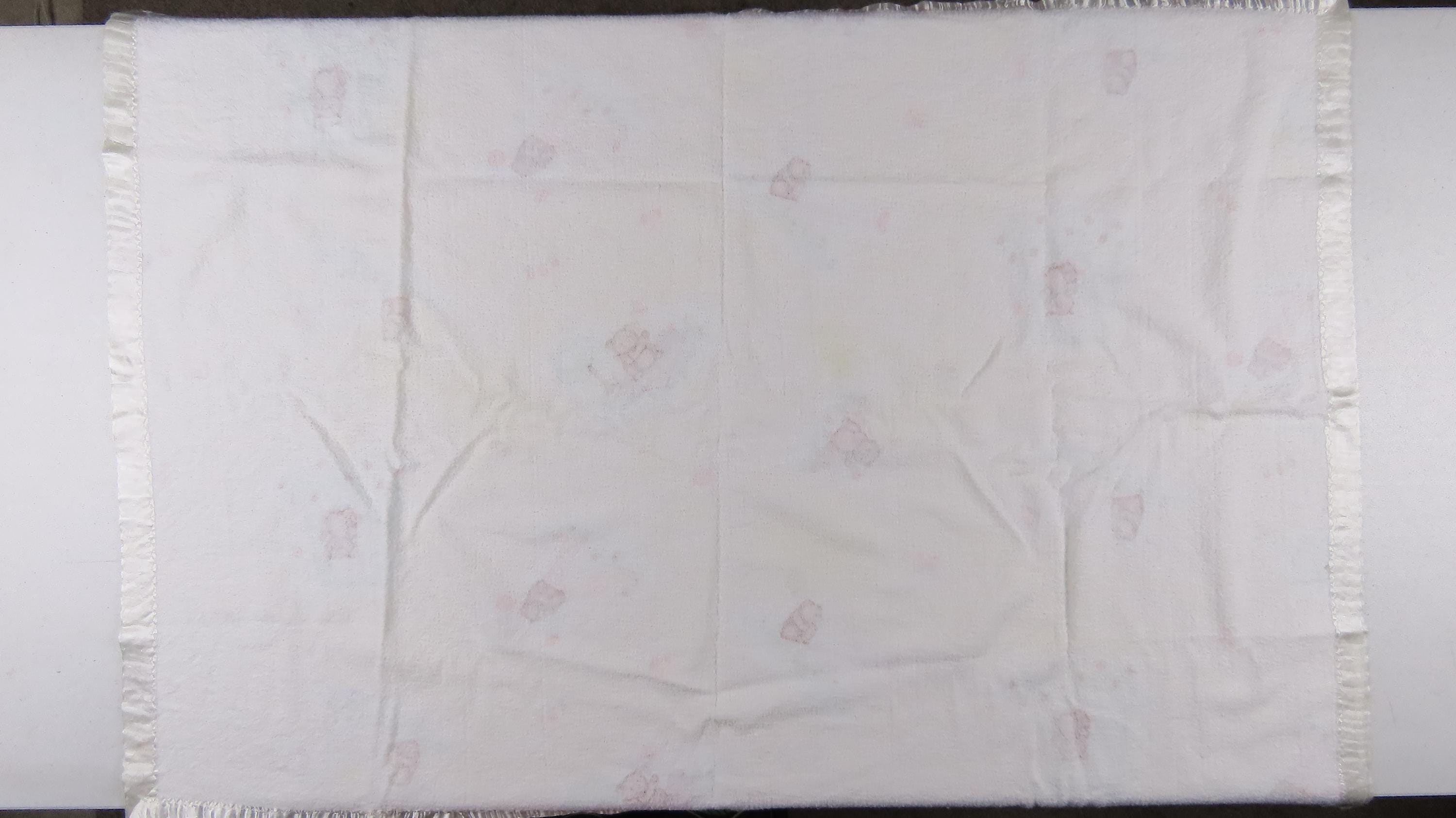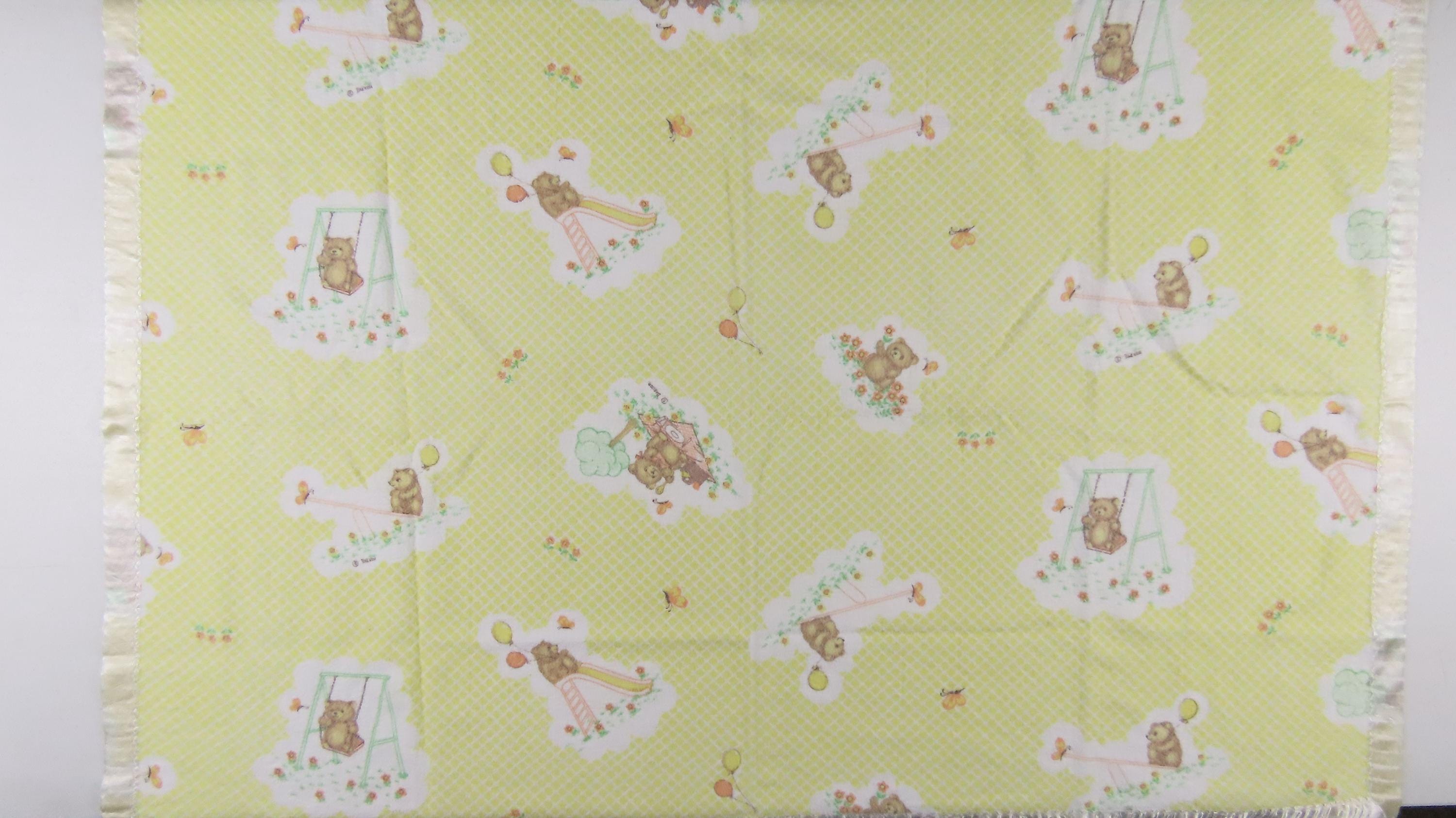 Vintage "Daekor" Teddy Bear small flannel blanket which is about 47" long by 33" wide (119 cm by 84 cm). It is worn along the edges, pilling, and a little faded in areas. There are thread snags, thin spots, and the backside has multiple yellowish stains. The ribbon edge has missing thread spots and thin spots which have formed small/tiny holes.