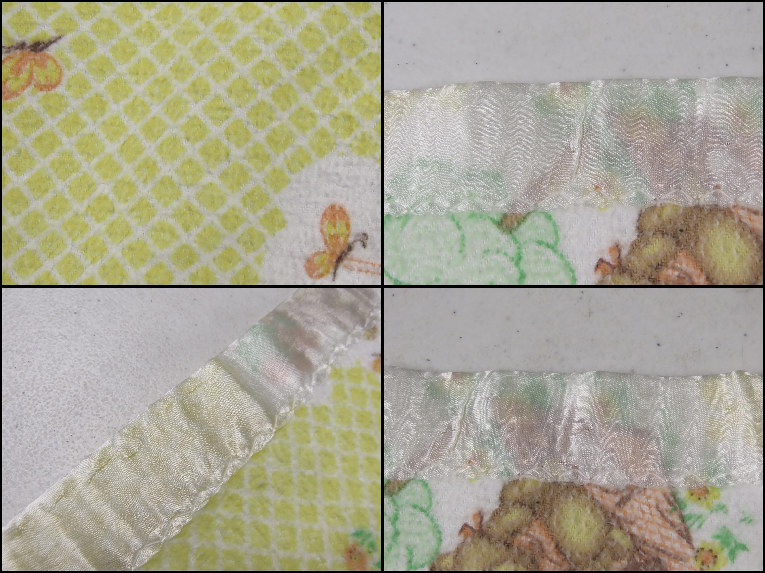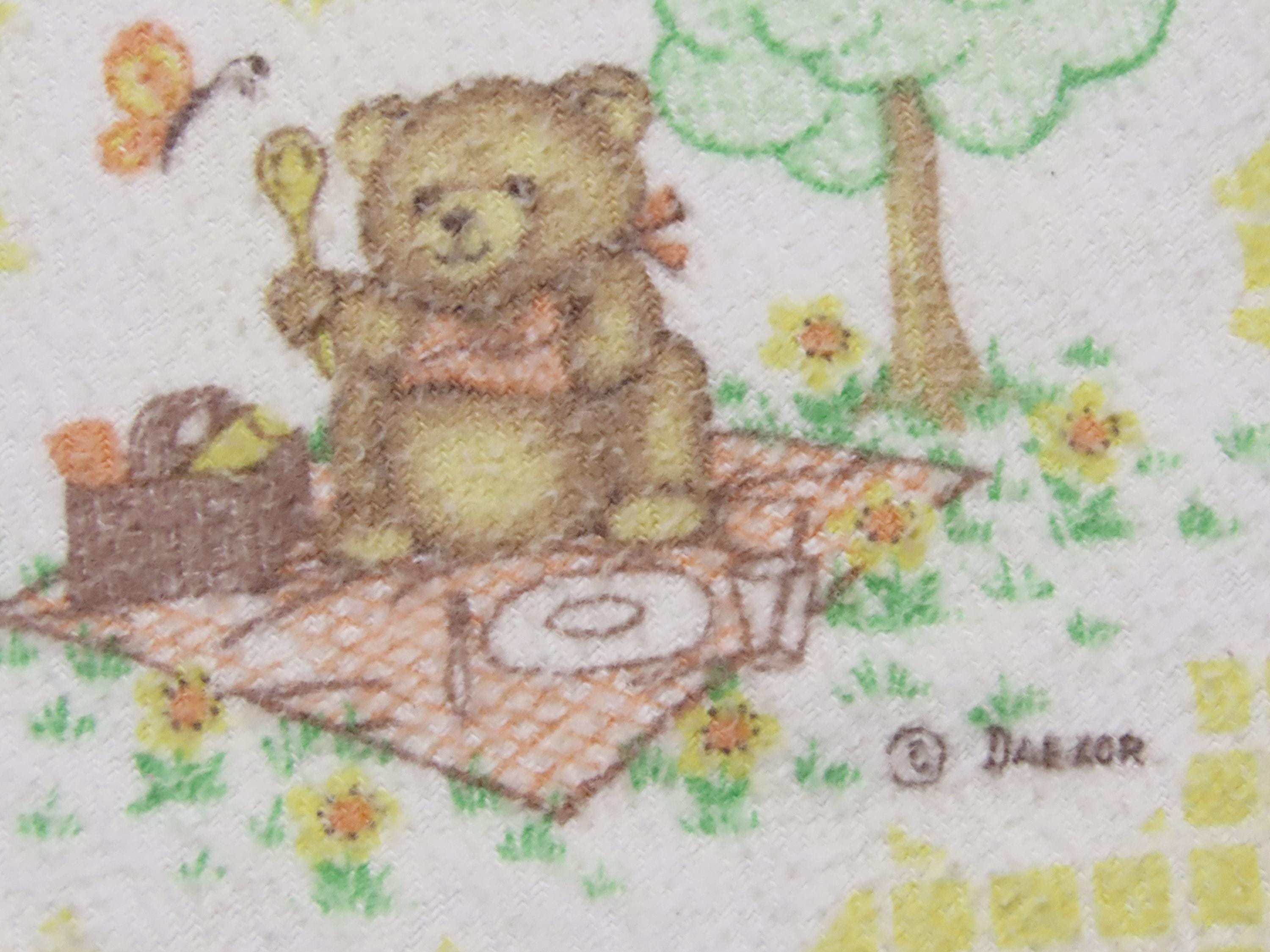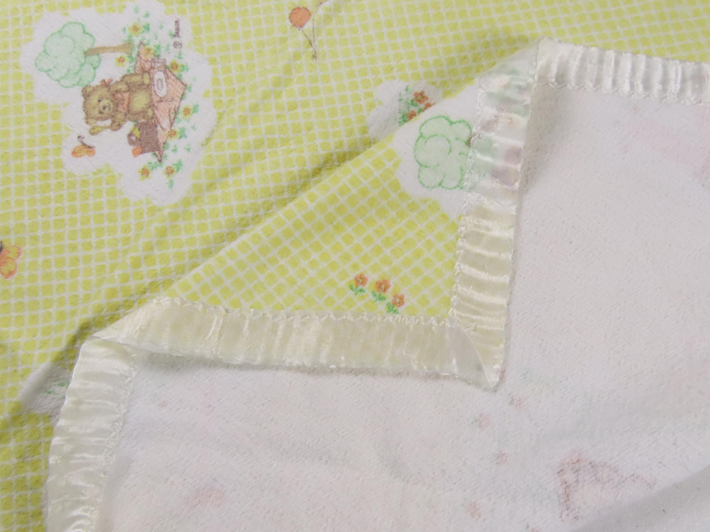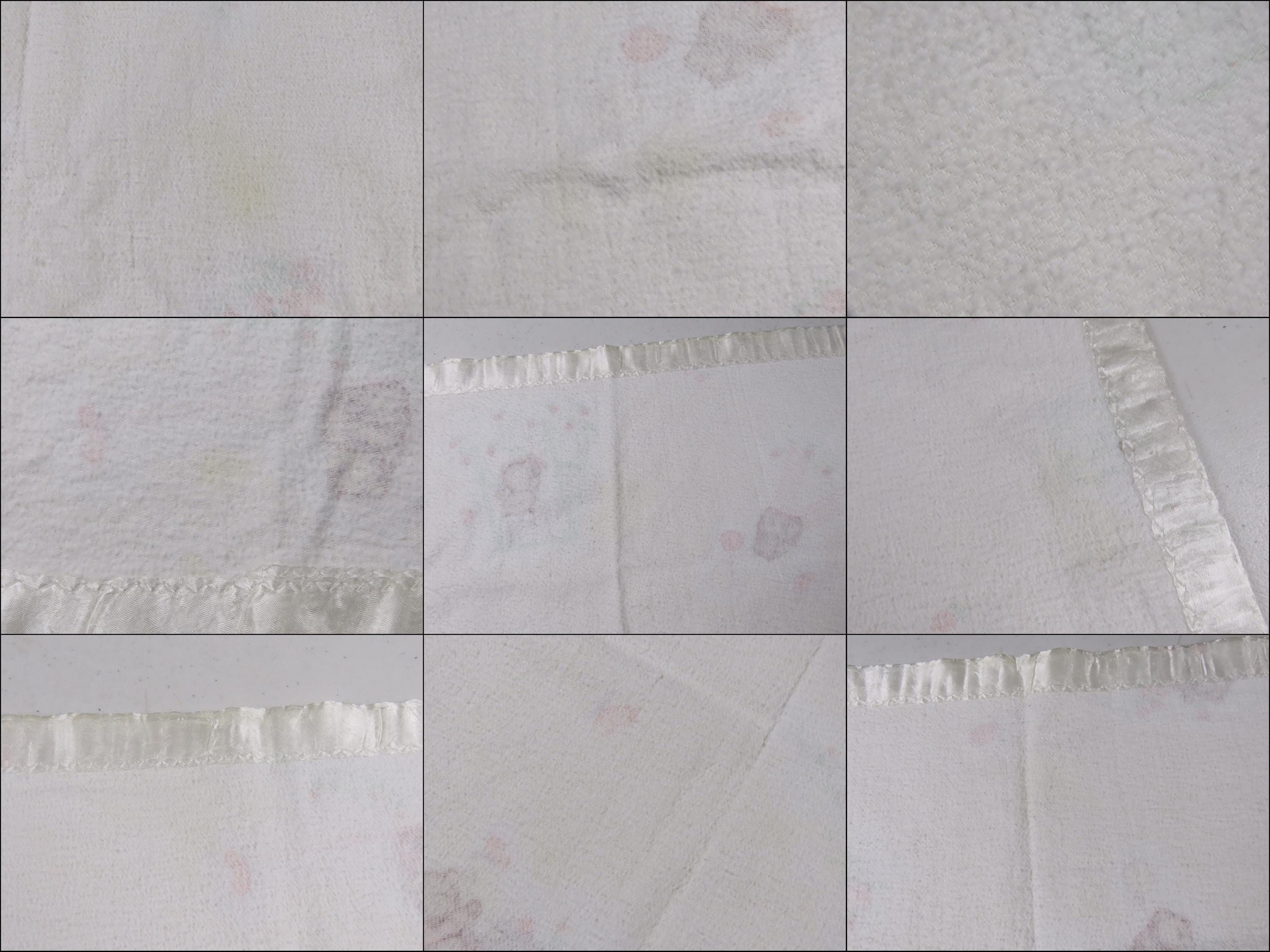 Vintage "Daekor" Teddy Bear small flannel blanket which is about 47" long by 33" wide (119 cm by 84 cm). It is worn along the edges, pilling, and a little faded in areas. There are thread snags, thin spots, and the backside has multiple yellowish stains. The ribbon edge has missing thread spots and thin spots which have formed small/tiny holes.