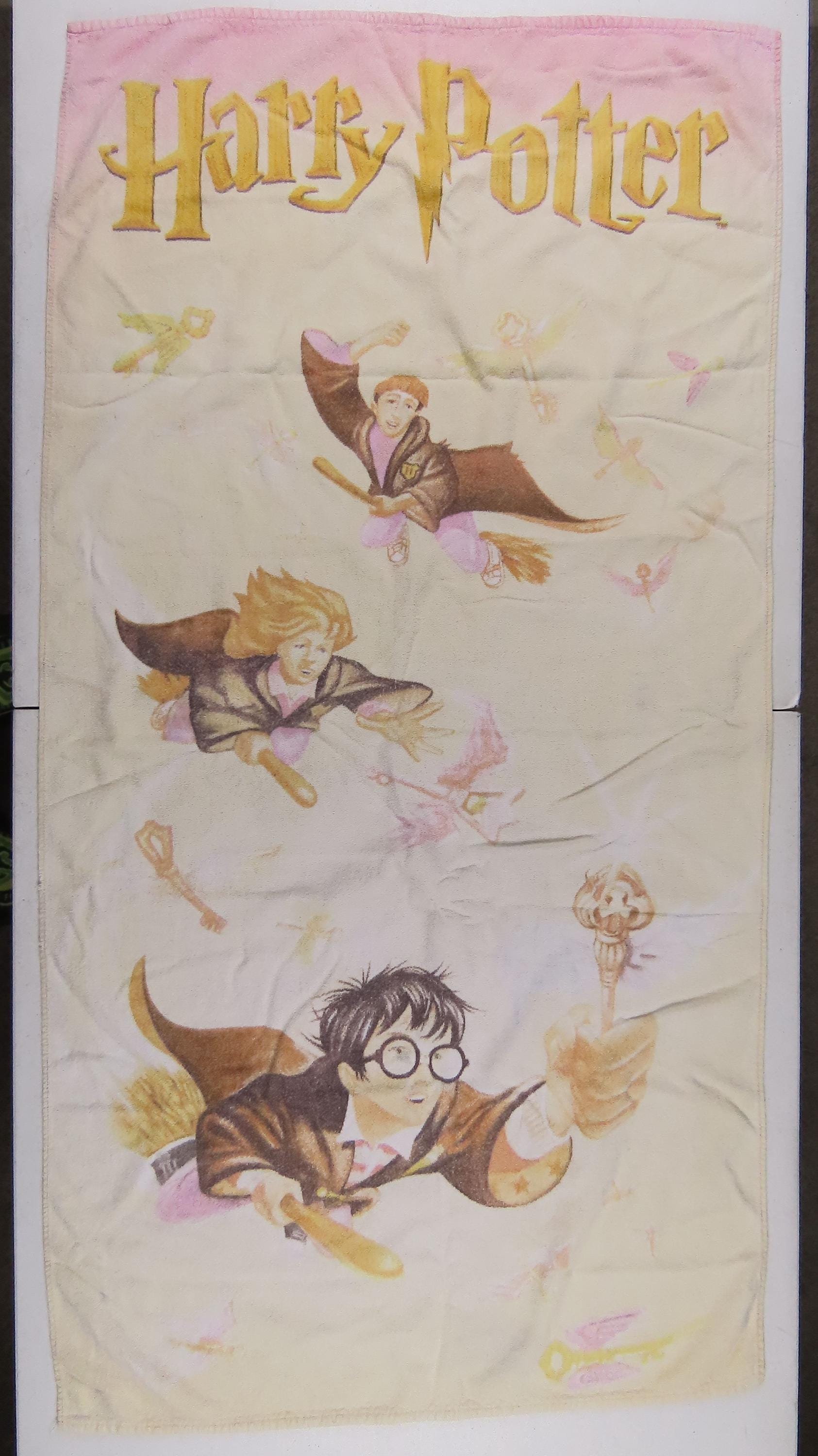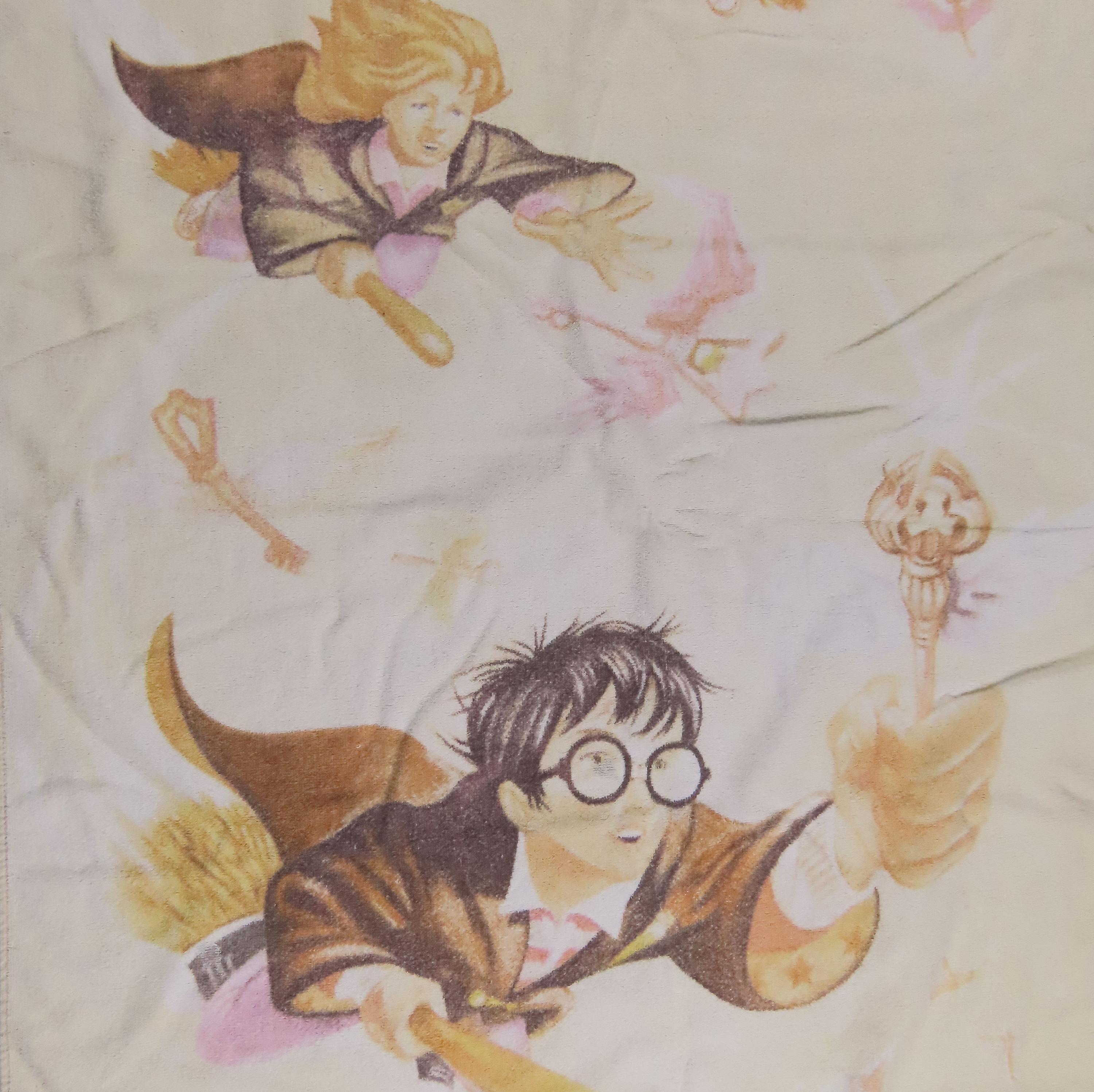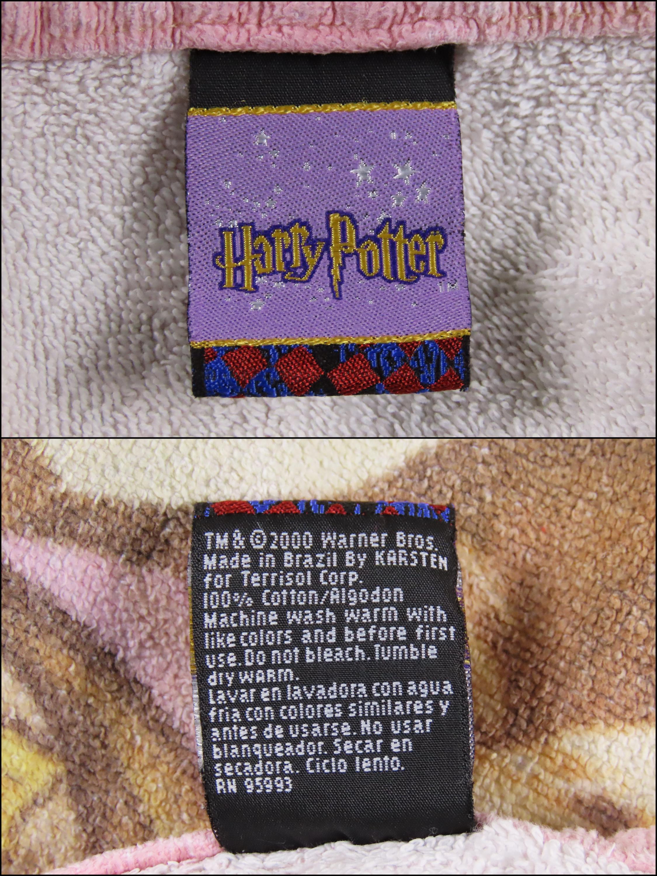 Vintage Harry Potter towel from 2000 which is 100% cotton. It is about 53" tall by 27.5" wide (136 cm by 70 cm). It has overall wear especially on the edges, is very faded, and it has a bit of a rough texture (not very soft to the touch). There are some small tears on the edge, some small/tiny stains, and pilling in areas. It has a tiny hole, missing fiber spots, and some paint marks (like near Harry's eye). There are hard creases, fold/crease lines, and some pulled/loose fibers. The backside has multiple stains, and some large line marks.
