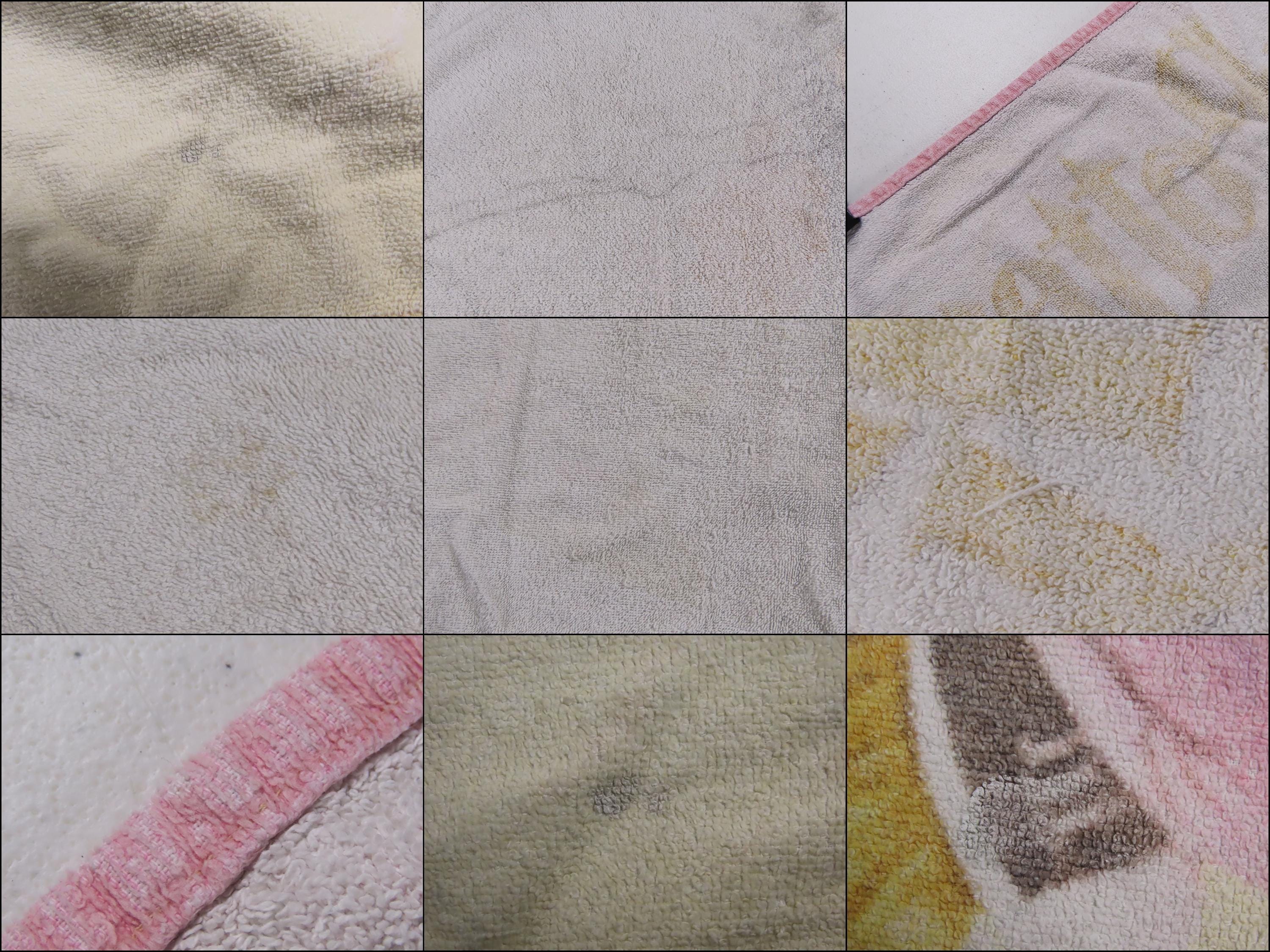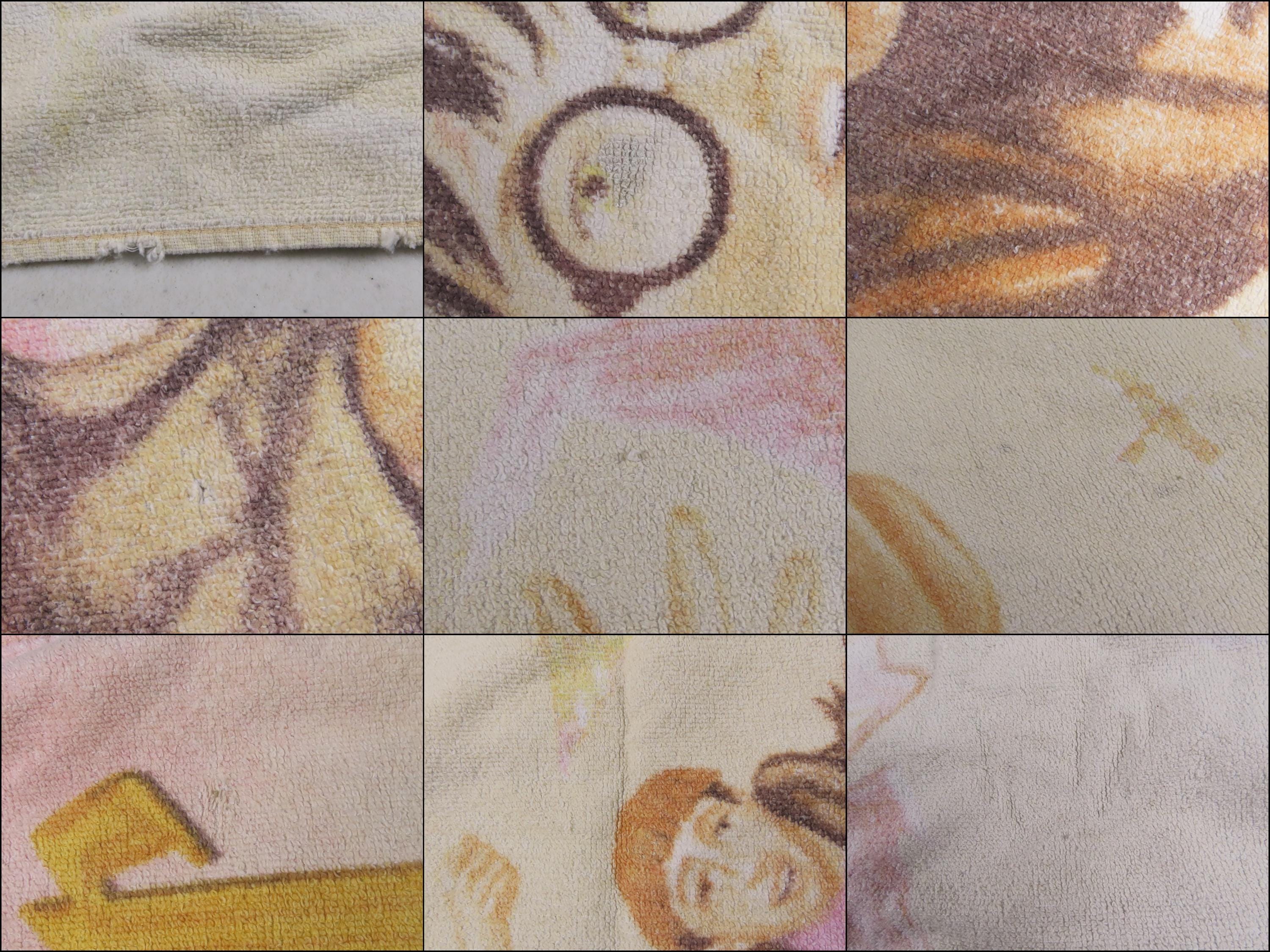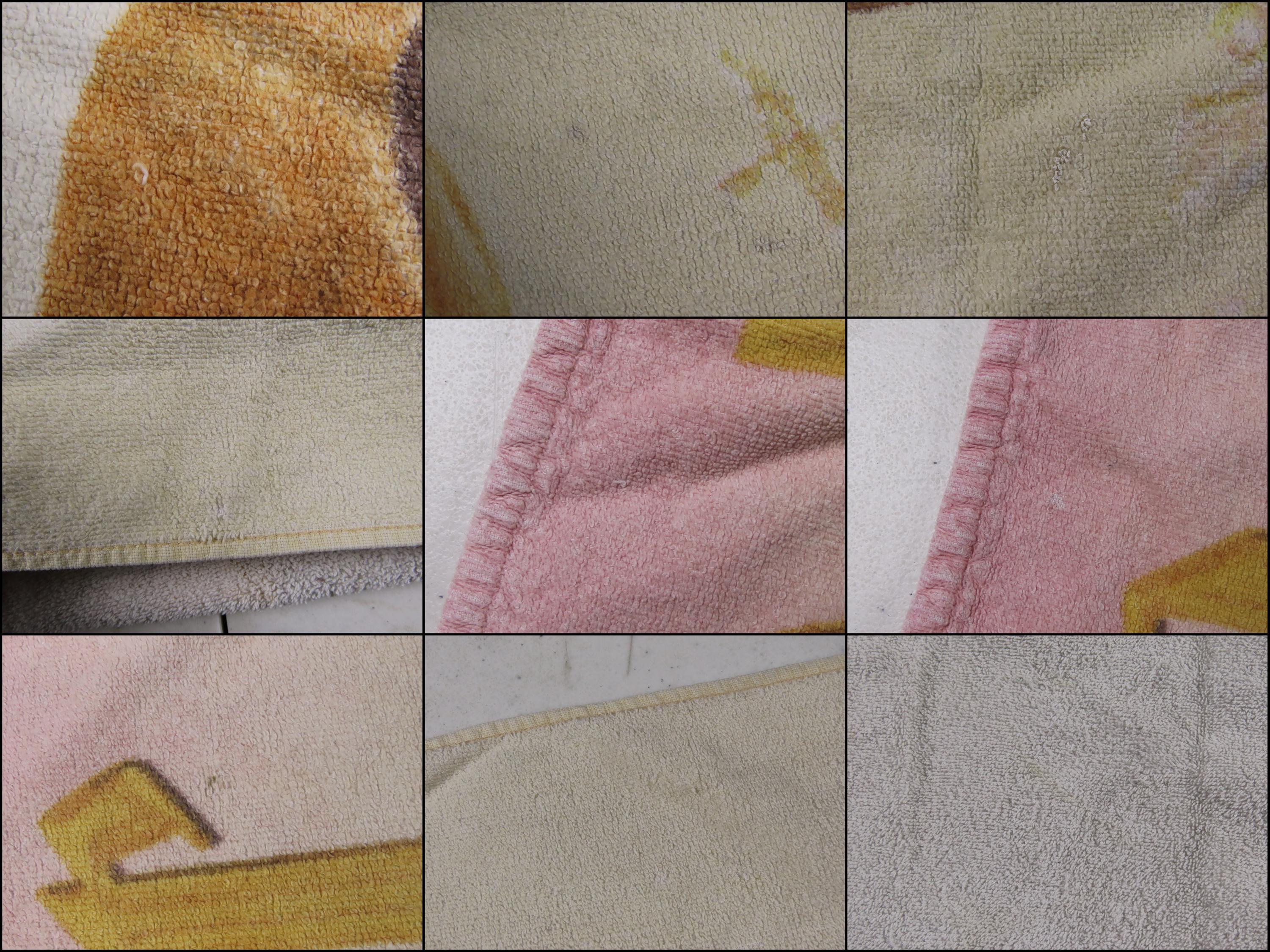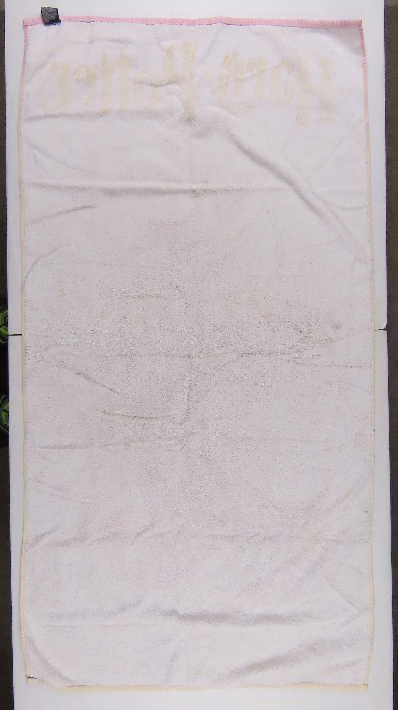 Vintage Harry Potter towel from 2000 which is 100% cotton. It is about 53" tall by 27.5" wide (136 cm by 70 cm). It has overall wear especially on the edges, is very faded, and it has a bit of a rough texture (not very soft to the touch). There are some small tears on the edge, some small/tiny stains, and pilling in areas. It has a tiny hole, missing fiber spots, and some paint marks (like near Harry's eye). There are hard creases, fold/crease lines, and some pulled/loose fibers. The backside has multiple stains, and some large line marks.