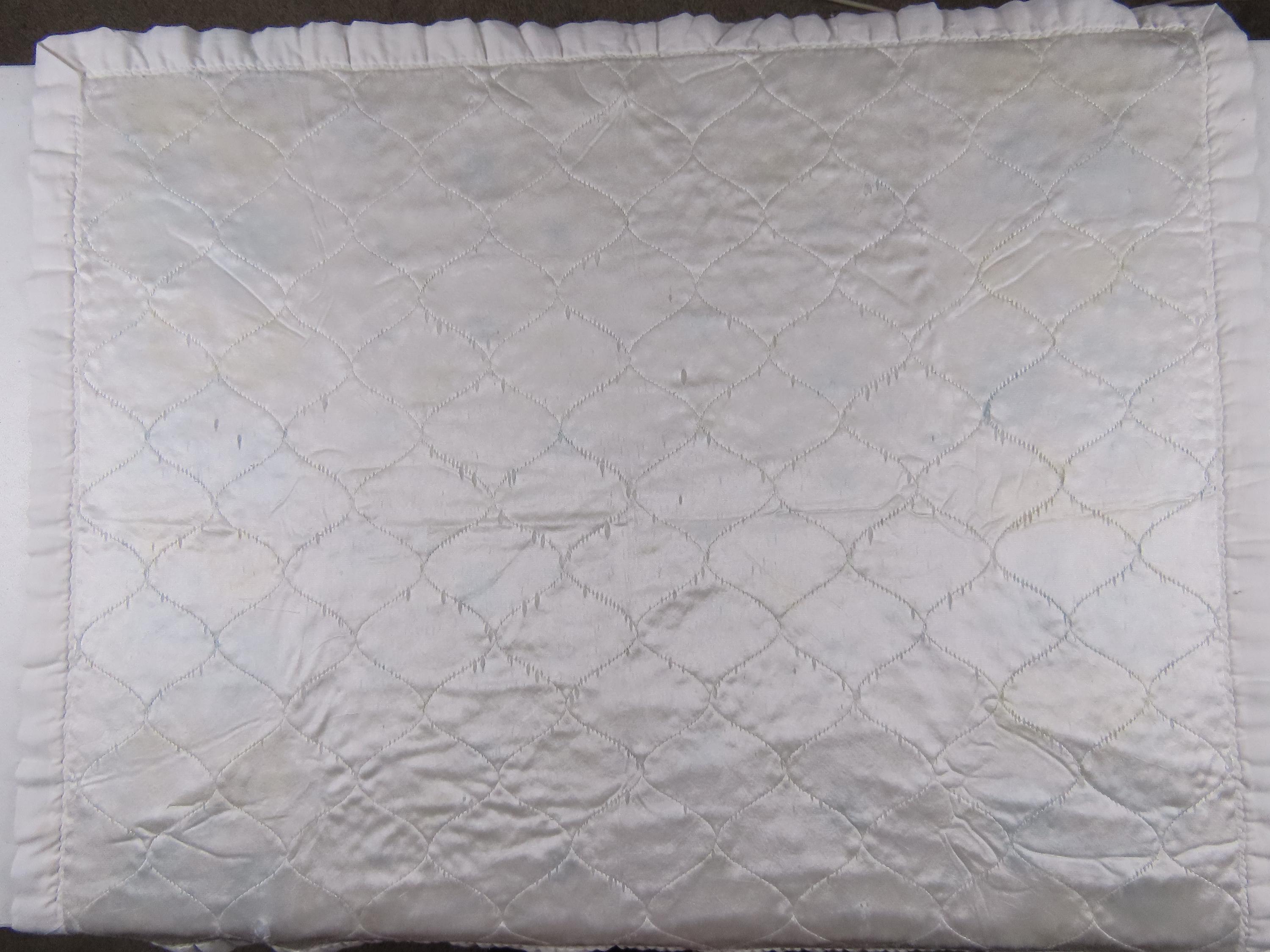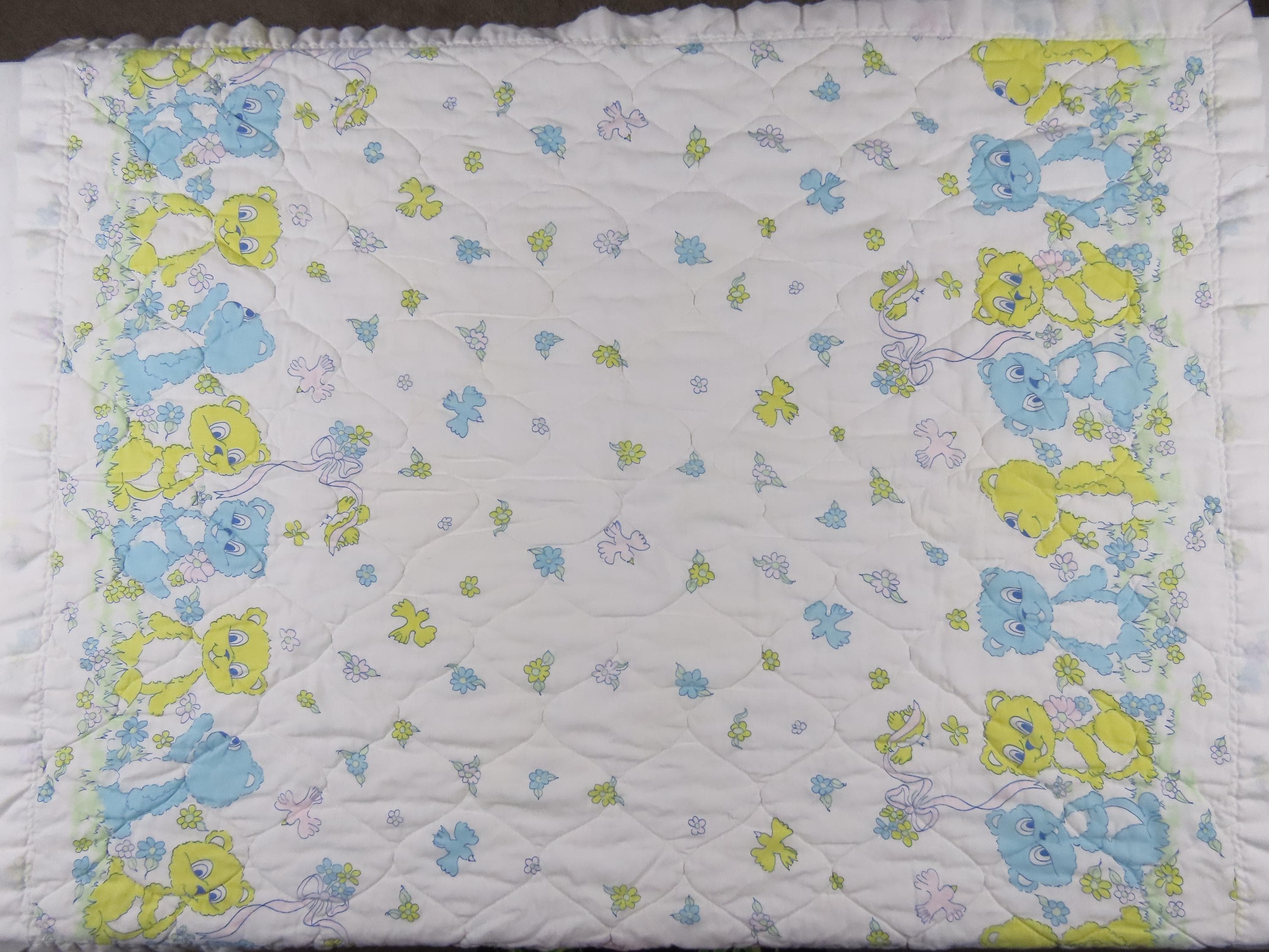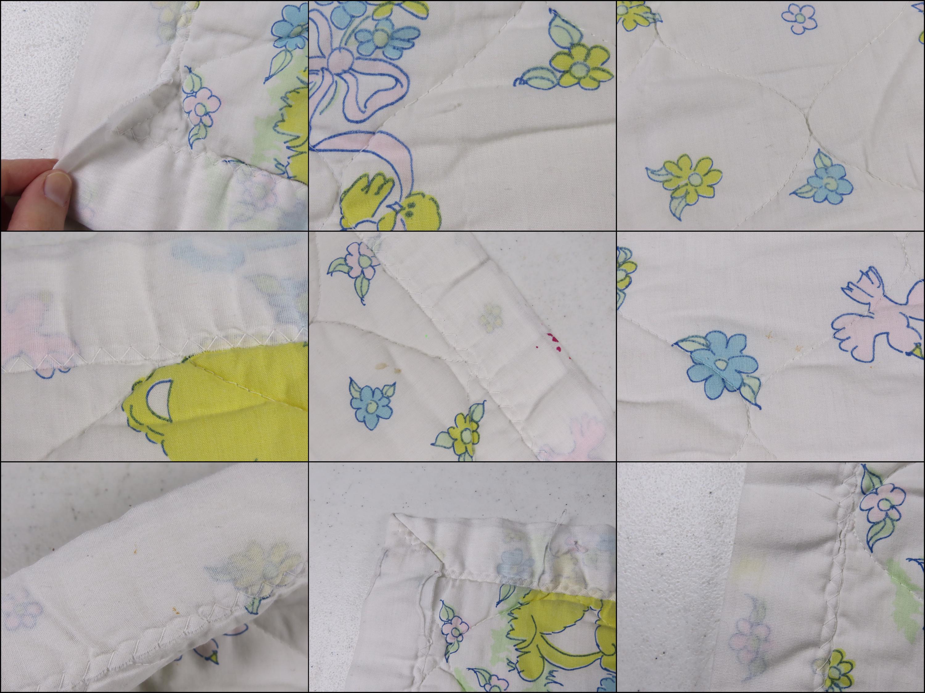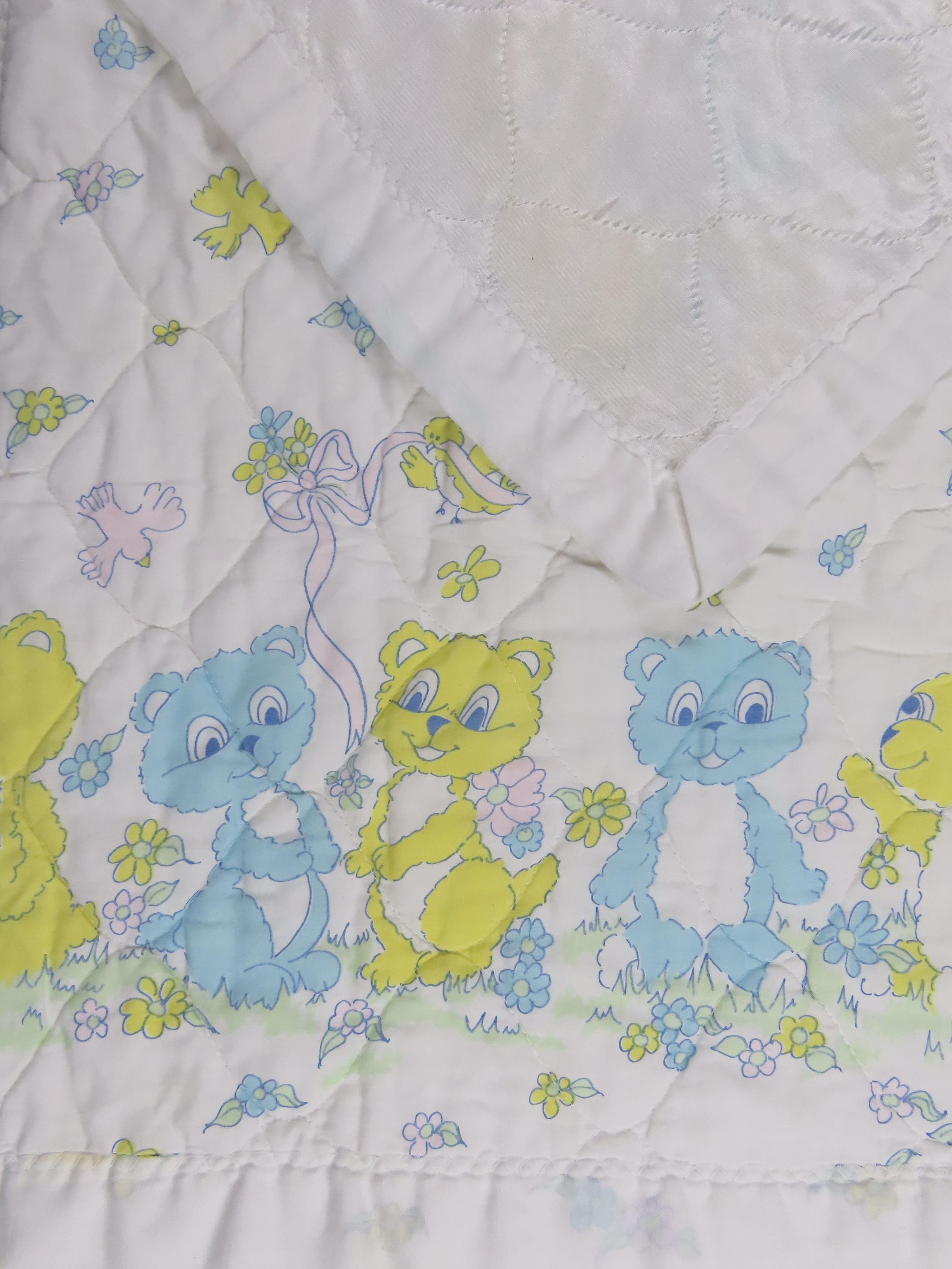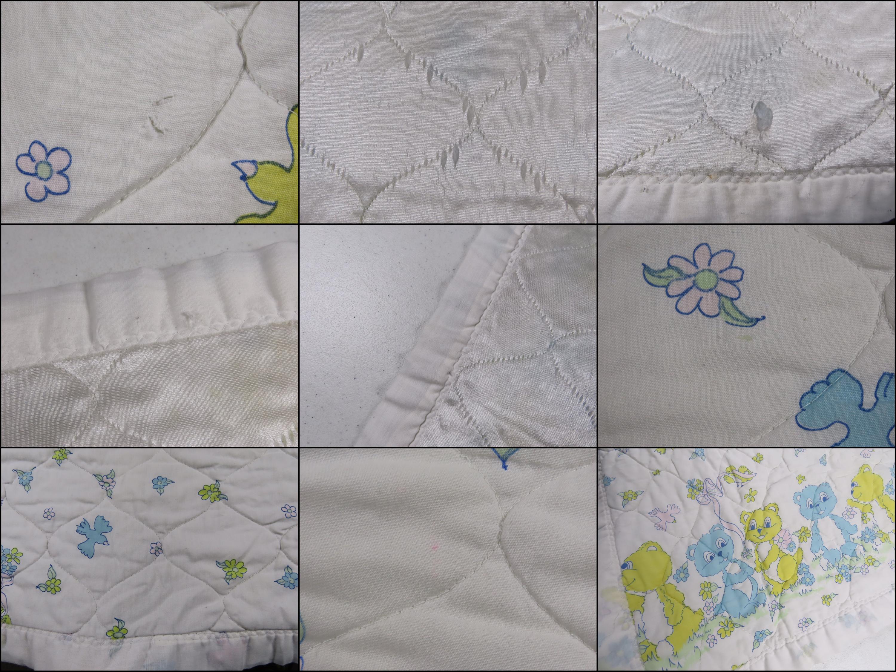 Vintage Teddy Bear small quilted blanket which is about 43" tall by 35" wide (109 cm by 89 cm). It is pilling, worn along the edges/stitching, and discolored in areas. There are loose threads, thread snags, and some small/tiny marks/stains. The binding edge is undone in areas and the edge is fraying. It has a small hole cluster on the front side, and is faded in areas. The backside has A LOT of holes throughout.