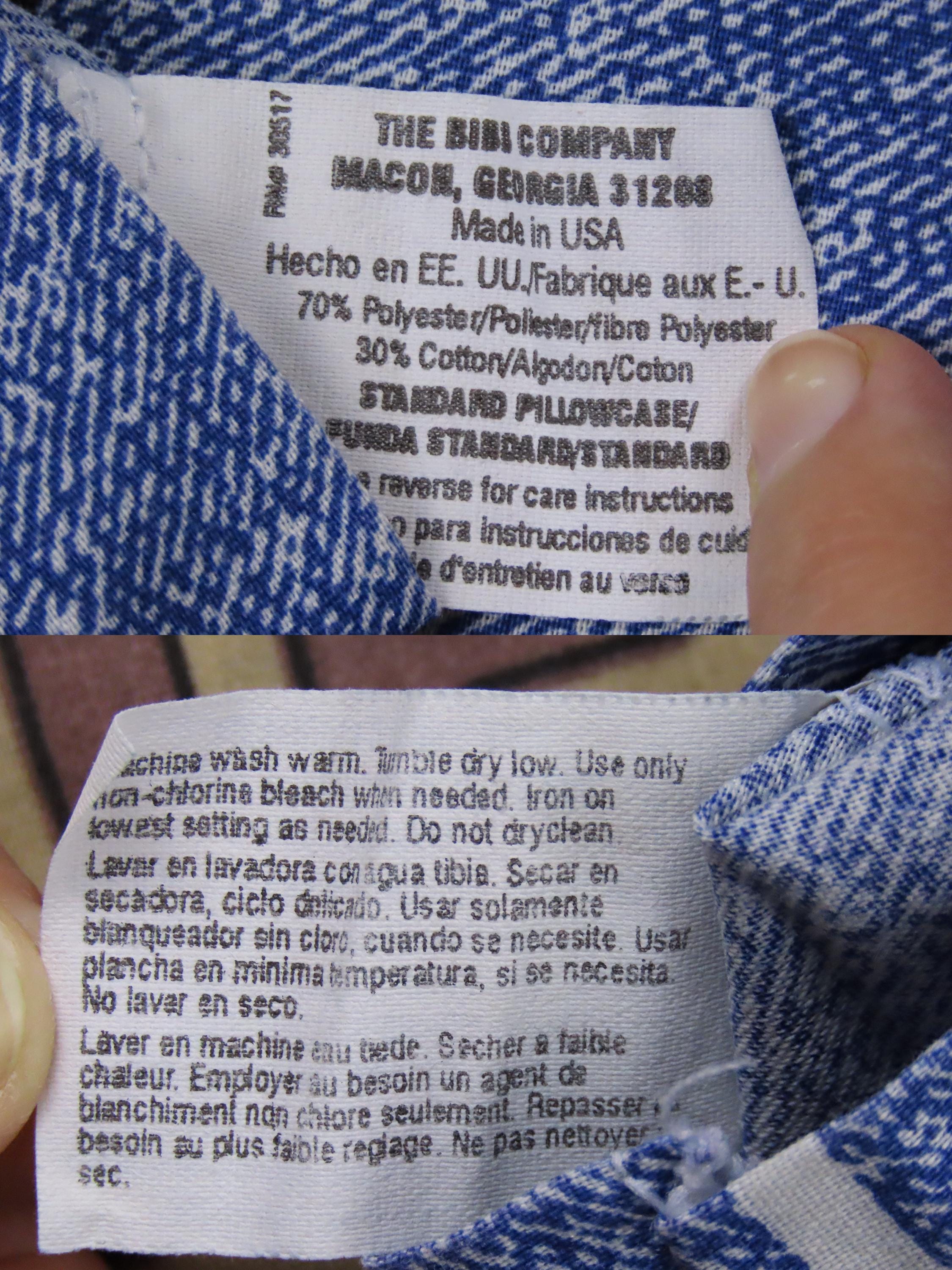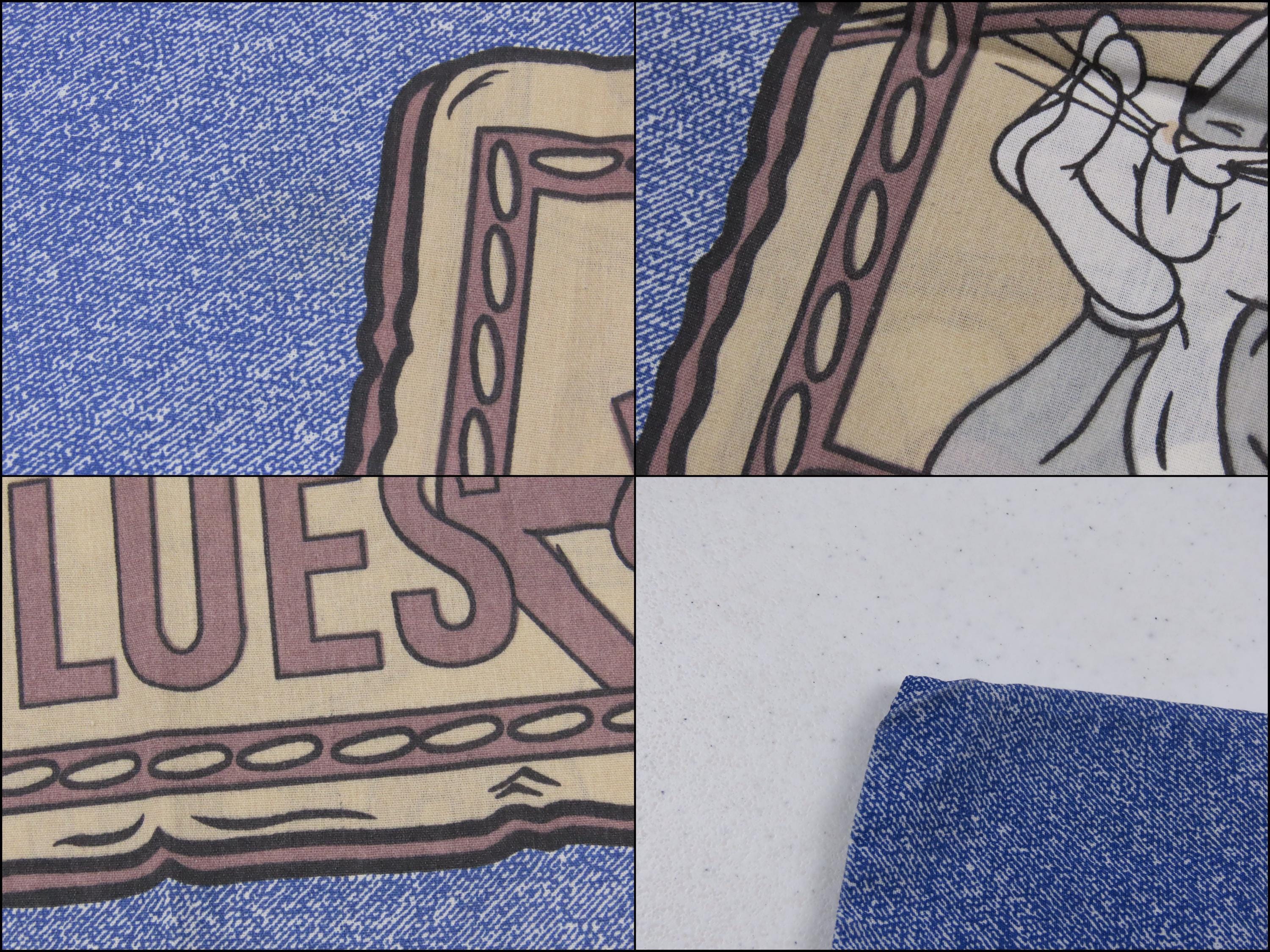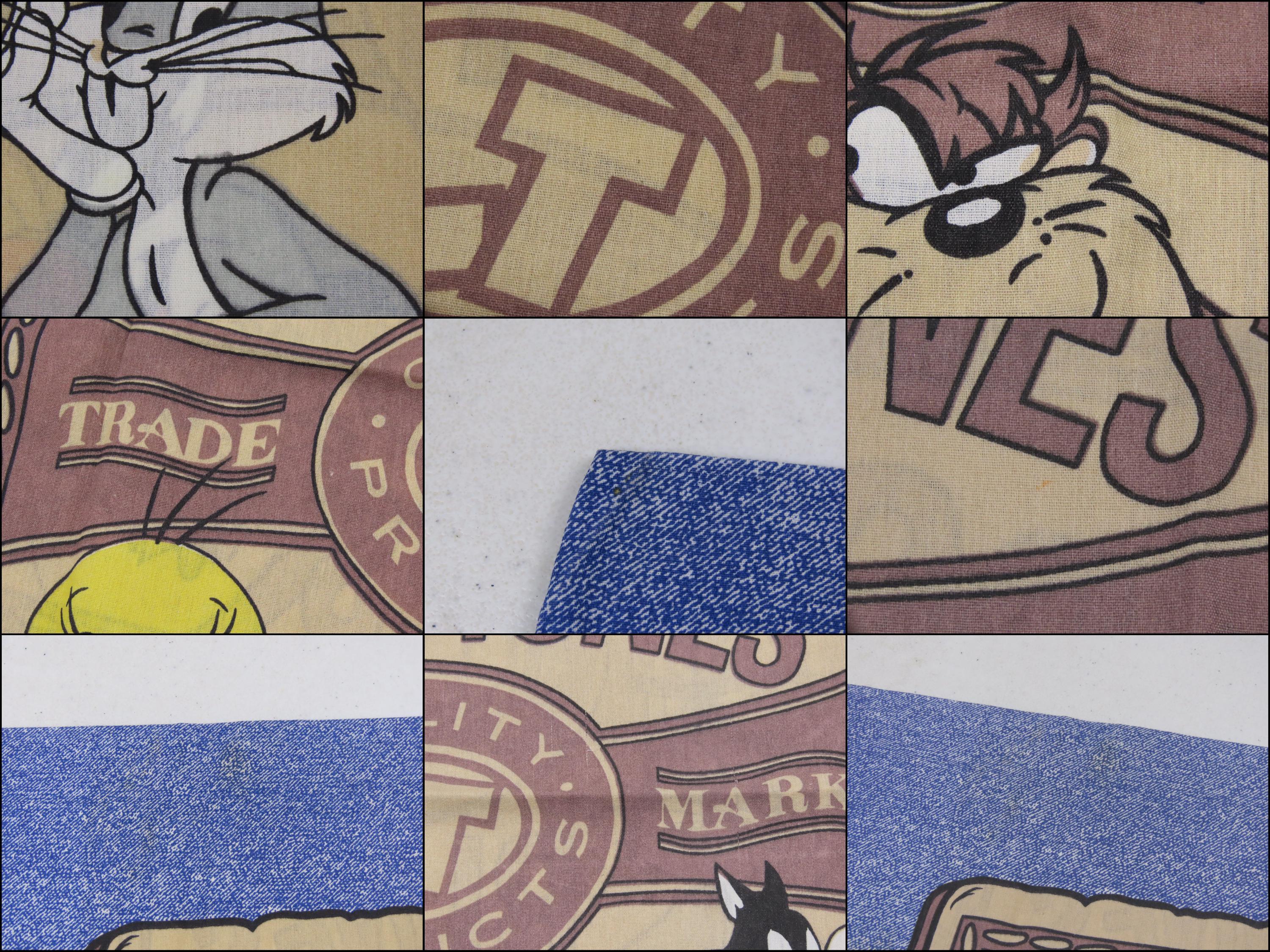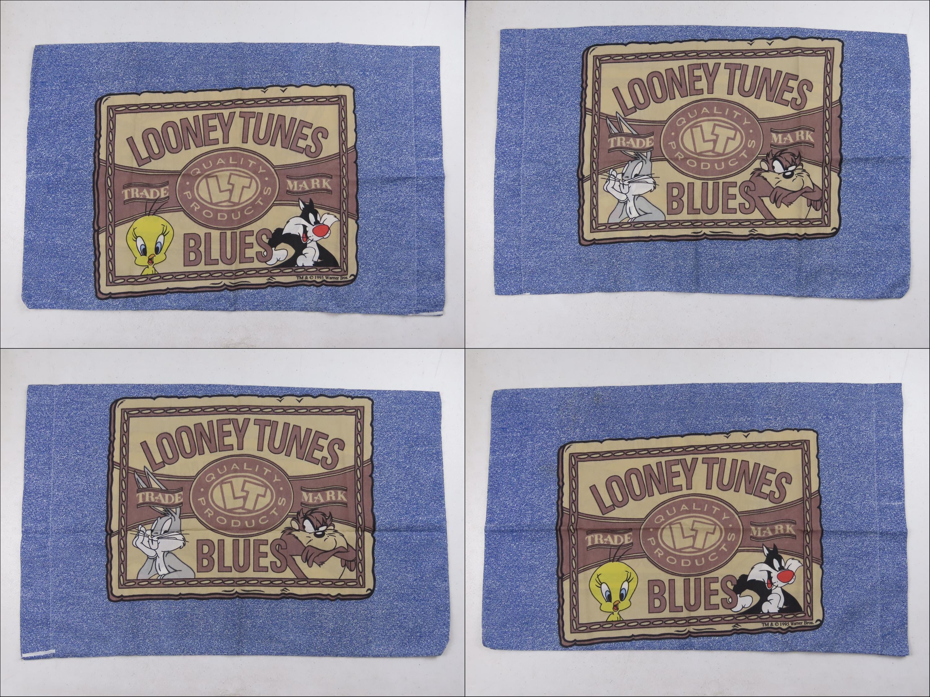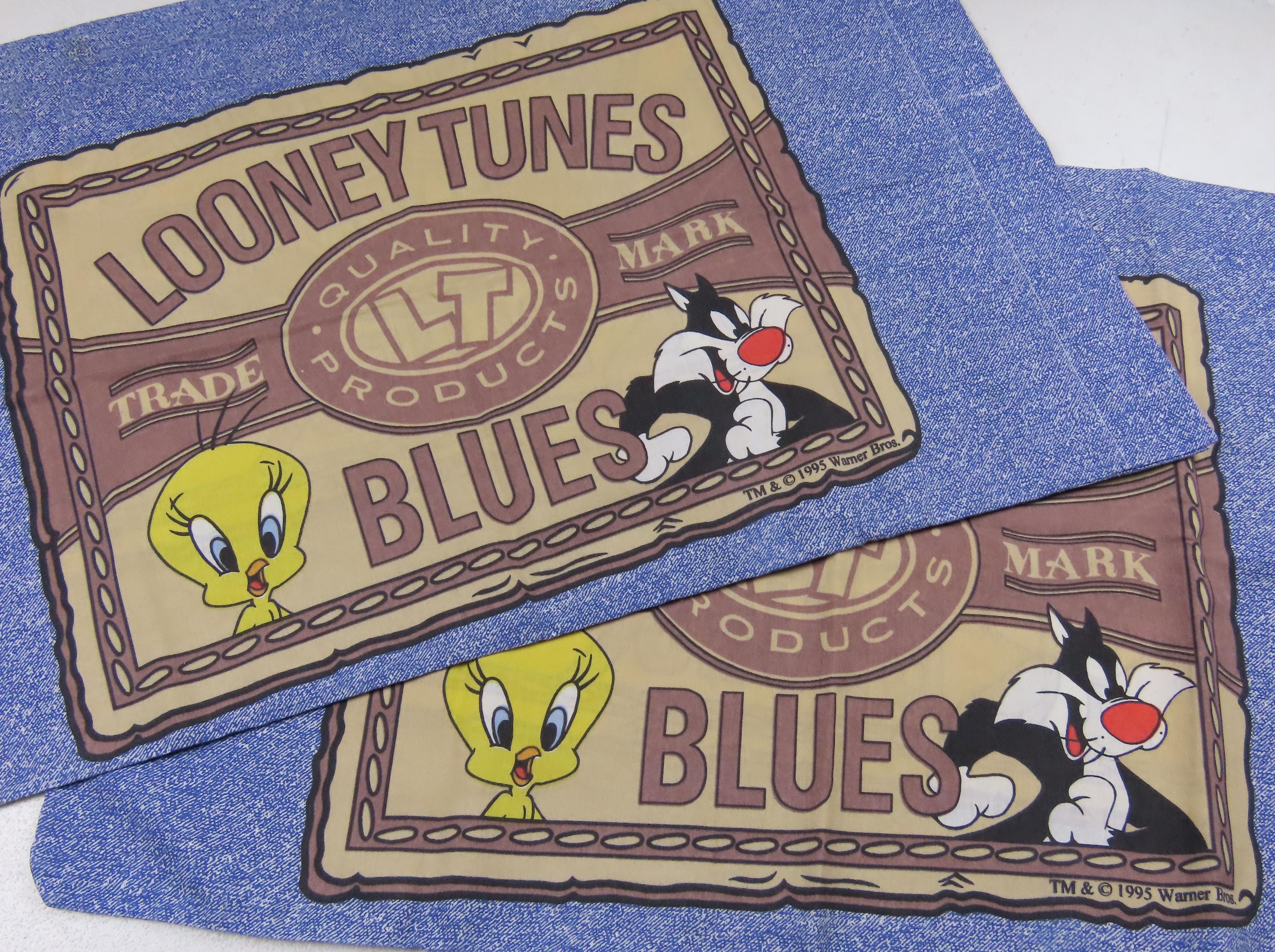 Set of 2 vintage Looney Tunes standard pillowcases from 1995 which are 70% polyester and 30% cotton. Both cases are a little worn along the edges/stitching and have very light pilling in areas. There are some printing errors (color bleeding), tiny marks, and tiny white marks. They have thin spots, and some light whitish marks. The first pillowcase has a small stain in the corner, and a tiny stain. The second pillowcase has a few yellowish stains, missing thread spots, and fold/crease lines along the edges.