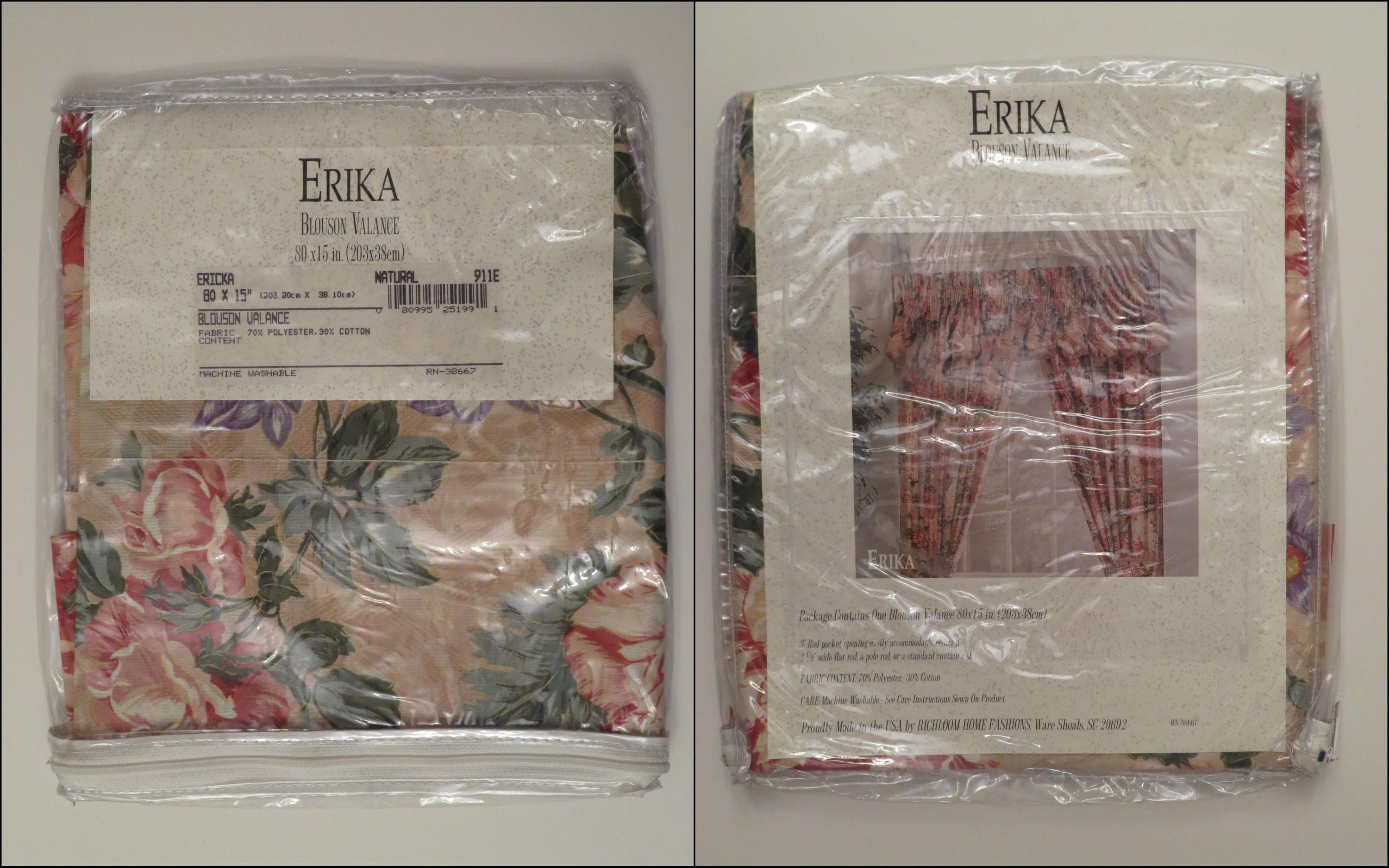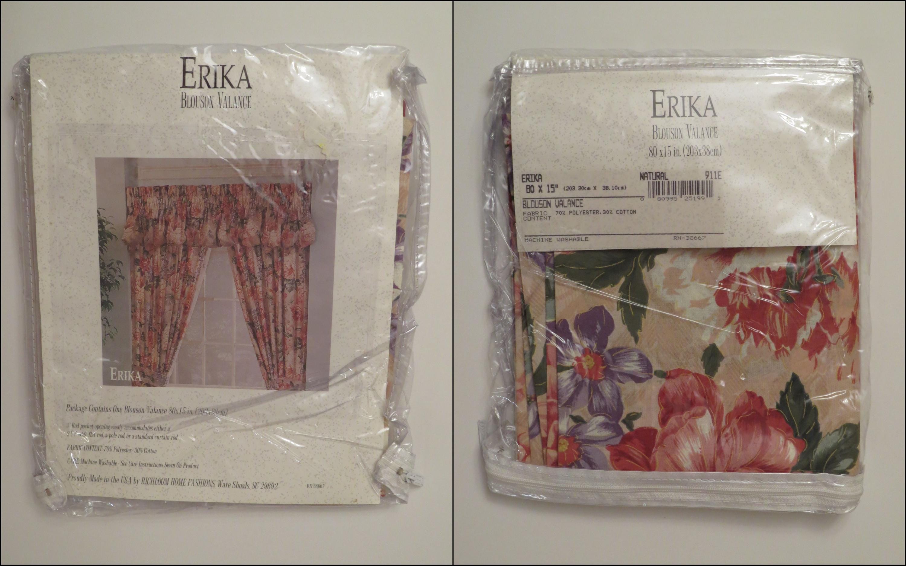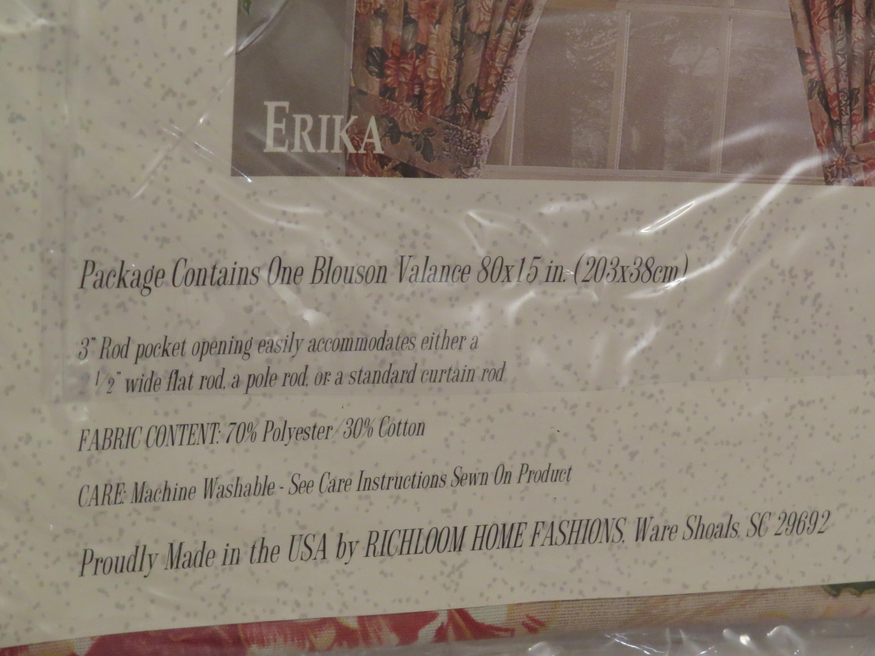 Vintage Floral "Erika Bouson valance" which is new in the package. It is 80" long by 15" tall (203 cm by 38 cm), and has a 3 inch rod pocket. It is 70% polyester and 30% cotton. The plastic packaging is a little worn and has old sticker residue.
