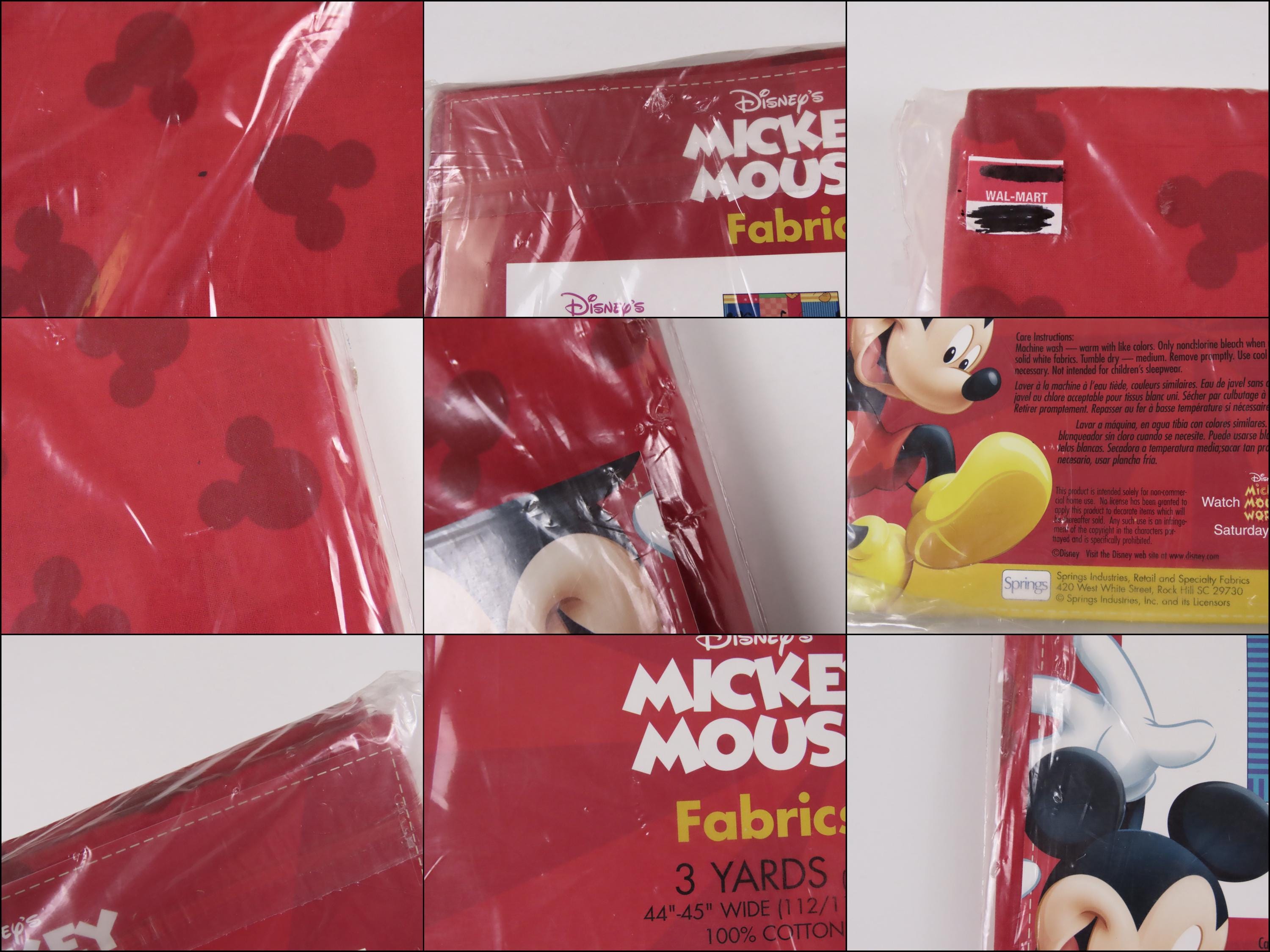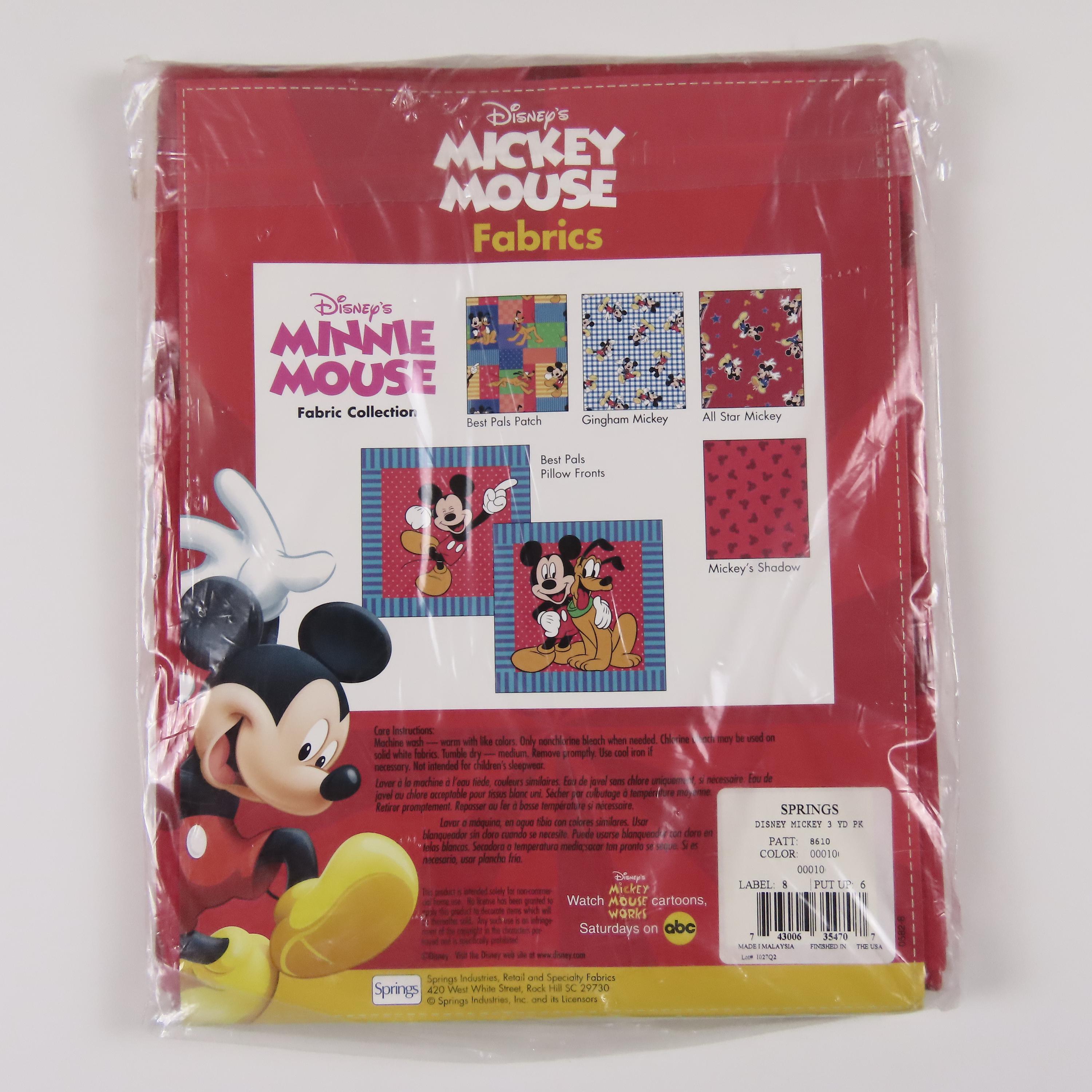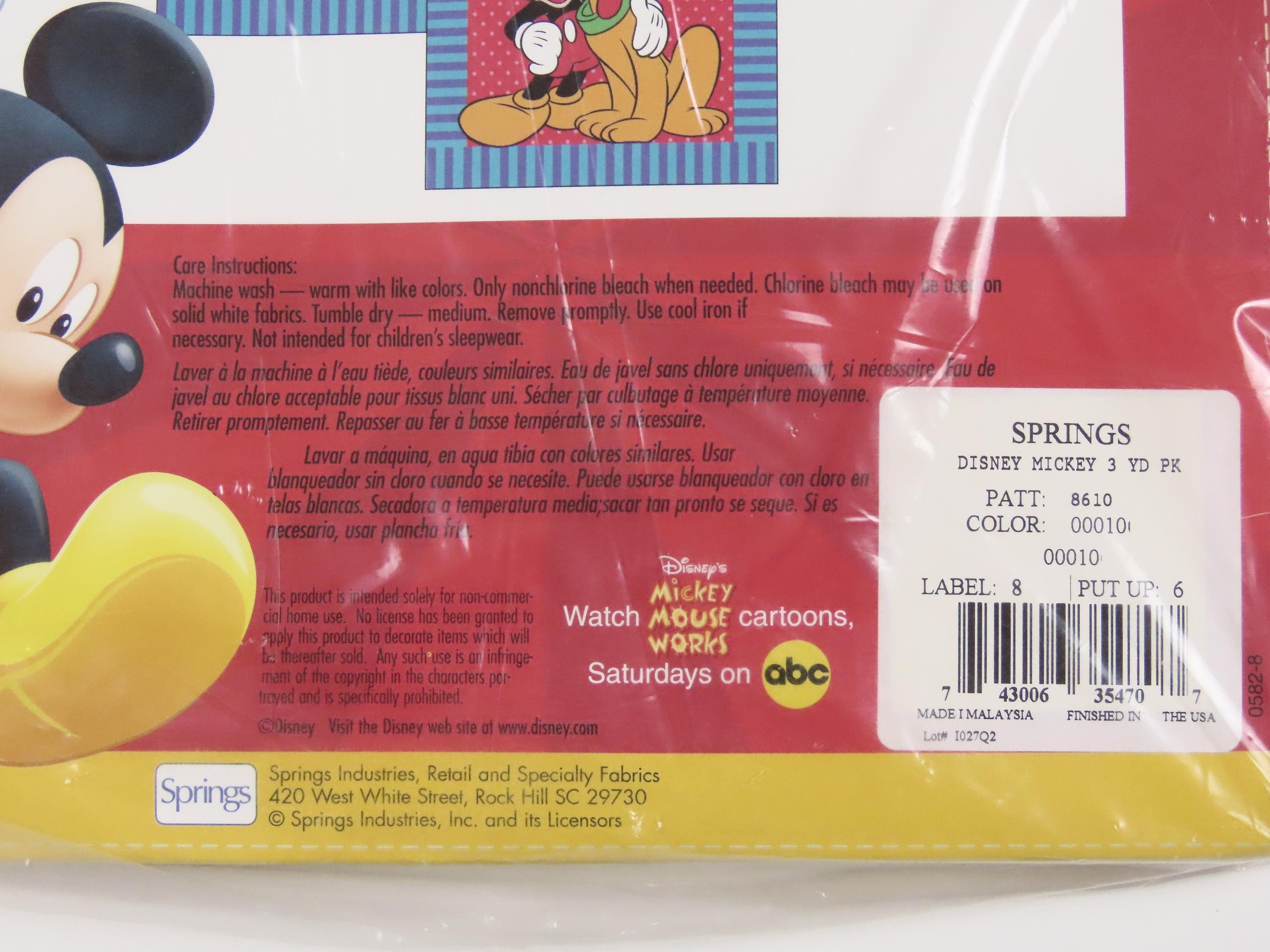 Vintage "Mickey's Shadow" Mickey Mouse fabric from 1999/2000 which is new in the package. There are 3 yards at 44-45" wide, and it is 100% cotton. My camera had a hard time picking up the exact colors. The plastic packaging is worn with multiple small/tiny holes. The fabric has a small dark mark and a tiny dark mark which may be a printing error. I'm not sure if the fabric will have fold/crease lines since it has been folded up in the package for over 20 years.