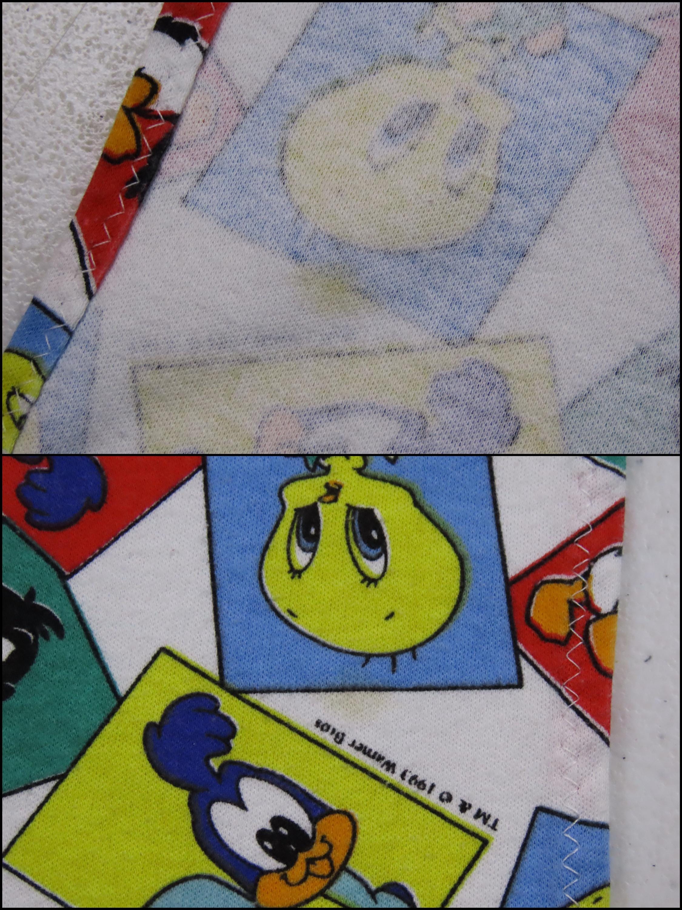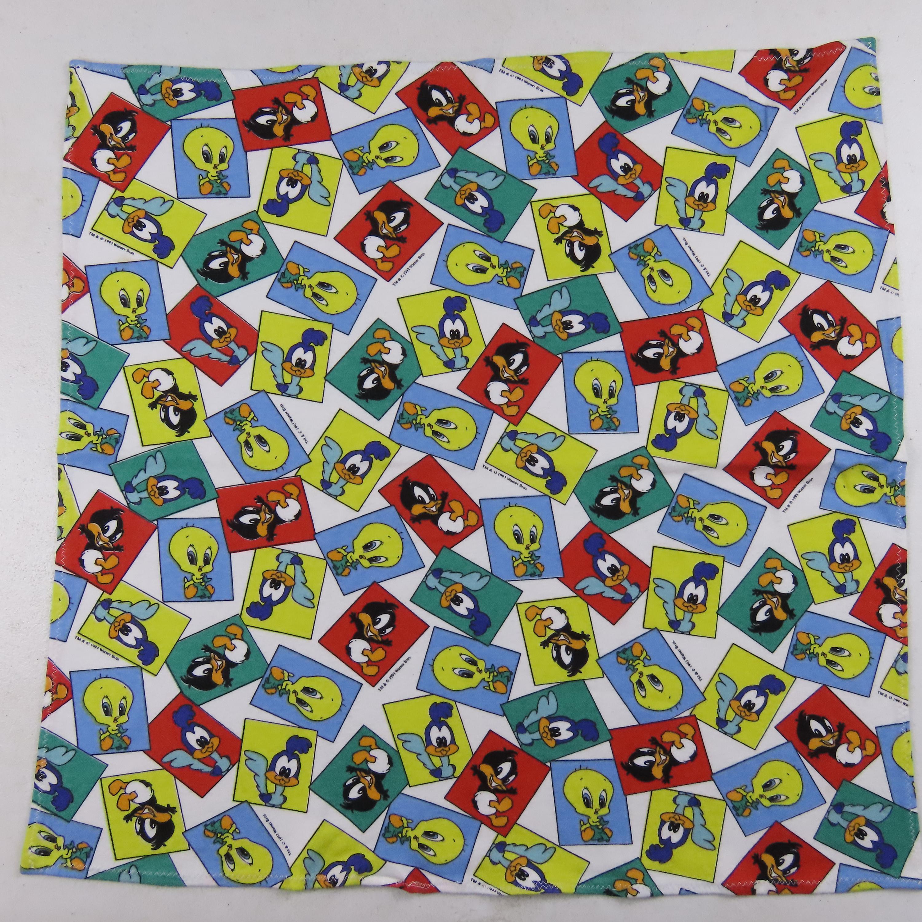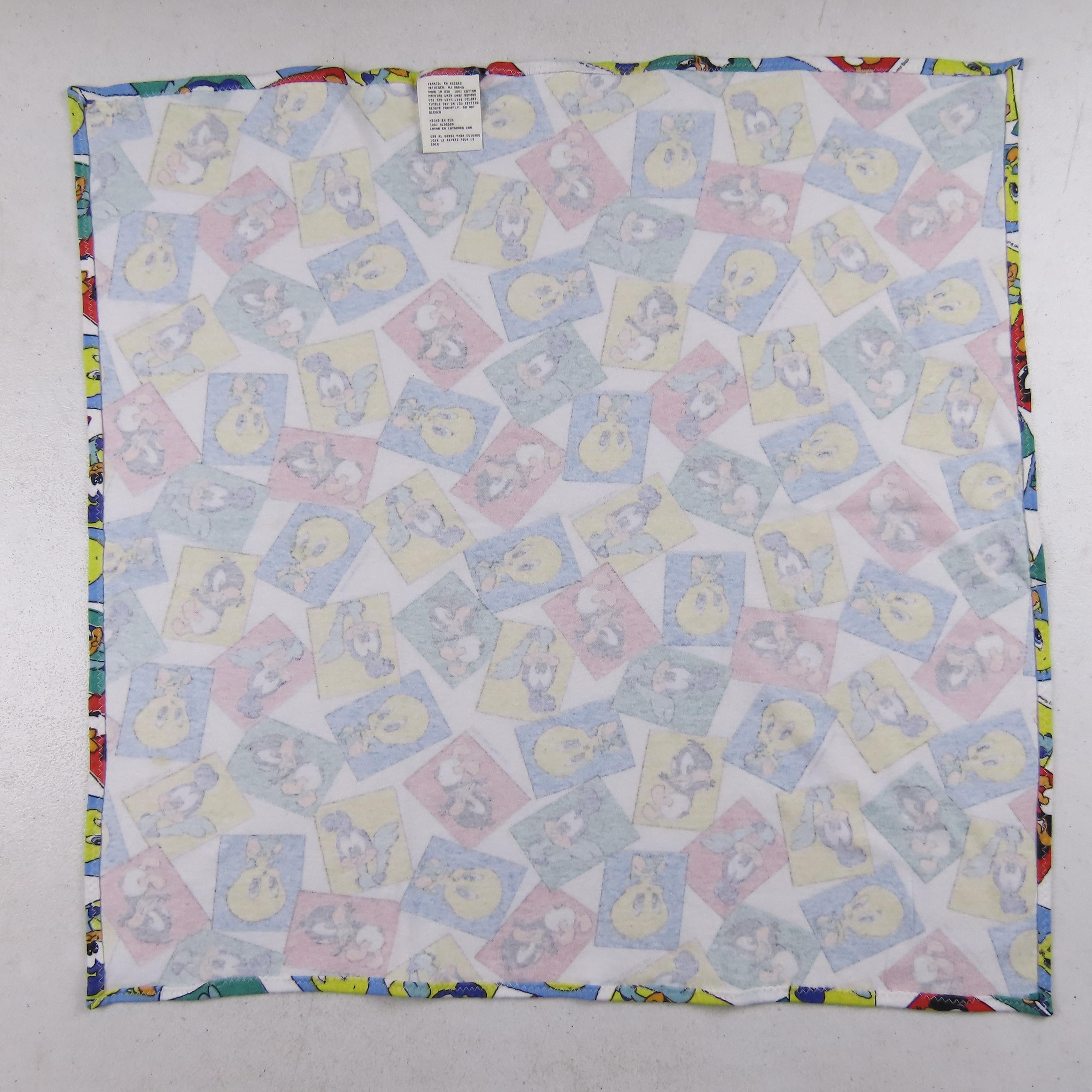 Vintage Baby Looney Tunes receiving blanket from 1993 which is 100% cotton. It is about 23" by 23" (59 cm by 59 cm). My camera had a hard time picking up the exact colors. It is a fairly stretchy material, it reminds me of jersey knit fabric. There is light pilling in areas, and it looks like it has stretched some since the edges are not completely straight. It has some tiny white marks, some small blemishes, and a small stain. The fabric bunches up along the stitching some around the edge, mainly where the tag is.