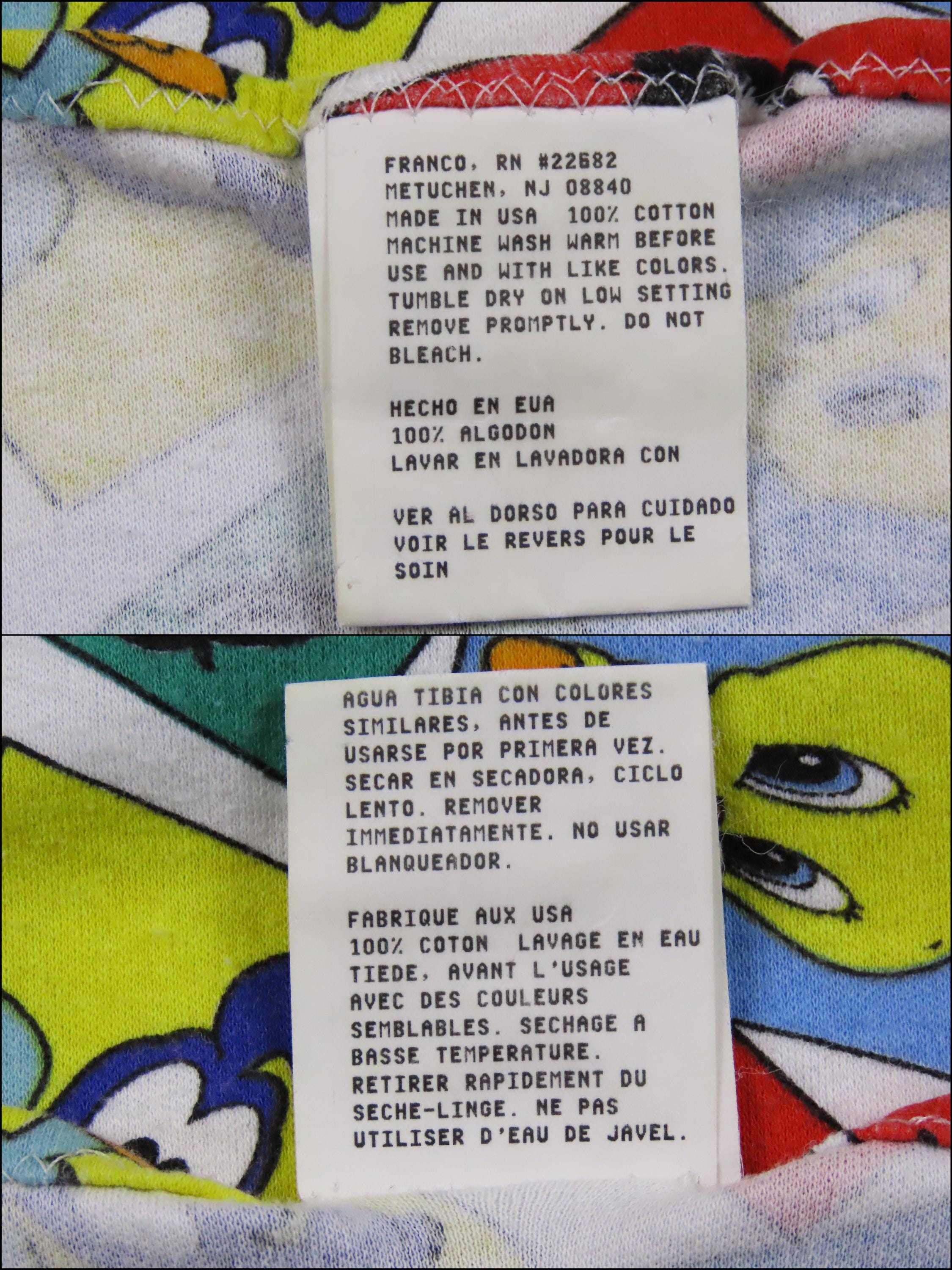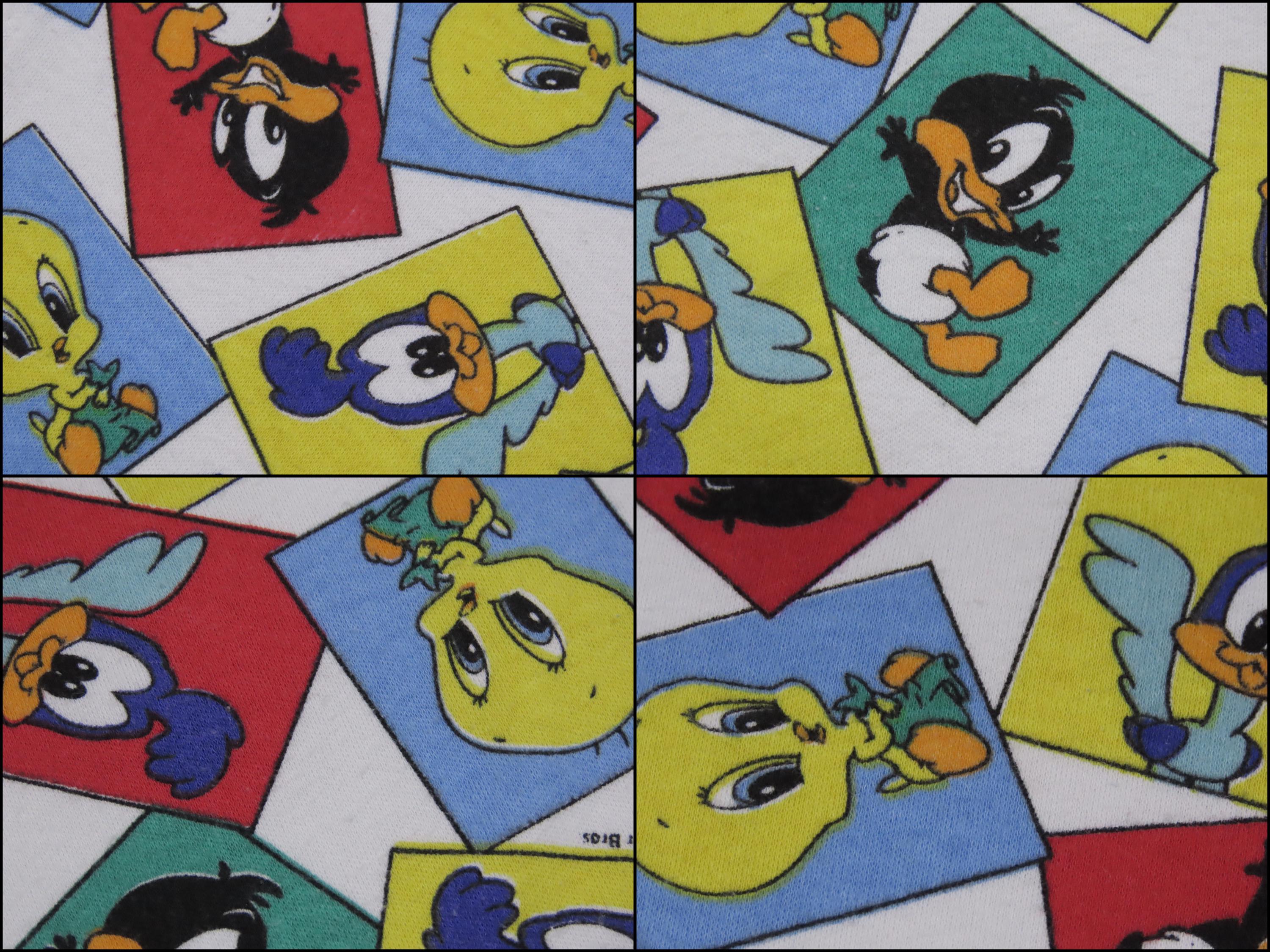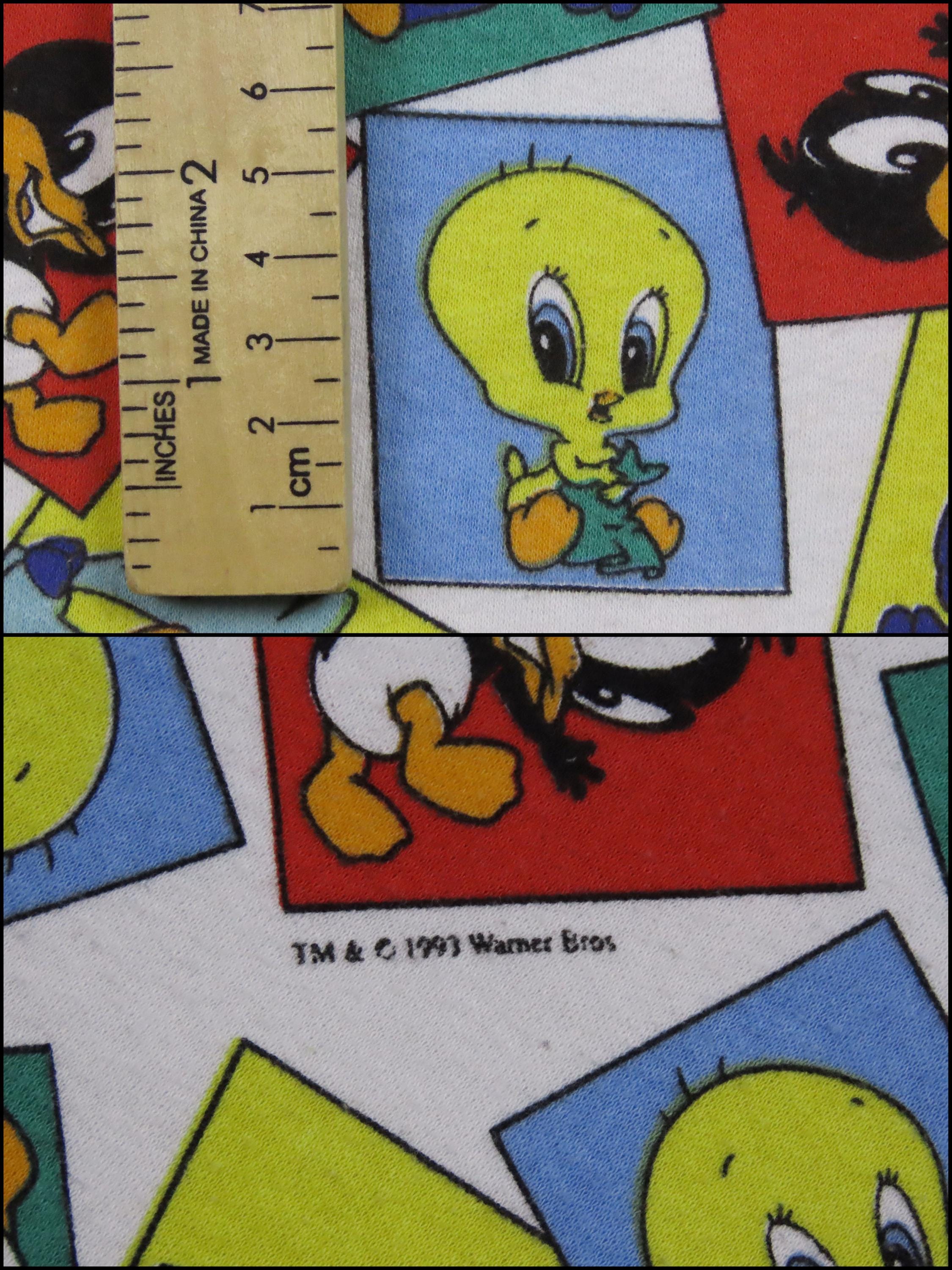 Vintage Baby Looney Tunes receiving blanket from 1993 which is 100% cotton. It is about 23" by 23" (59 cm by 59 cm). My camera had a hard time picking up the exact colors. It is a fairly stretchy material, it reminds me of jersey knit fabric. There is light pilling in areas, and it looks like it has stretched some since the edges are not completely straight. It has some tiny white marks, some small blemishes, and a small stain. The fabric bunches up along the stitching some around the edge, mainly where the tag is.