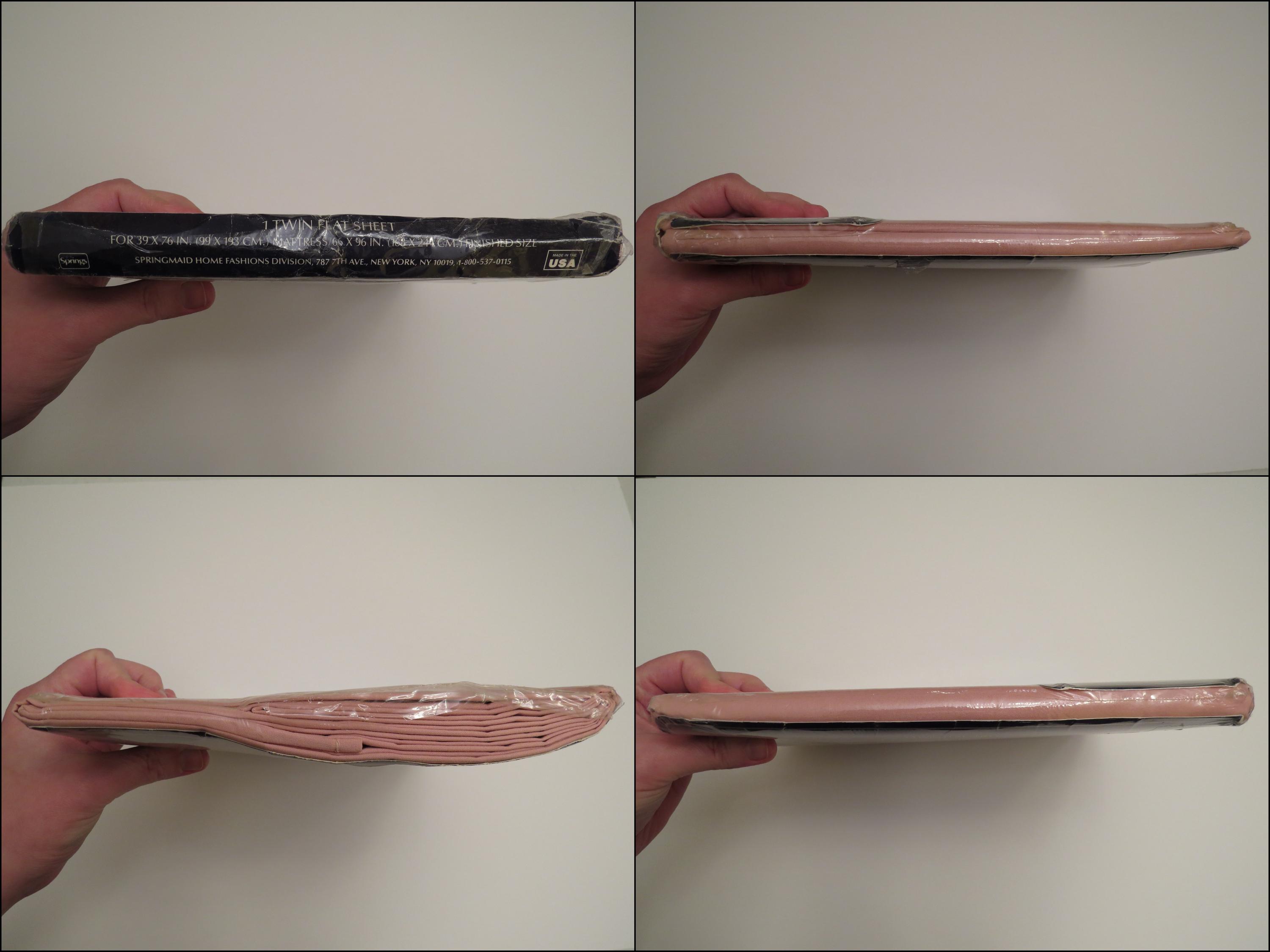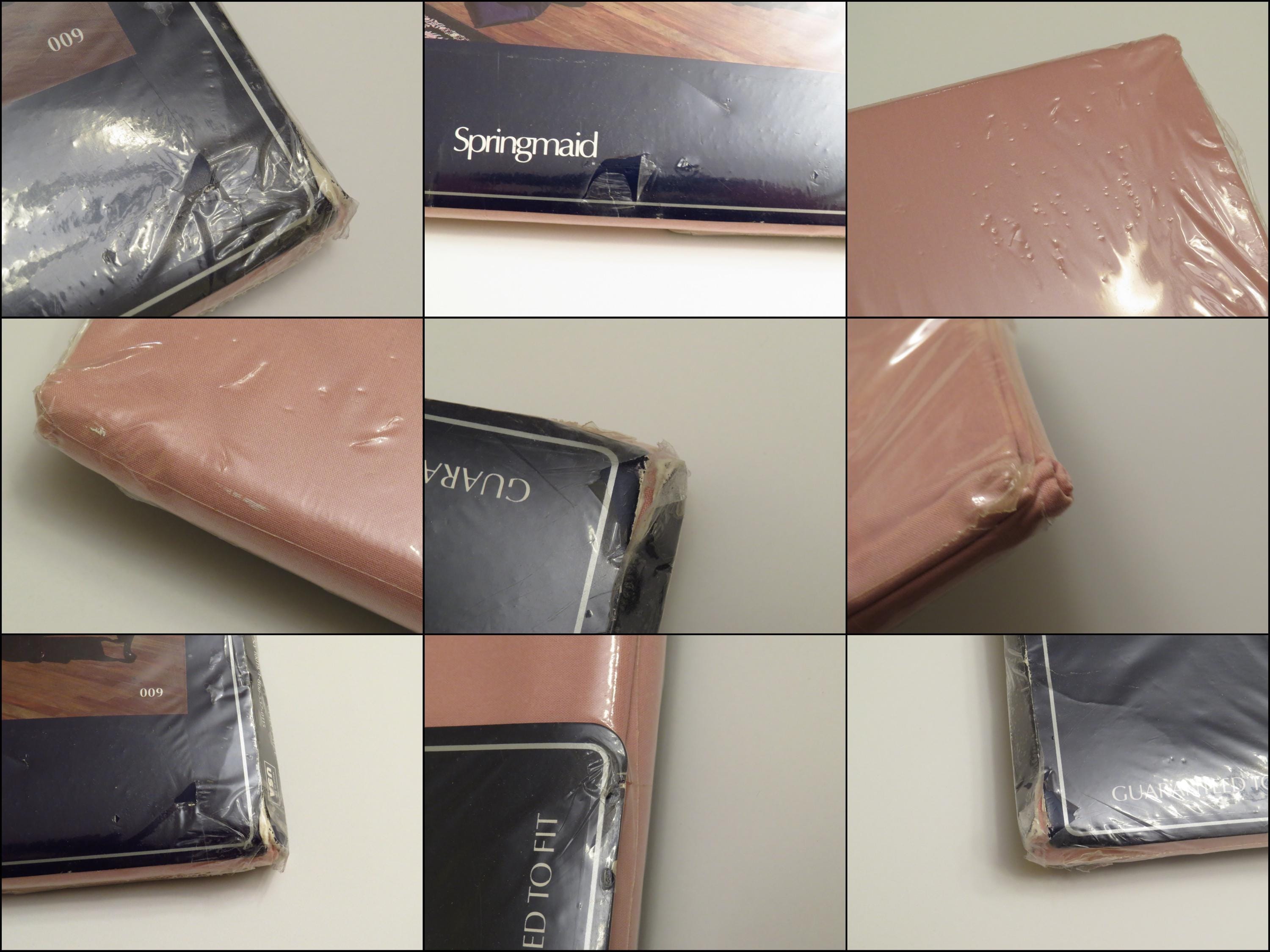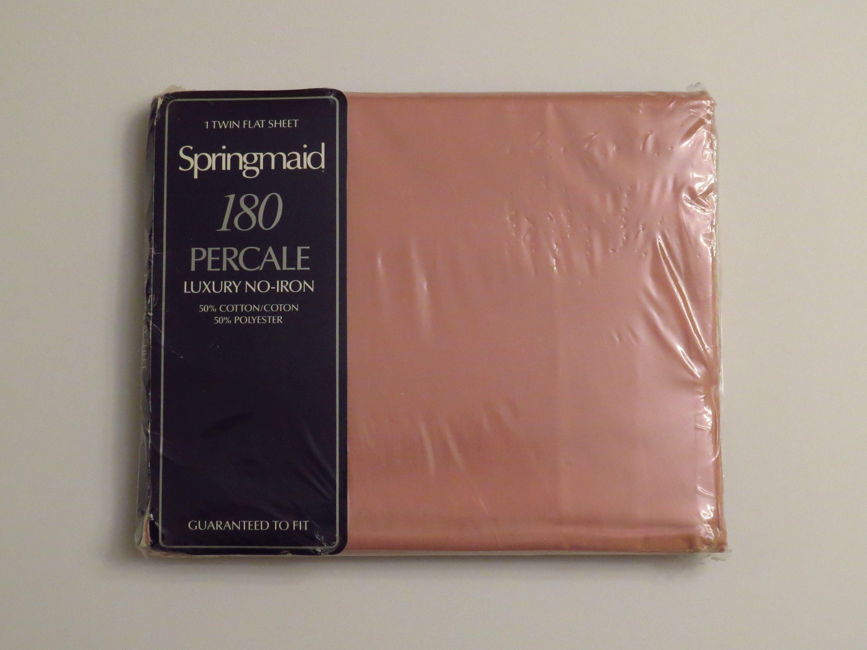 Vintage Springmaid dark pink twin flat sheet which is new in the package. It is 50% cotton and 50% polyester with a 180 thread count. My camera had a hard time picking up the exact color. The packaging is worn. There are small holes in the plastic, and a large hole on one end. The other end has been taped over, but the sheet has never been removed from the packaging.