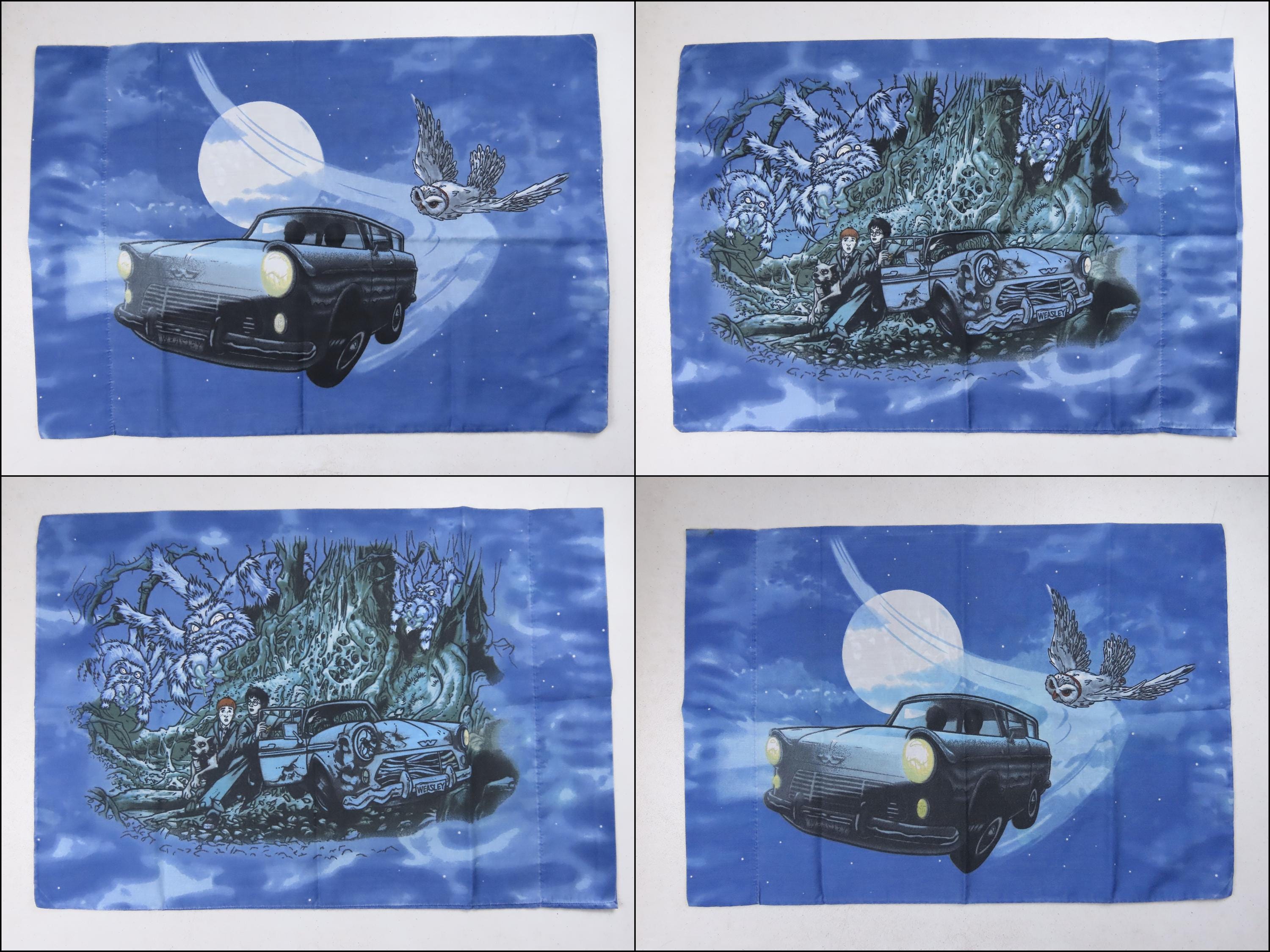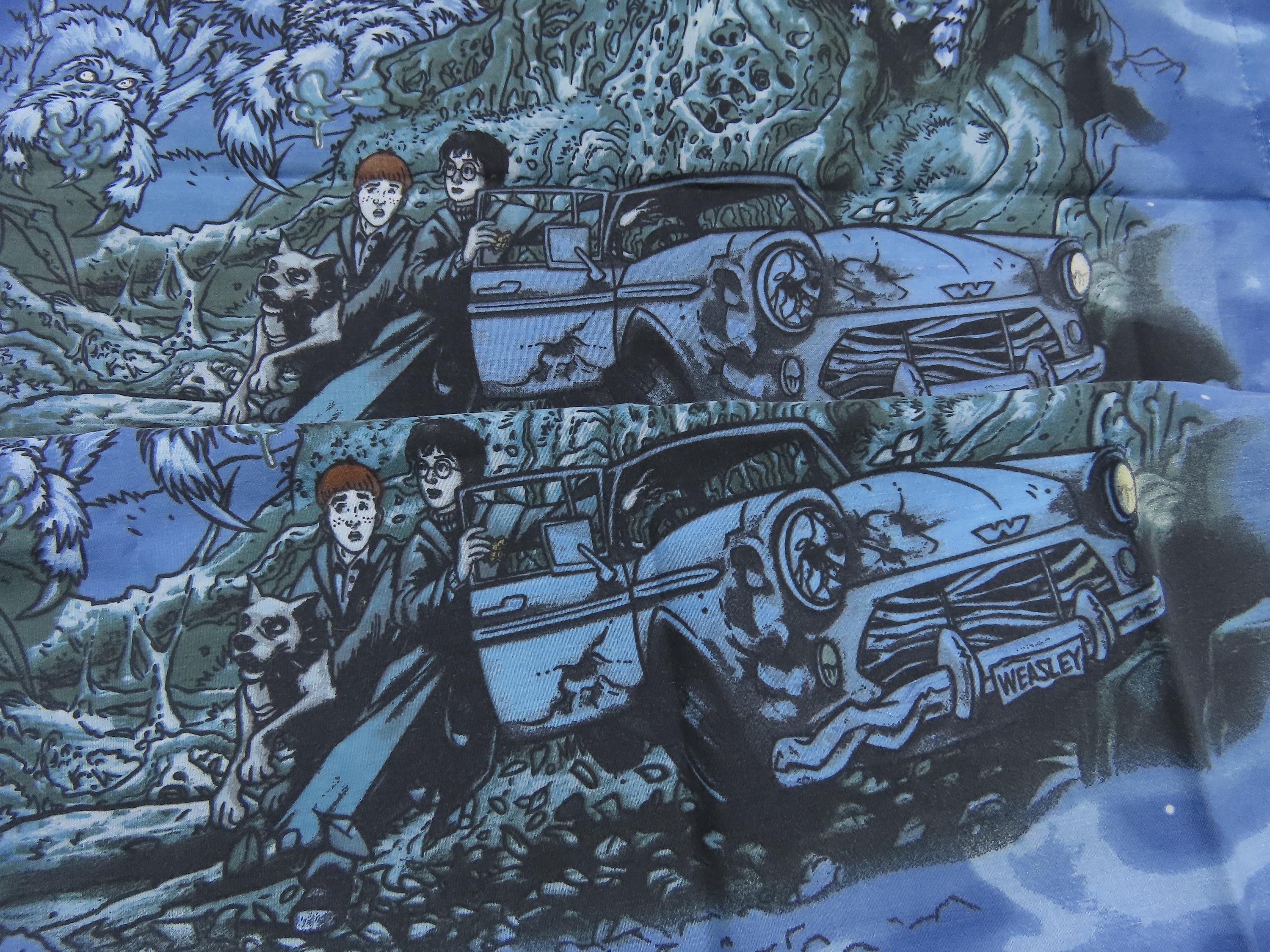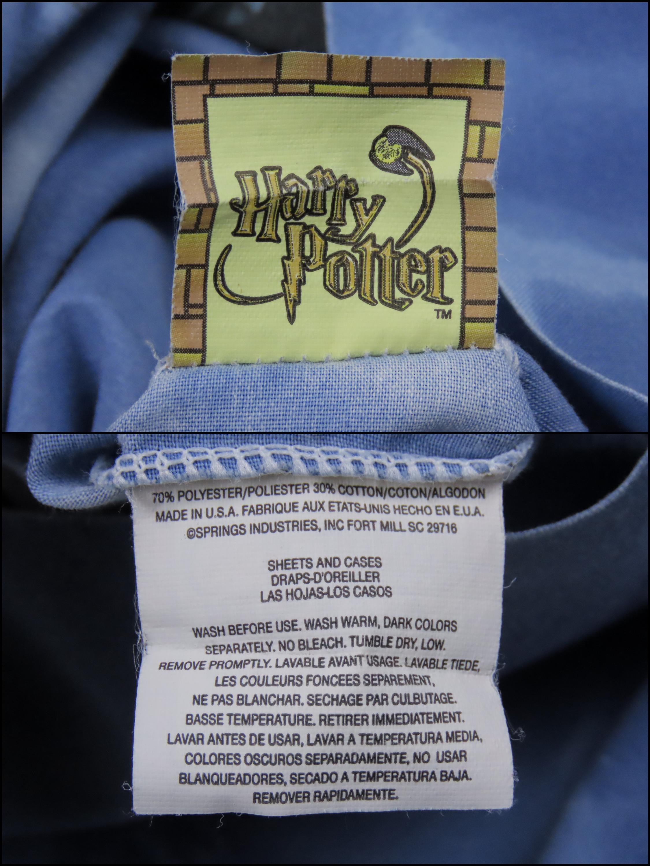 Set of 2 vintage Harry Potter standard pillowcases which are 70% polyester and 30% cotton. Both pillowcases are a little faded/streaky, and are worn along the edges/stitching. The dark colors are more worn. There is extremely light pilling in areas, and some exposed stitching
