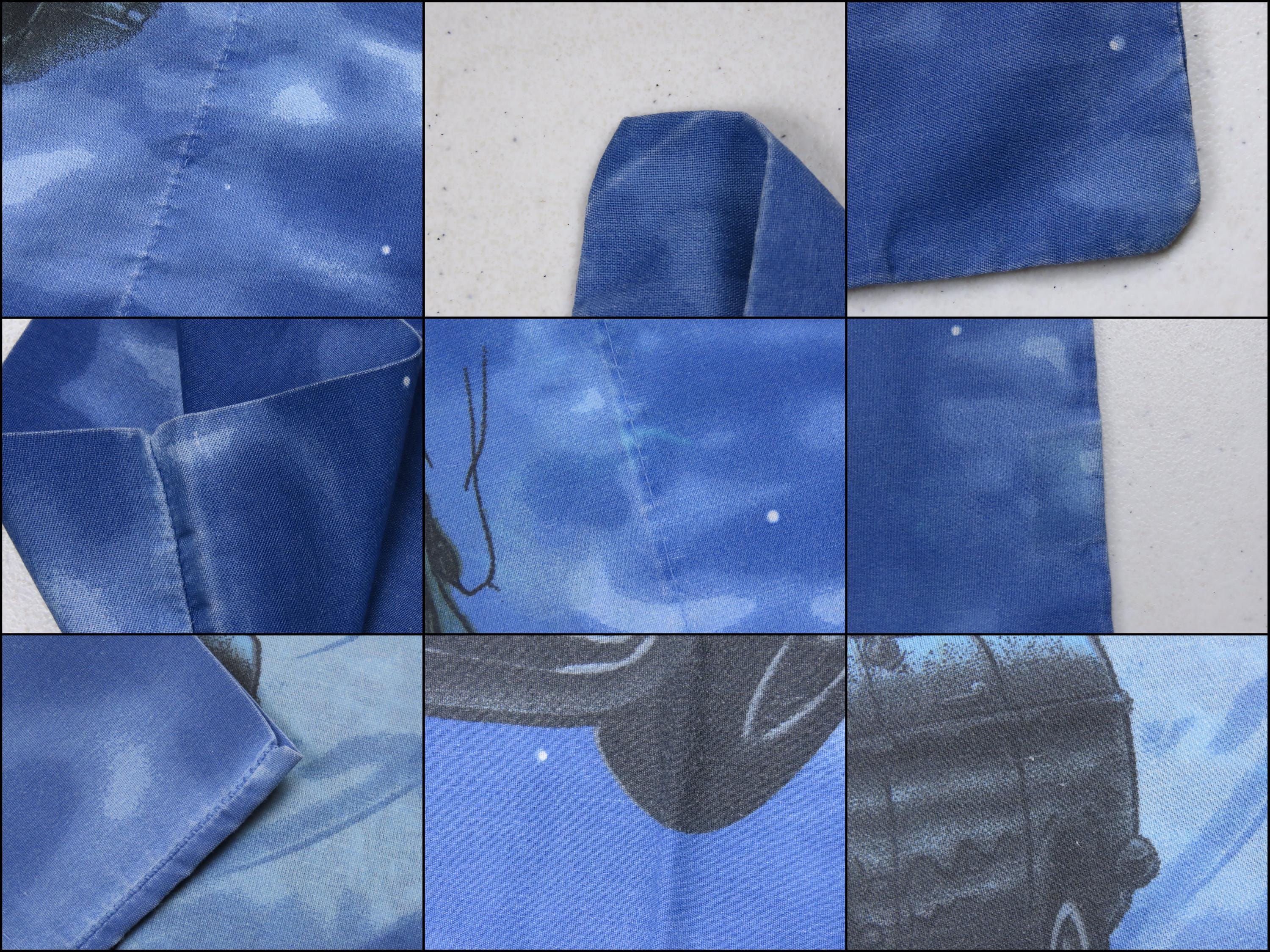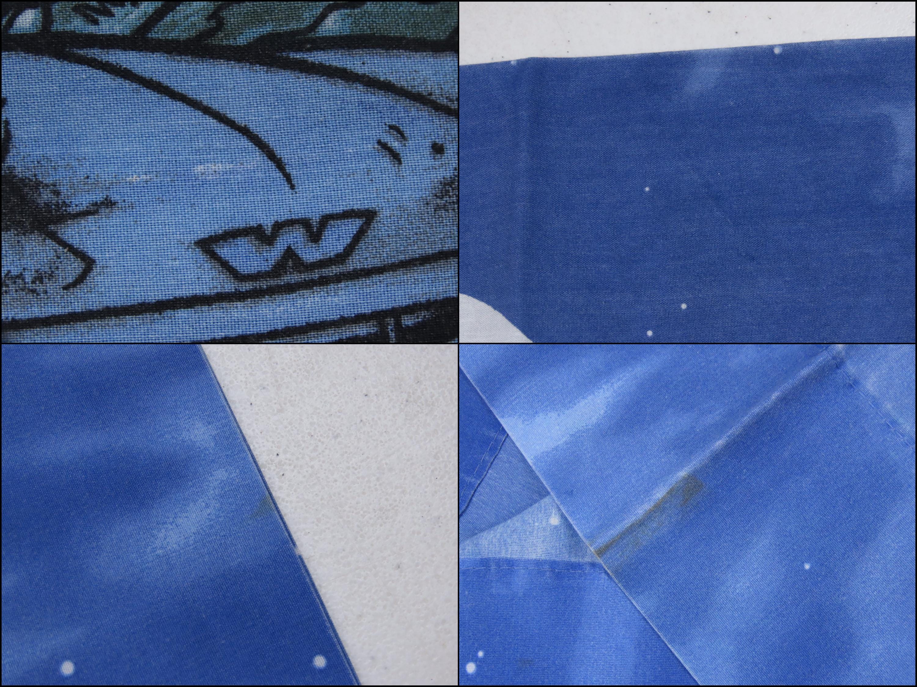 The first pillowcase has a few light whitish marks, and a few small blemishes. The second case has a thread snag, a small stain, and a larger stain on the edge. There are some areas that look like there are some small light bleach stains. They blend into the background colors, so it is harder to tell. The car on the spider side is brighter than the first pillowcase.