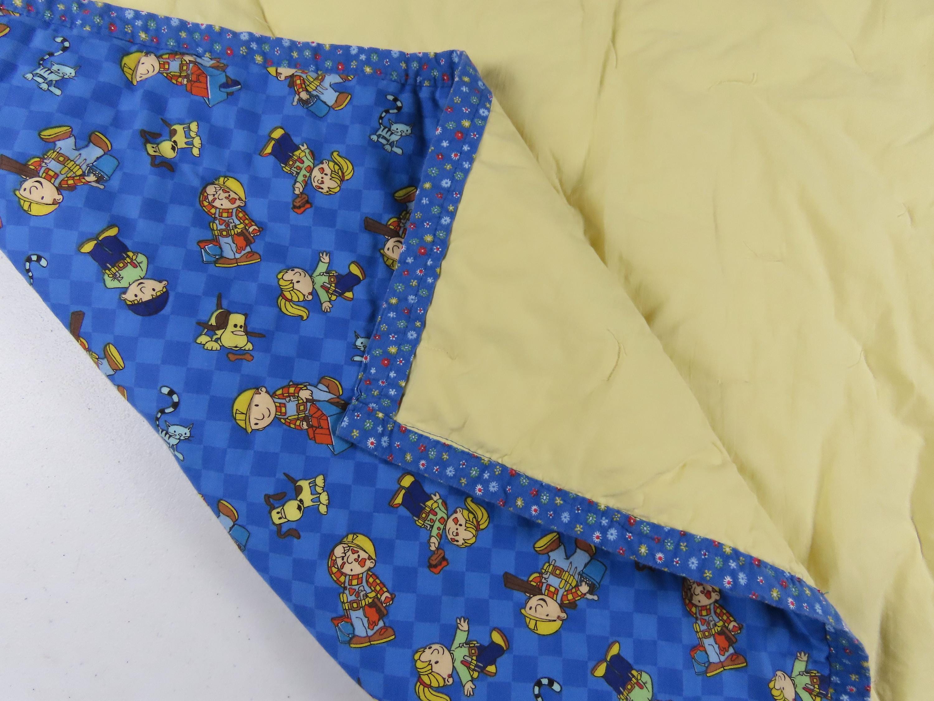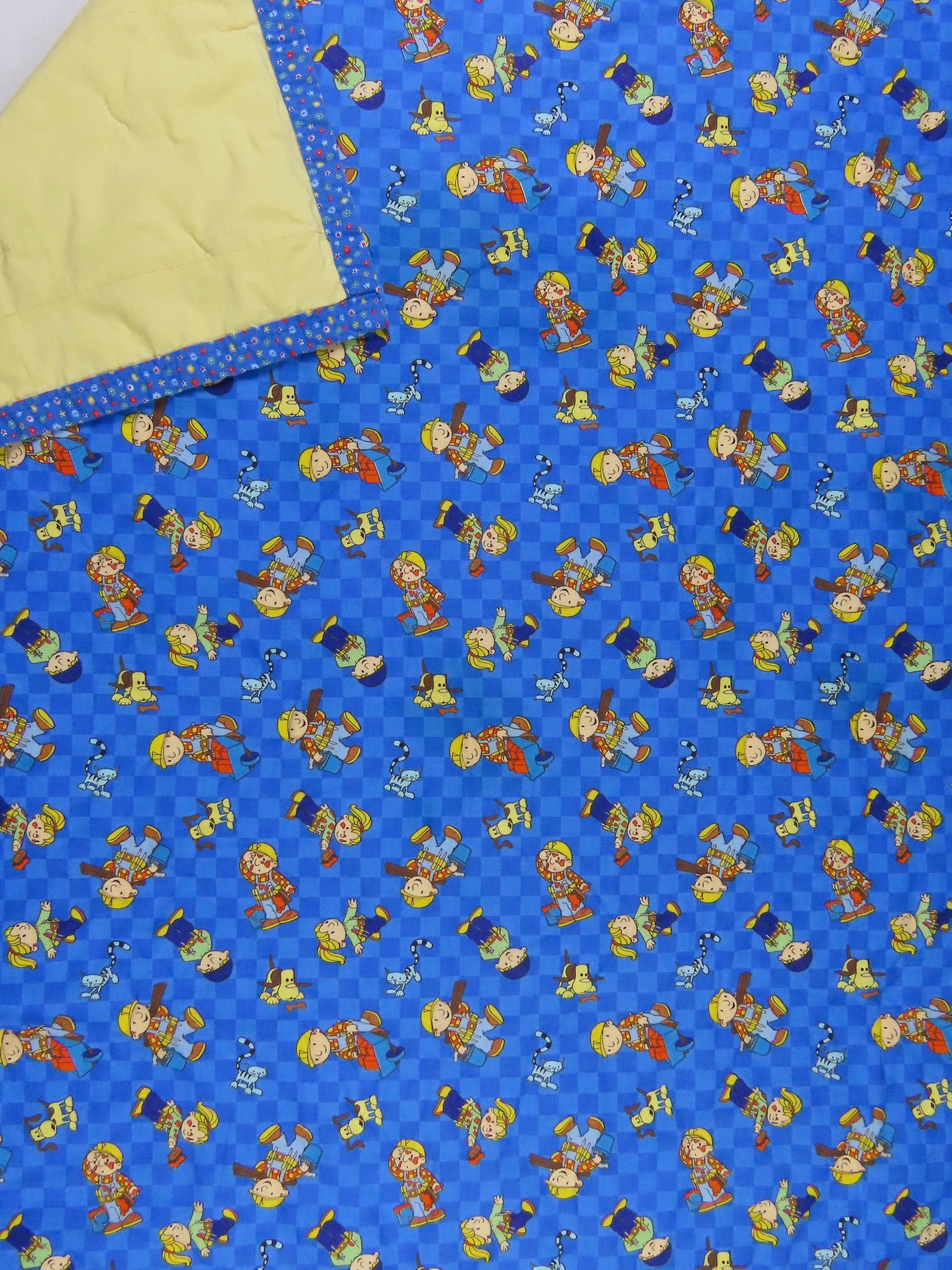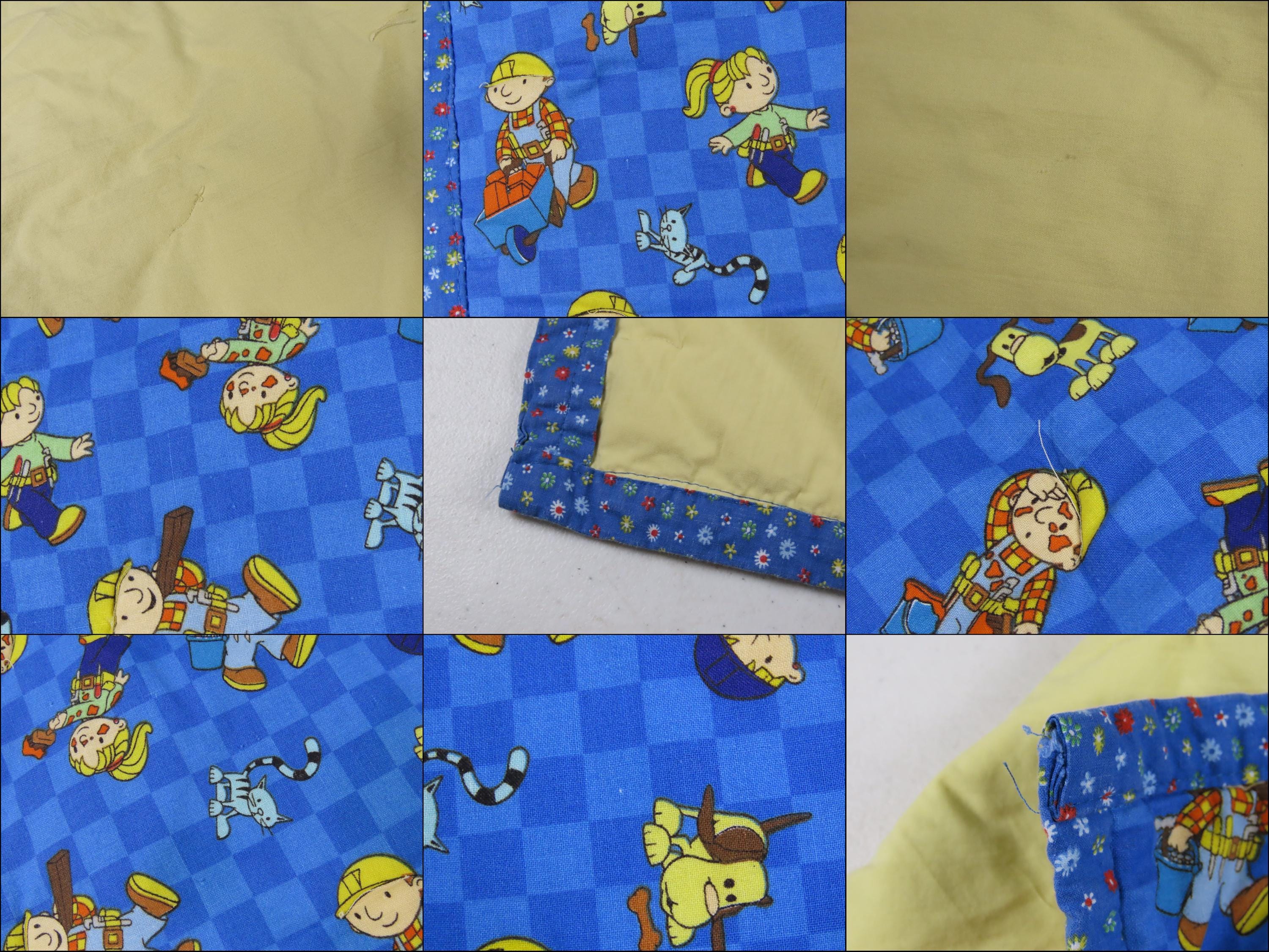 Vintage Bob the Builder small blanket which is about 44" tall by 43.5" wide (112 cm by 110 cm). My camera had a hard time picking up the exact colors. The backside is a light yellow, and the border is a blue floral print. It is a little faded in areas, sewn a little unevenly (the edges aren't straight), and worn along the edges. There are tiny marks, thread snags, and tiny white marks. The fabric bunches up some along the stitching. It extremely light pilling in areas, some loose threads, and some stitching that is coming undone. There are lines of stitching along all of Bob's helmets to hold it together. It has some small stains on the backside.