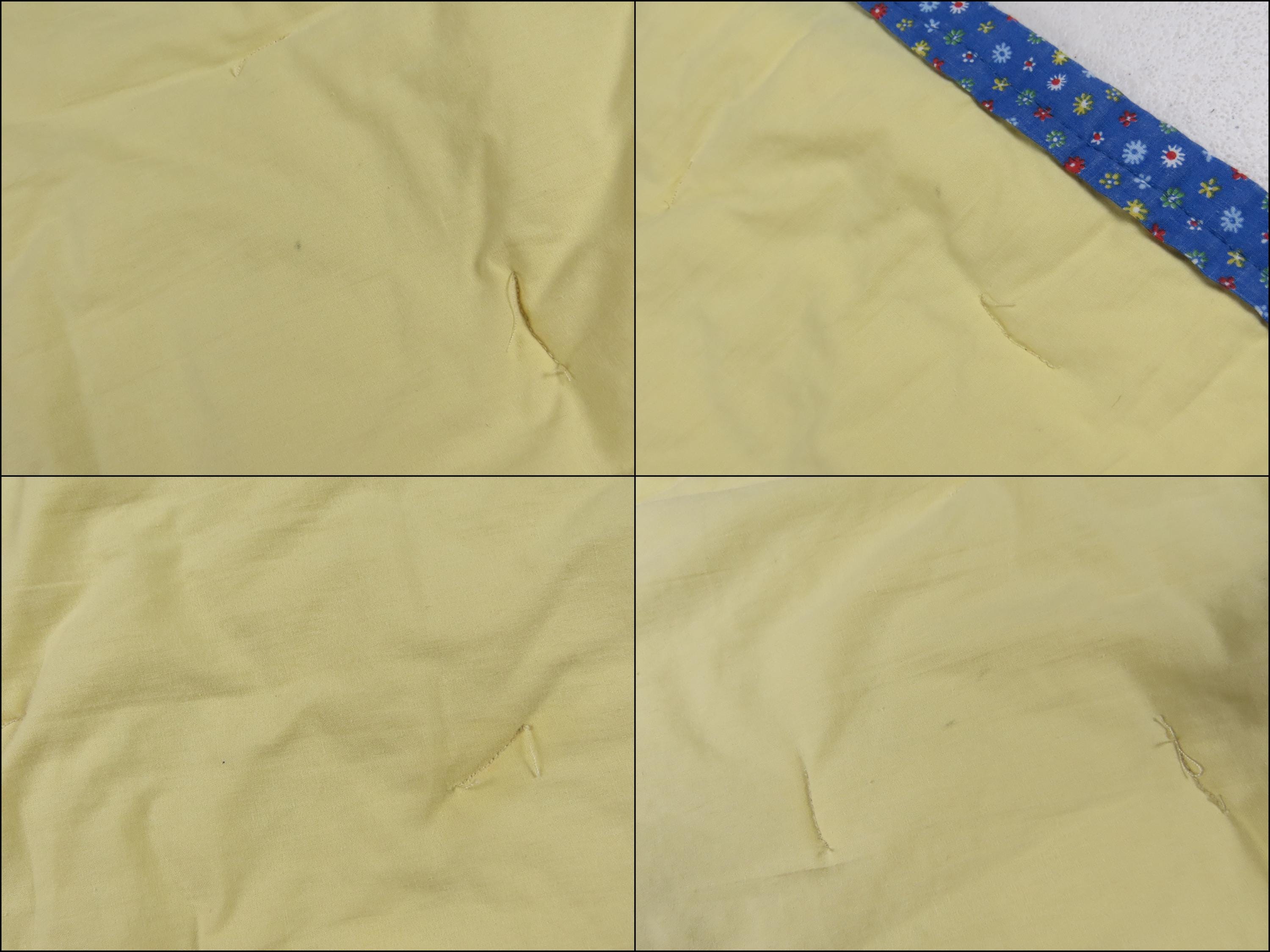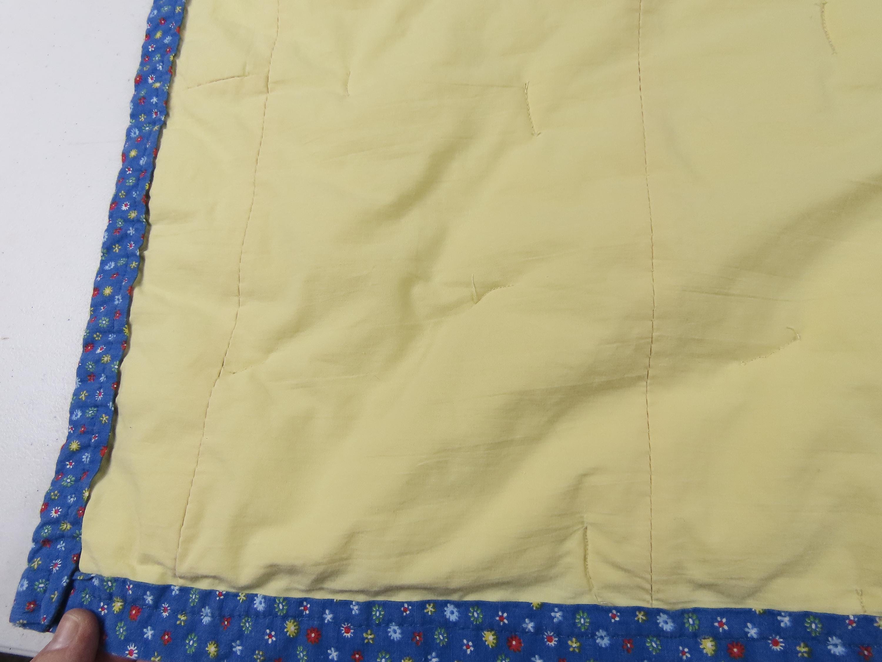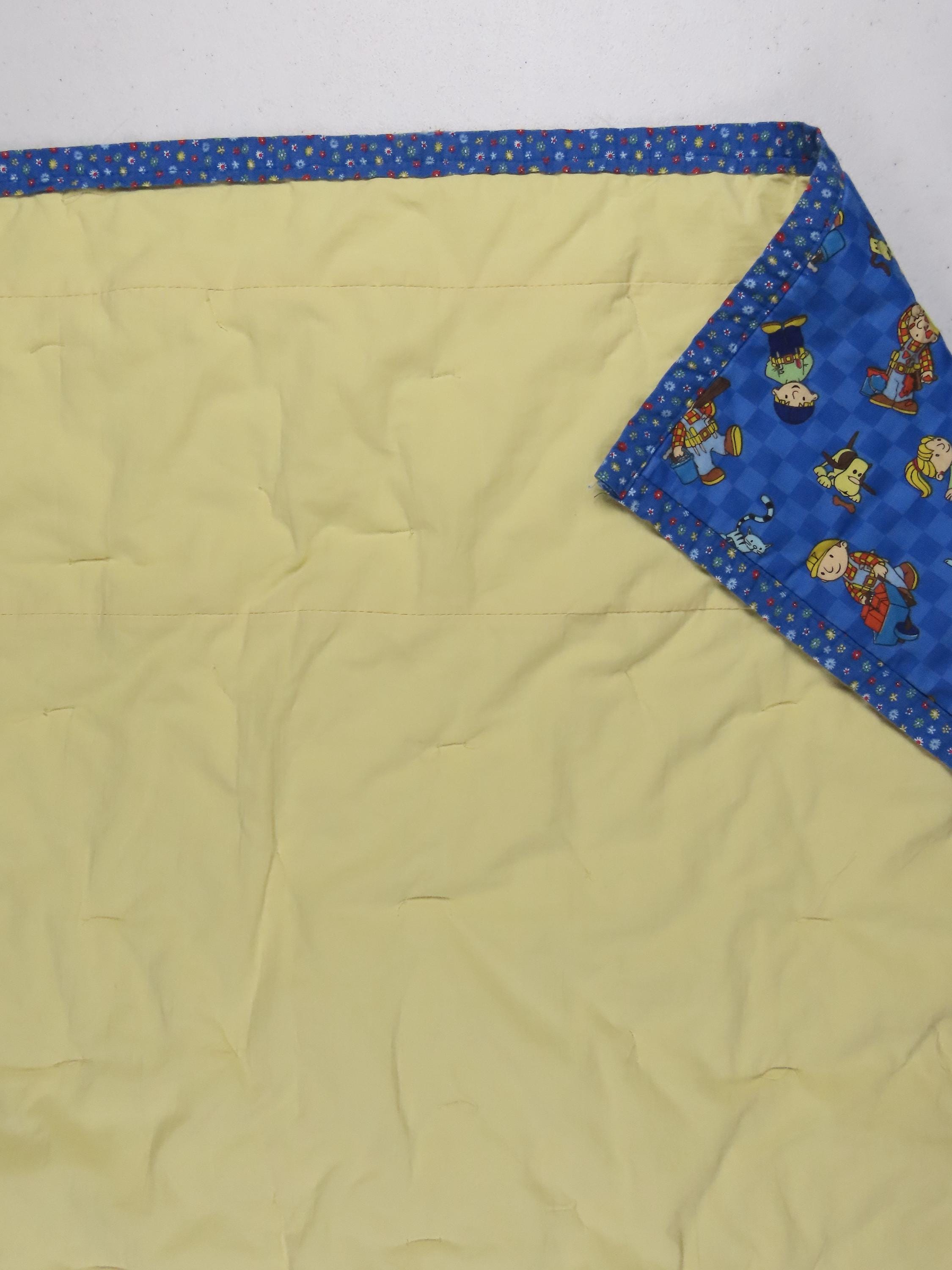 Vintage Bob the Builder small blanket which is about 44" tall by 43.5" wide (112 cm by 110 cm). My camera had a hard time picking up the exact colors. The backside is a light yellow, and the border is a blue floral print. It is a little faded in areas, sewn a little unevenly (the edges aren't straight), and worn along the edges. There are tiny marks, thread snags, and tiny white marks. The fabric bunches up some along the stitching. It extremely light pilling in areas, some loose threads, and some stitching that is coming undone. There are lines of stitching along all of Bob's helmets to hold it together. It has some small stains on the backside.