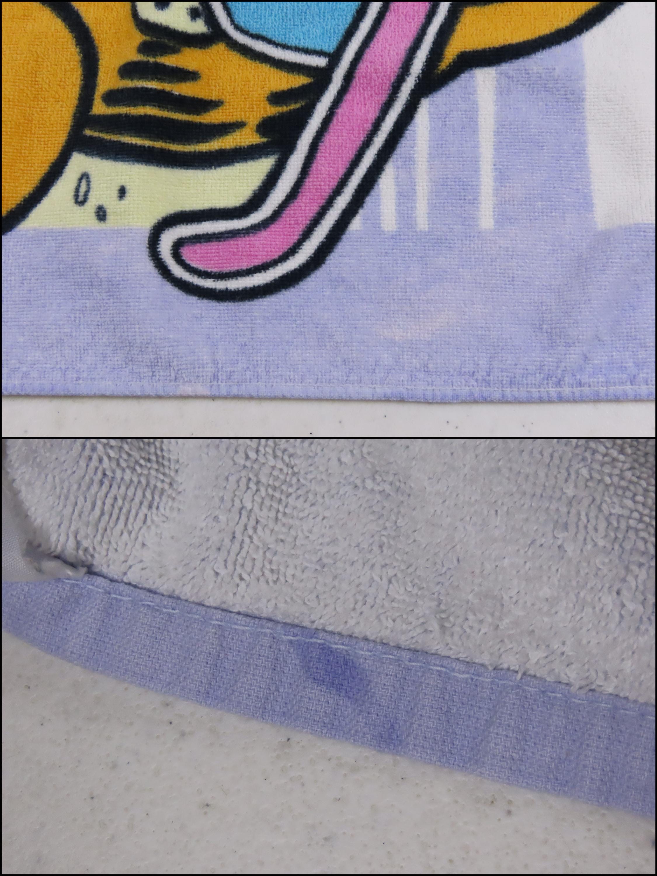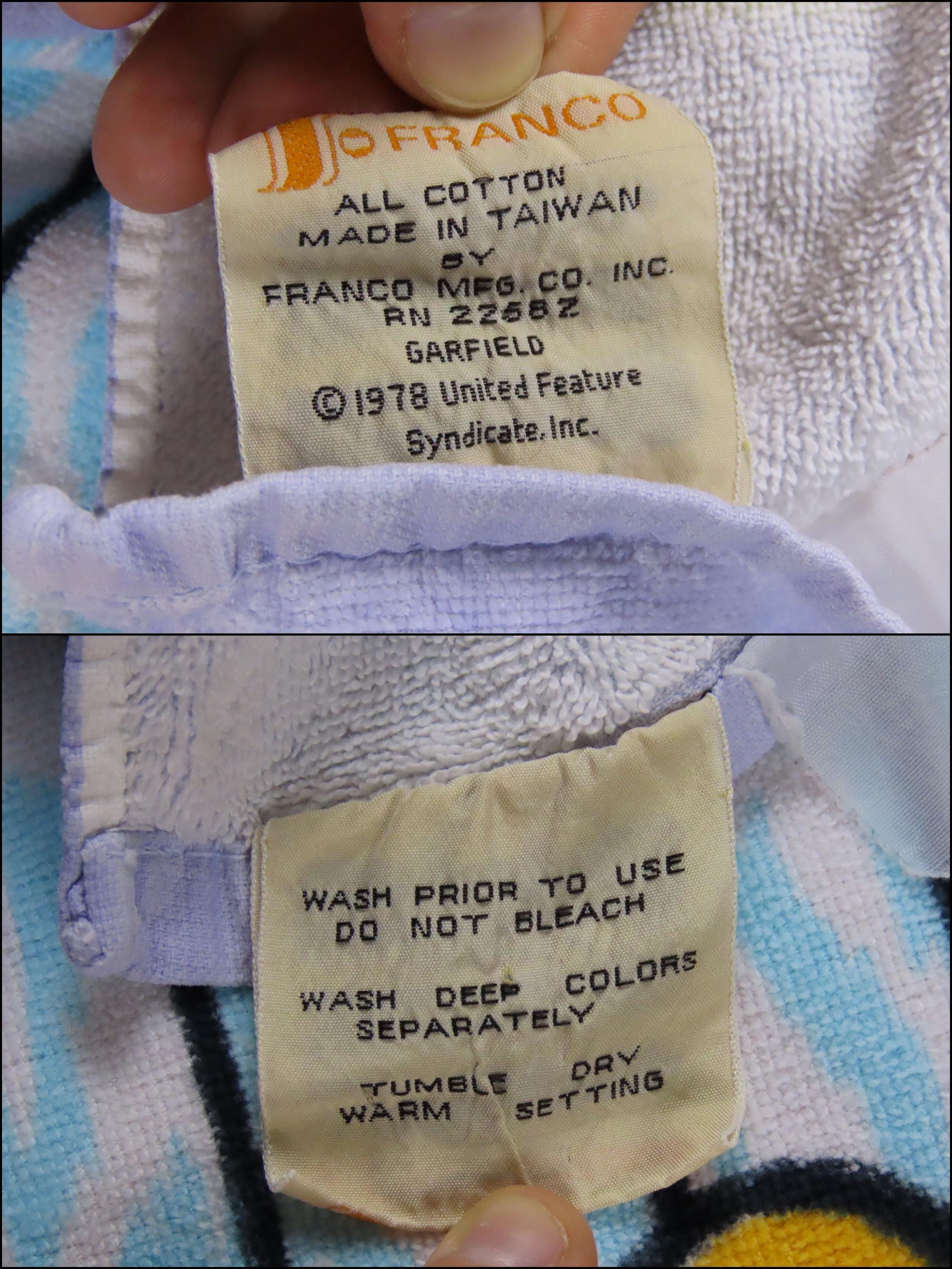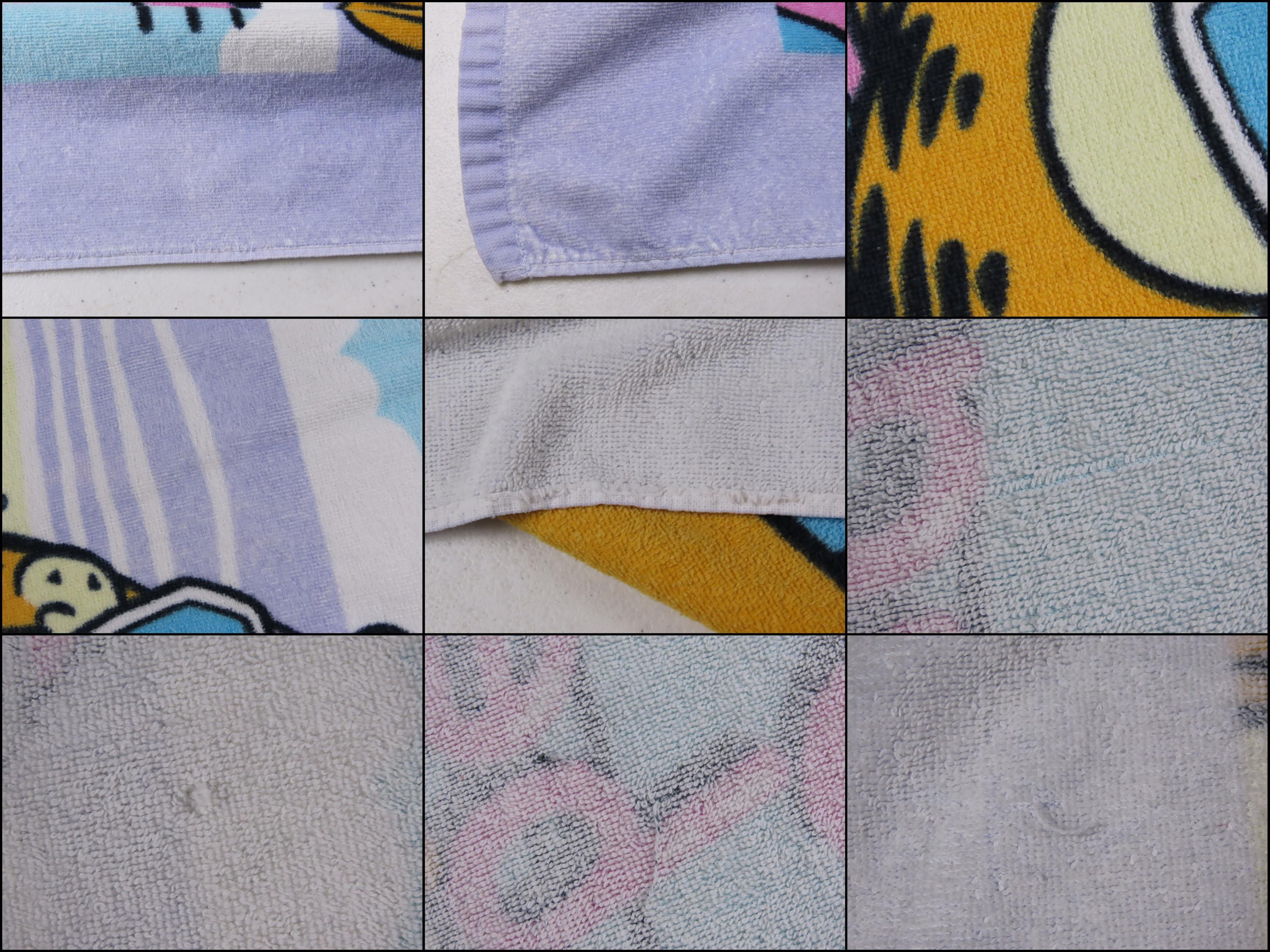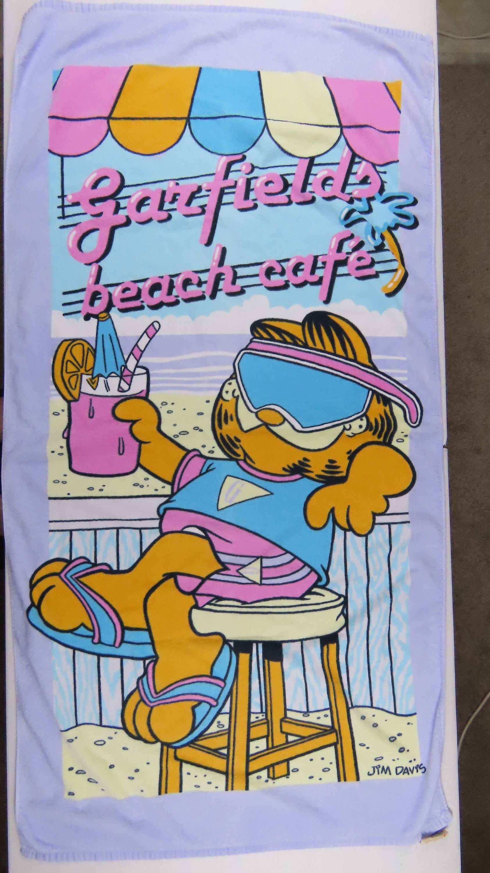 Vintage Garfield beach towel which is 100% cotton. It is about 57" tall by 29.5" wide (146 cm by 75 cm). My camera had a hard time picking up the exact colors. It is worn along the edges, the colors are a little faded, and it does not want to lay completely flat. There are some missing fiber spots, pulled/loose fibers (mostly on backside), and some light bleach stains on the purple background color. It has a small stain on the hem on the backside of the towel.