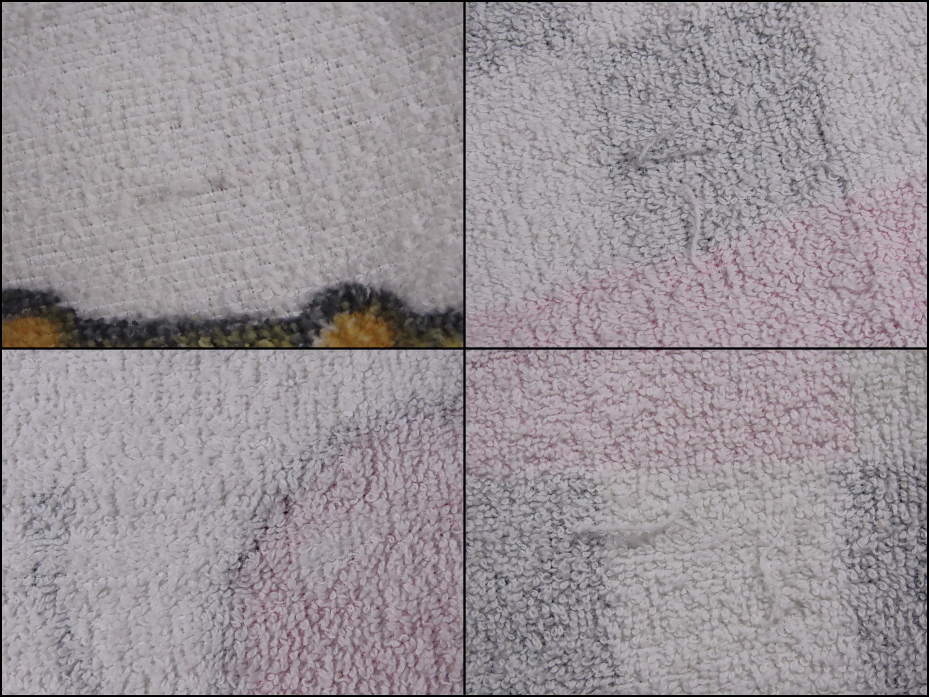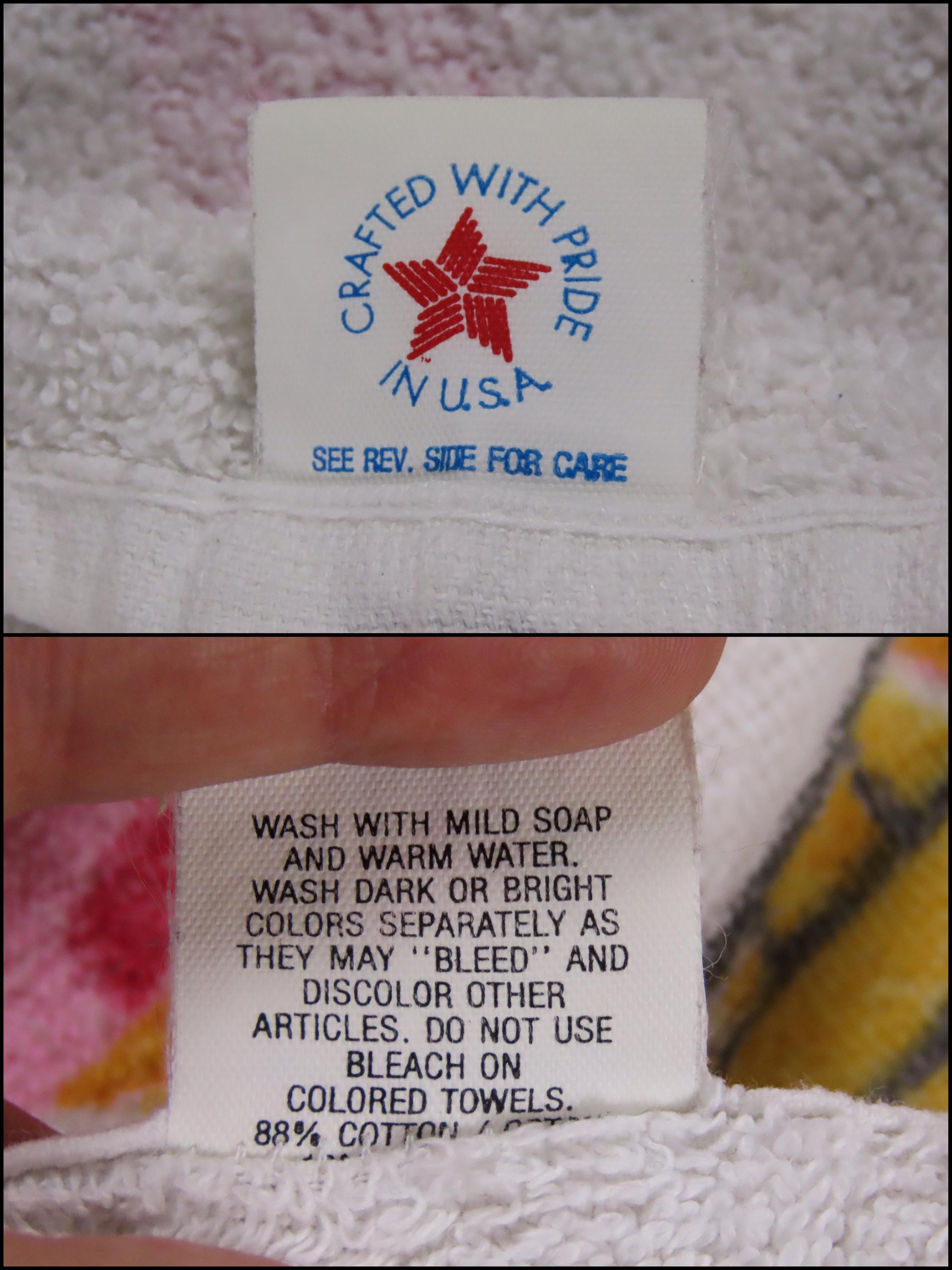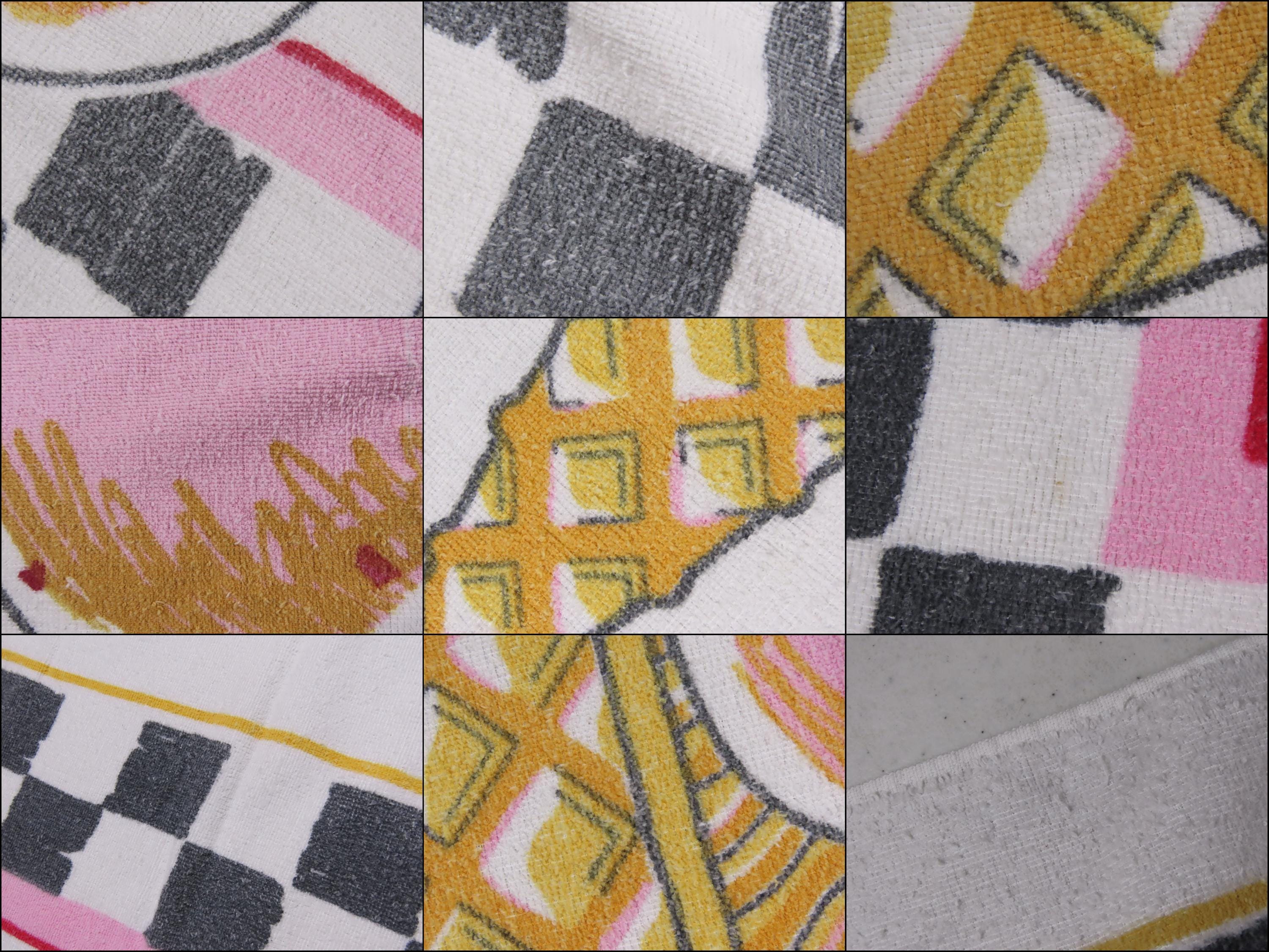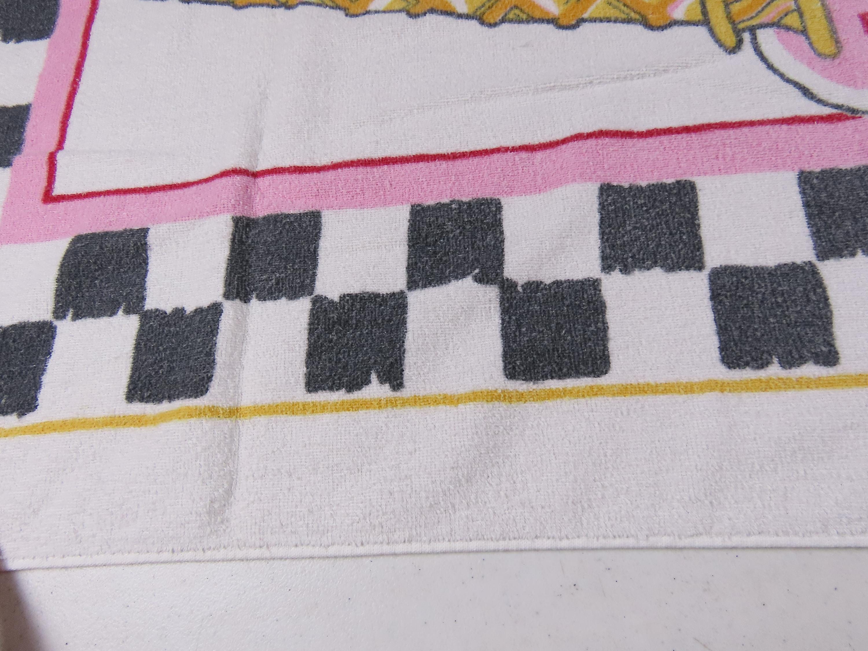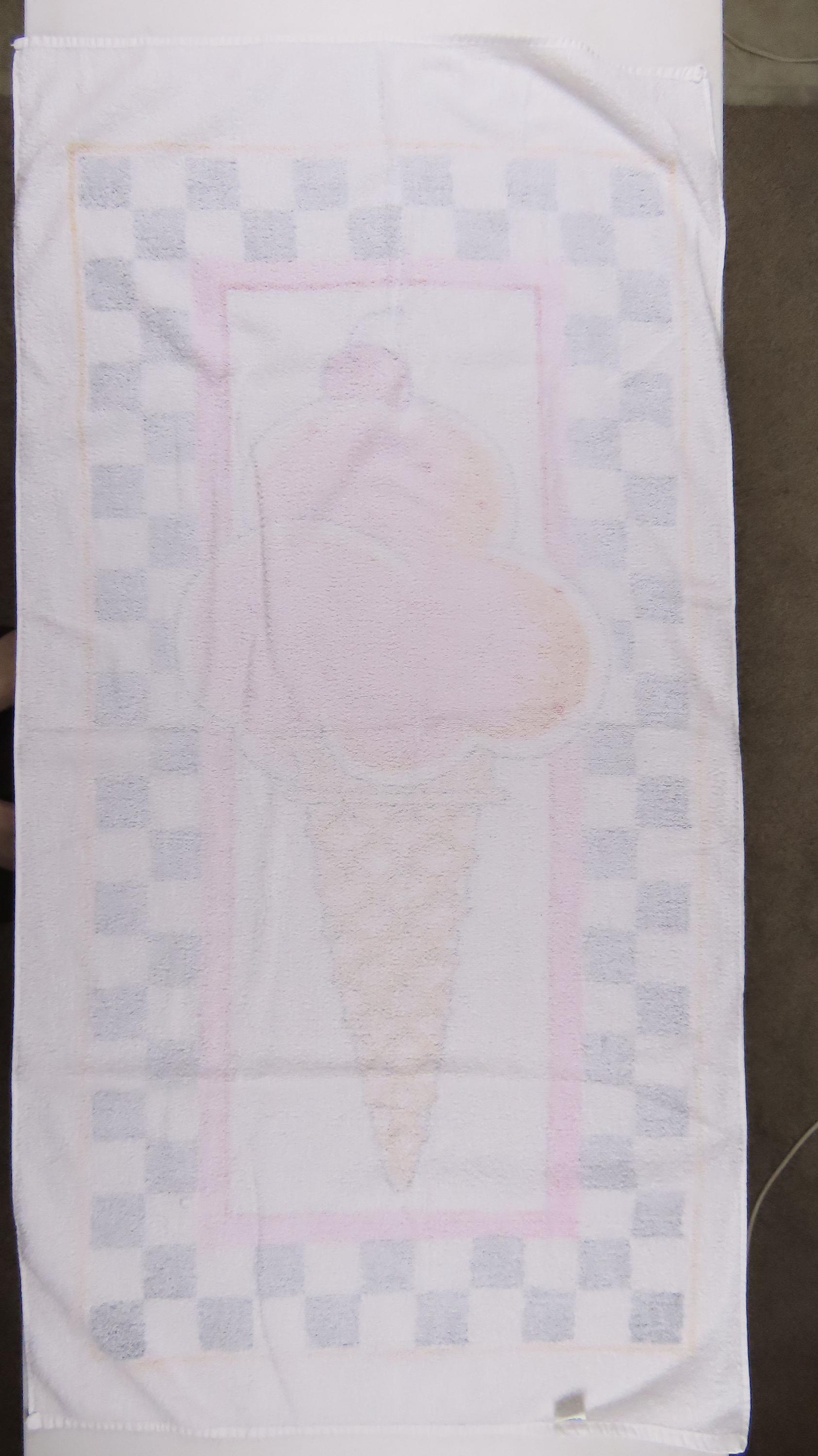 Vintage cute ice cream cone beach towel which is 88% cotton and 12% polyester. It is about 59" tall by 31" wide (151 cm by 79 cm). It is worn, pilling, and it is not very soft to the touch. There are missing fiber spots, loose/pulled fibers, and thin spots. It is faded, looks slightly discolored in areas, and has a small stain. There are some white marks.