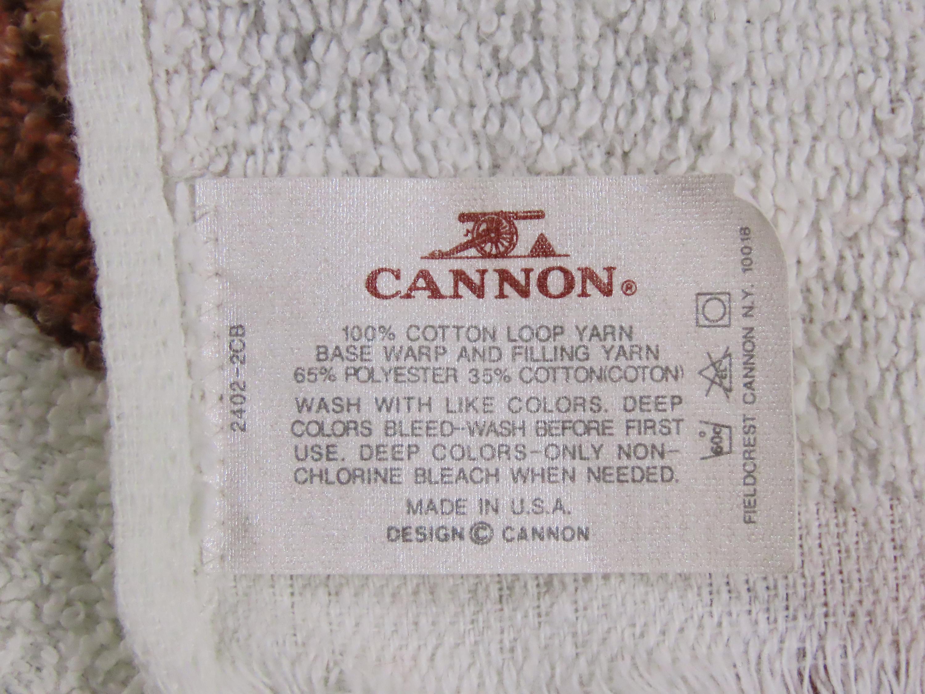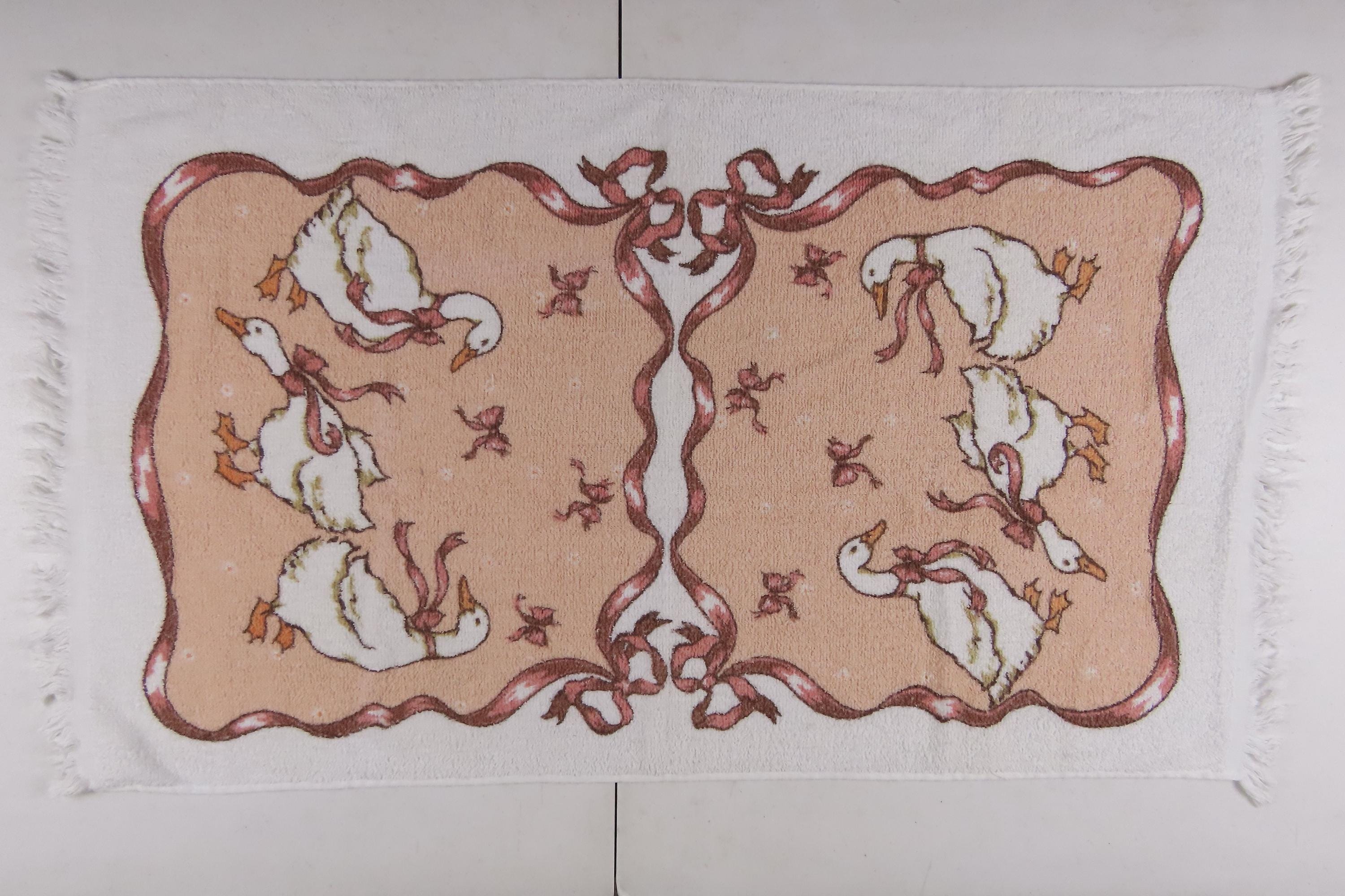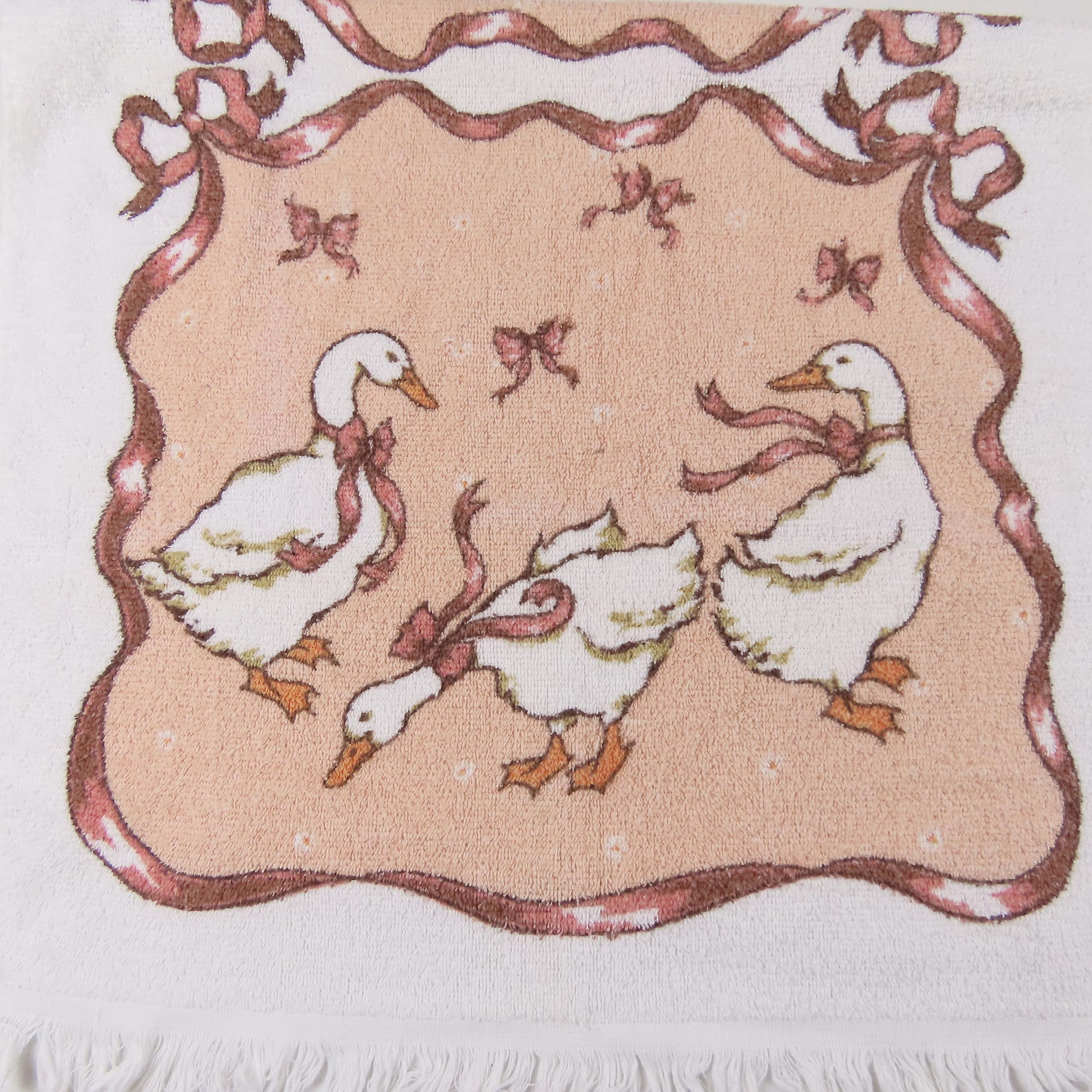Vintage Goose bath towel by Cannon which is about 40.5" long by 22" wide (103 cm by 57 cm) which includes the decorative fringe on both ends. It is smaller than modern bath towels. My camera had a hard time picking up the exact colors. It has a tiny stain on the edge, looks slightly discolored in areas, and has overall wear. There are loose/pulled fibers, thin spots, and missing thread spots. The decorative fringe on the ends is a bit tangled in areas.