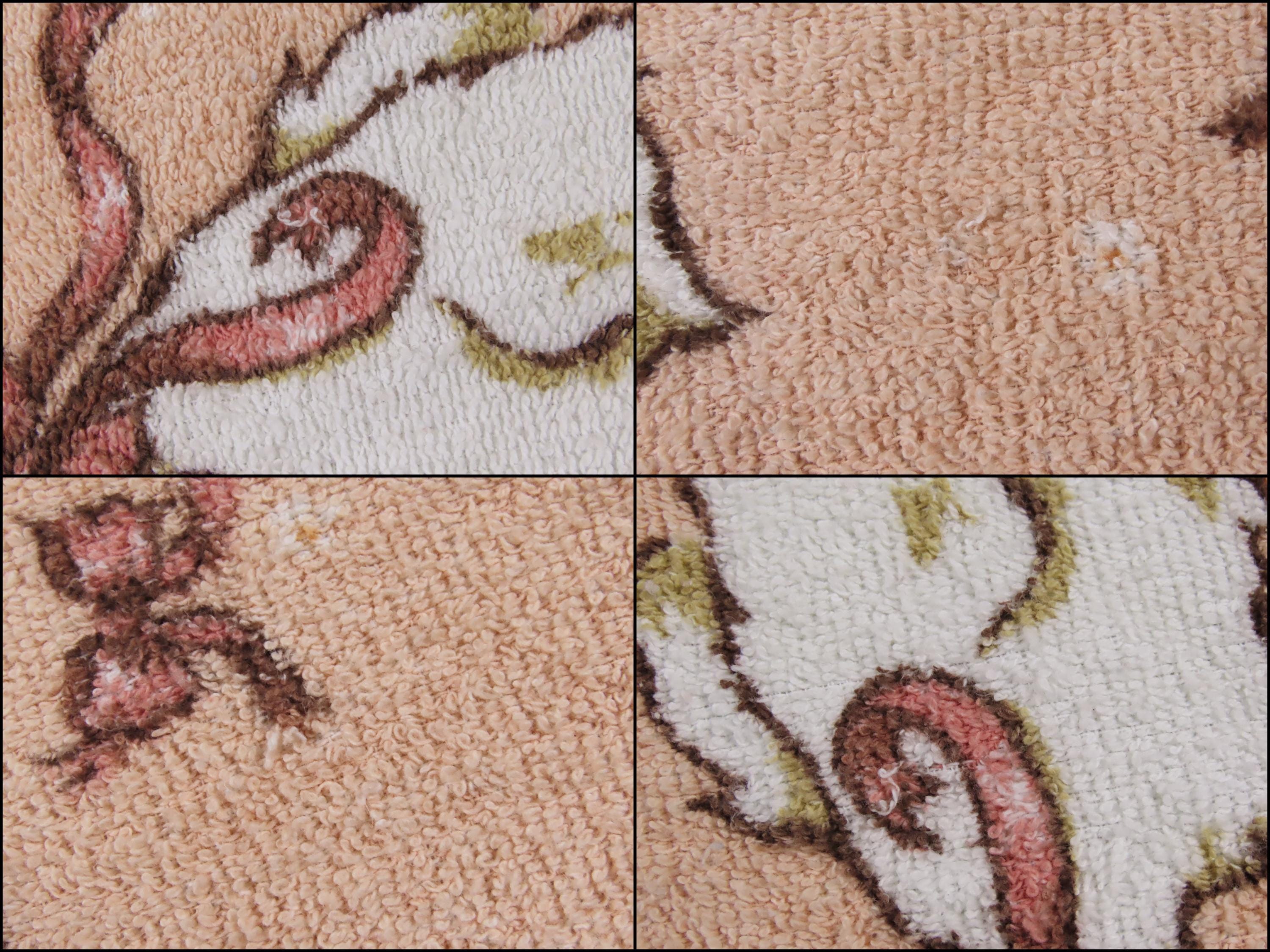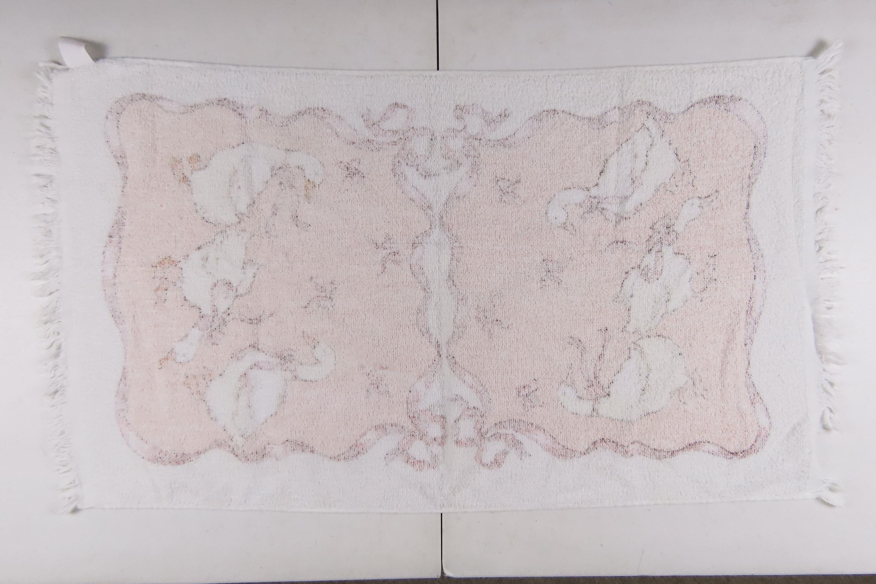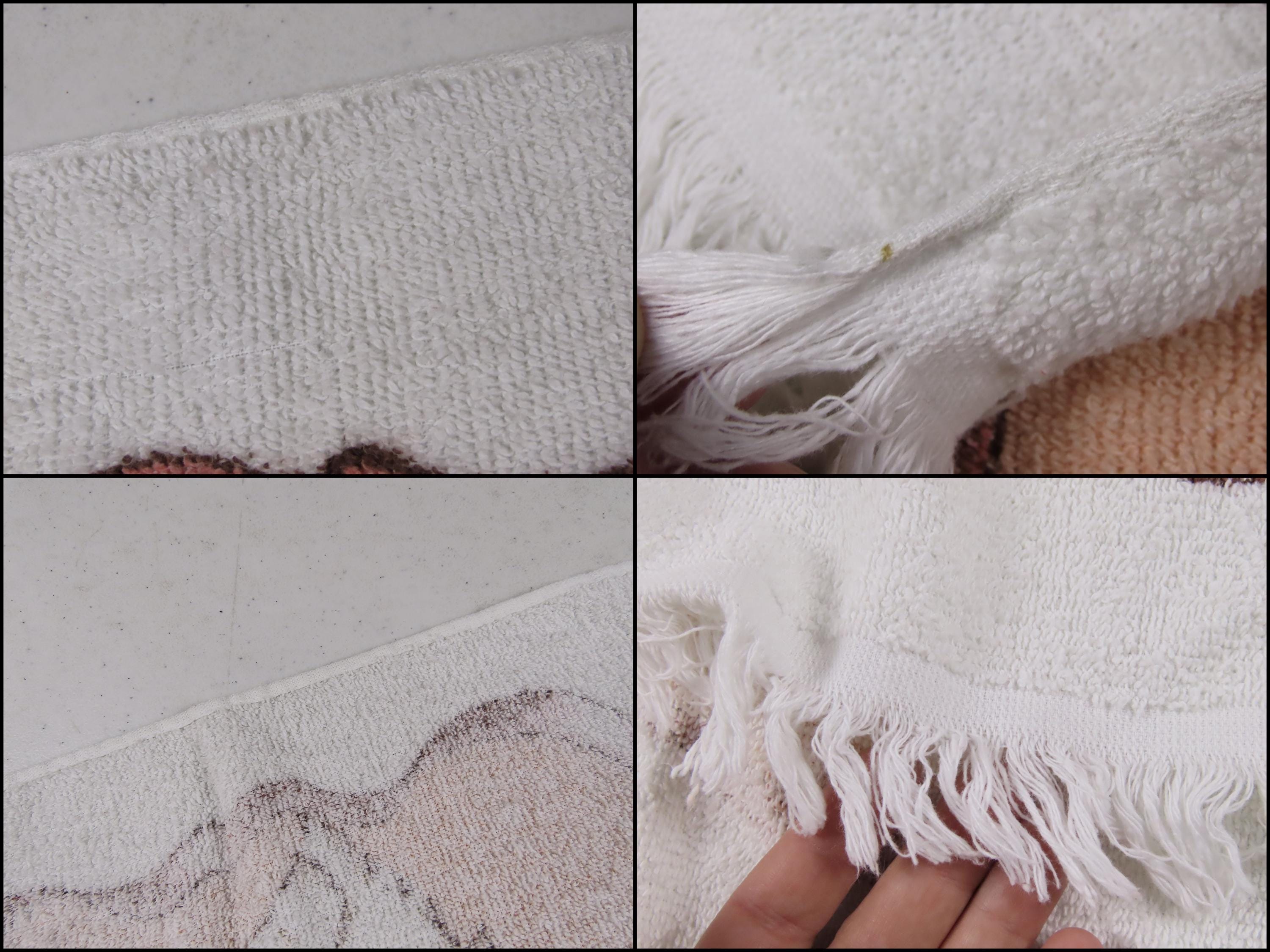 Vintage Goose bath towel by Cannon which is about 40.5" long by 22" wide (103 cm by 57 cm) which includes the decorative fringe on both ends. It is smaller than modern bath towels. My camera had a hard time picking up the exact colors. It has a tiny stain on the edge, looks slightly discolored in areas, and has overall wear. There are loose/pulled fibers, thin spots, and missing thread spots. The decorative fringe on the ends is a bit tangled in areas.