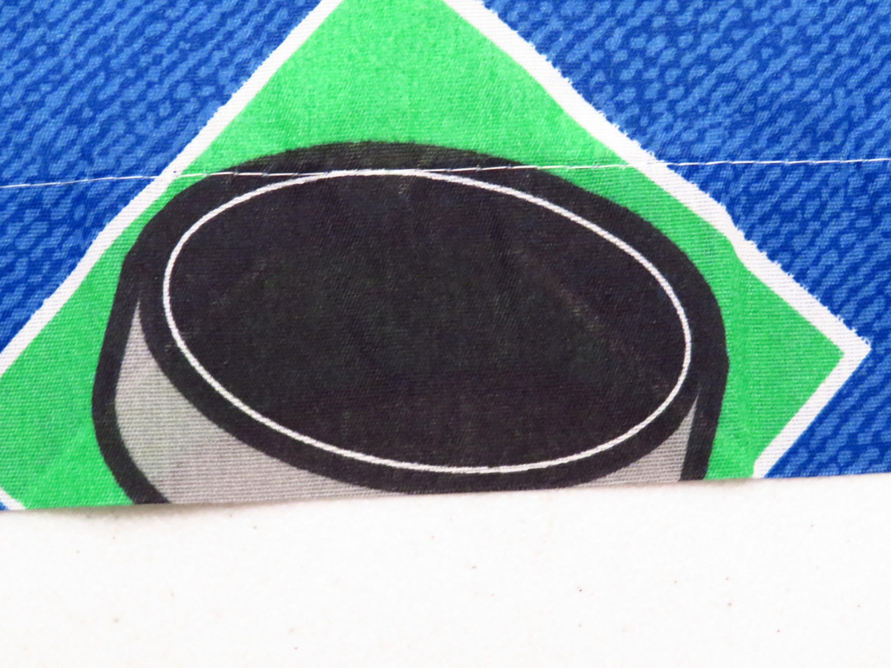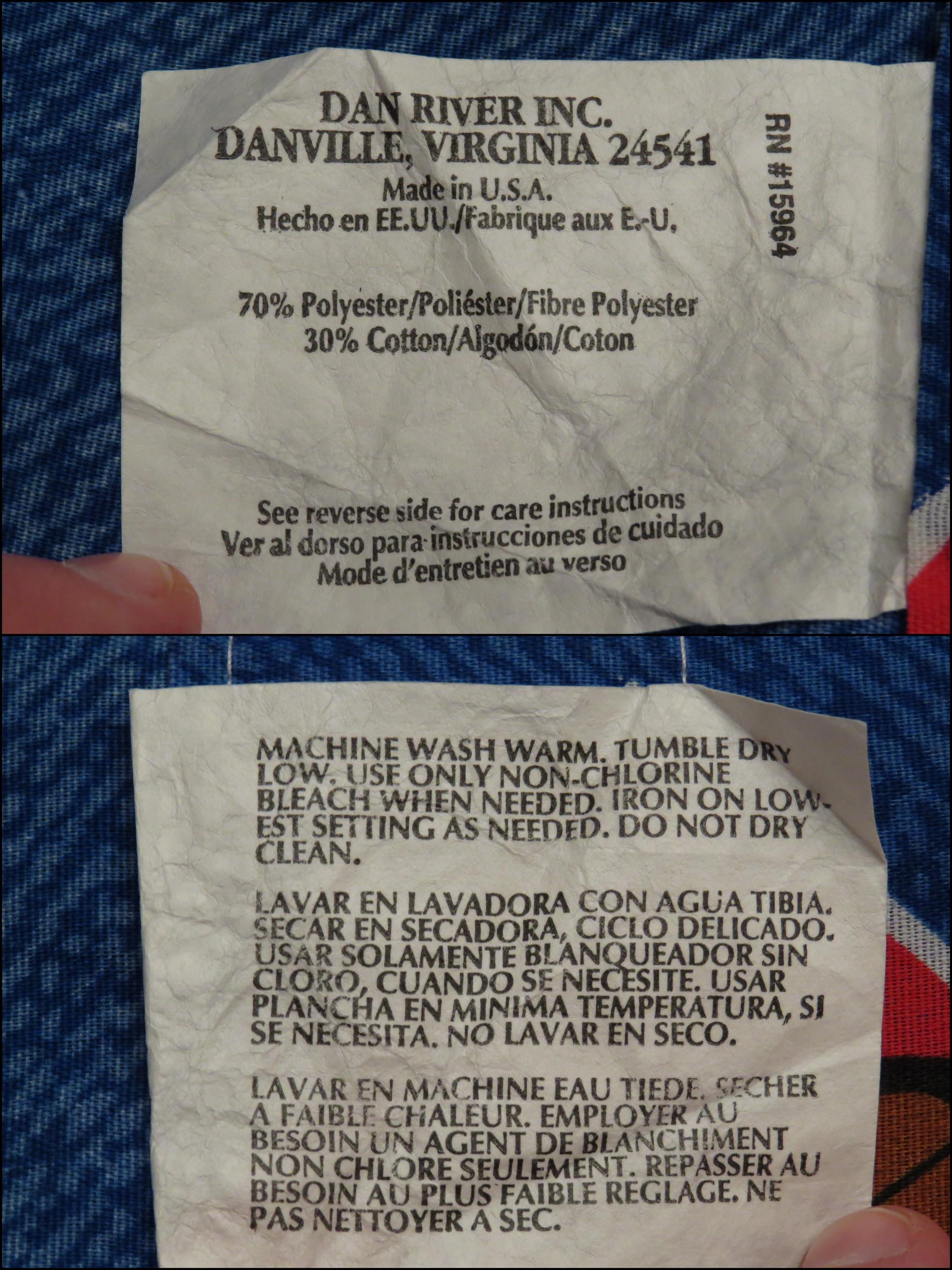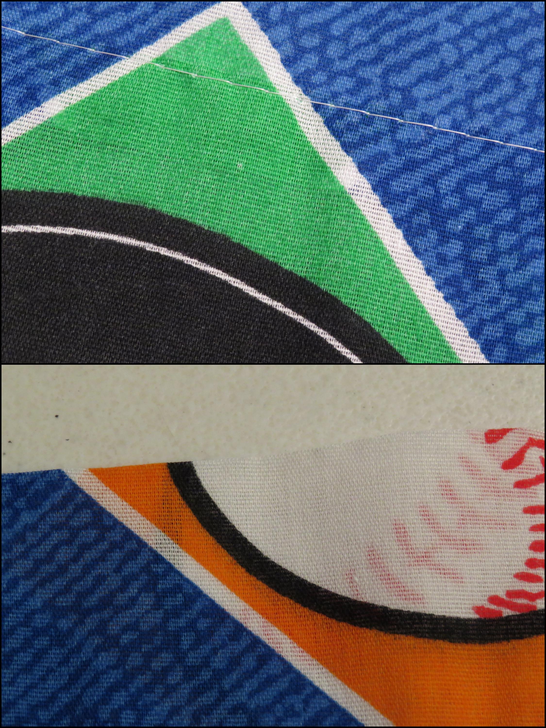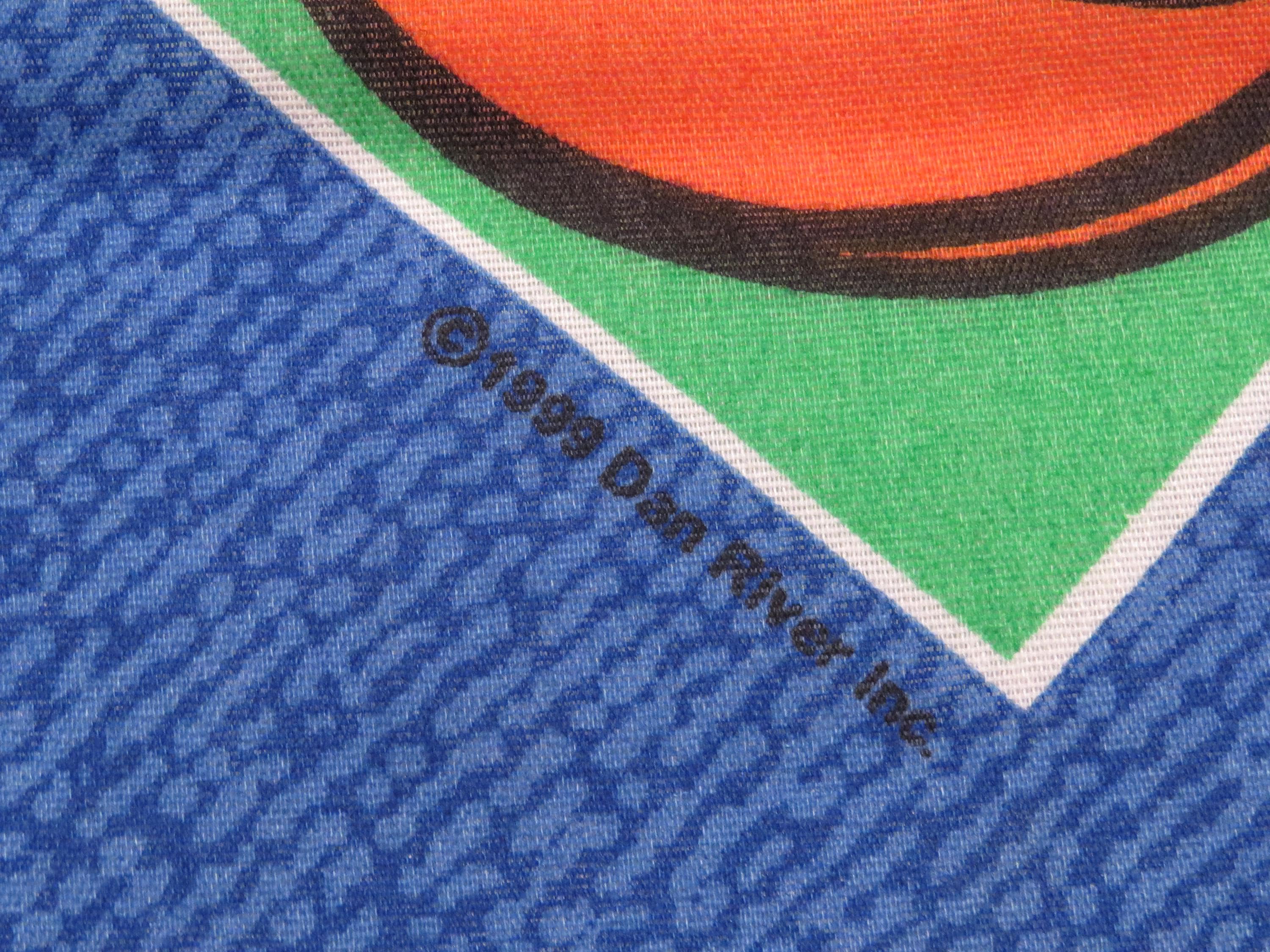 Vintage Fun sports valance from 1999 which is 70% polyester and 30% cotton. It is about 83" long by 16.5" tall (210 cm by 42 cm). My camera had a hard time picking up the exact colors. It has a thread snag, a tiny white mark, and a couple light whitish marks. There are some thin spots.