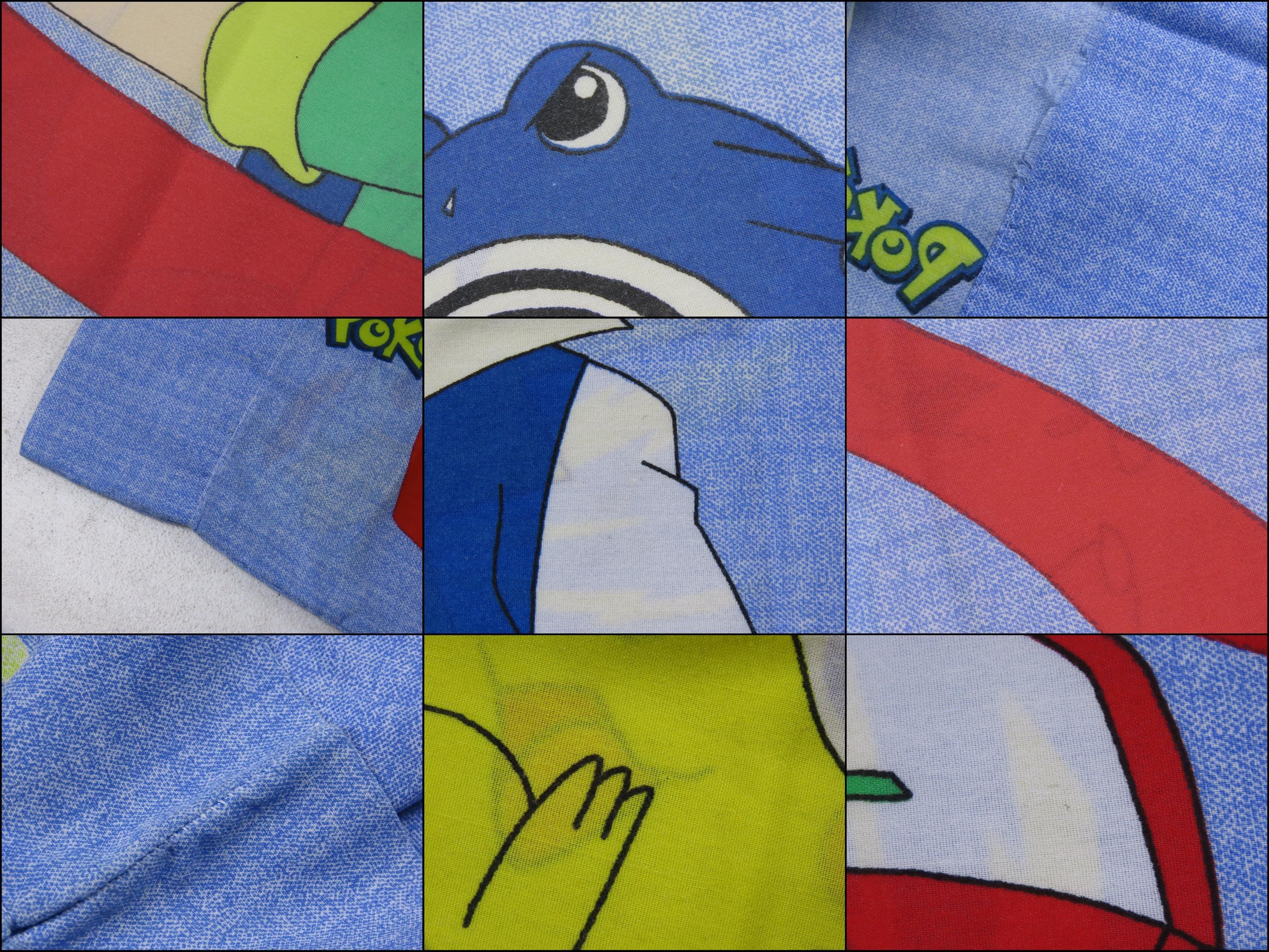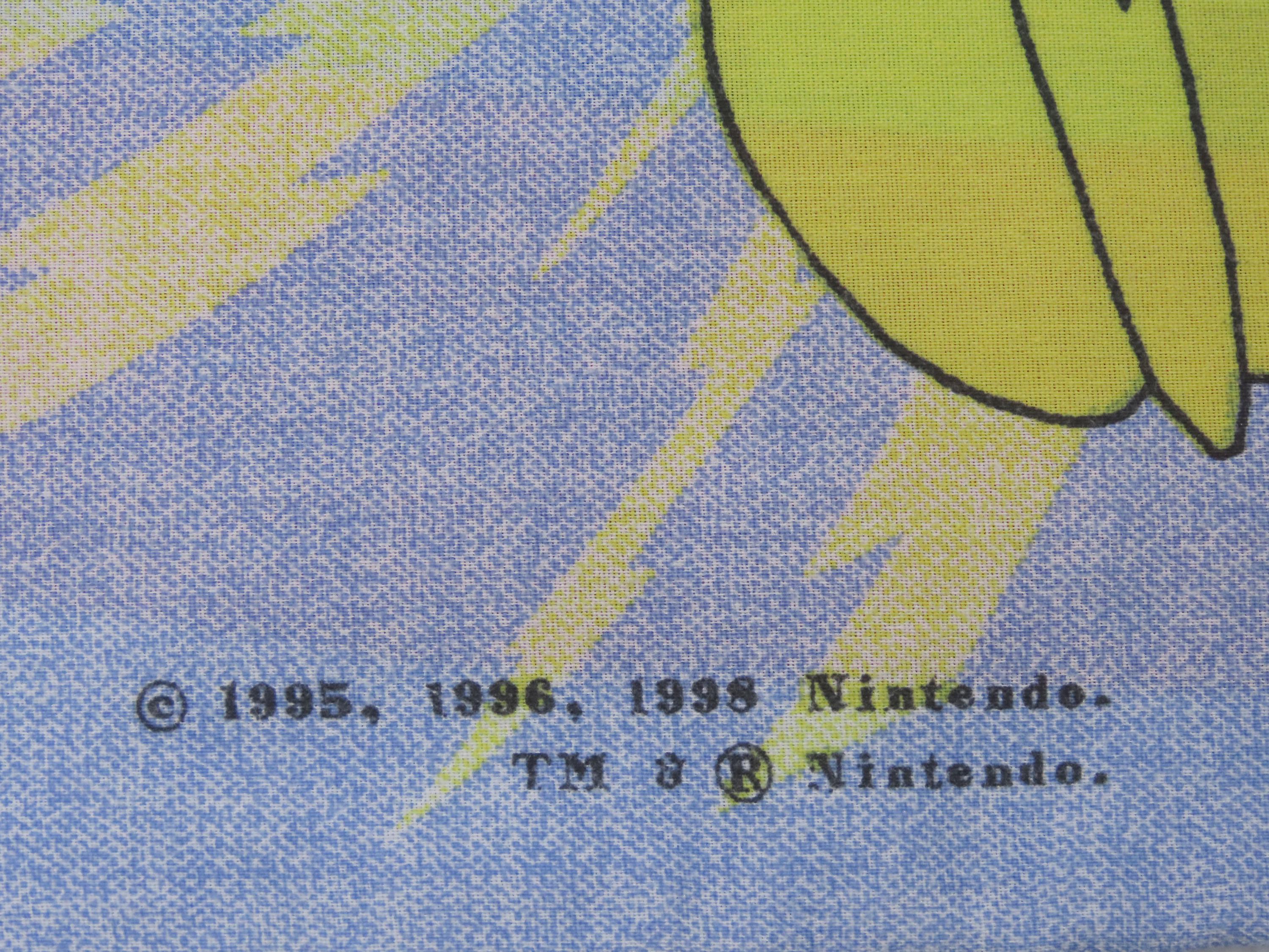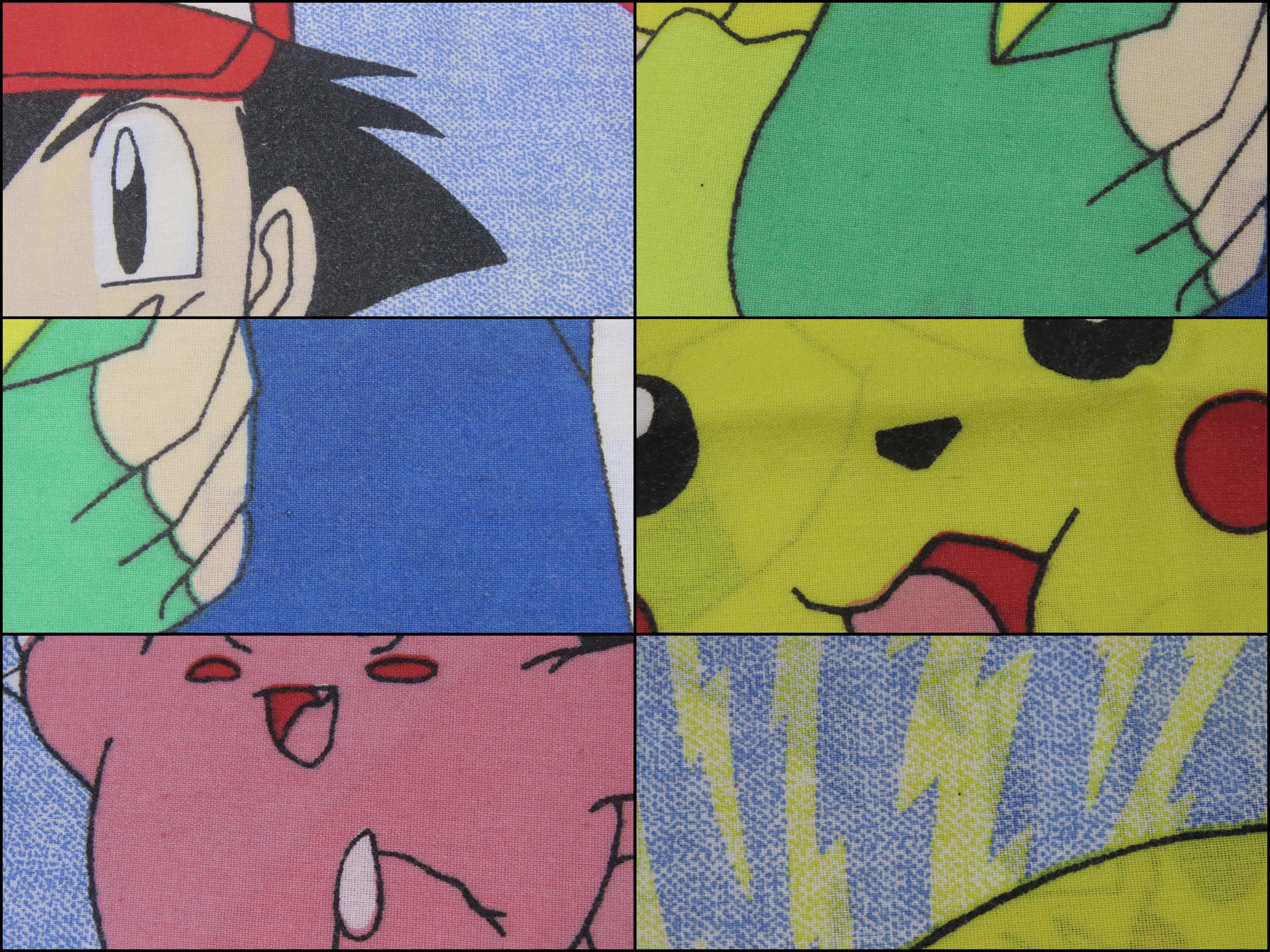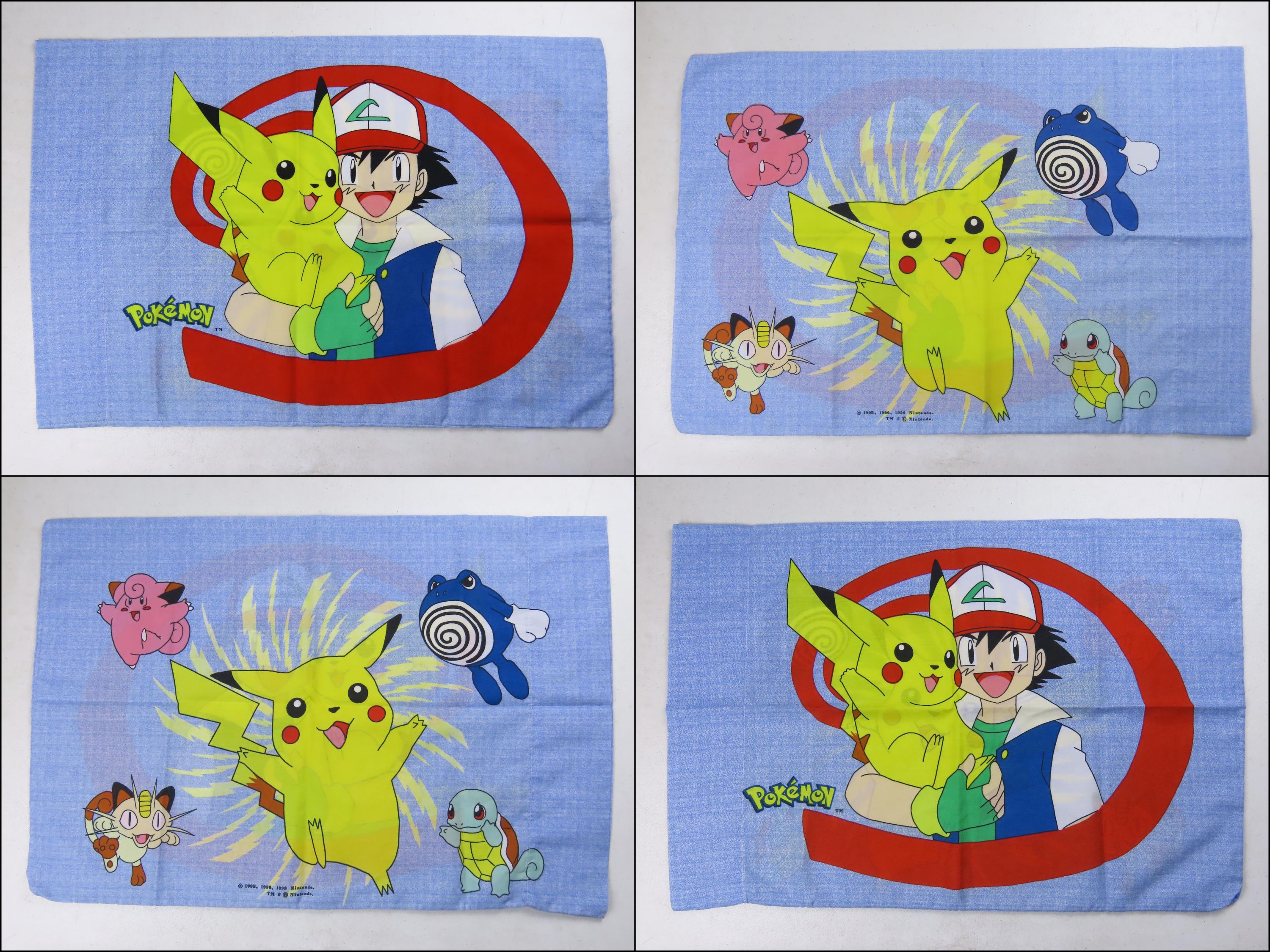 Set of 2 Vintage Pokemon standard pillowcases which are 70% polyester and 30% cotton. My camera had a hard time picking up the exact colors. Both pillowcases are worn along the edges/stitching, and the dark colors are more worn with light pilling. They have tiny marks, some tiny white marks, and exposed stitching.