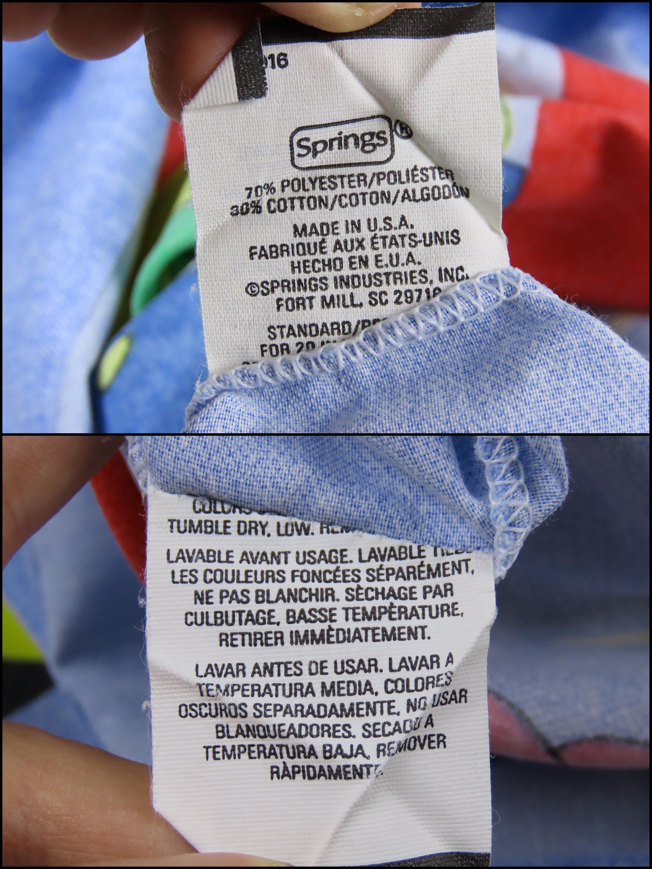 The first pillowcase has a small line mark, a thread snag, and some clusters of tiny marks that look like printing errors (on the green and pink colors). The second pillowcase has a couple tiny stains, a pin hole, and extremely light pilling in areas. The fabric bunches up some along the stitching, and the inner part of the hem is separated from the stitching (the edge is fraying).