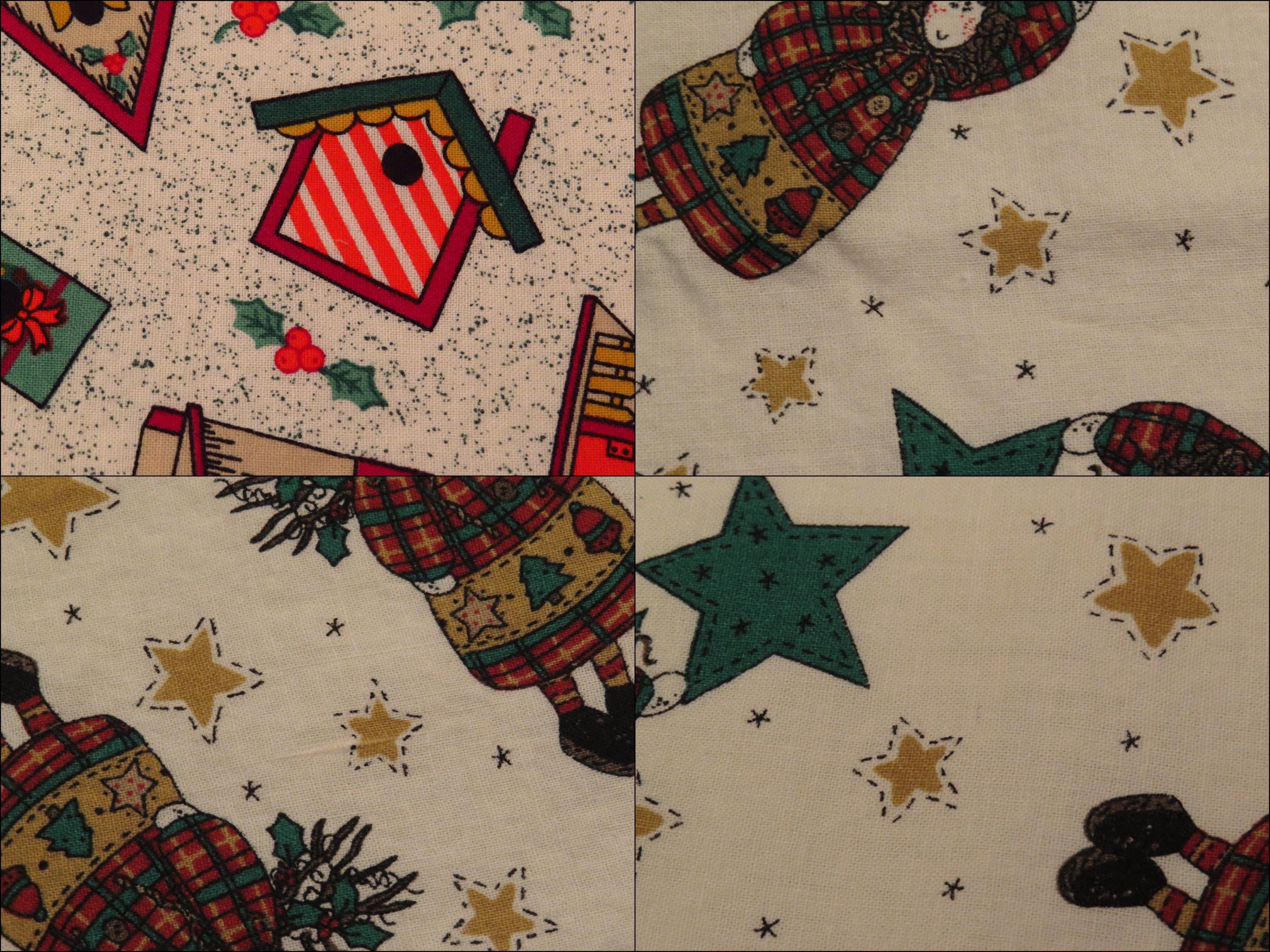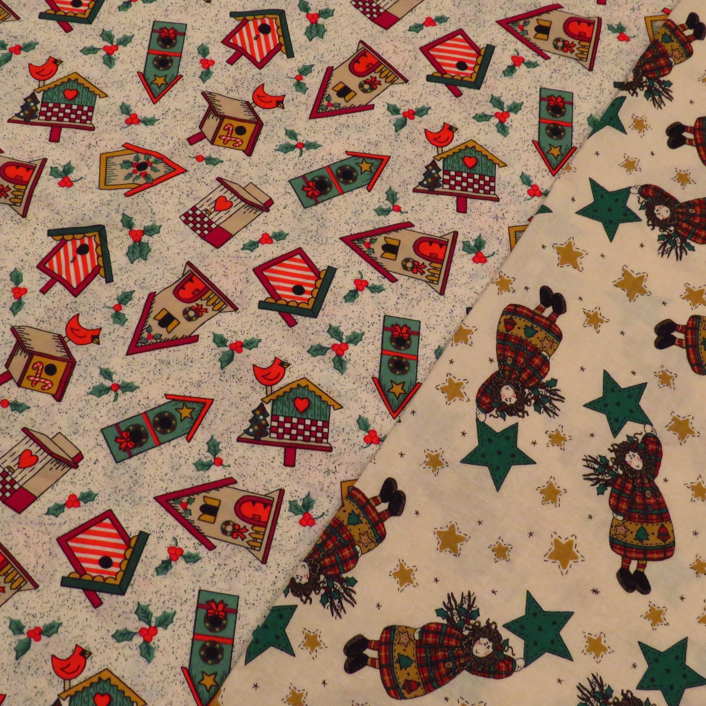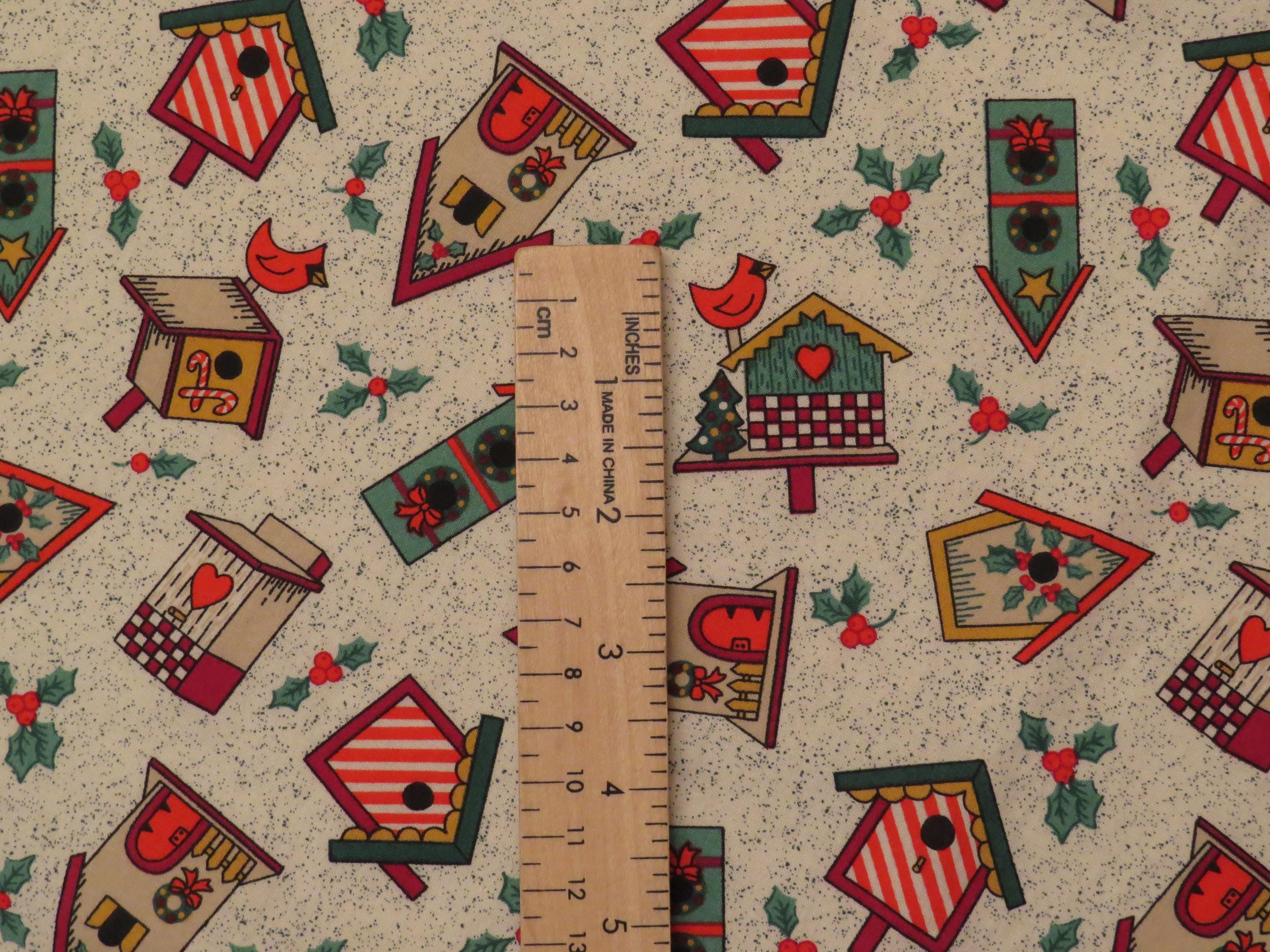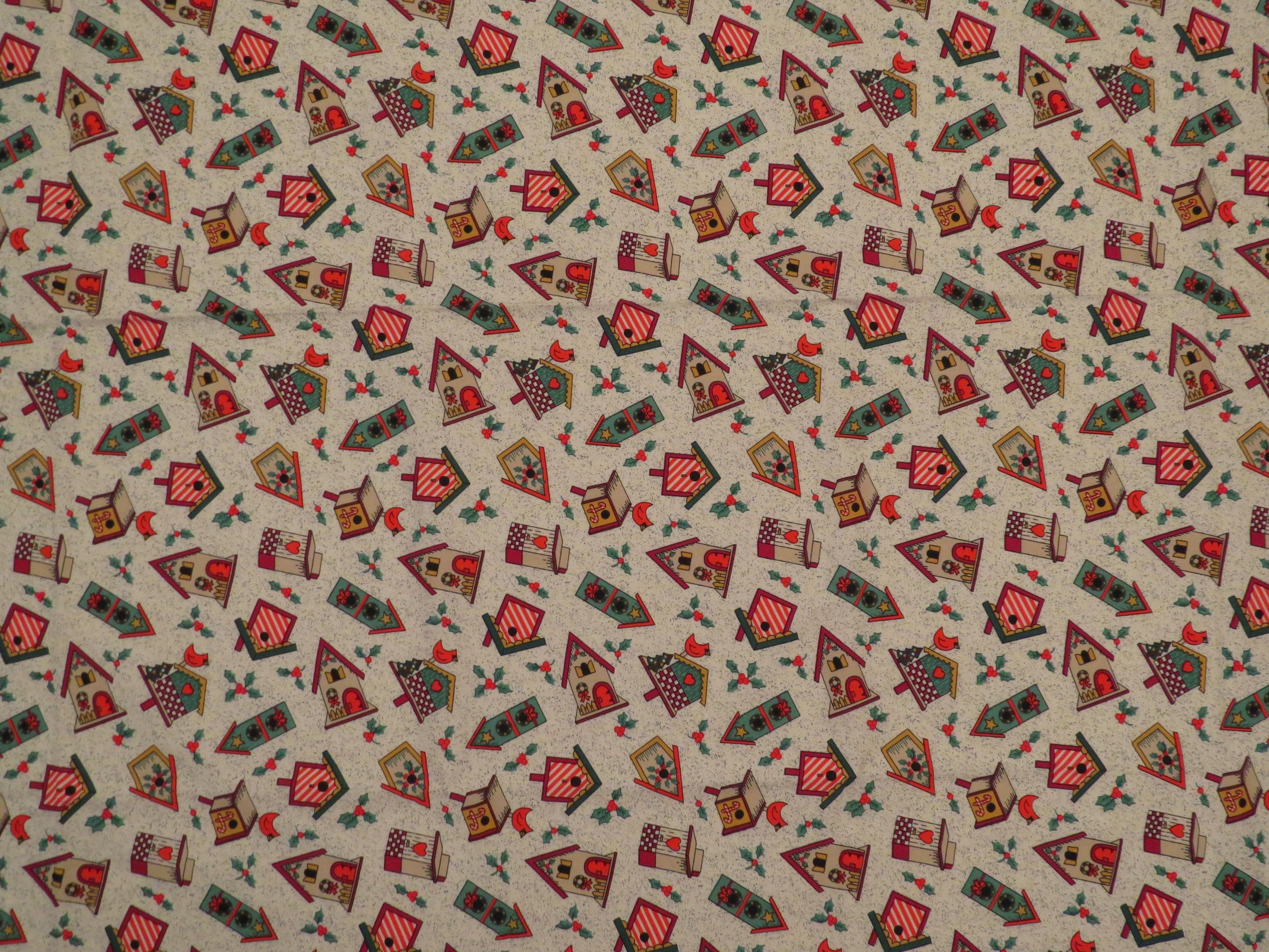 Vintage Christmas fabric with birdhouses or lady with stars.