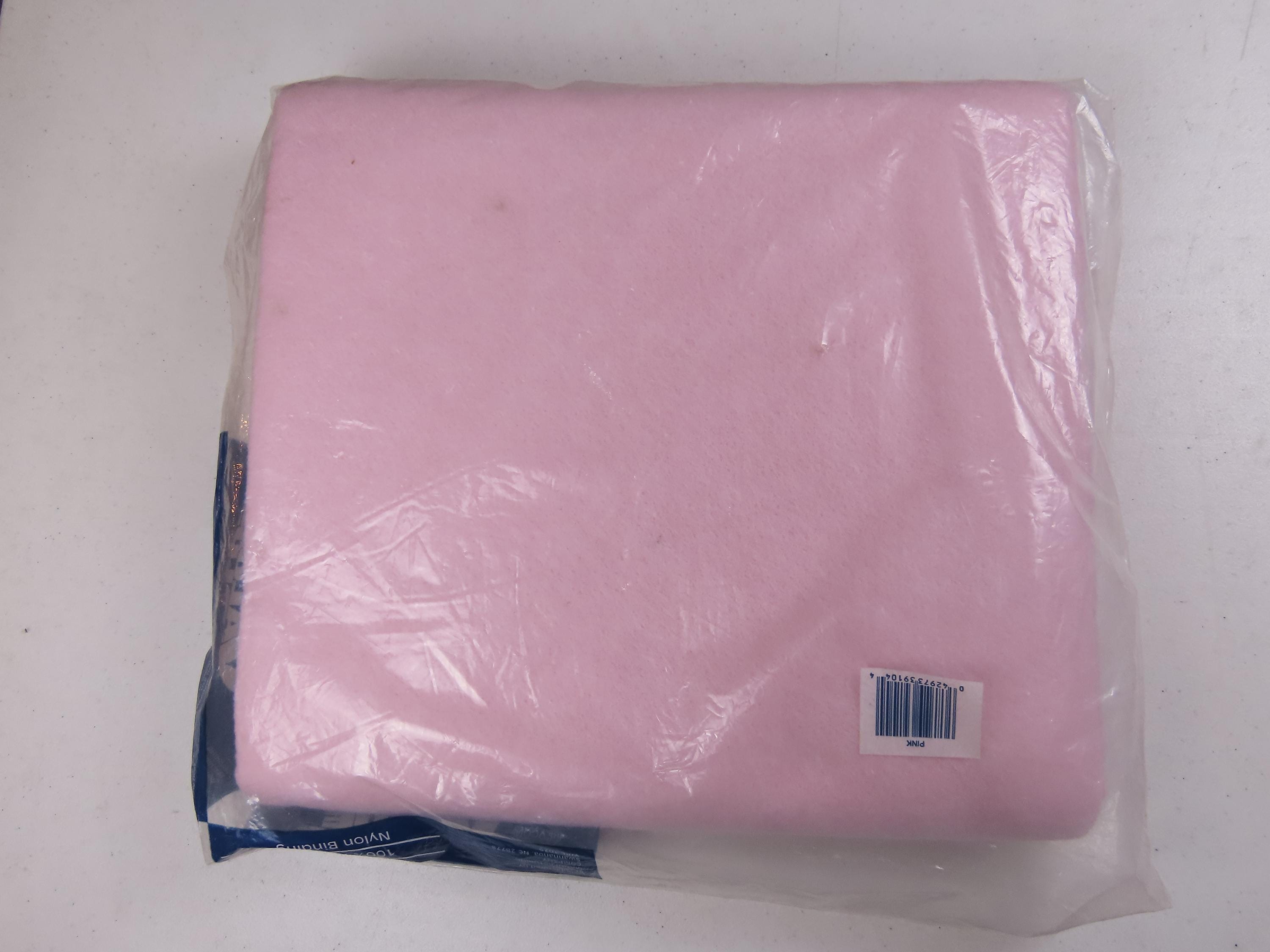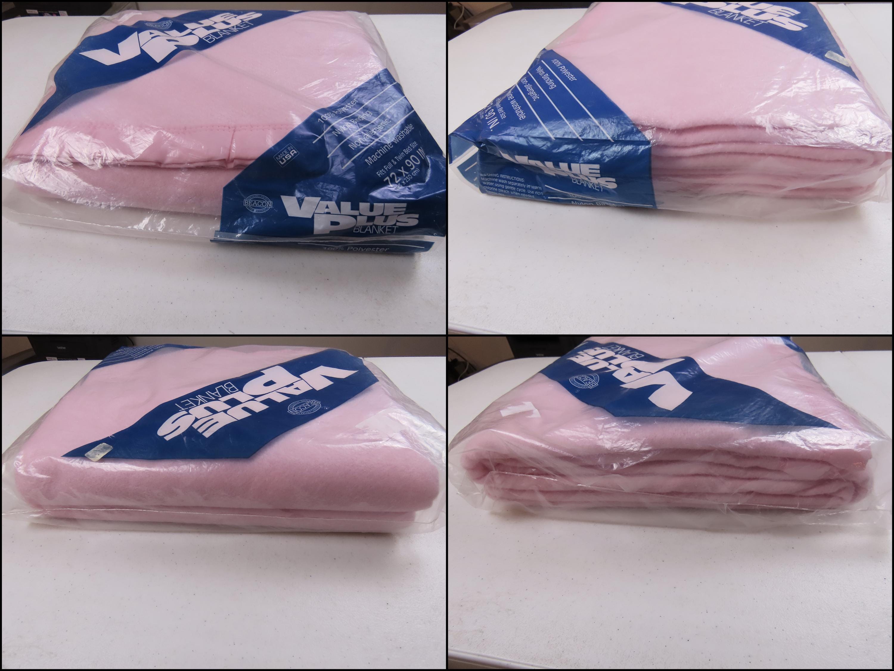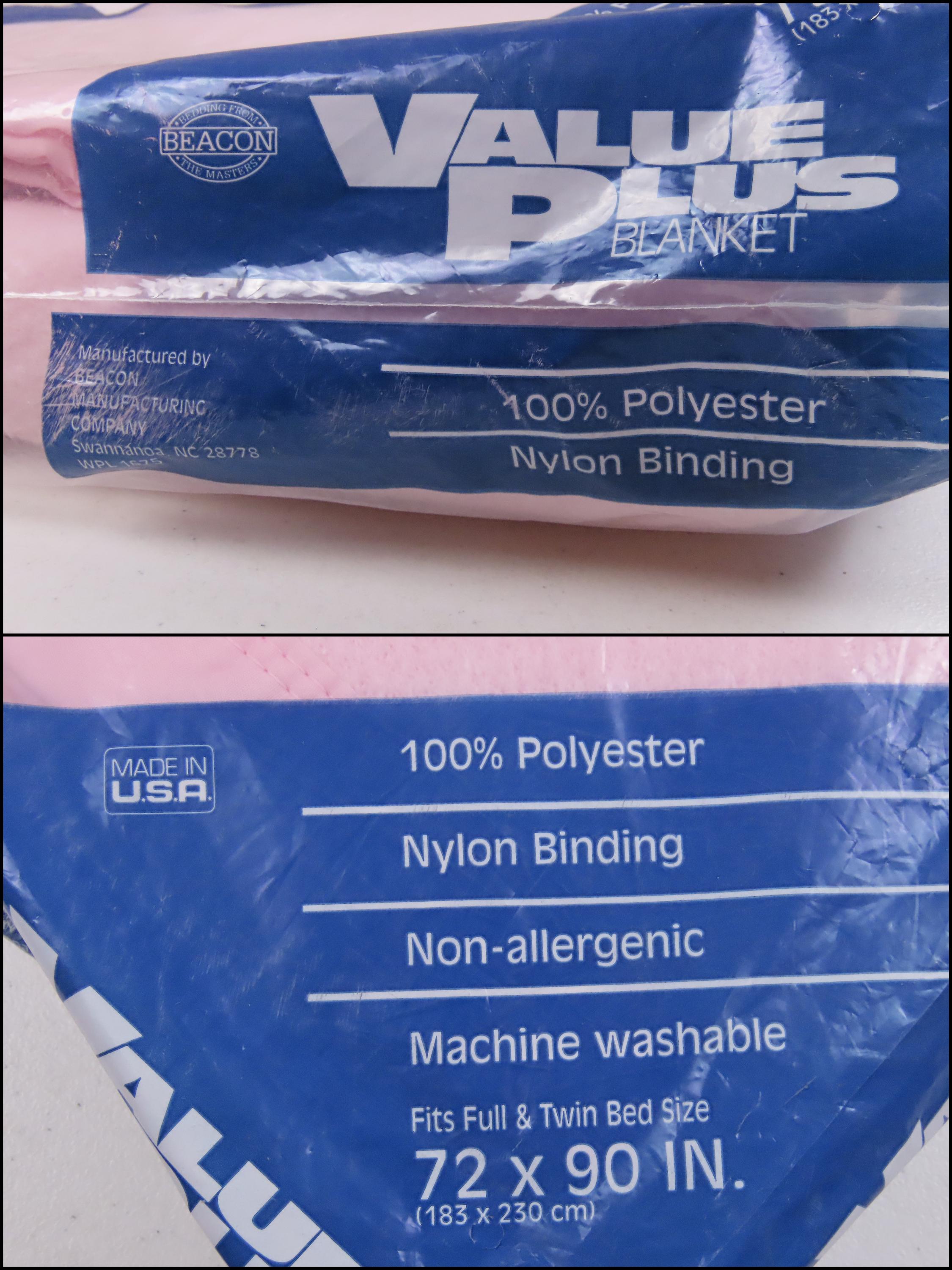 Vintage Beacon pink value plus blanket for a full or twin sized bed which is new in the package. It is 100% polyester with nylon binding, and it is 90" by 72" (230 cm by 183 cm). My camera had a hard time picking up the exact colors.