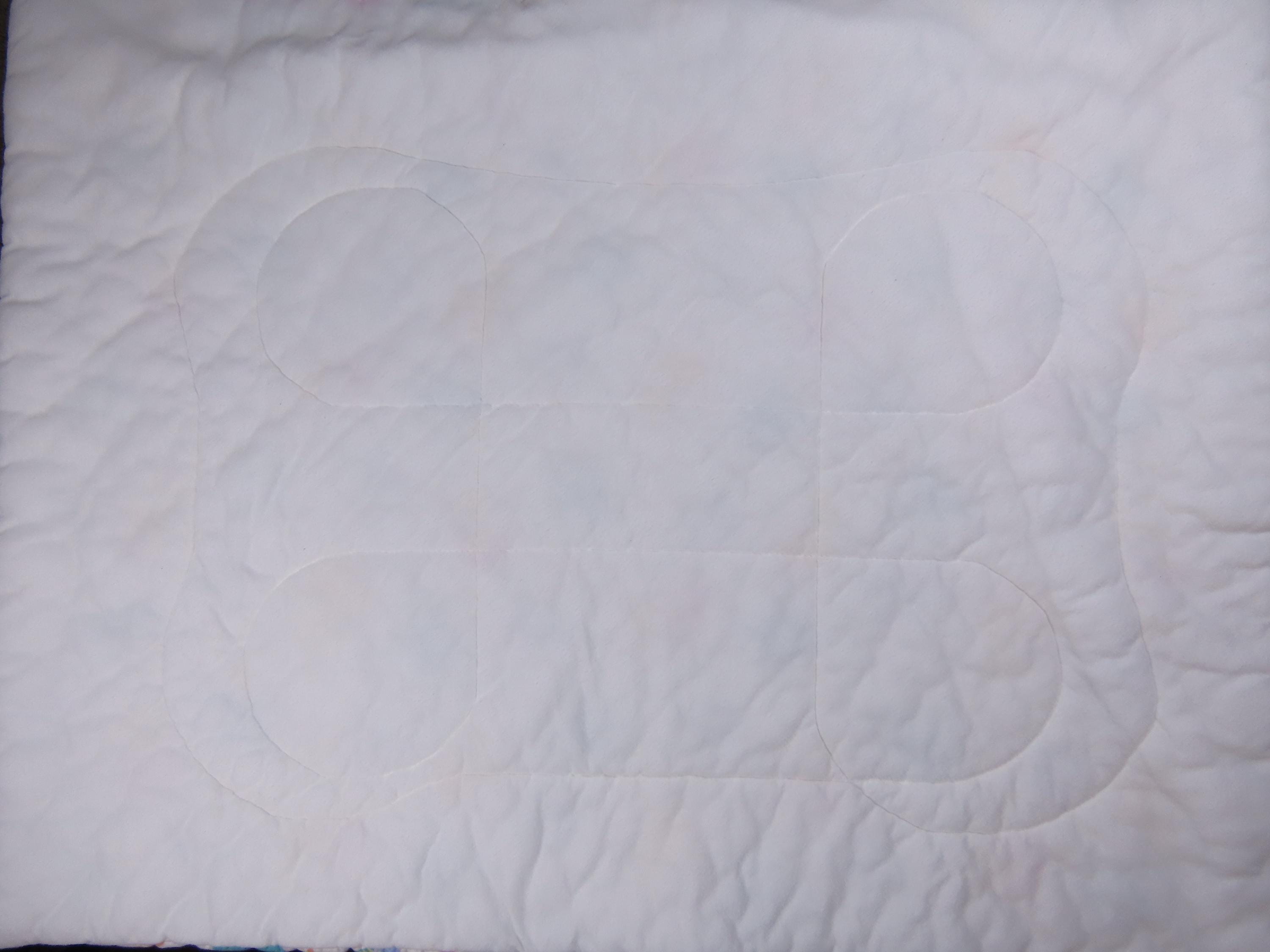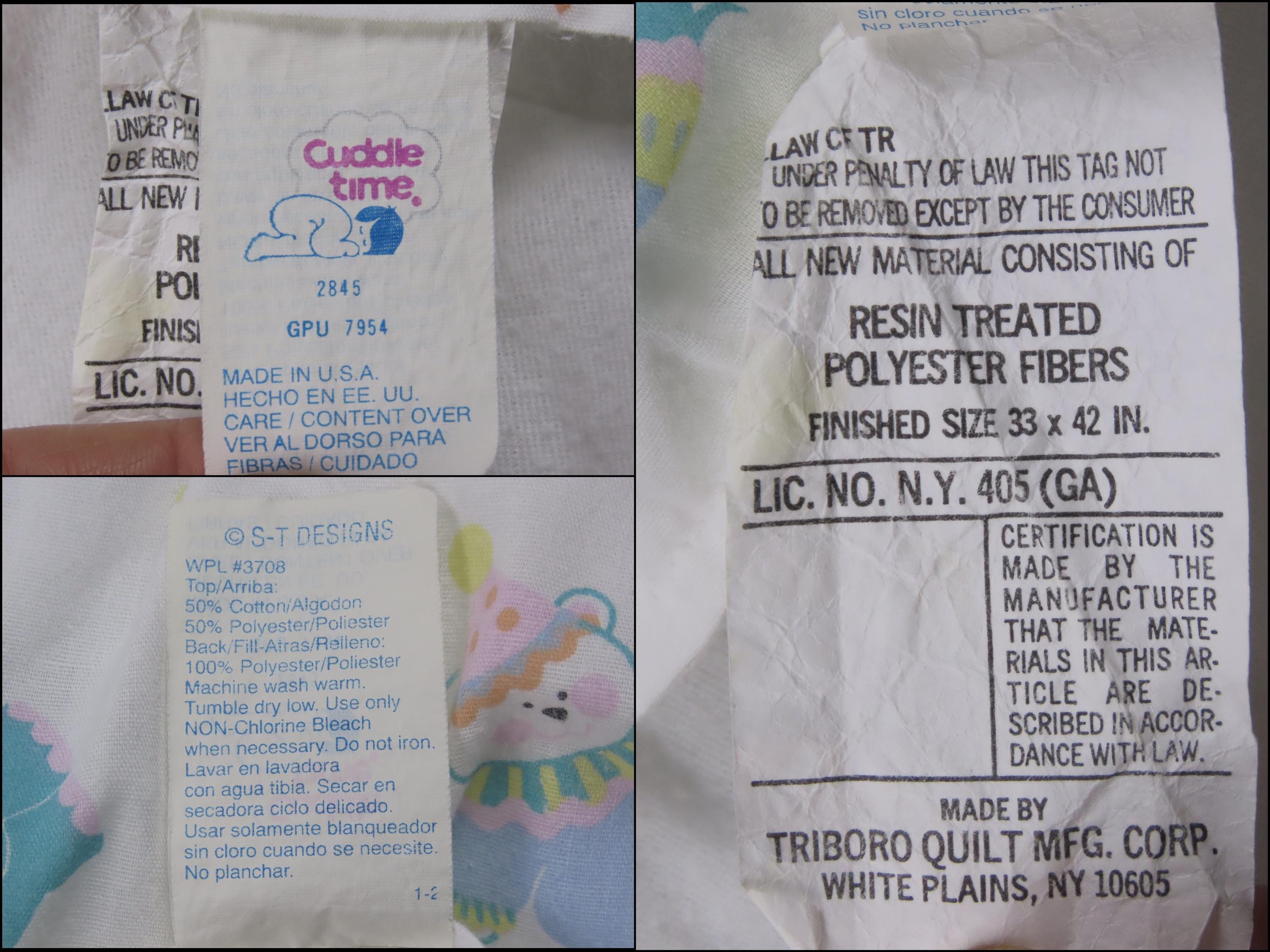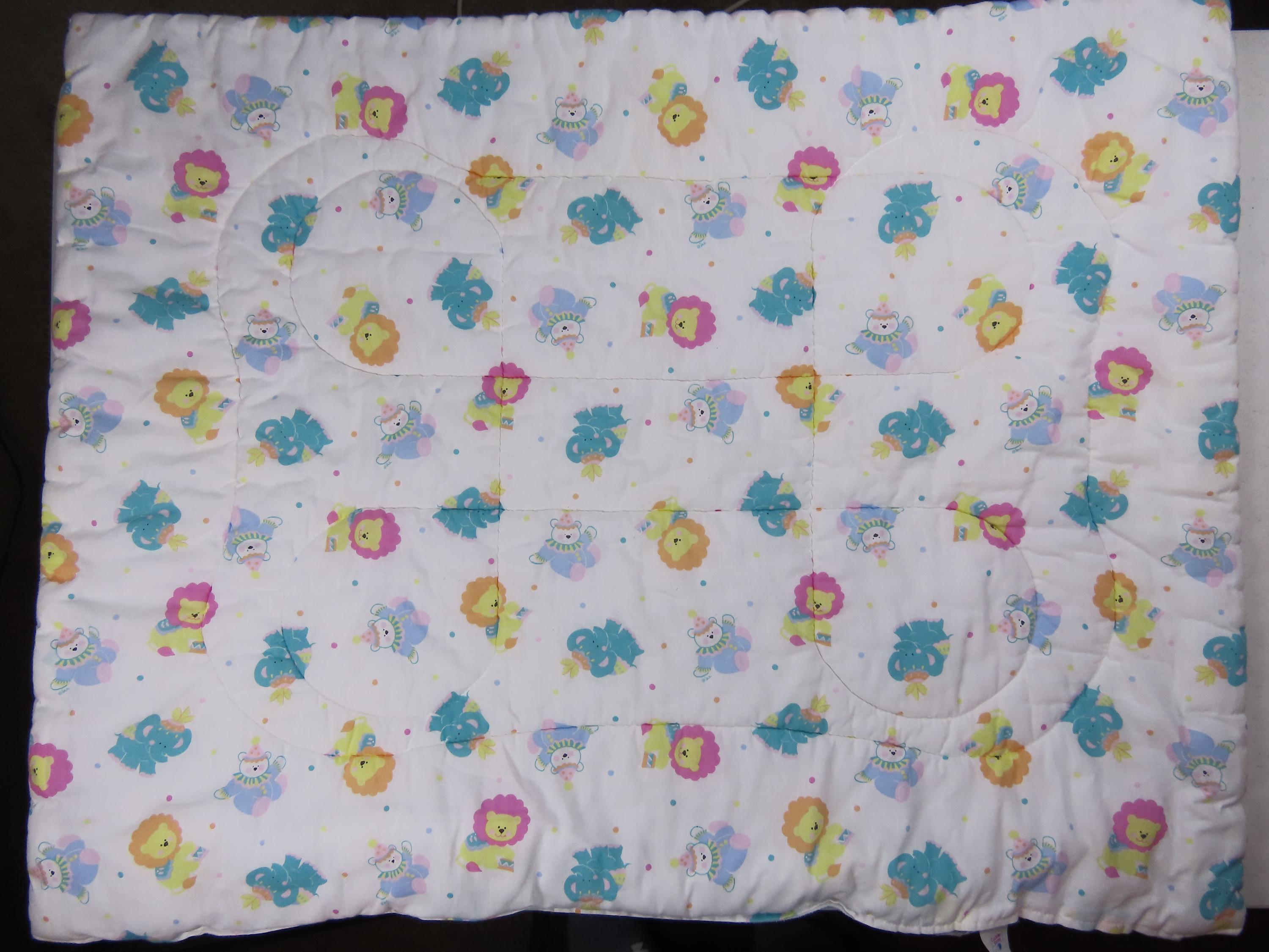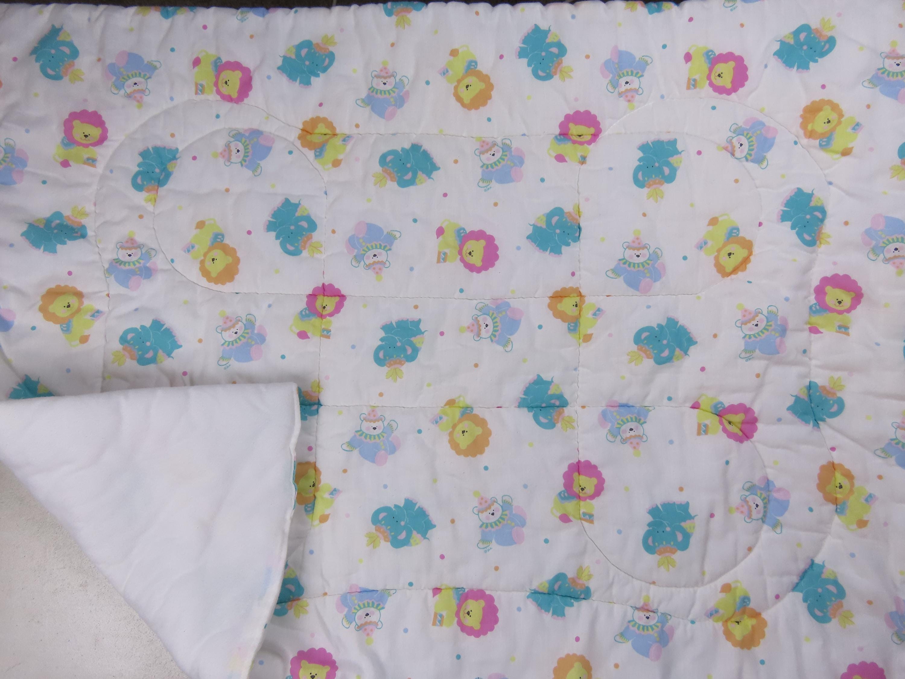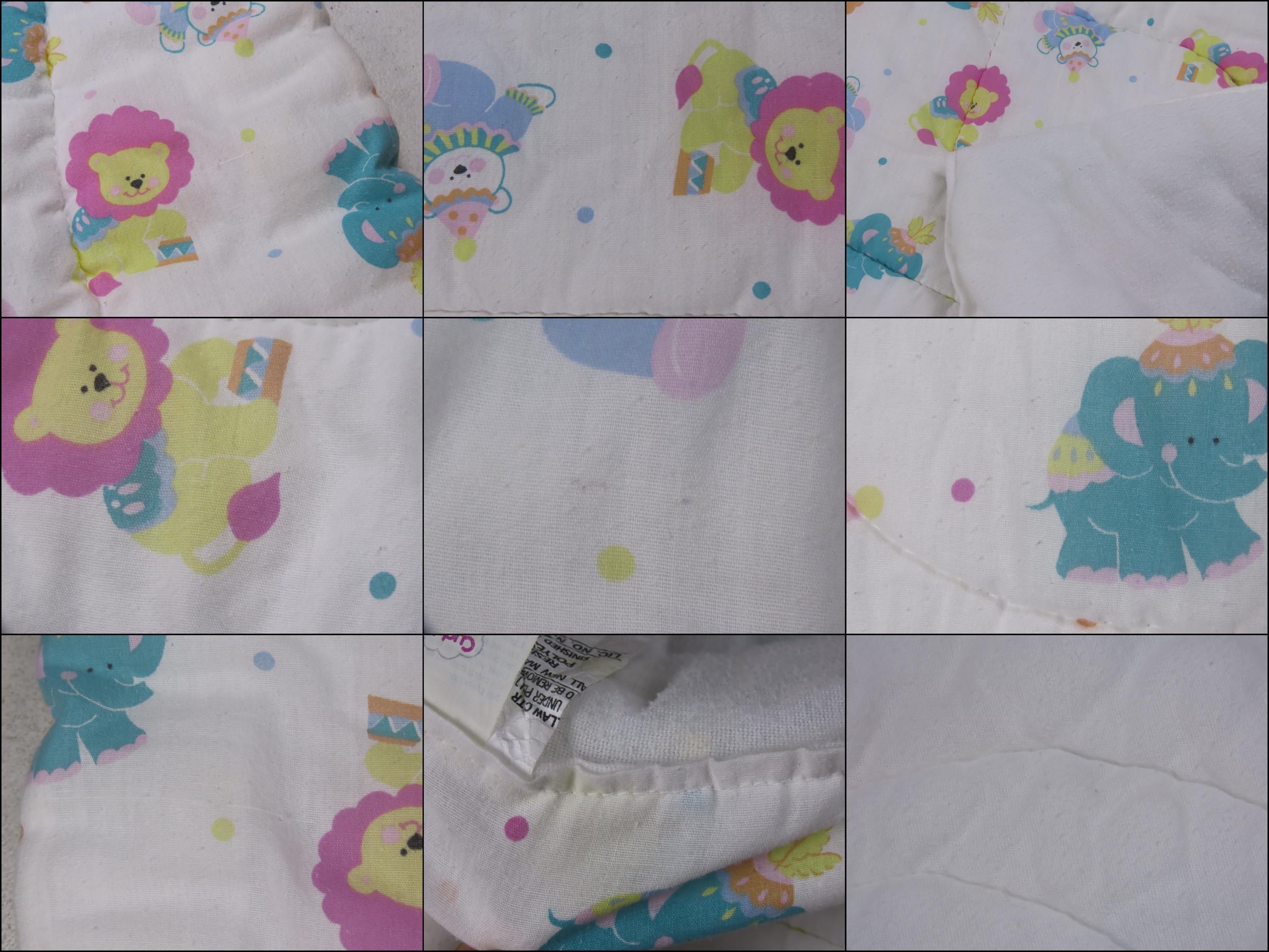 Vintage Circus Animals crib comforter which is about 42" tall by 31" wide (106 cm by 79 cm). The front side is 50% cotton and 50% polyester. The backside and filling are 100% polyester. My camera had a hard time picking up the exact colors. It has heavy pilling, and the filling has settled a little unevenly. It has a small line mark, a small mark, and a yellowish stain near the edge. There are some thread snags.