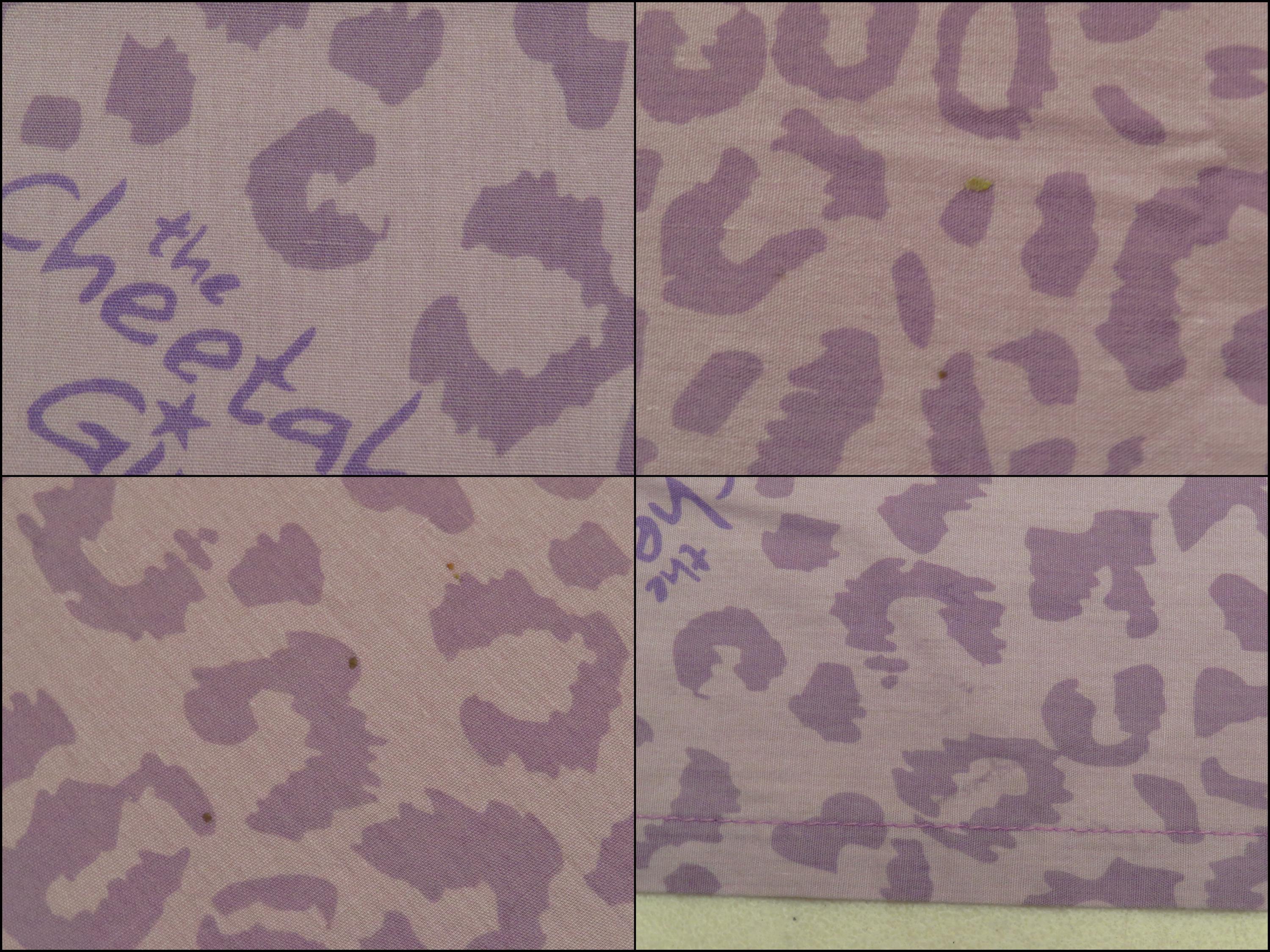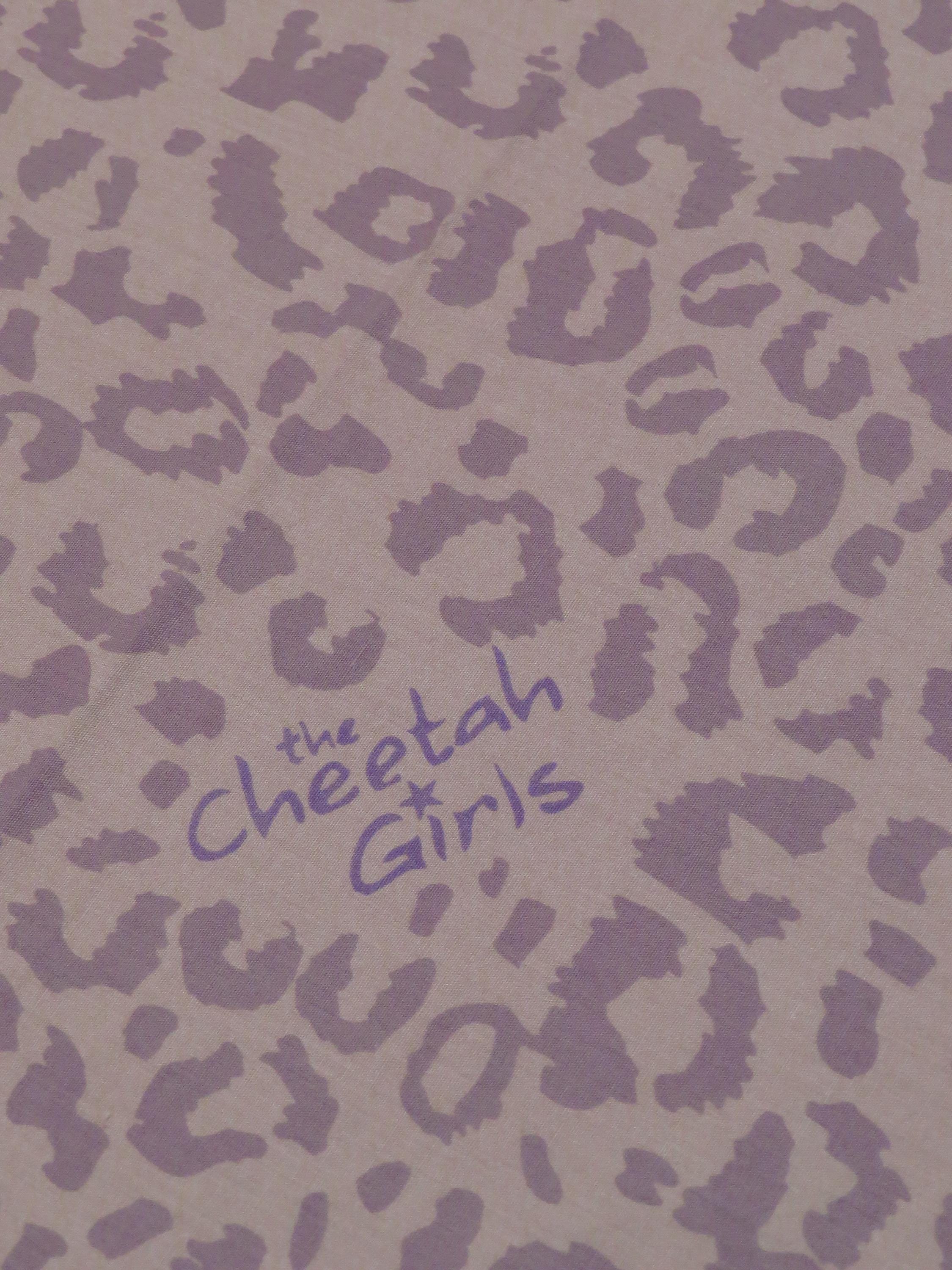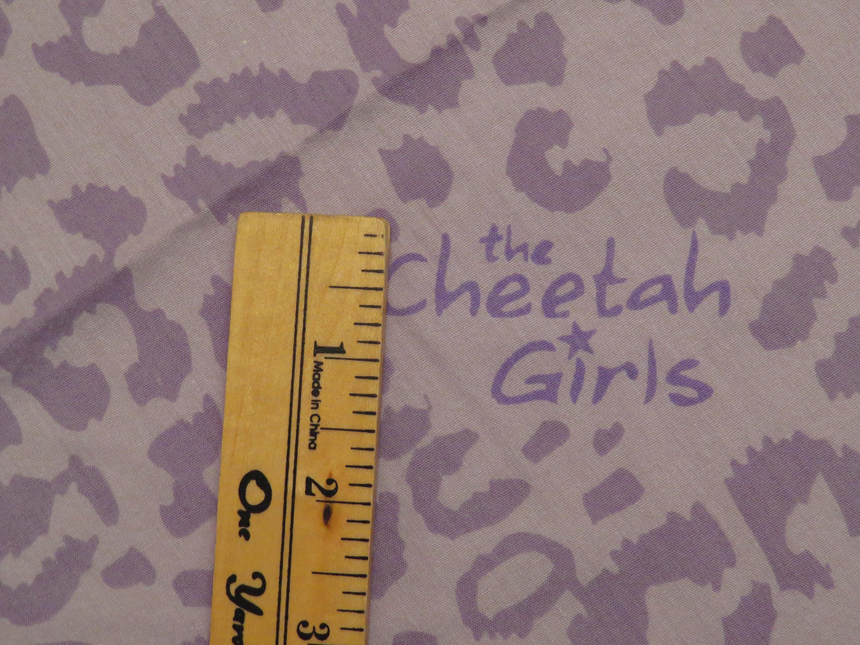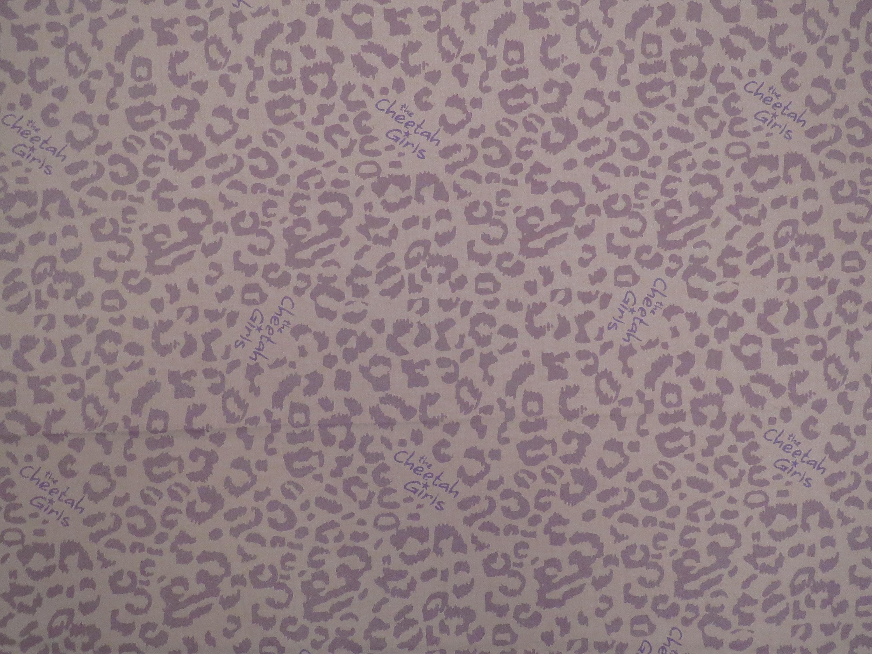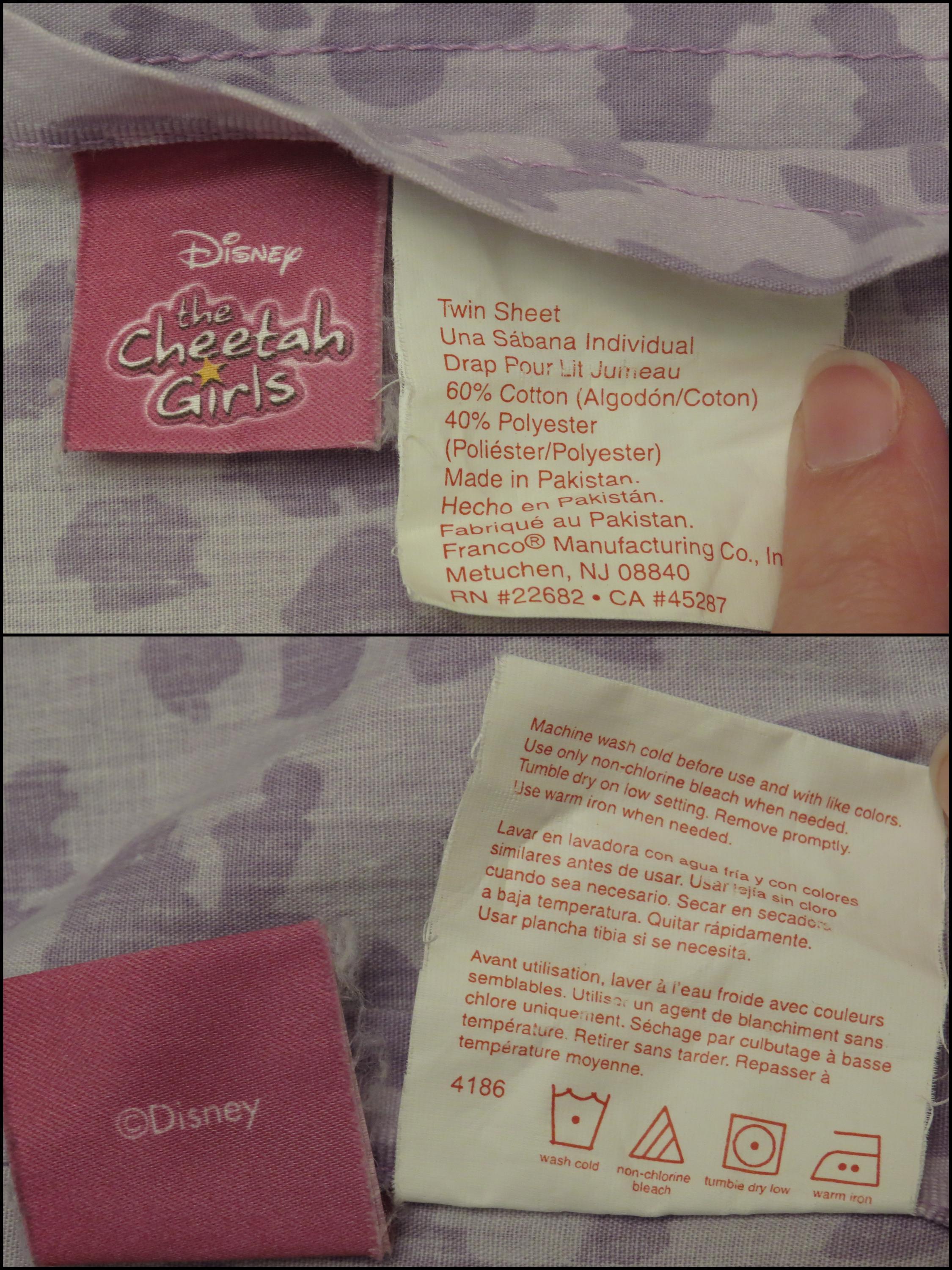 Vintage Cheetah Girls twin flat sheet which is 60% cotton and 40% polyester. My camera had a hard time picking up the exact color. There are missing thread spots, tiny white marks, and some small stains. It has fold/crease lines along the edges, and some small marks near the edge.