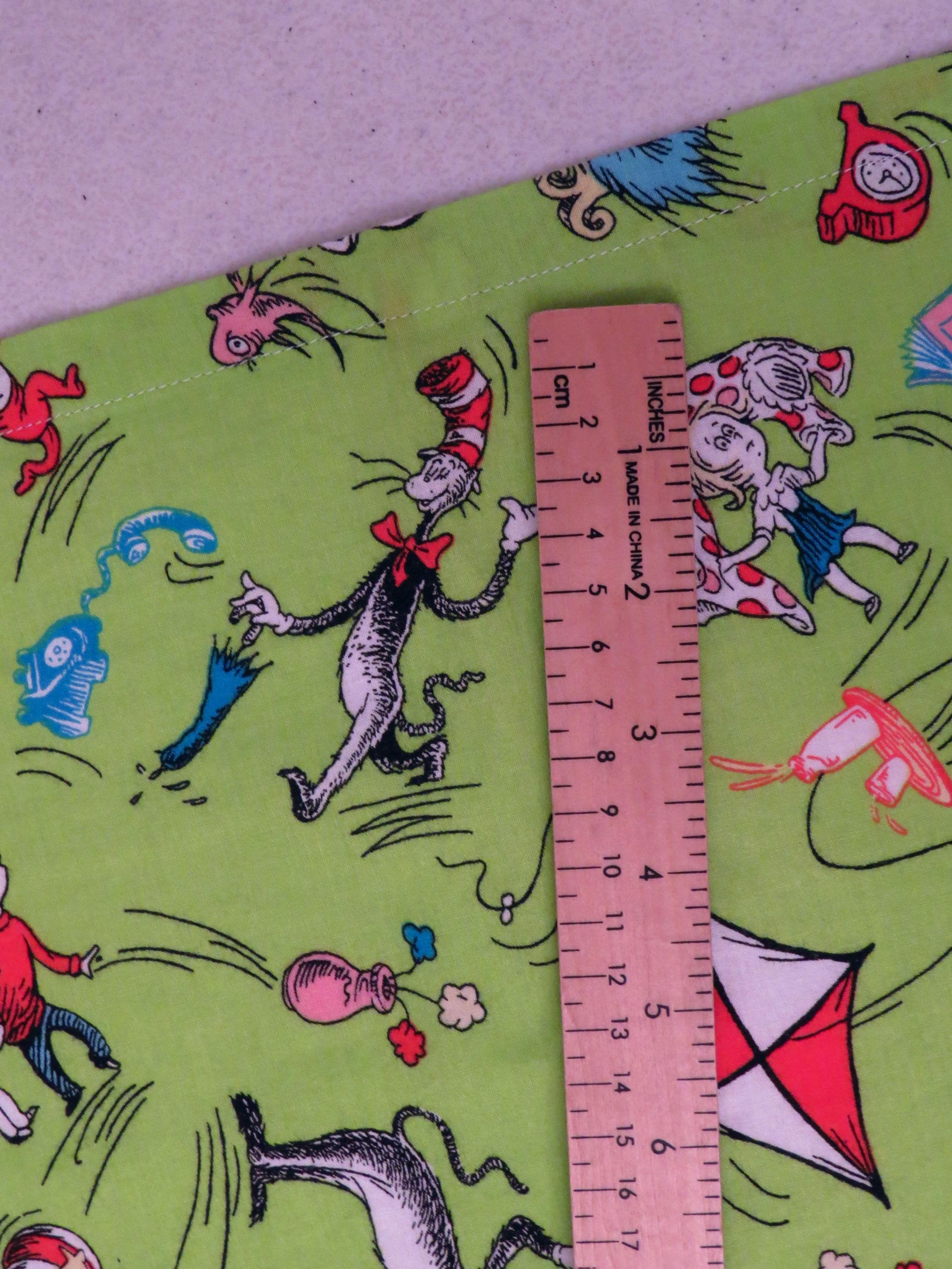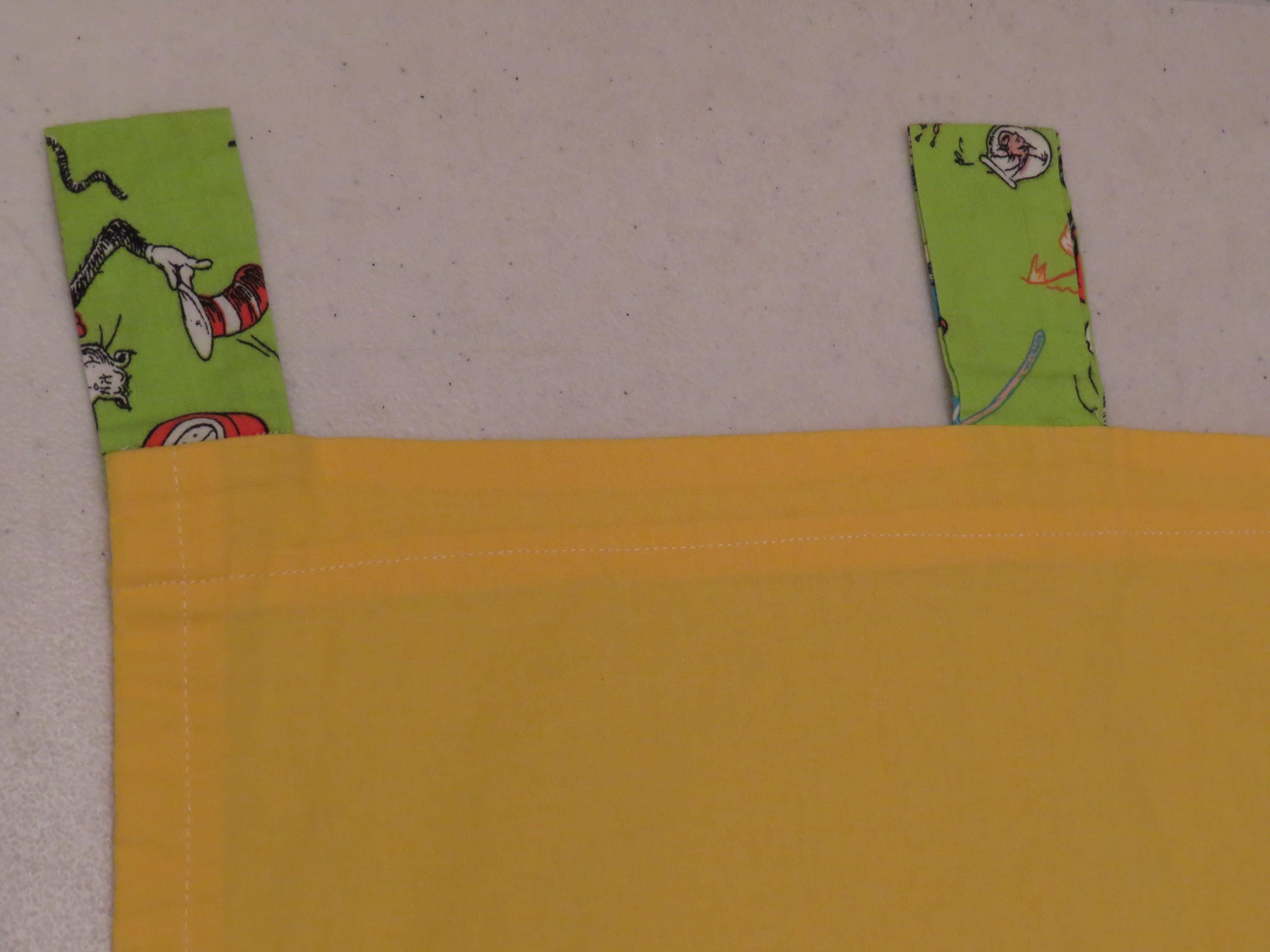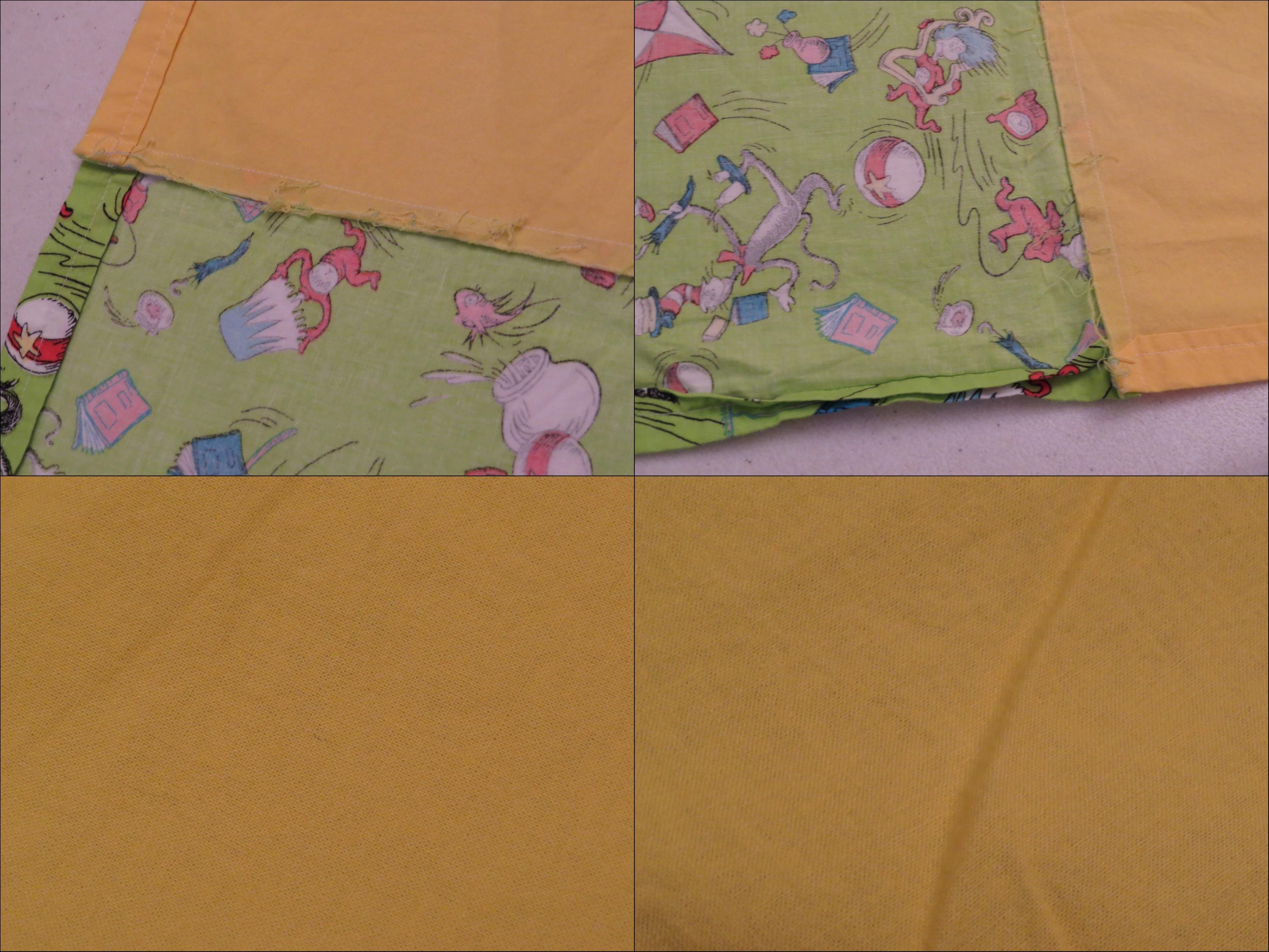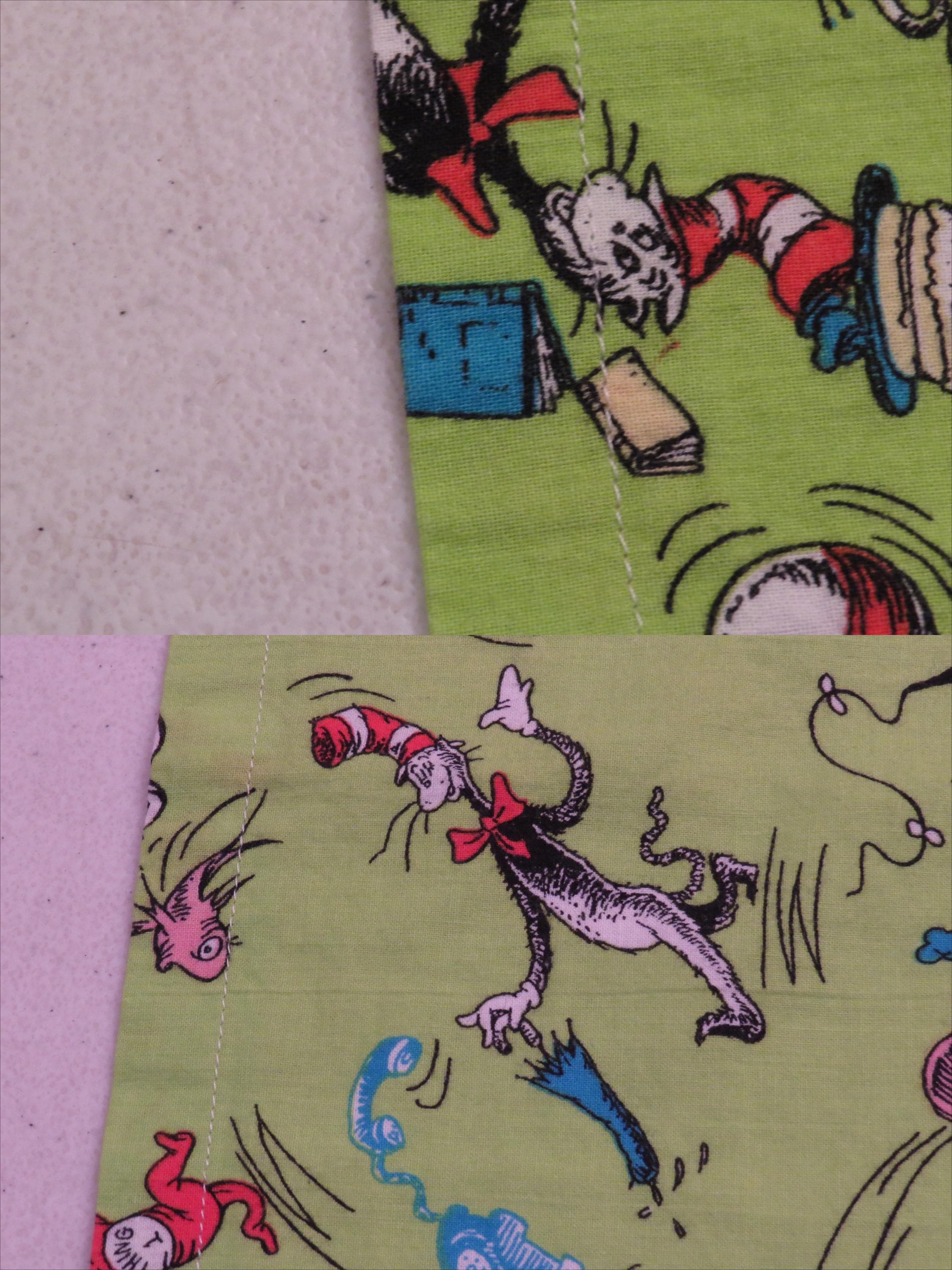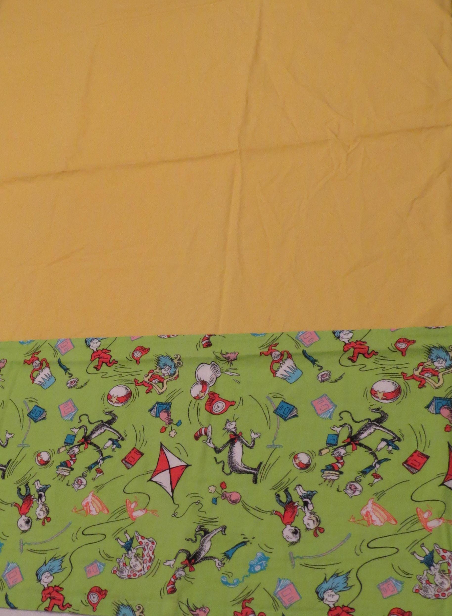 Set of 2 vintage Cat in the Hat curtains which are about 47" tall by 40.5" wide (119 cm by 102 cm). They each have six hanging tabs at the top which are about 3" tall by 1.5" wide. The green Cat in the Hat fabric at the bottom is about 13" tall (34 cm). They are sewn a little unevenly in areas, and the seam on the backside is fraying. There tiny white marks, thin spots, and some hard creases. Both curtains have a small/tiny mark.