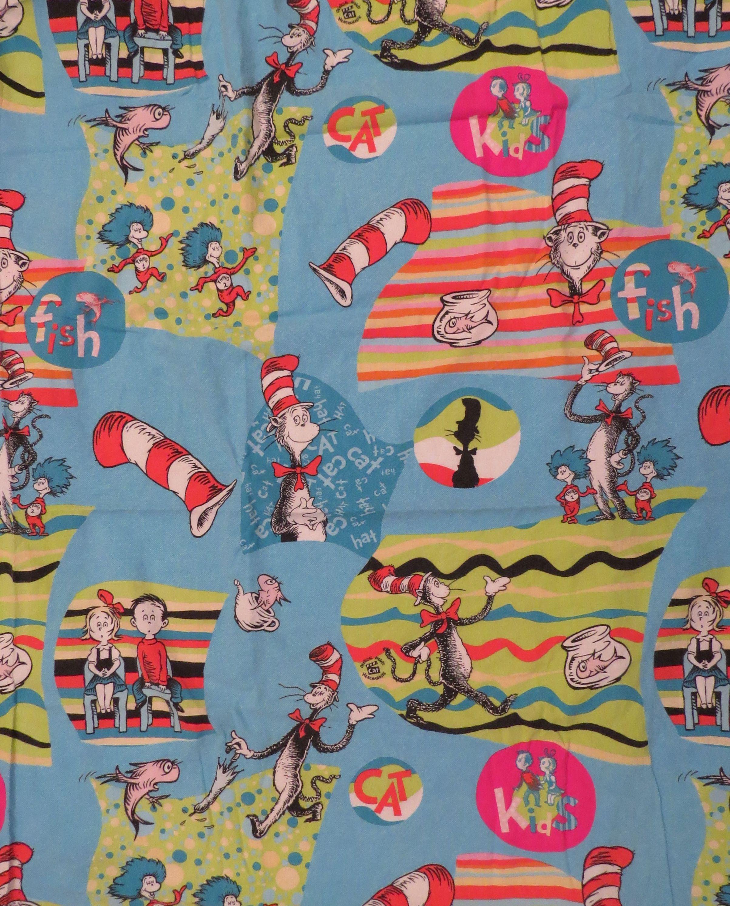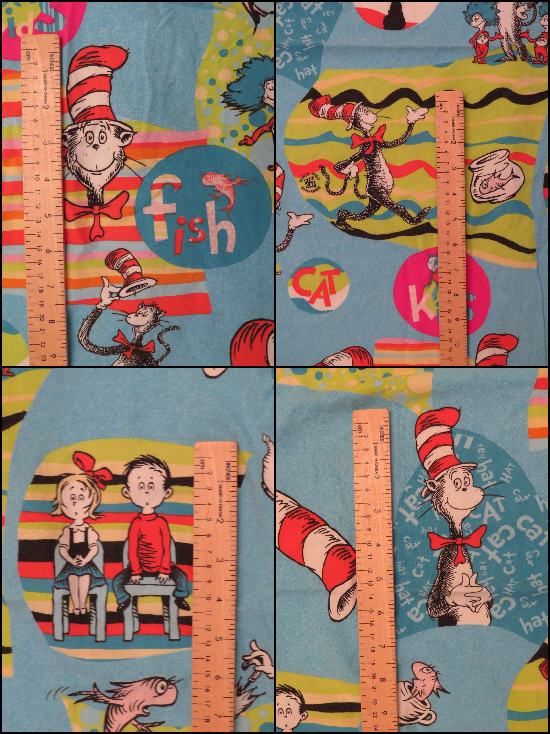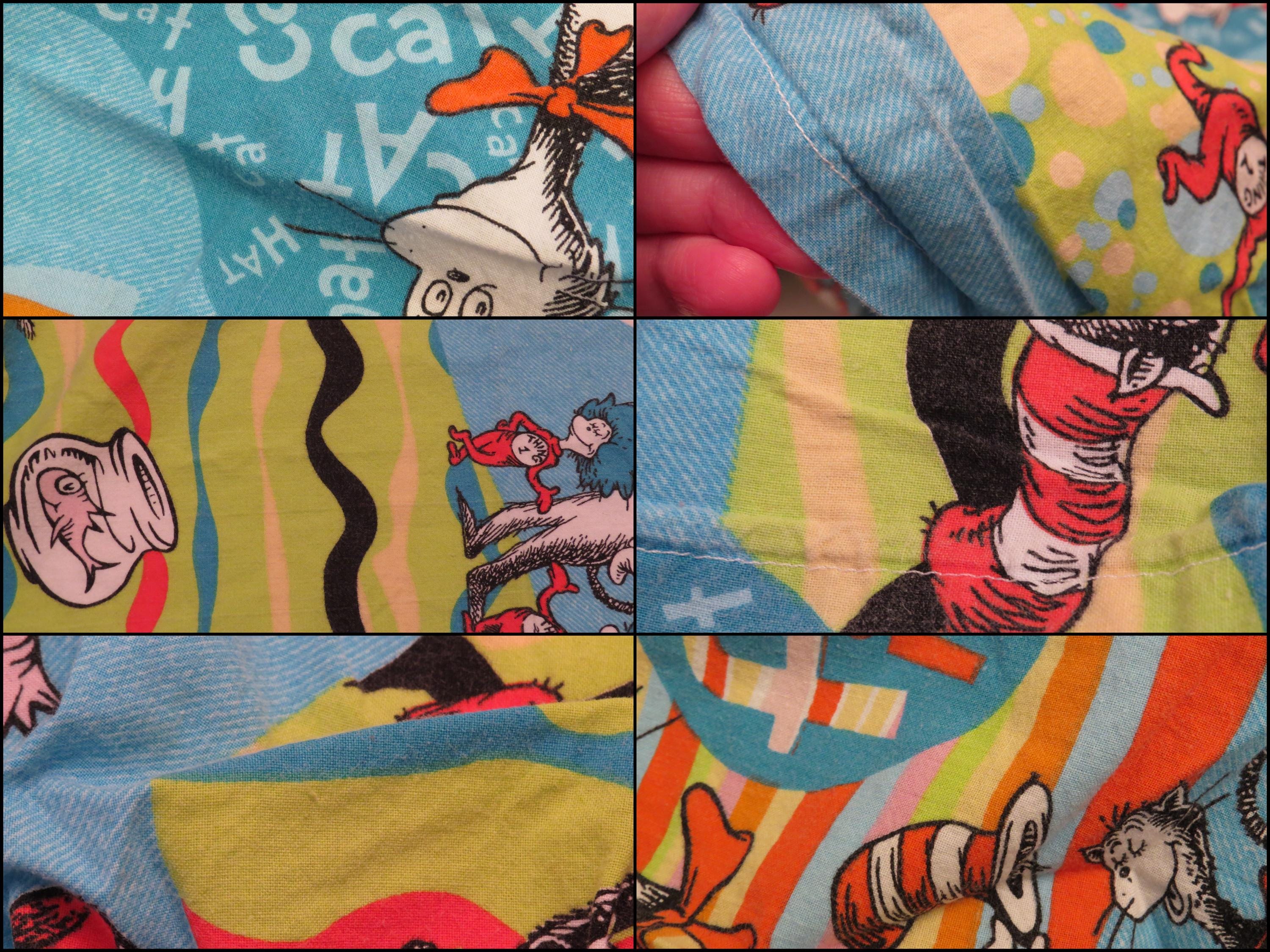 Vintage Cat in the Hat crib fitted sheet which is about 48" tall by 26" wide corner to corner (123 cm by 66 cm). It looks handmade. The corner seams are fraying on the inside, the elastic is mostly worn out, and it is worn along the edges. There are some light fold/crease lines, hard creases, and a few thread snags. It has a small mark near the edge, and fold/crease lines along the edges. The fabric is a little worn and faded.