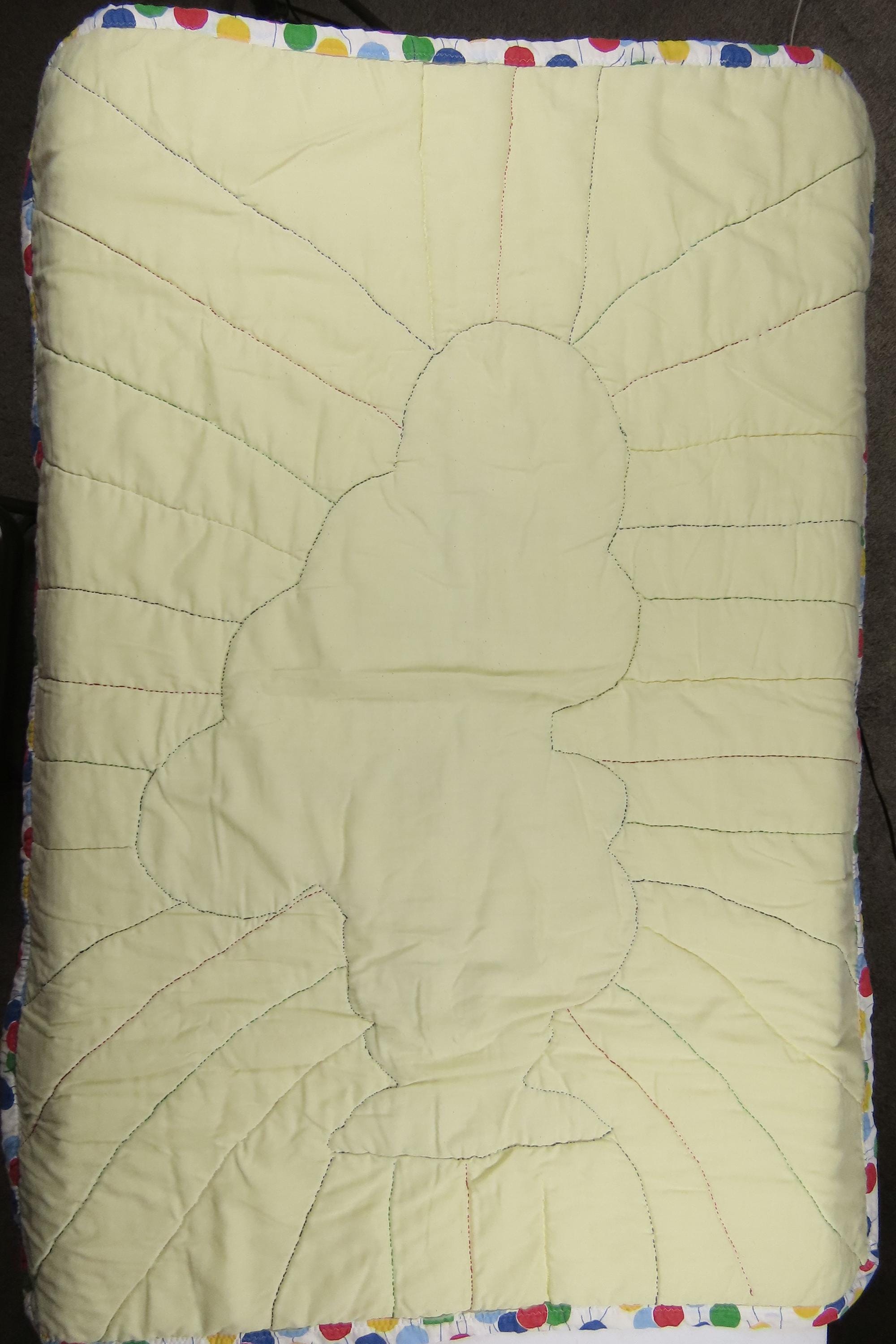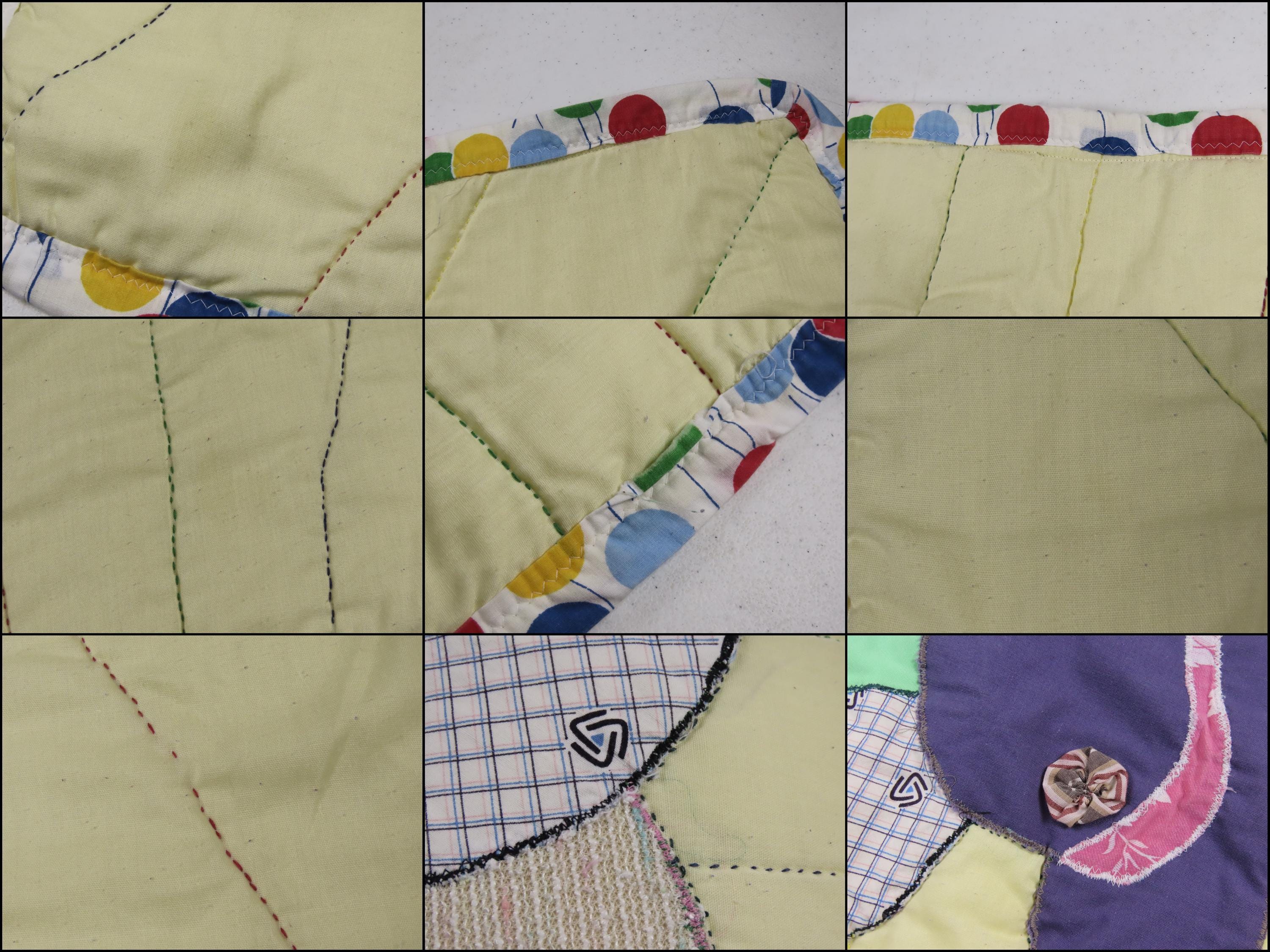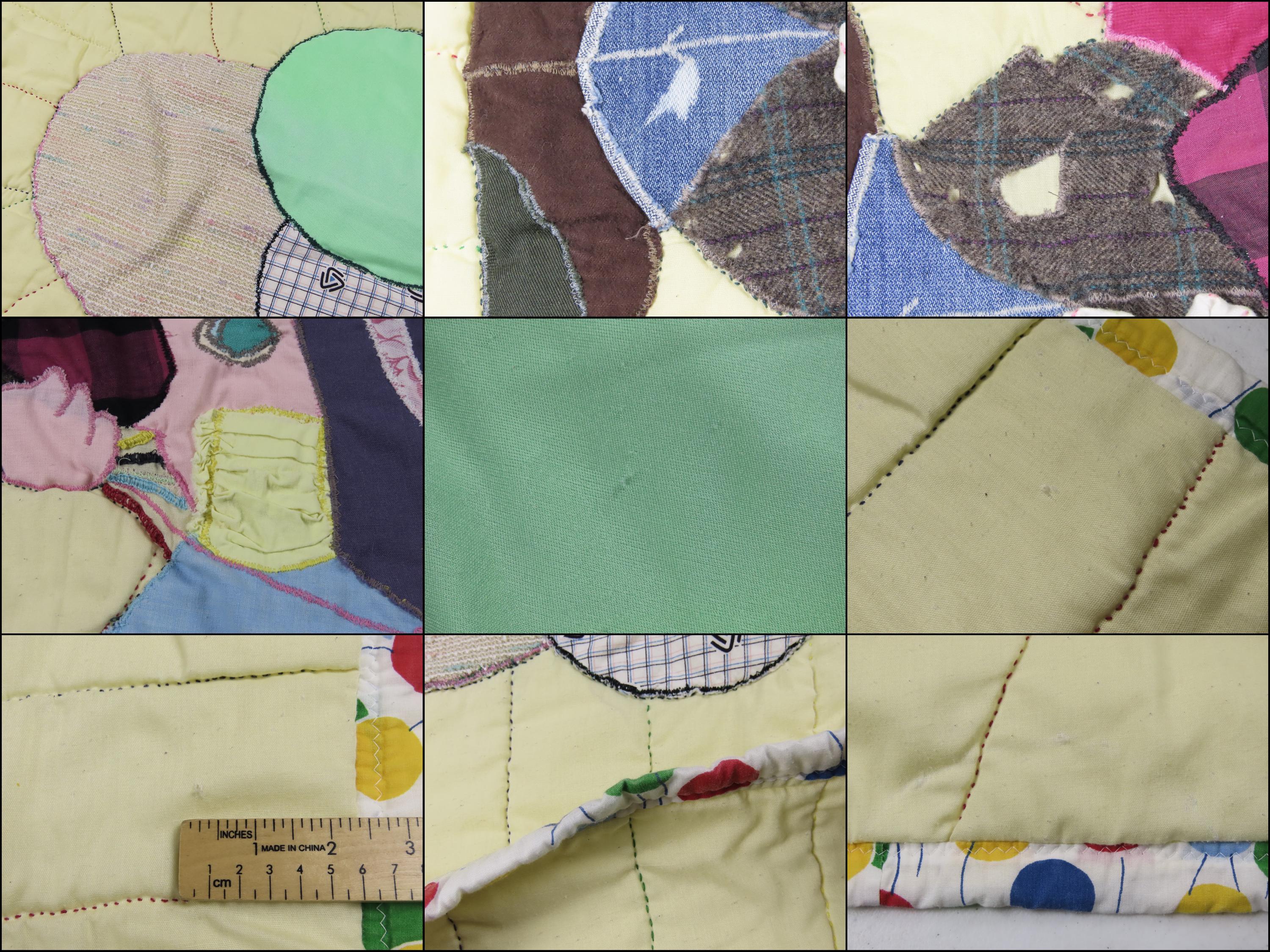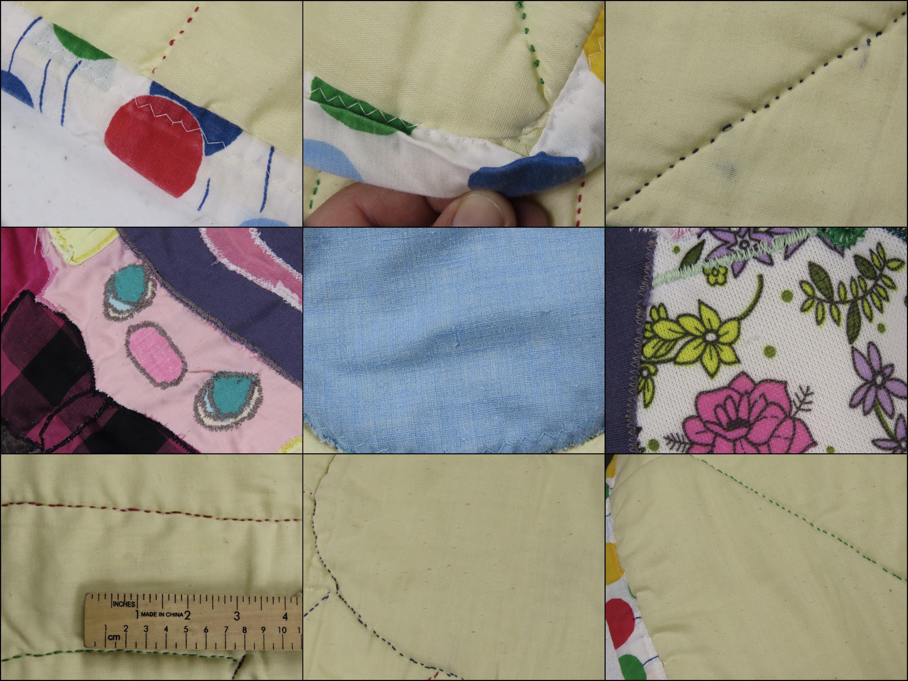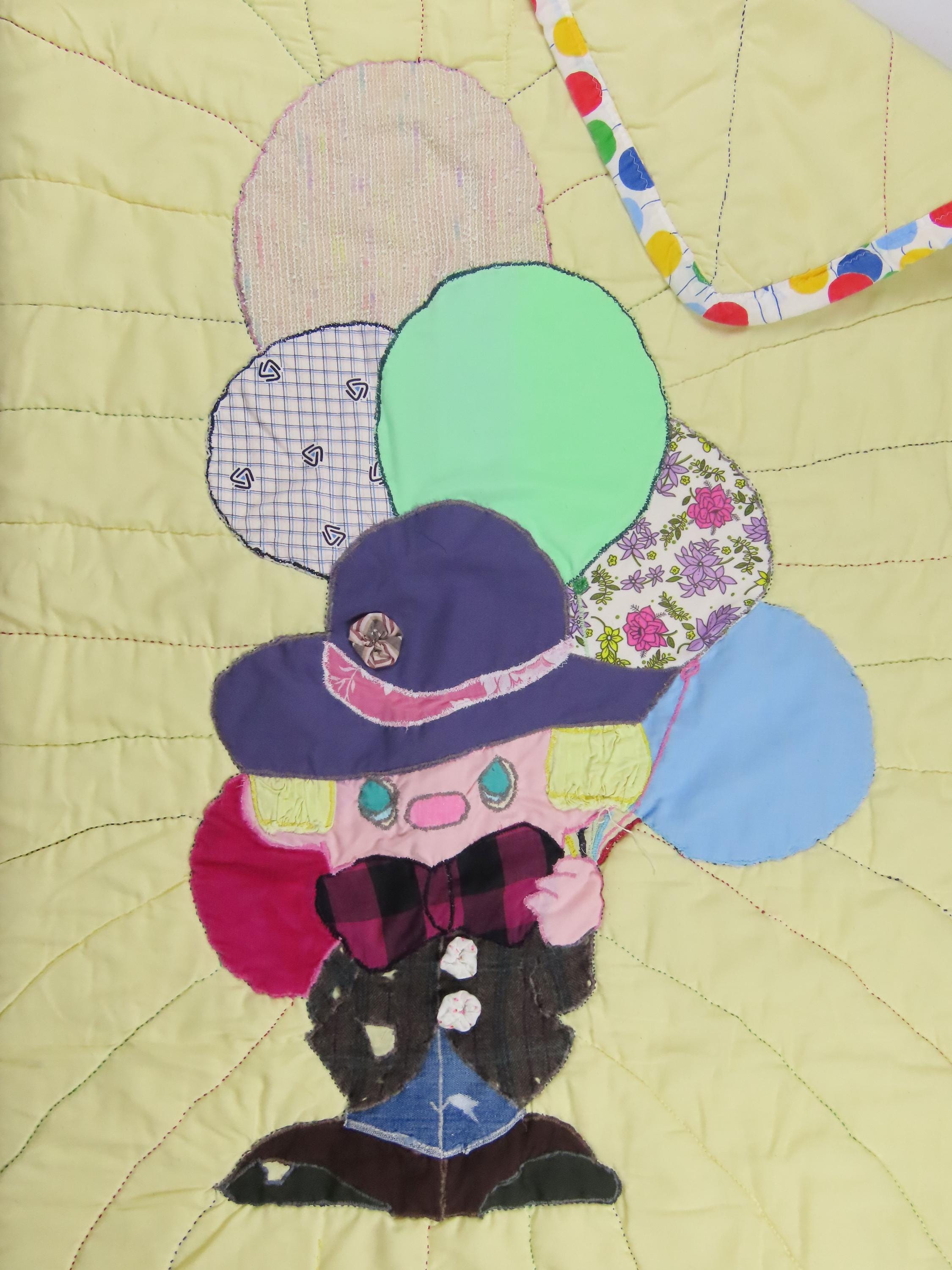 Vintage clown quilted blanket which is about 50" tall by 38" wide (126 cm by 97 cm). My camera had a hard time picking up the exact colors. It is sewn a little unevenly along the edges, and it is worn along the edges/stitching. There are loose threads, pilling, and the fabric pools up in areas. It has a small hole, a cluster of small holes, and some thread snags. The backside has a few small stains, a couple larger stains, and heavy pilling. There is small area where the binding is fraying because it wasn't sewn down completely, and there are some areas where threads can be seen through the yellow fabric.