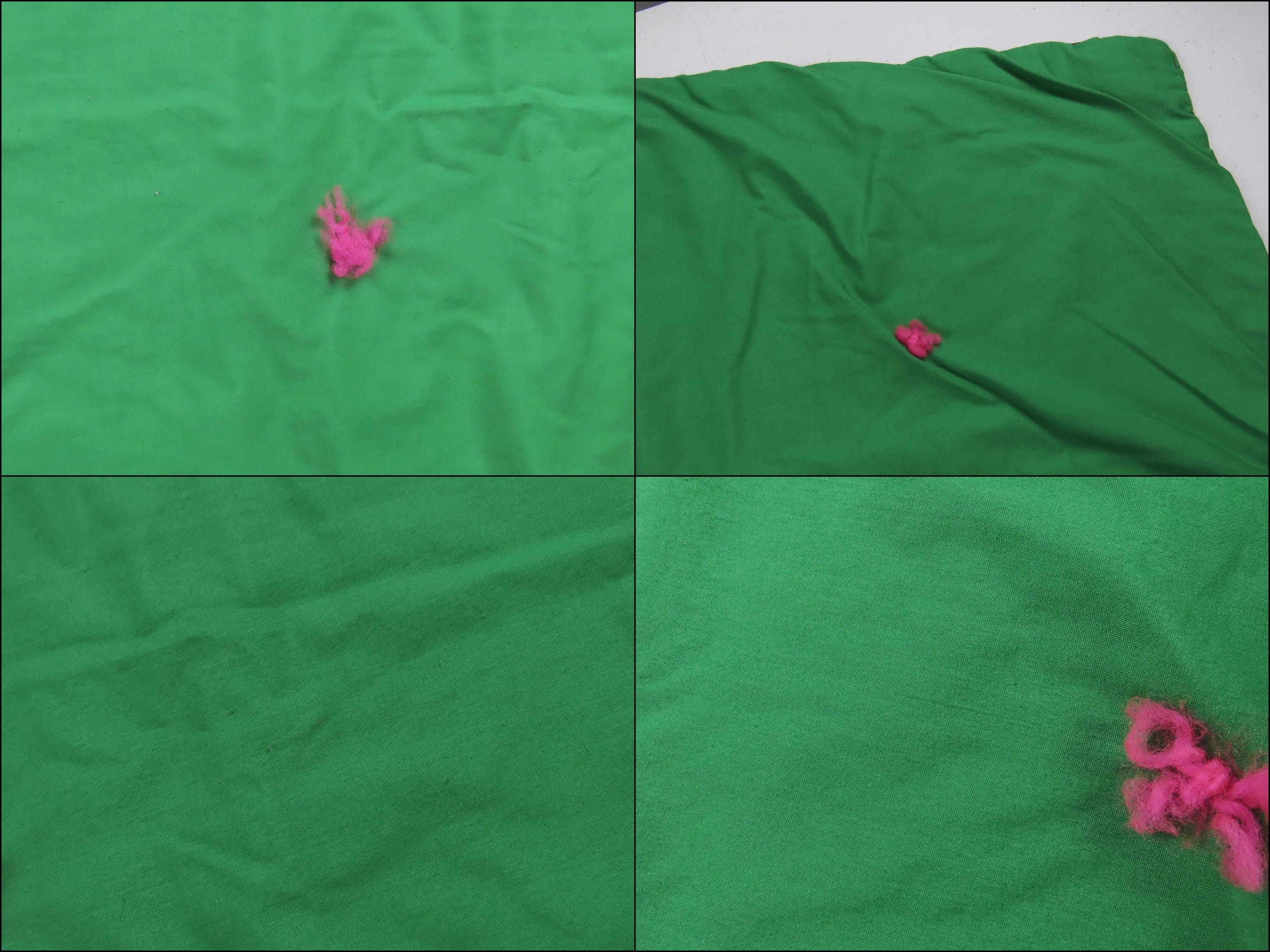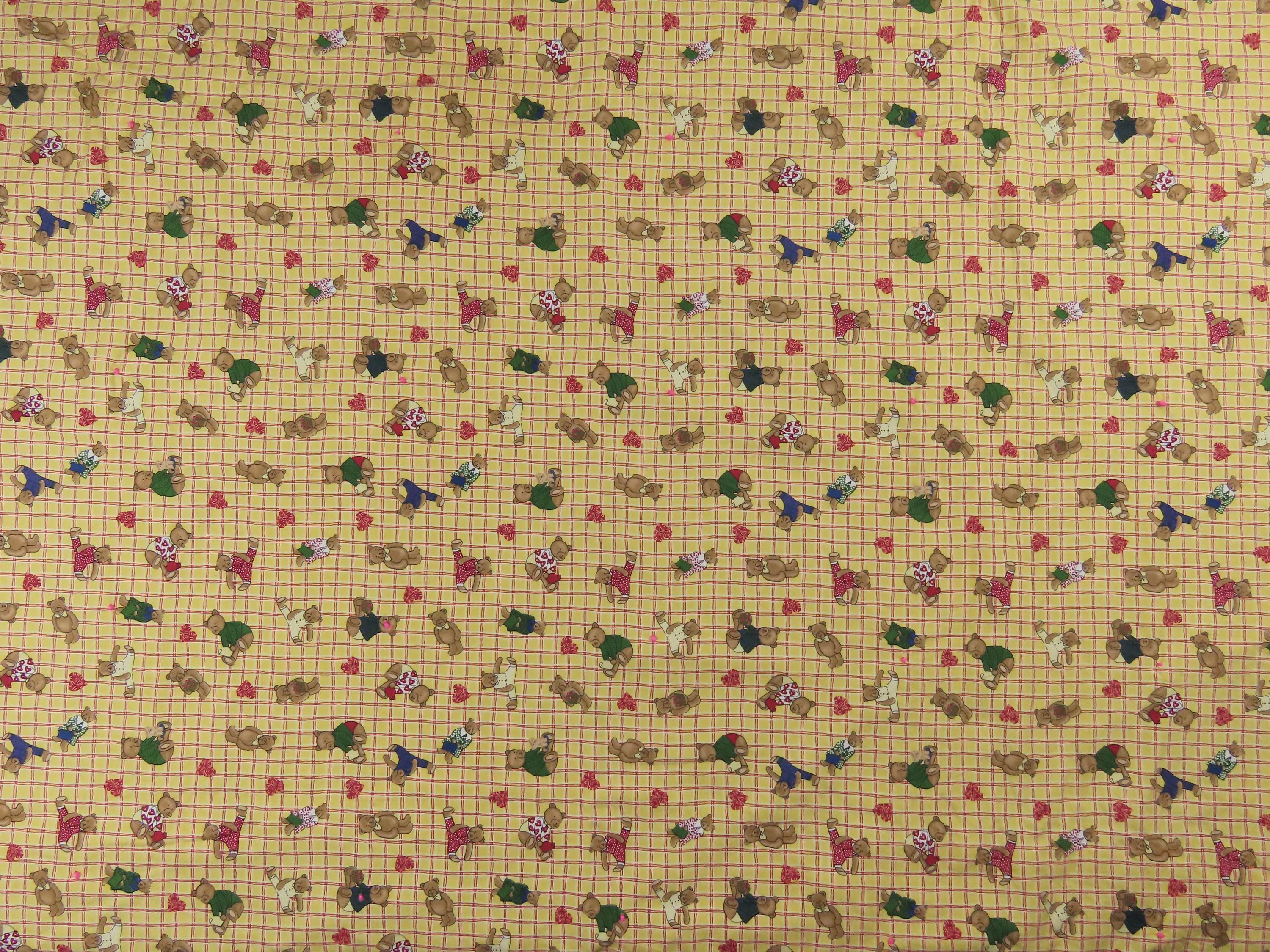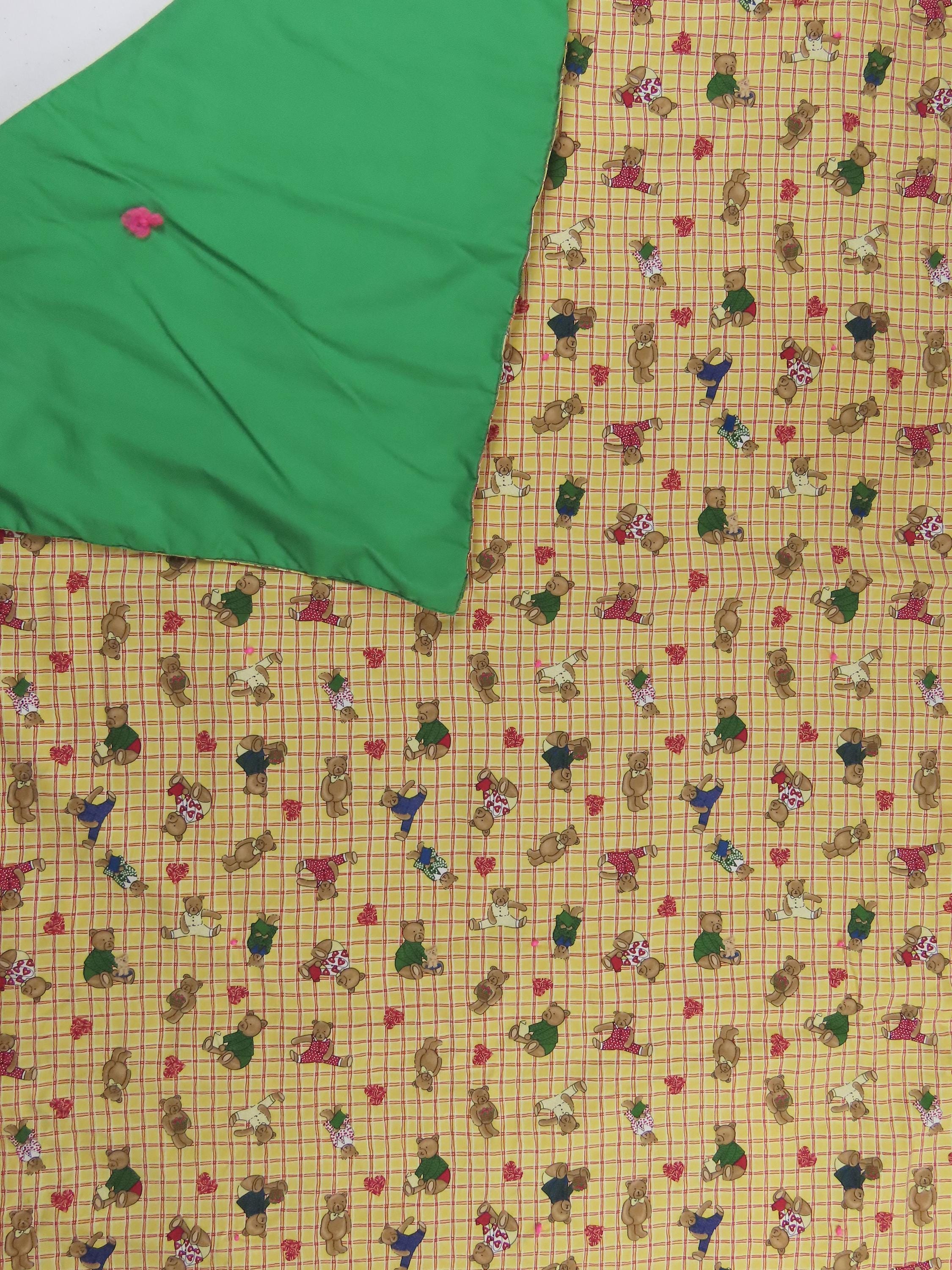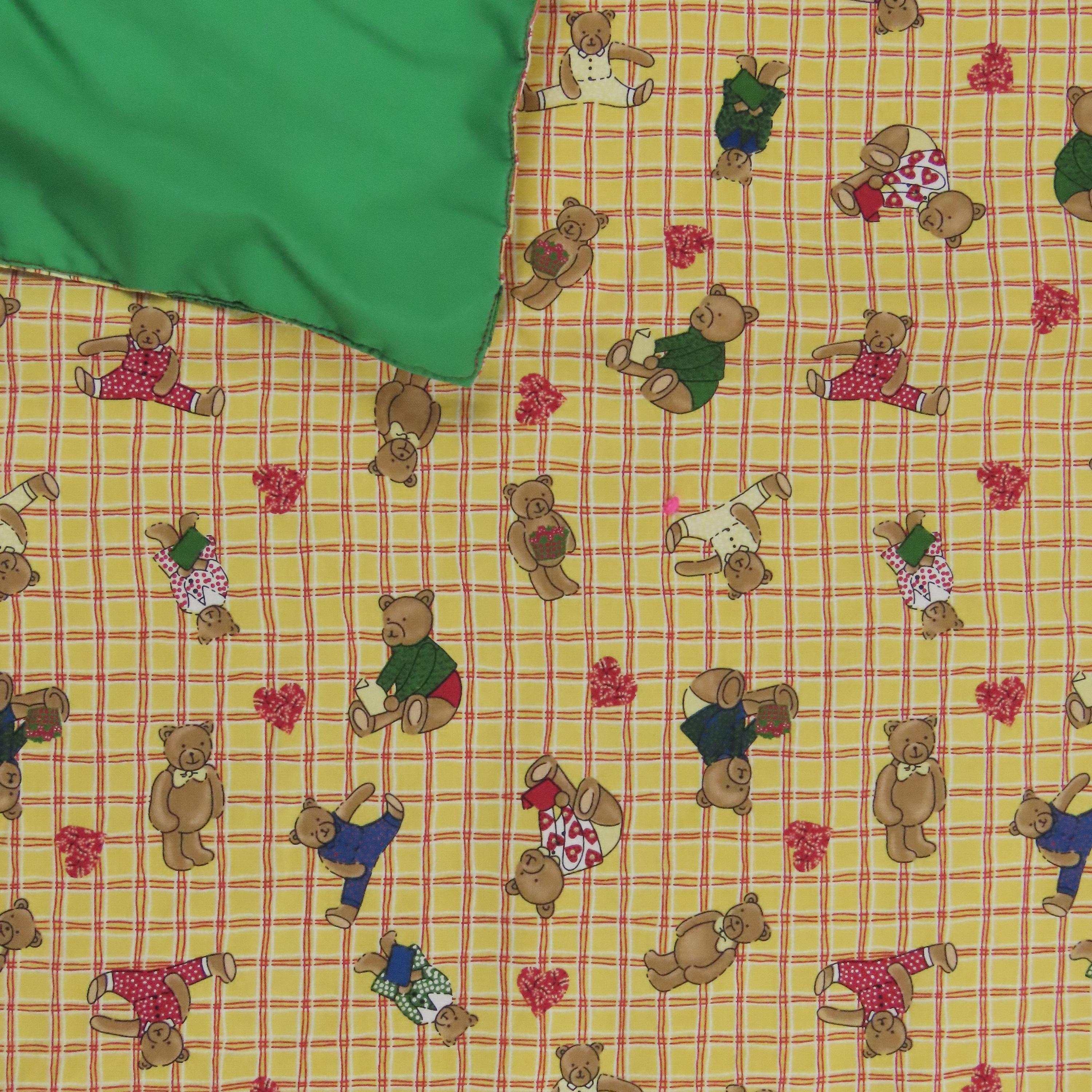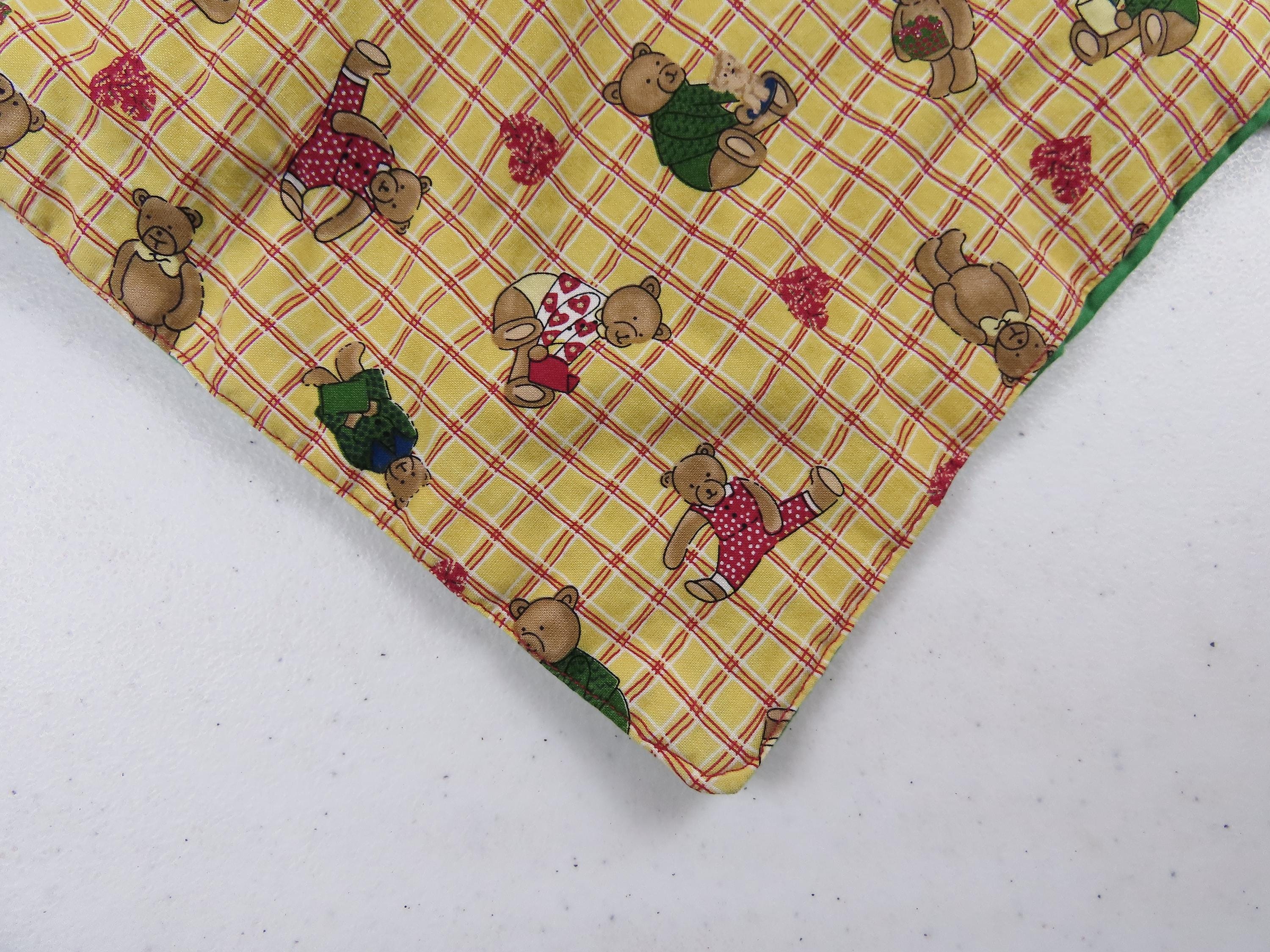 Vintage Teddy Bear small blanket which is about 50" tall by 41" wide (127 cm by 103 cm). My camera had a hard time picking up the exact colors, especially the green and pink on the backside. It is sewn a little unevenly, the fabric pools up in areas, and the blanket does not want to lay completely flat along the edge. It has some thread snags, a missing thread spot, and it is worn along the edges. It has pilling on the backside, and the yarn ties are fraying.