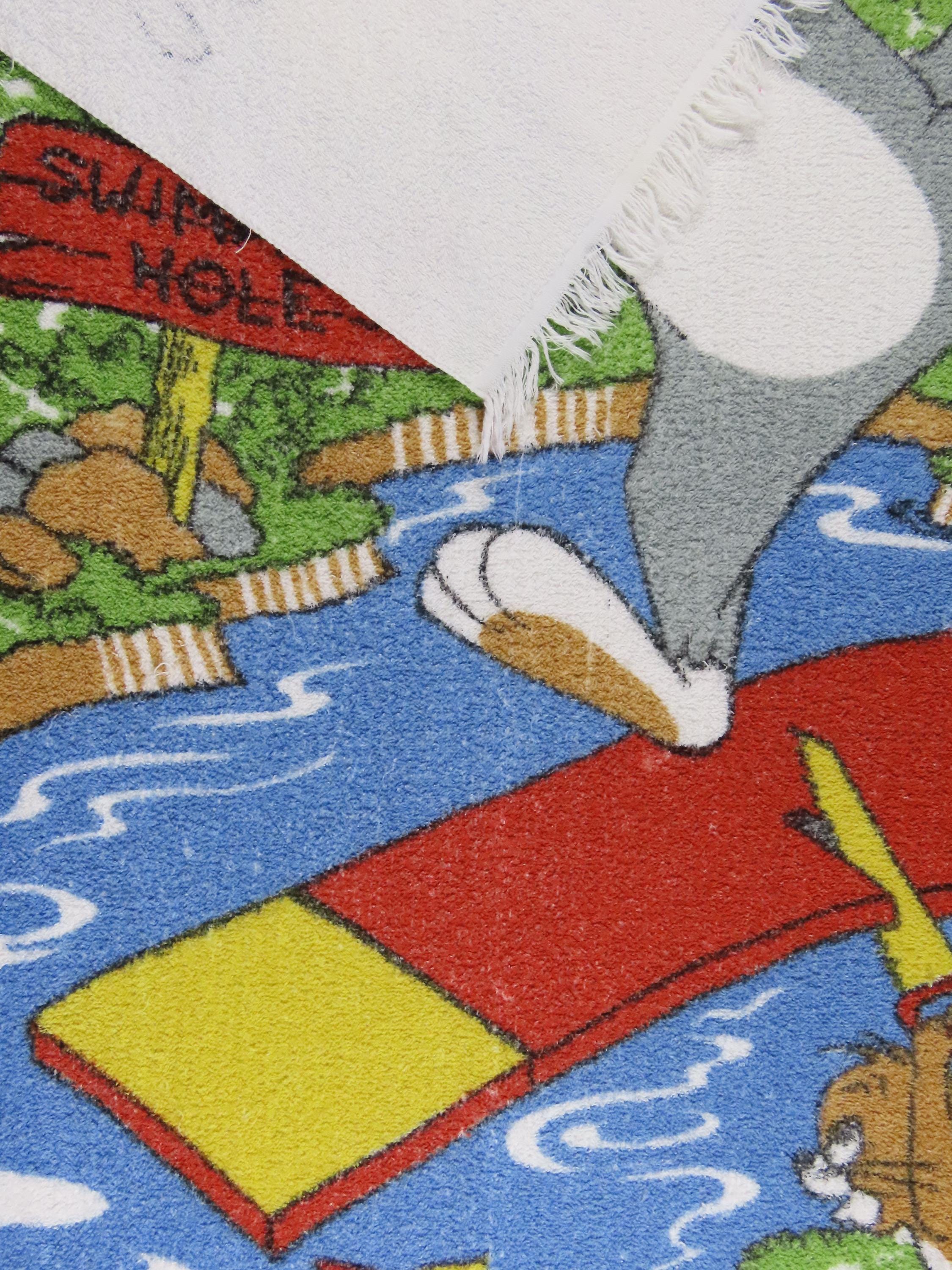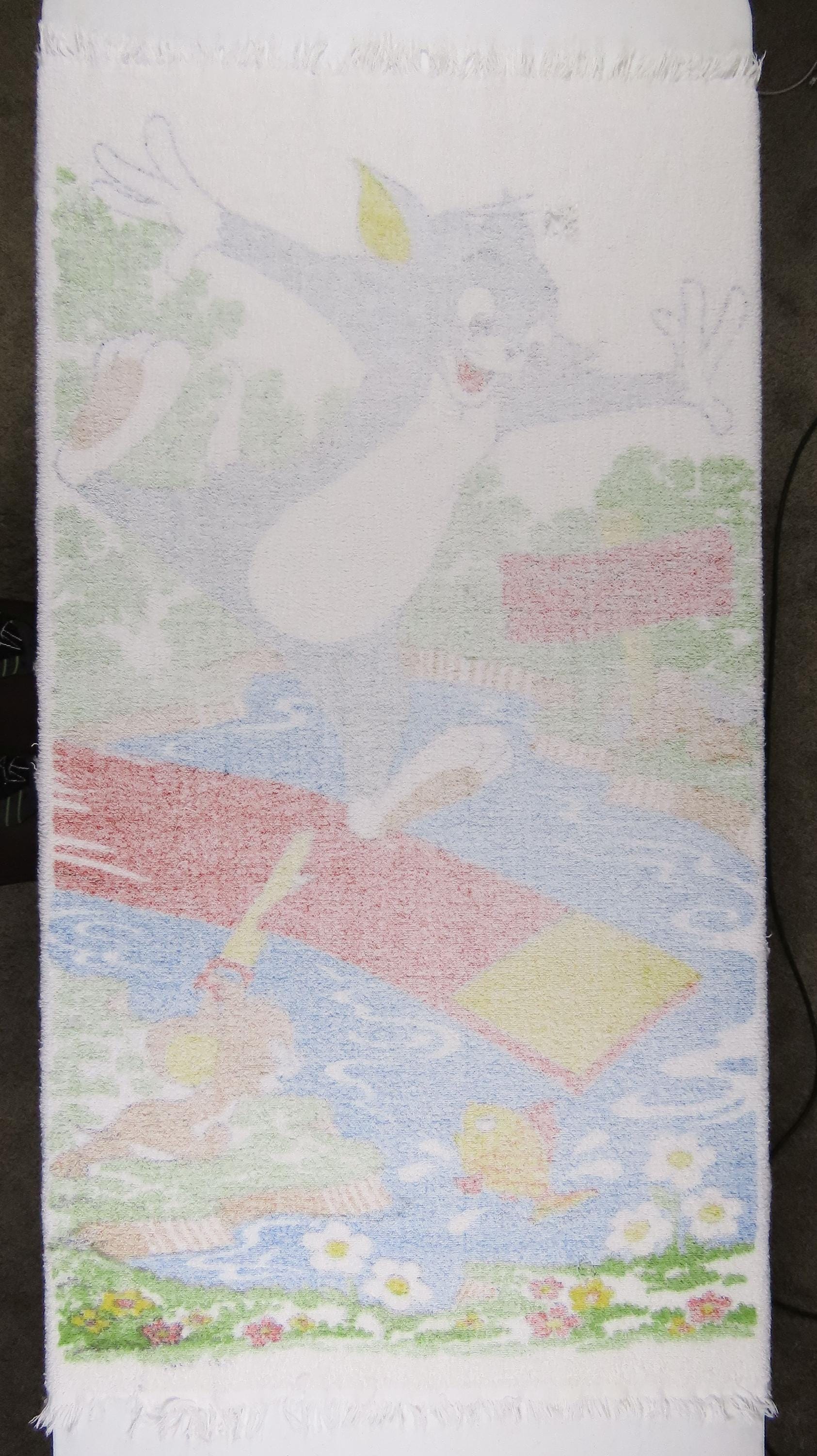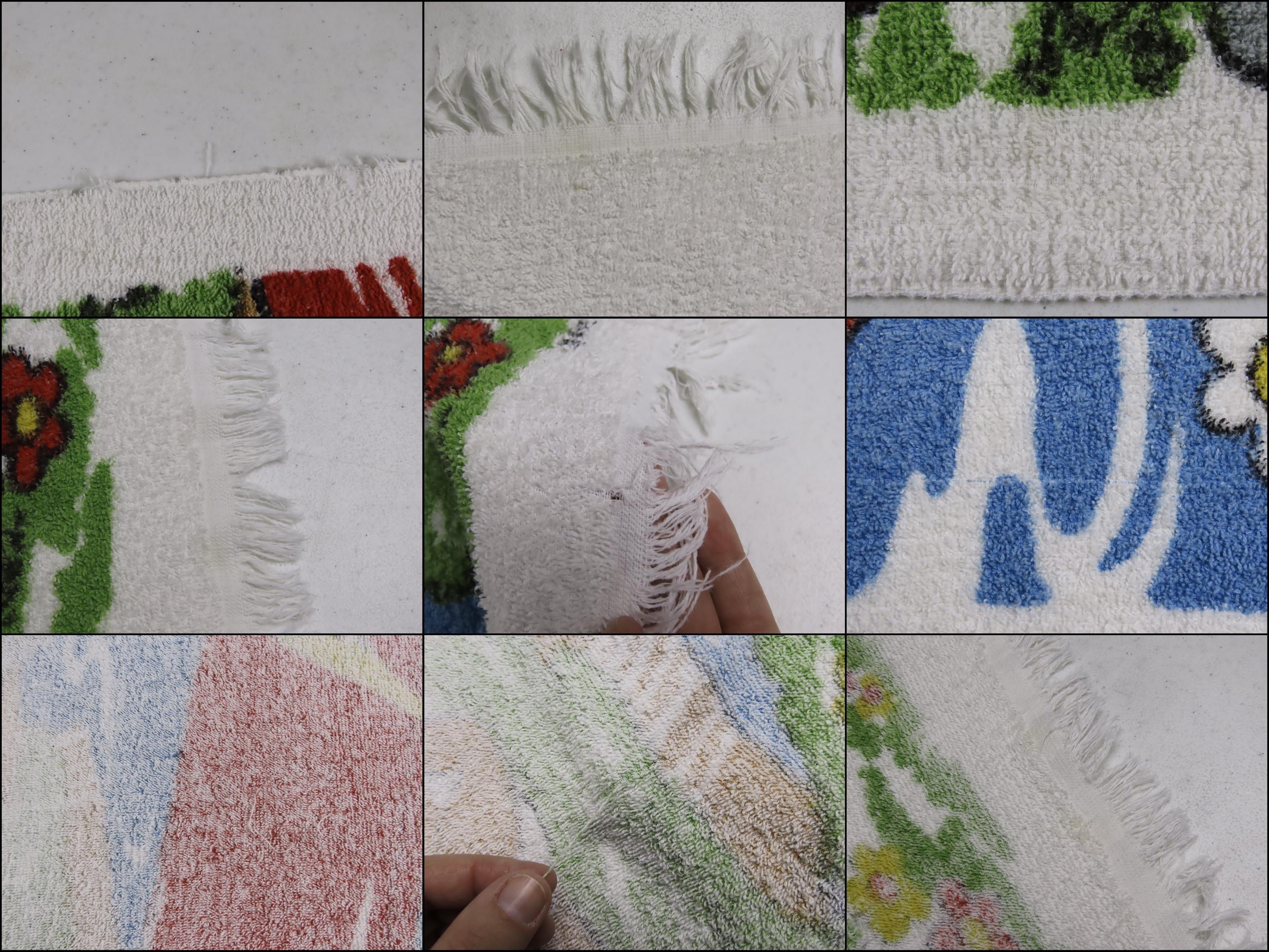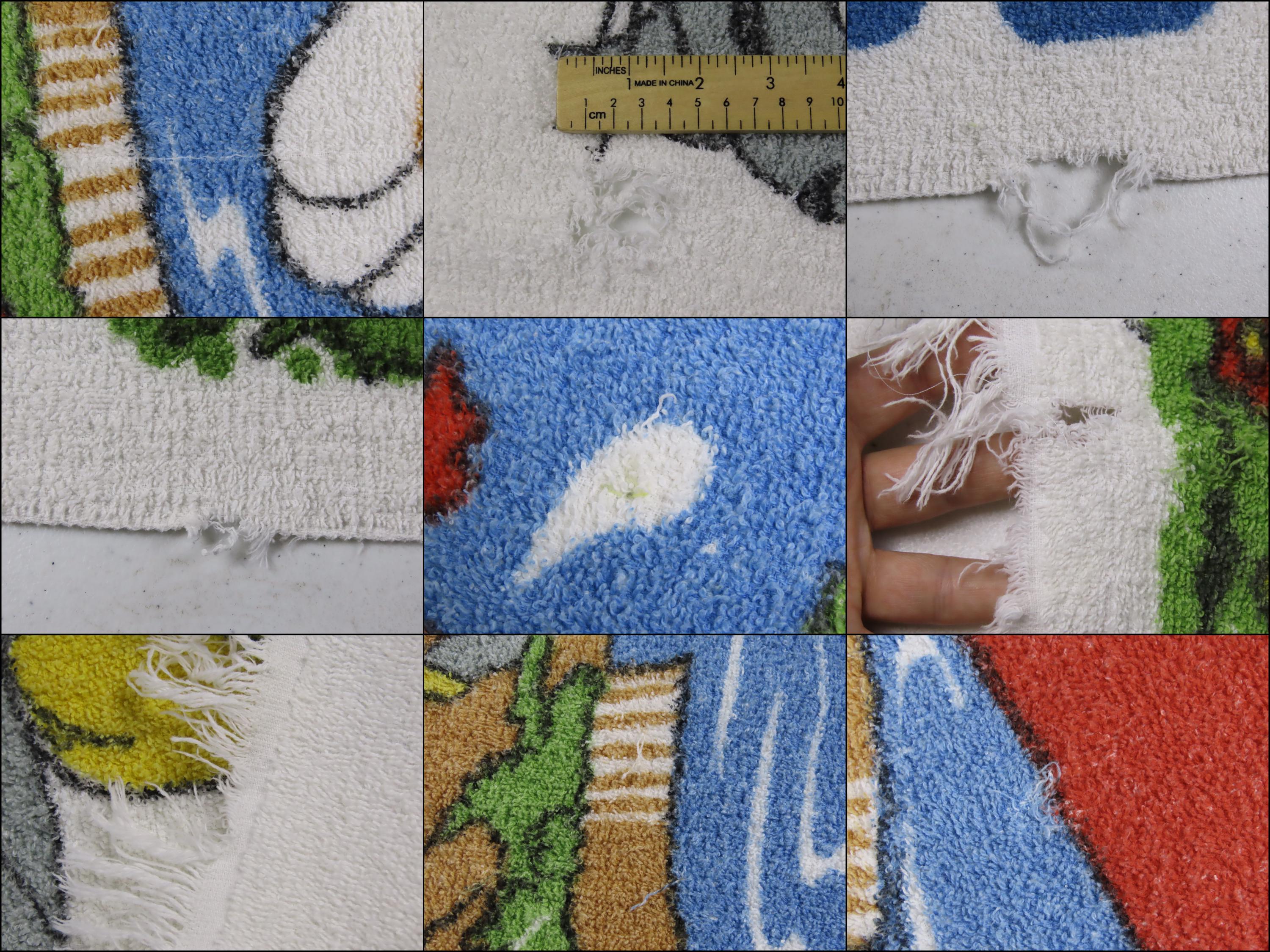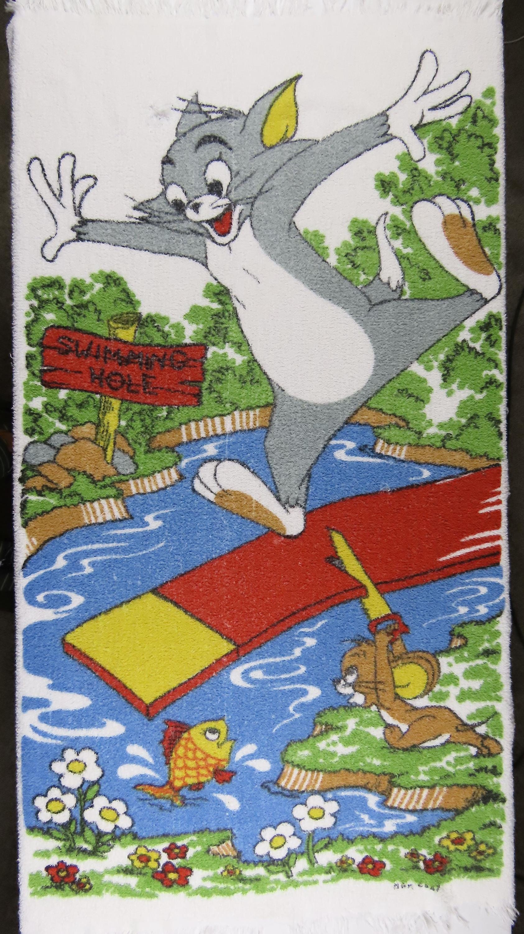 Vintage Tom and Jerry towel which is 100% cotton. It is about 57" tall by 33" wide (145 cm by 84 cm) which includes the decorative fringe on the ends. It is worn along the edges, and some of the fringe is missing/has been cut off. The colors are a little streaky in areas. There are some missing fiber spots, tears/unraveling along the edges, and multiple pulled/loose fibers. It has a few small holes, and a larger hole (near Tom's head).