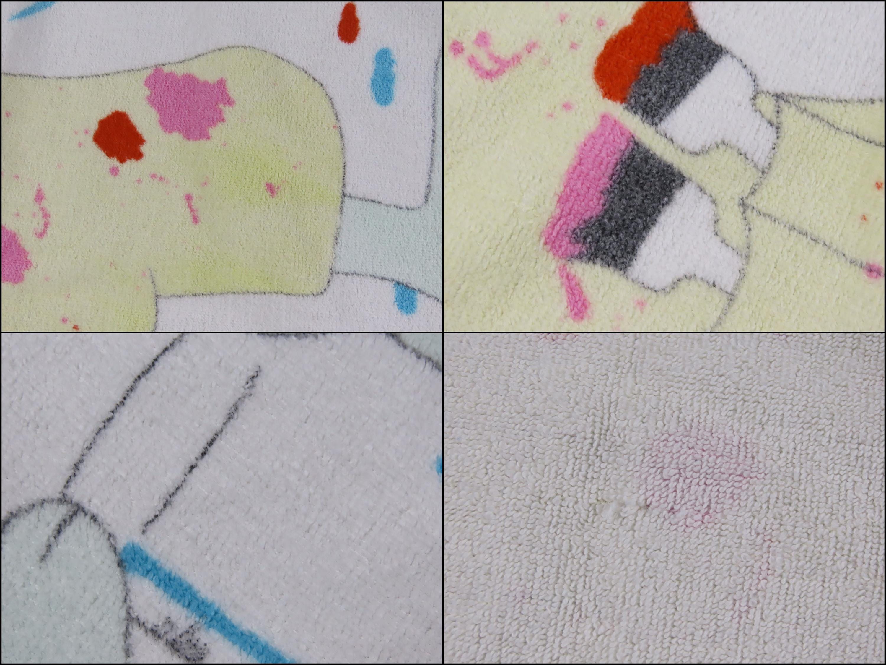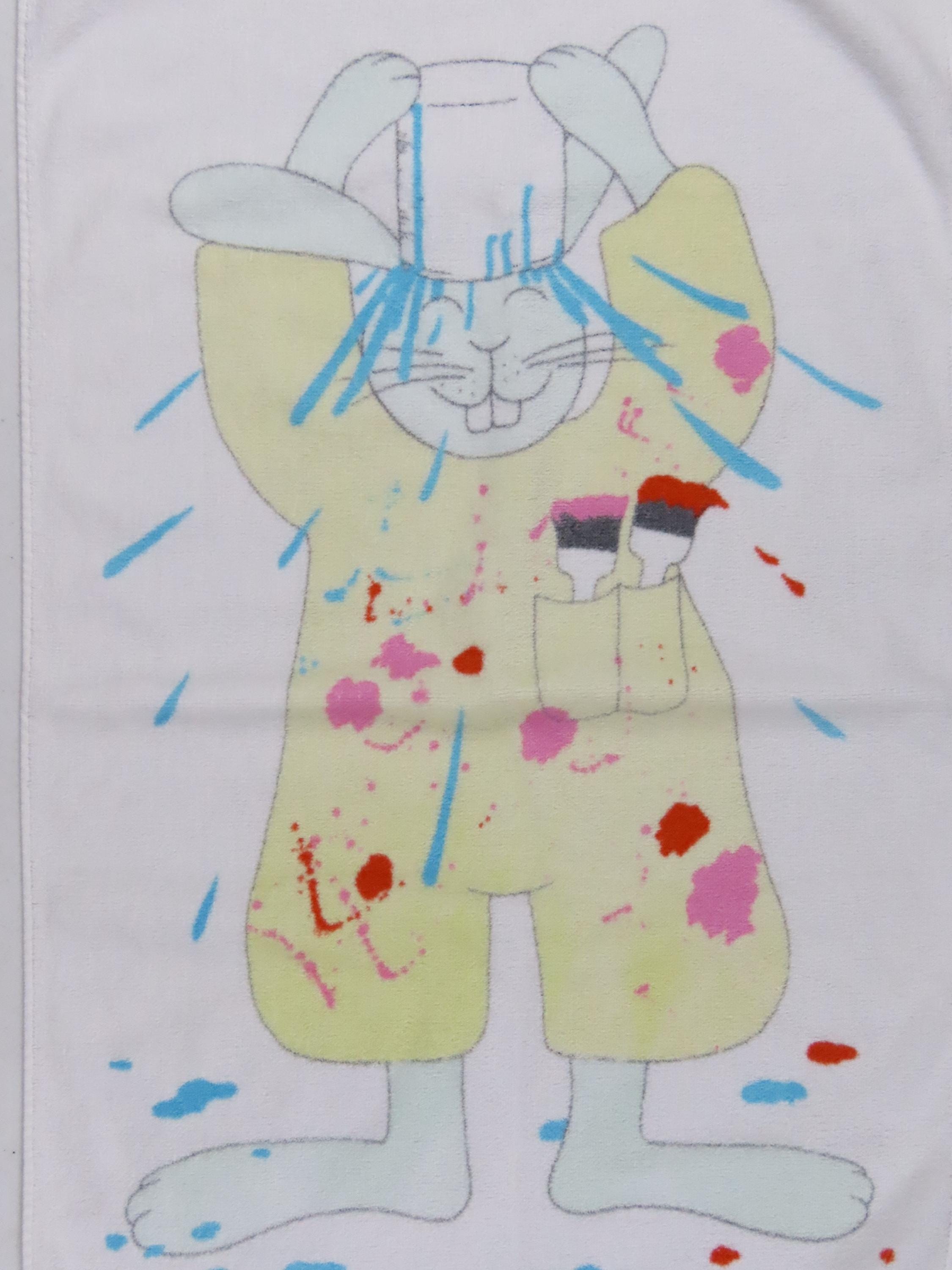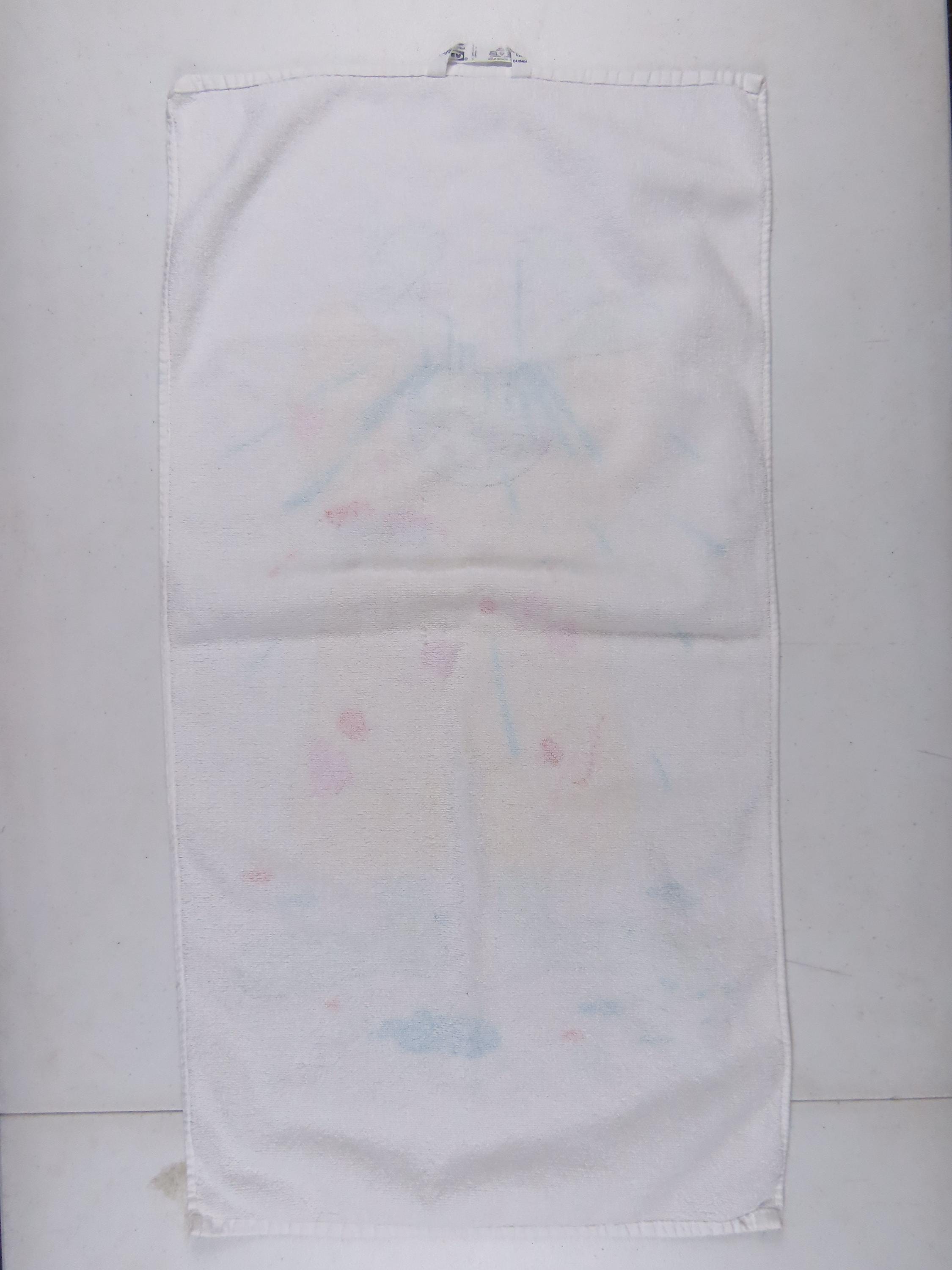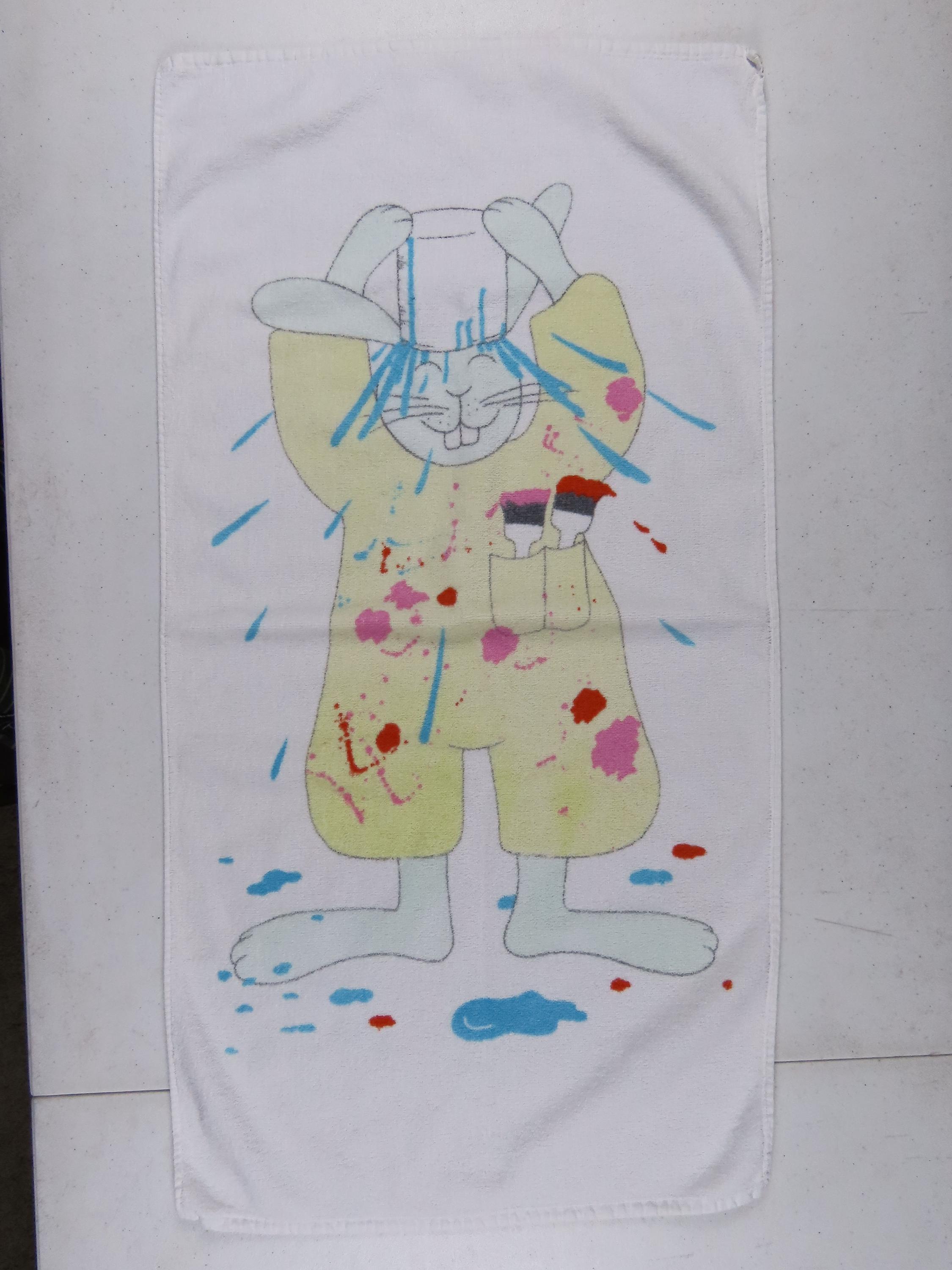 Vintage cute bunny towel by Ikea which is 100% cotton. It is about 35" tall by 18" wide (89 cm by 46 cm). The colors are faded, and it is worn along the edges. It does not want to lay completely flat, and it feels rougher to the touch in areas. It has some missing fiber spots, pulled/loose fibers, and it looks slightly discolored in areas.