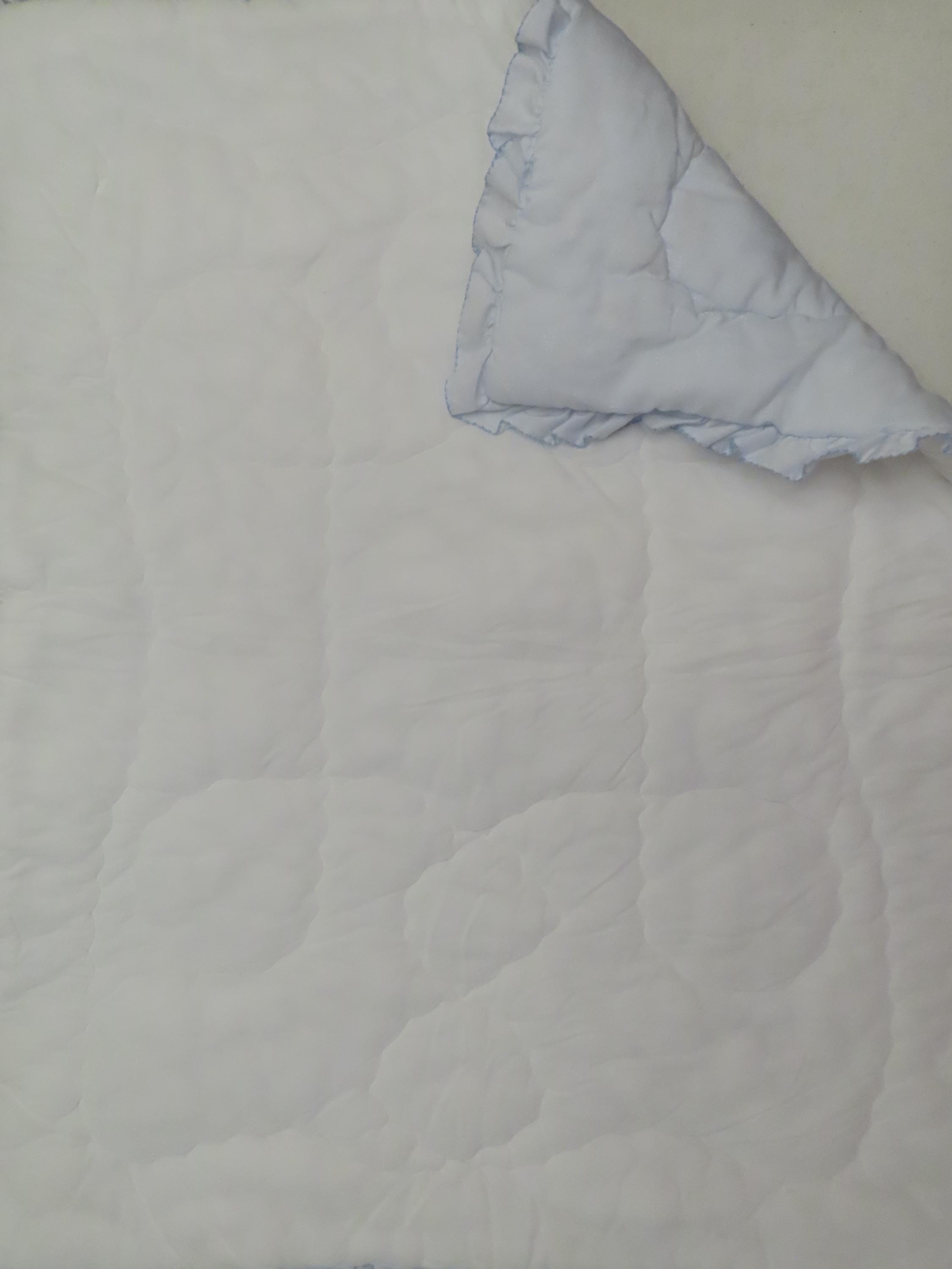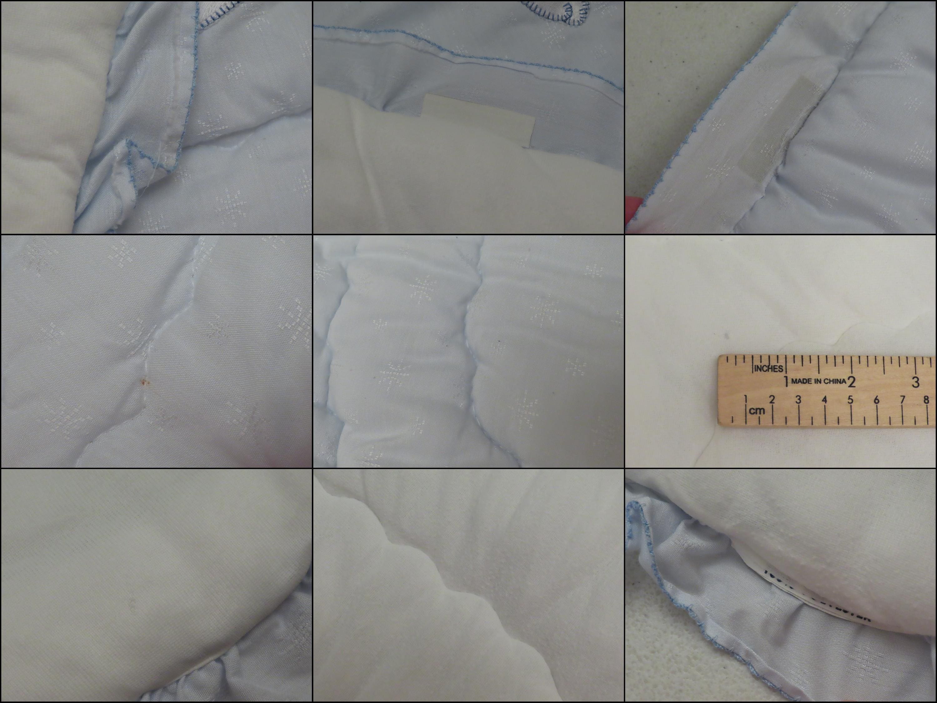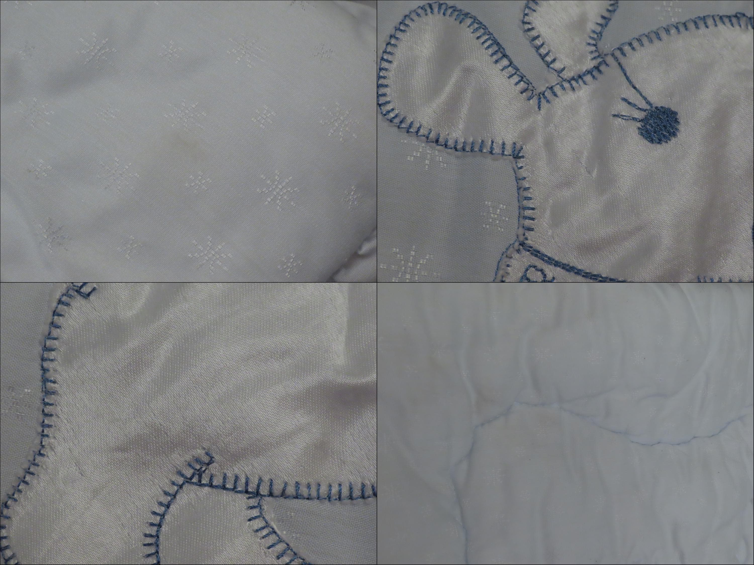 There are a few small stains, a larger light stain, and it is pilling in areas. It is fraying on the backside of the ruffled edge, and someone had sewn a patch on the ruffled edge (about 2 inches by 1 inch tall). It is pilling in areas, and there are thin spots on the white puppy applique.