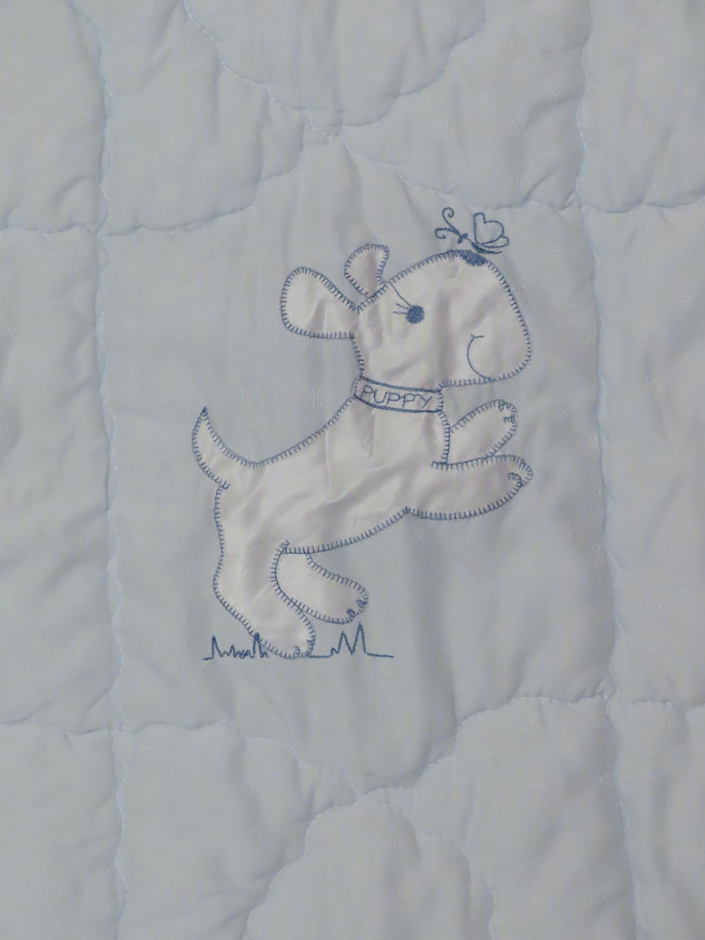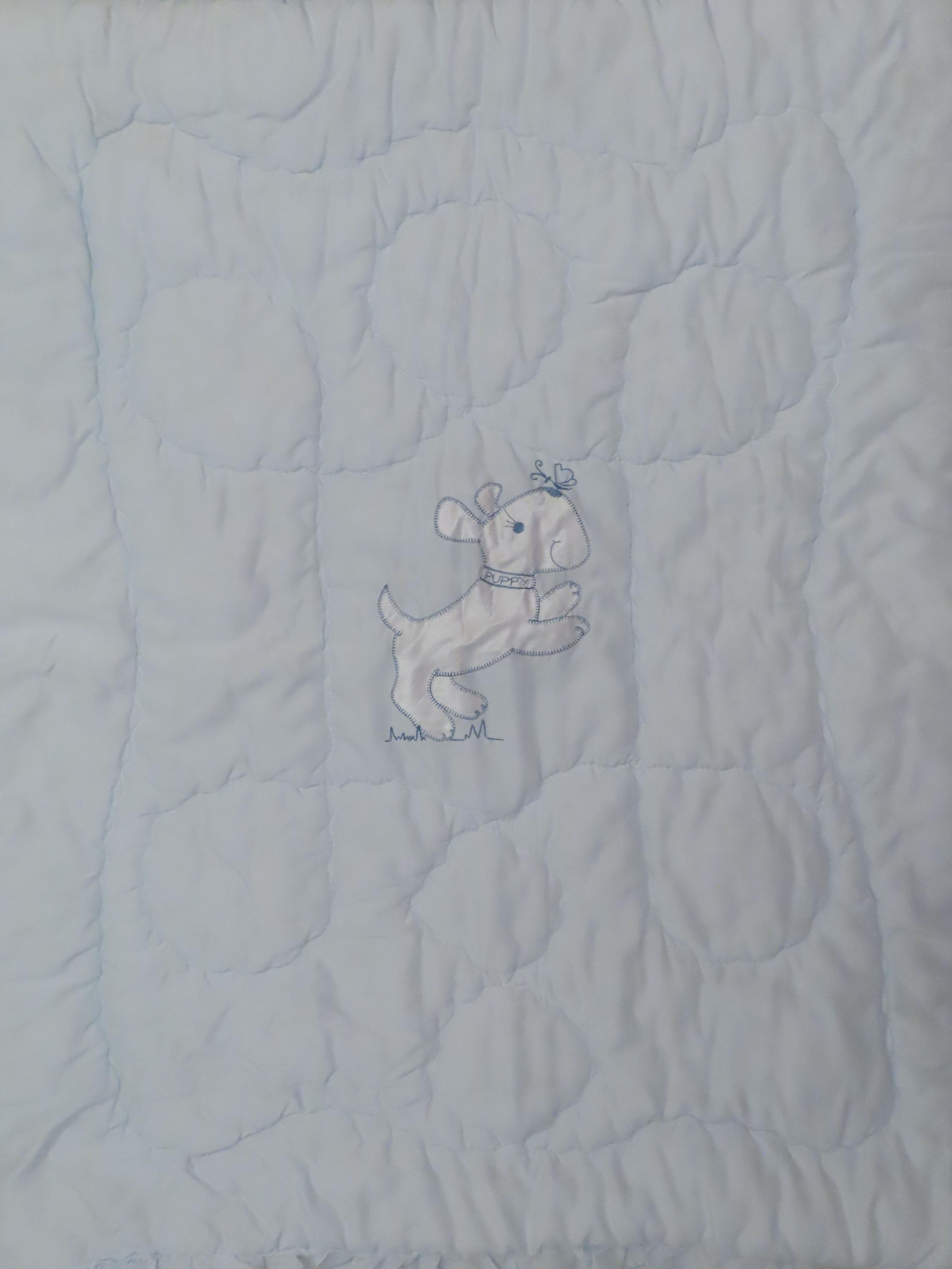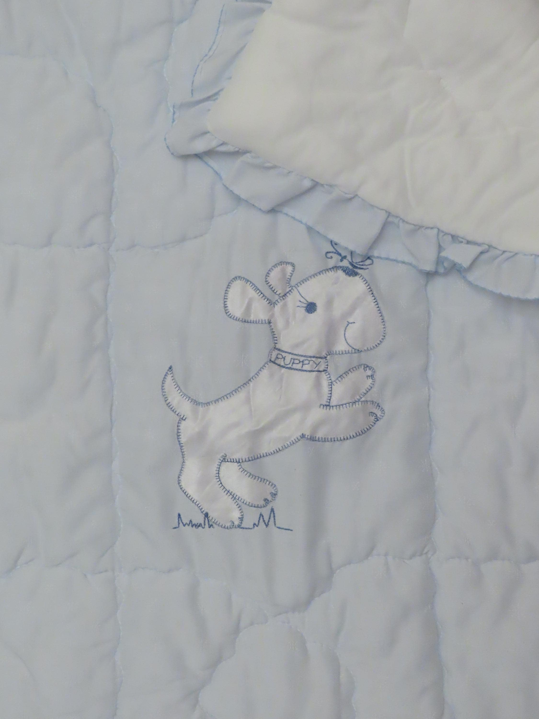 Vintage Cute Puppy crib comforter which is about 43" tall by 35" wide which includes the ruffled edge (110 cm by 90 cm). The filling has settled a little unevenly.