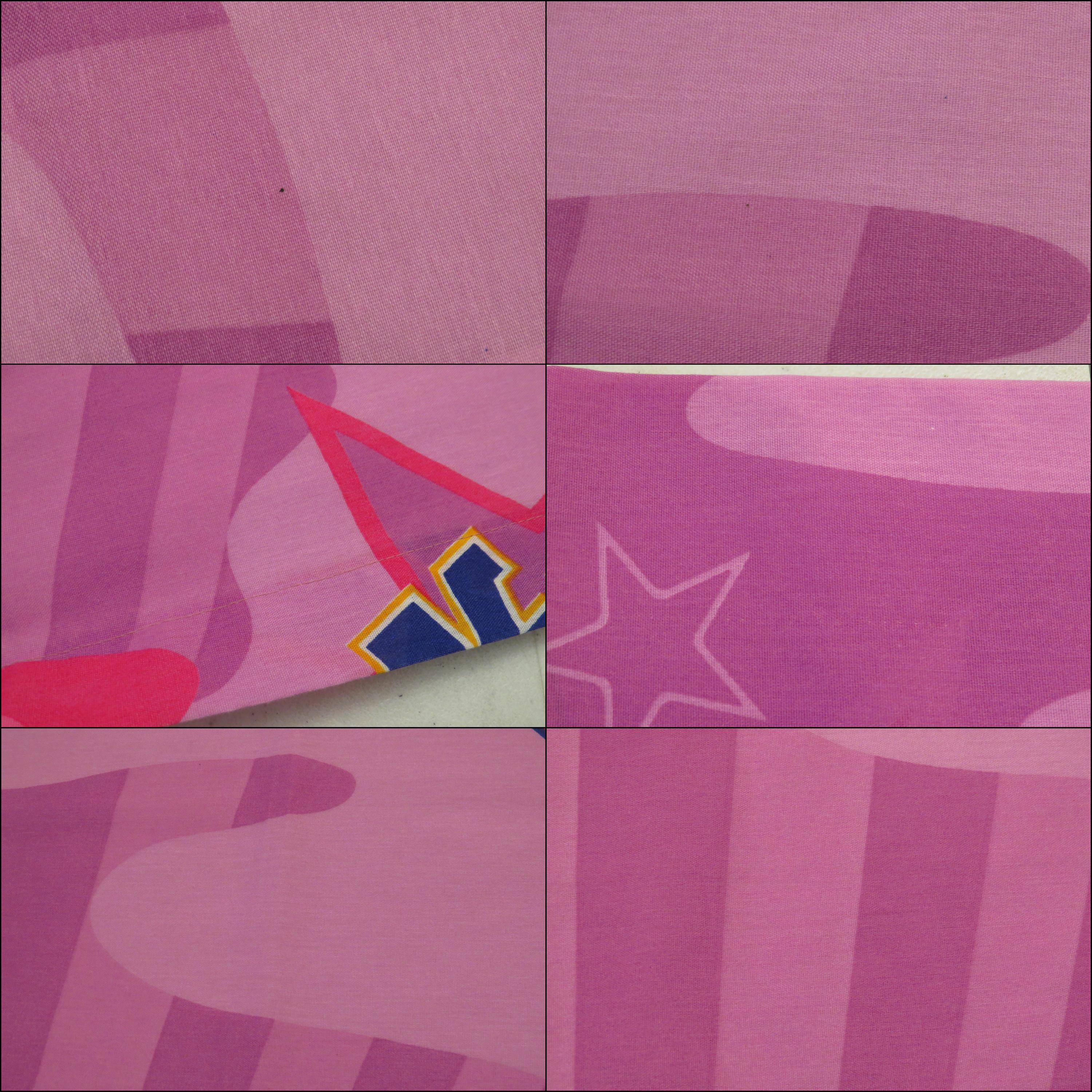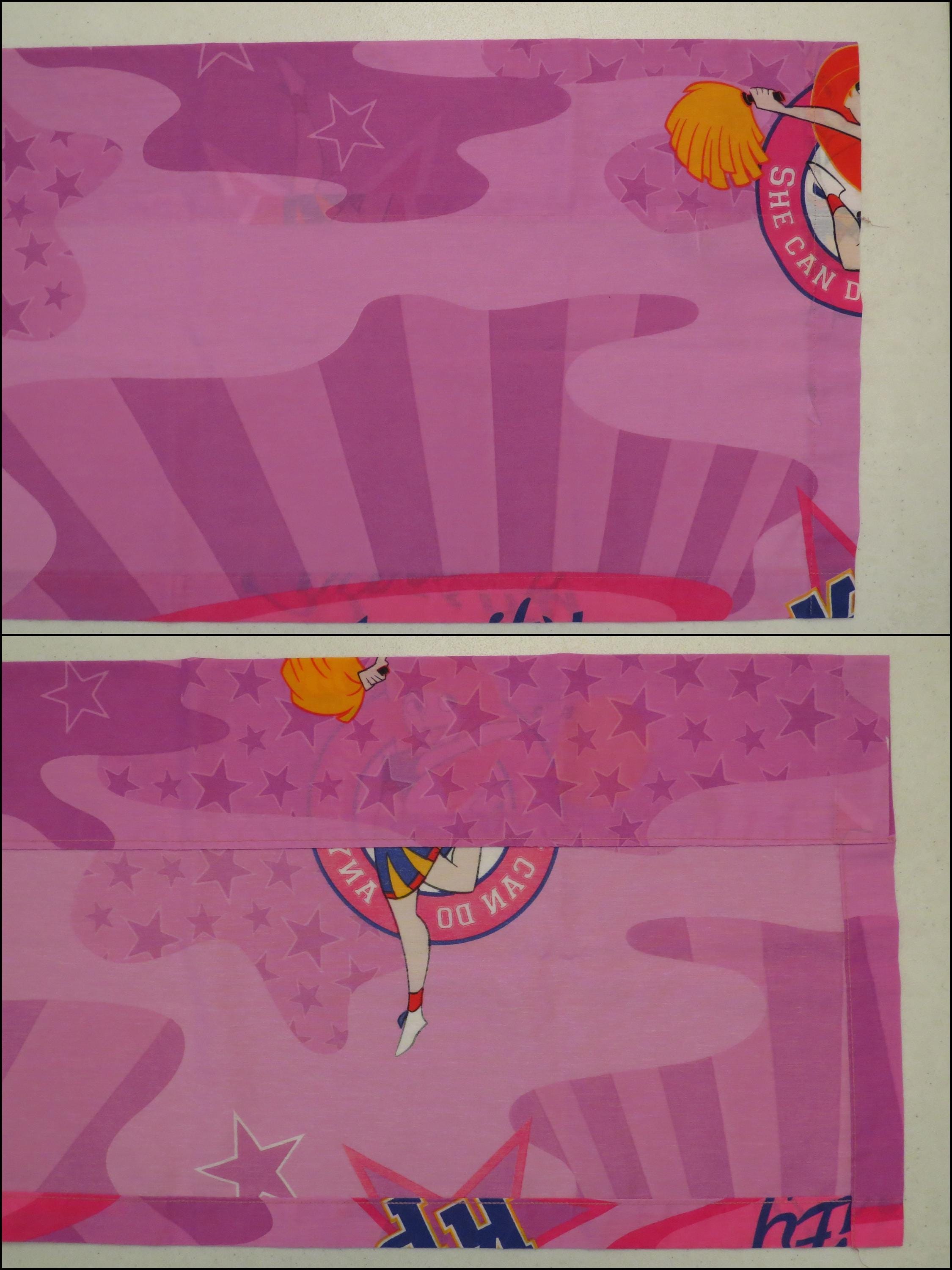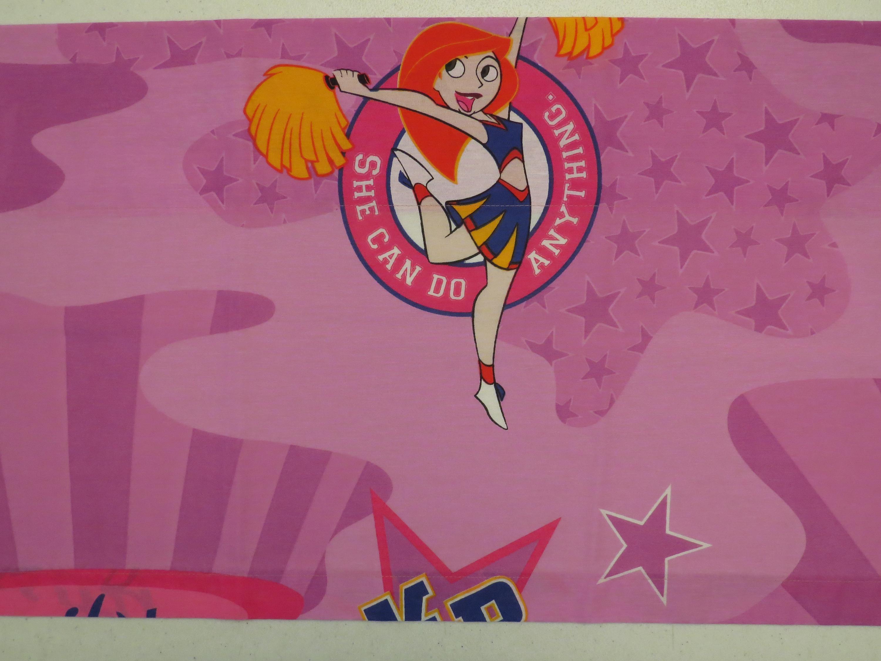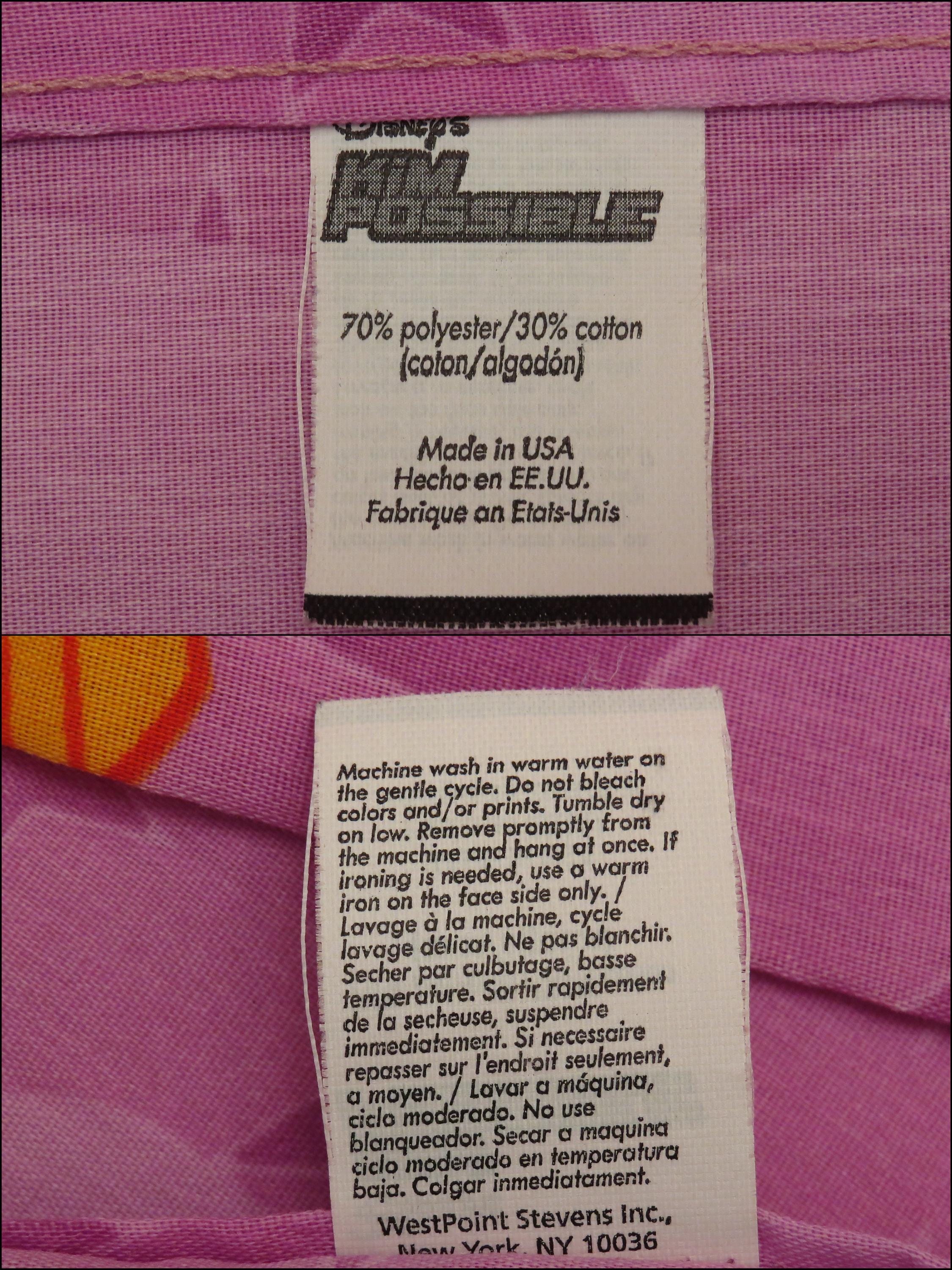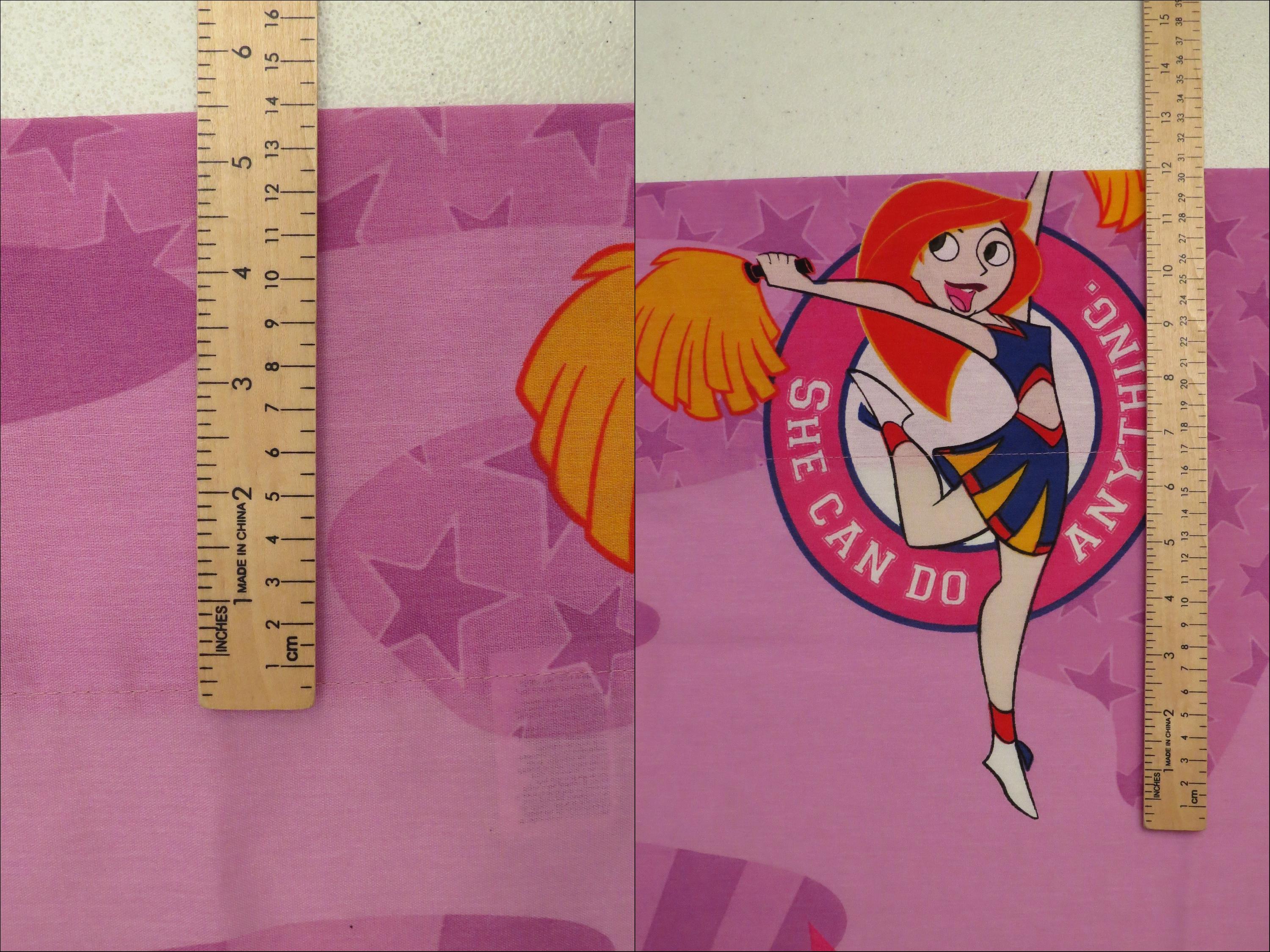 Vintage Kim Possible window valance which is 70% polyester and 30% cotton. It is about 84" long by 17.5" tall (212 cm by 444 cm). It is missing the the top line of stitching for the rod pocket. There are some tiny marks, tiny white marks, and thin spots. There are minor blemishes in the color, a few vertical light fold/crease lines, and it is a little worn along the edges/stitching.