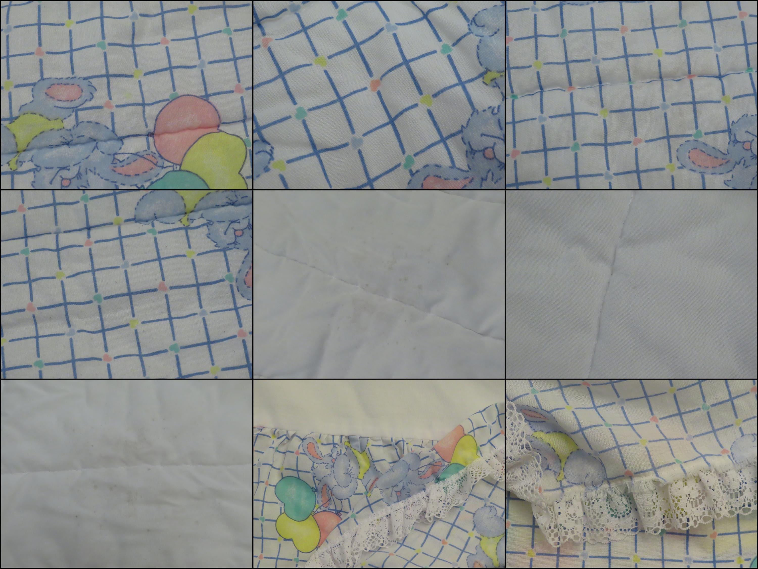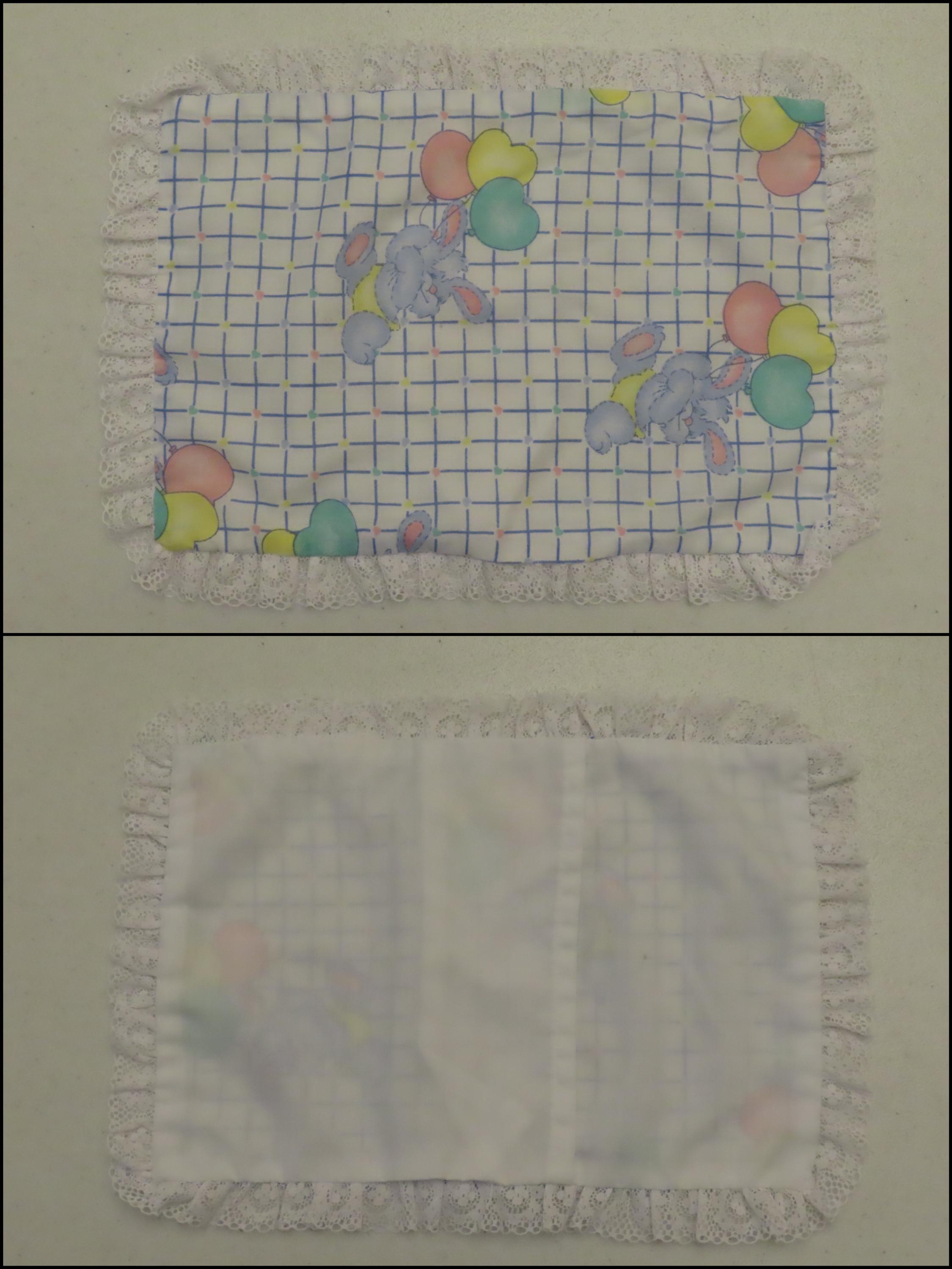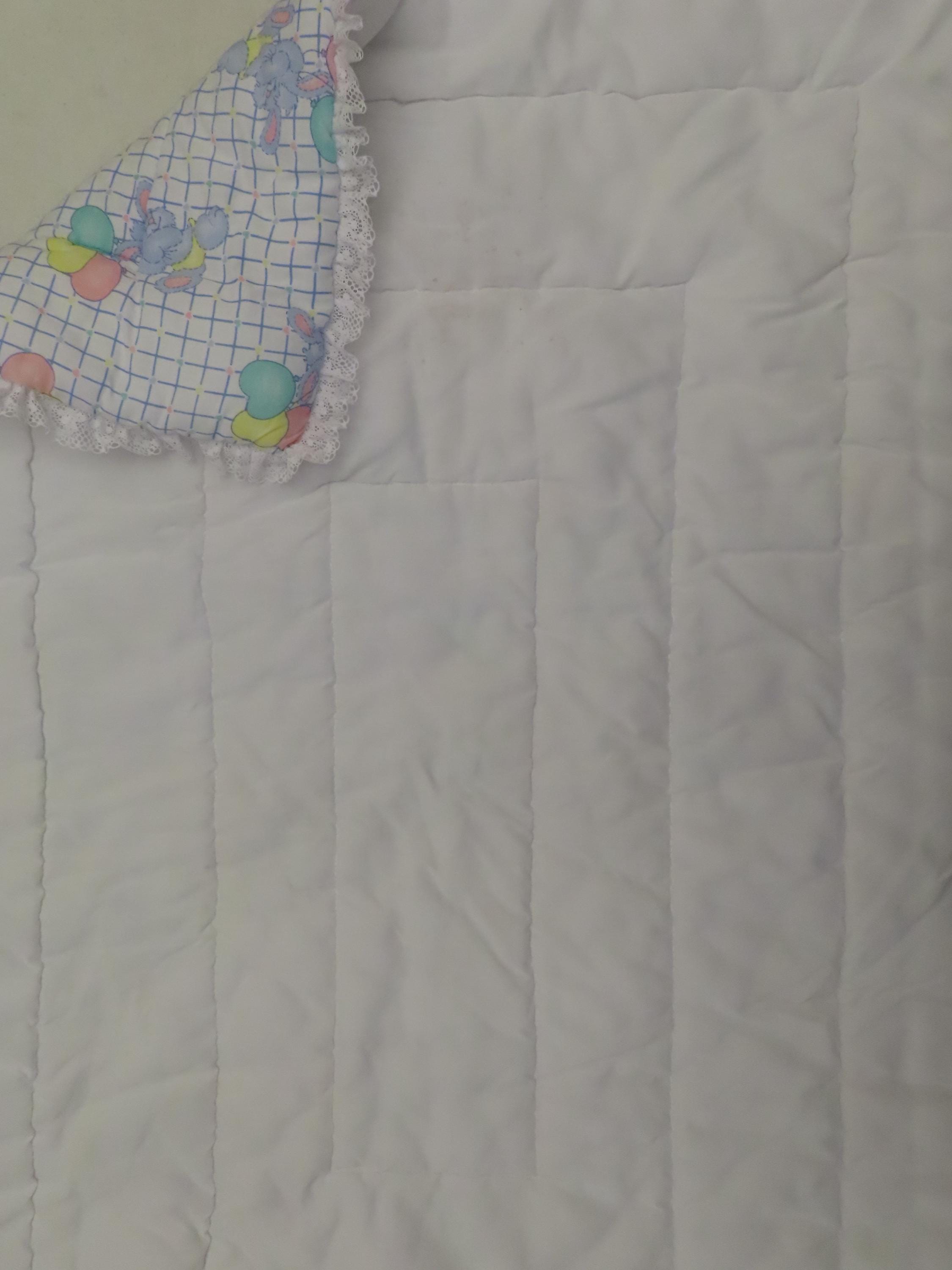 The crib comforter is about 41" tall by 32" wide (129 cm by 81 cm) which also has a 1" decorative lace border (2.5 cm). The front side has a small stain, a tiny stain, and a light stain cluster. It is pilling, and it looks slightly discolored towards the middle. The backside has a large stain cluster, a small mark, and light pilling in areas. It looks slightly discolored in areas as well.