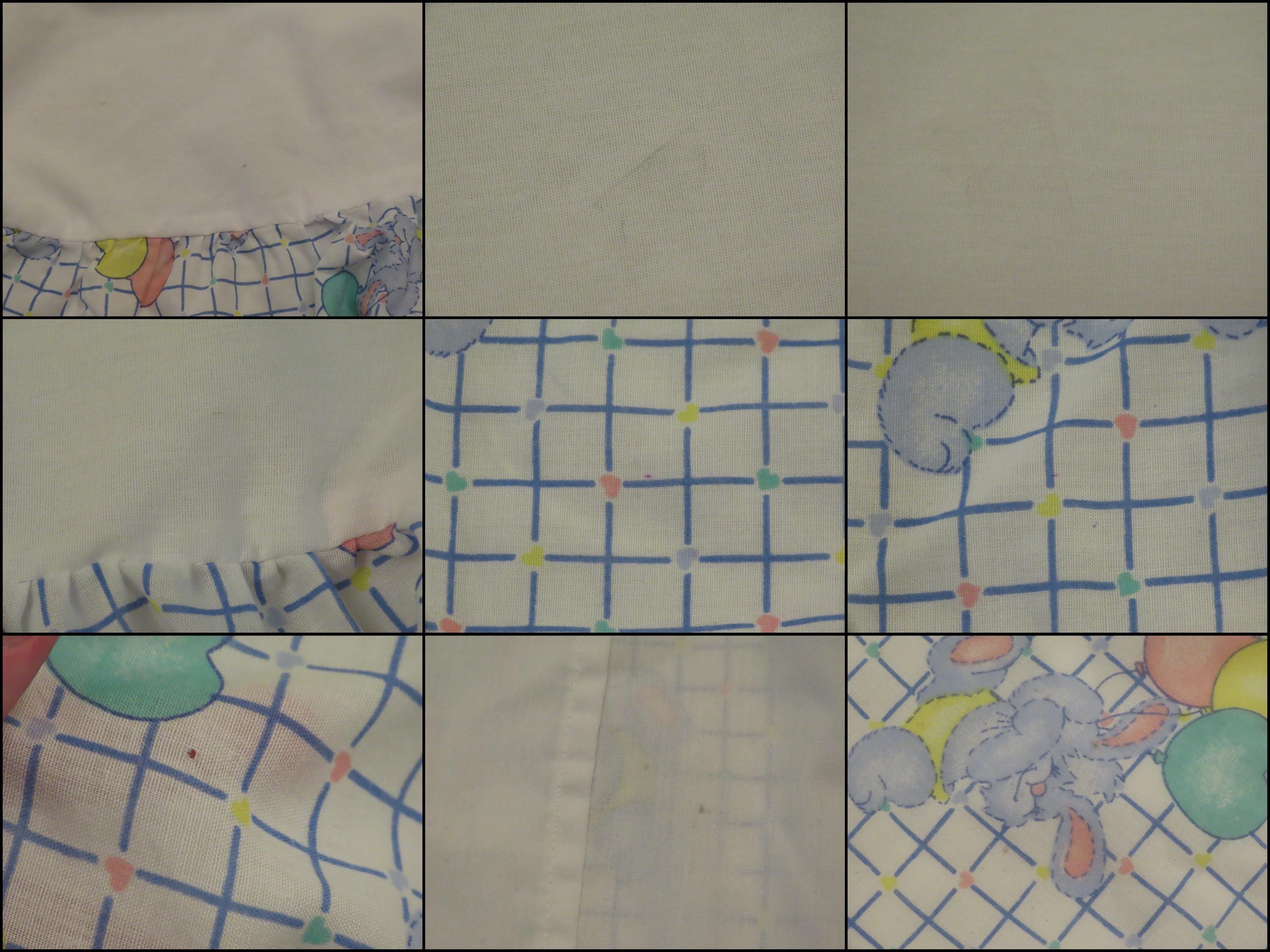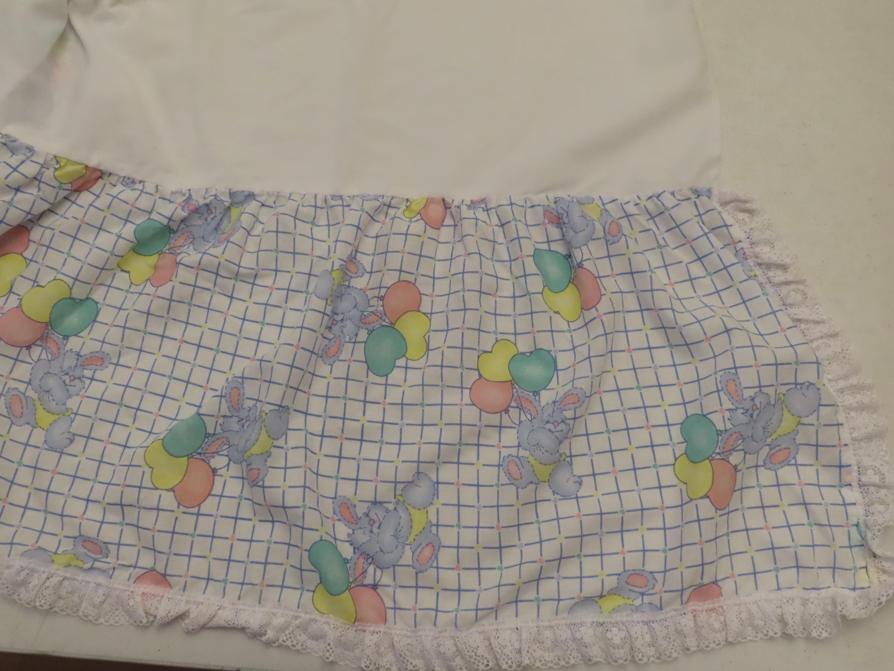 The dust ruffle only has the ruffled drop on the two long sides of the platform. The drop is about 15" tall (38 cm) including the lace trim. The white platform has thin spots, a few small stains, and a couple larger light stains. The bunny print drop has a tiny stain, some tiny marks, and a tiny hole. It is faded in areas, but more towards the bottom edge.
