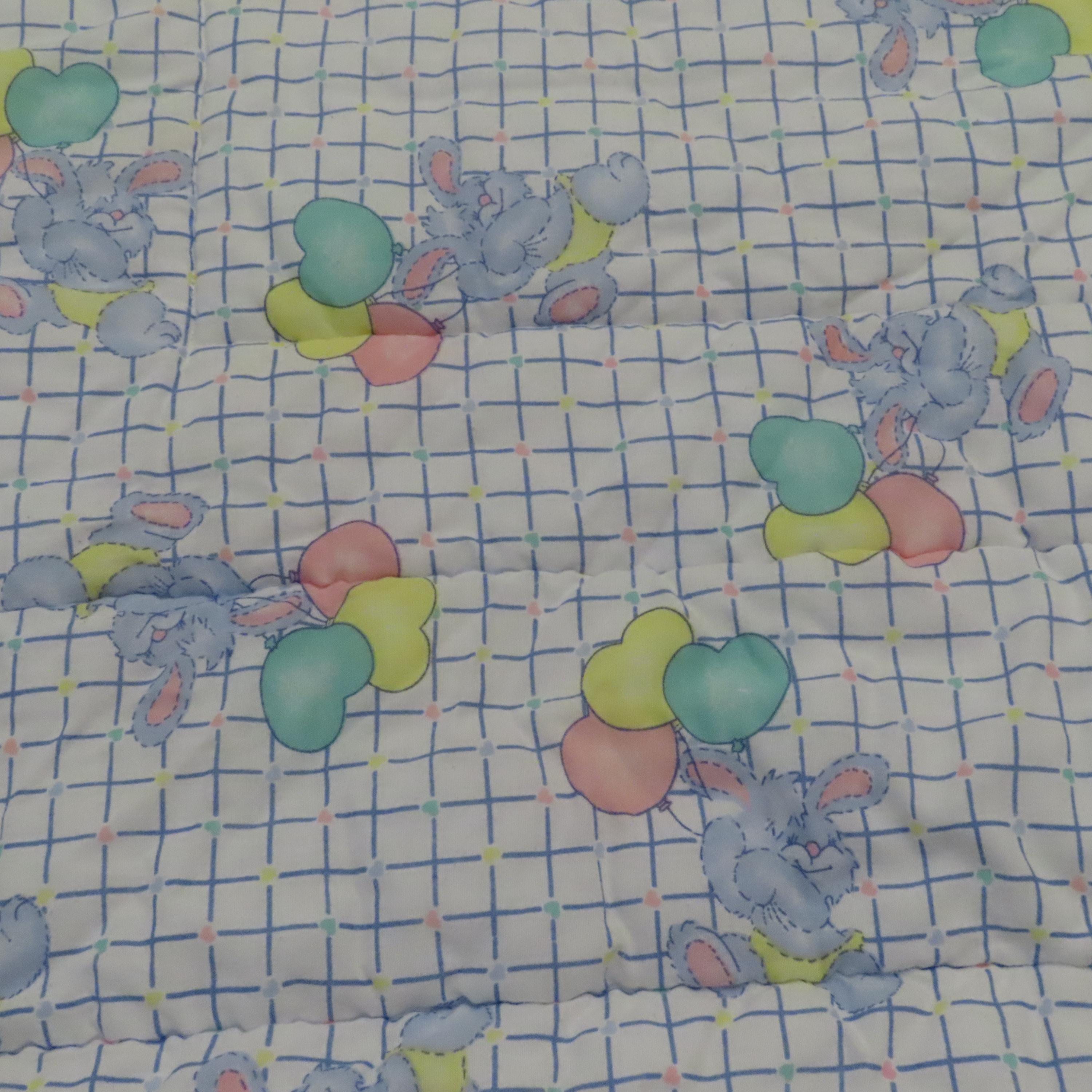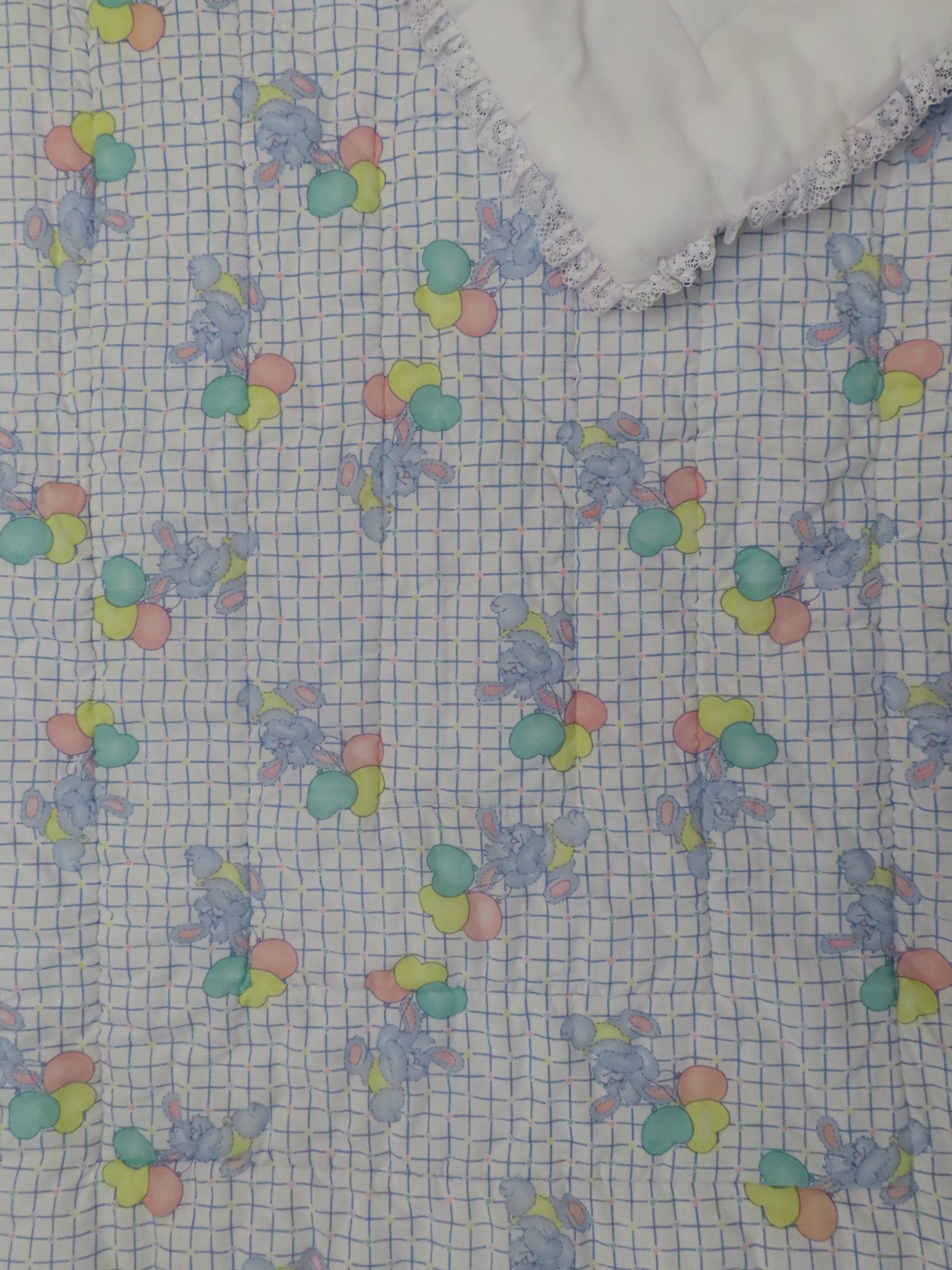 Vintage Cute Blue Bunny 4 piece crib set which includes the comforter, dust ruffle, diaper stacker, and small pillow sham. My camera had a hard time picking up the exact colors.