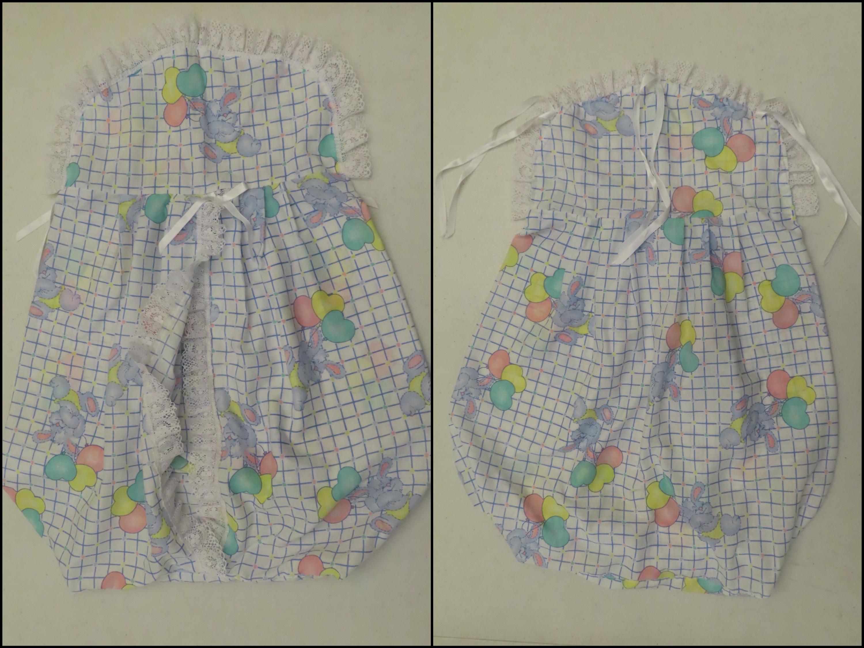 The diaper stacker is about 26" tall (66 cm) including the lace trim at the top. The bottom rectangle is about 13" by 9" (33 cm by 23 cm). It is fraying on an inside seam, as well as the ends of the ribbon ties. It has a thread snag, and it is a little faded in areas. It does not have an insert for the bottom.