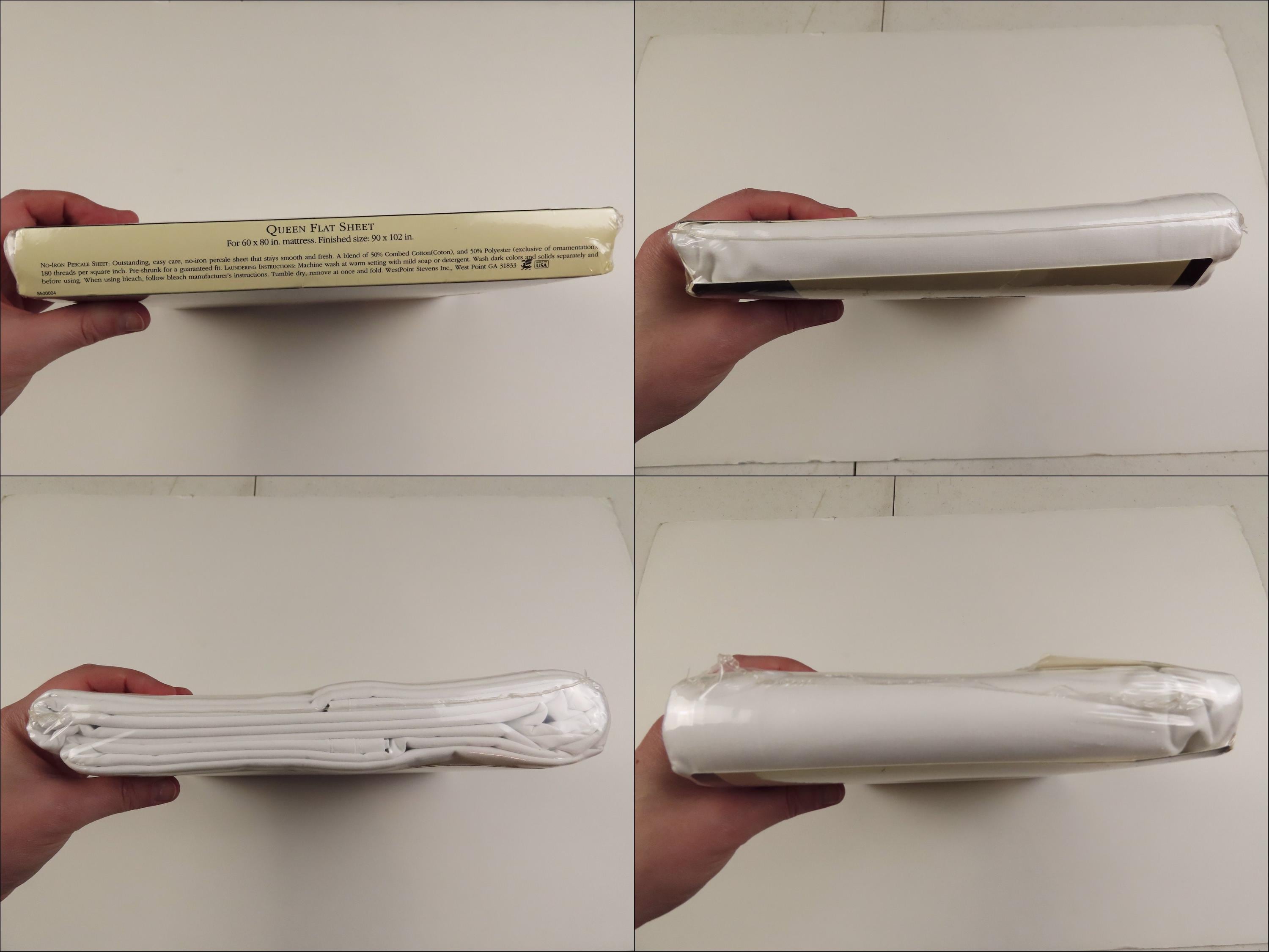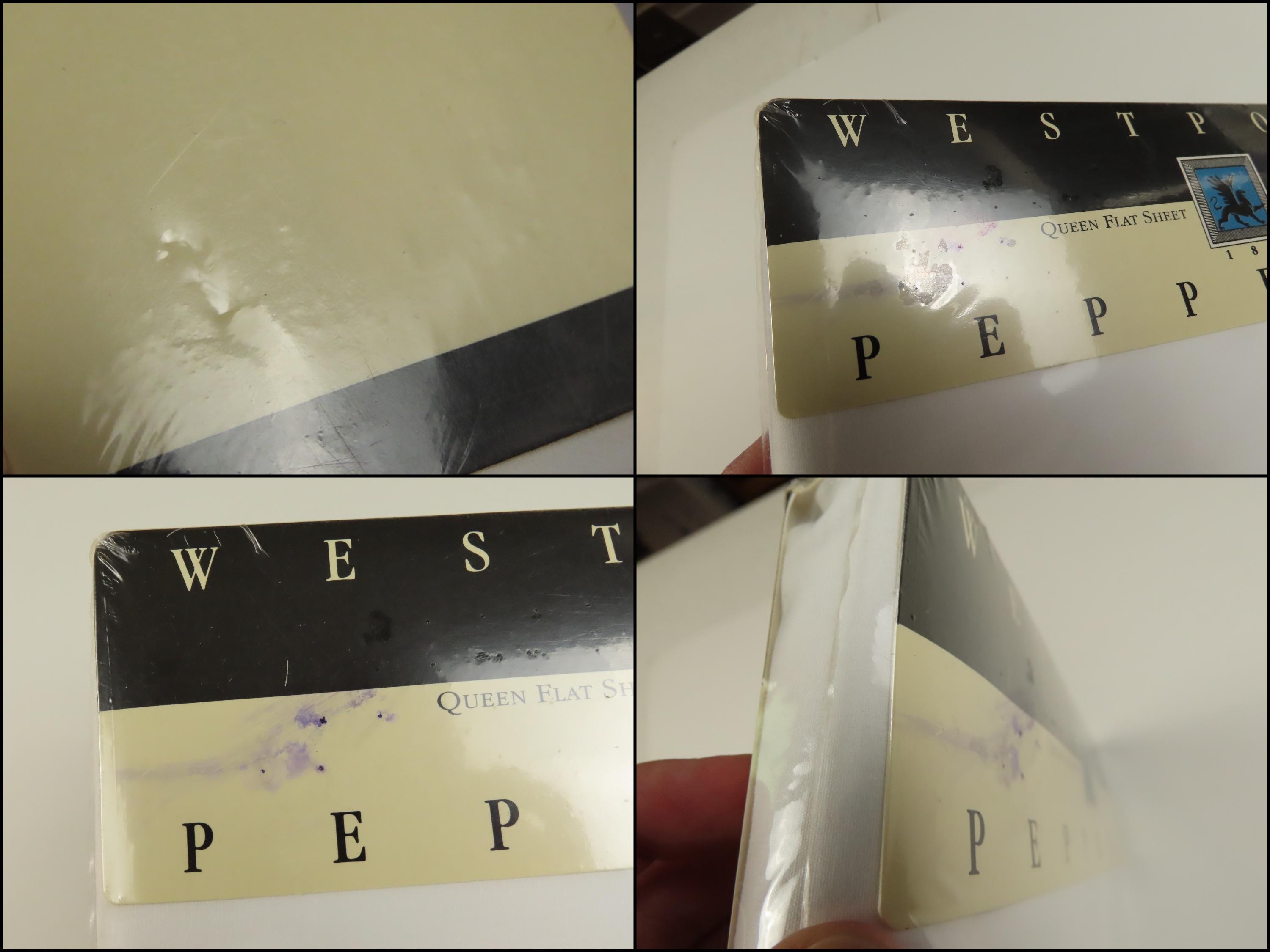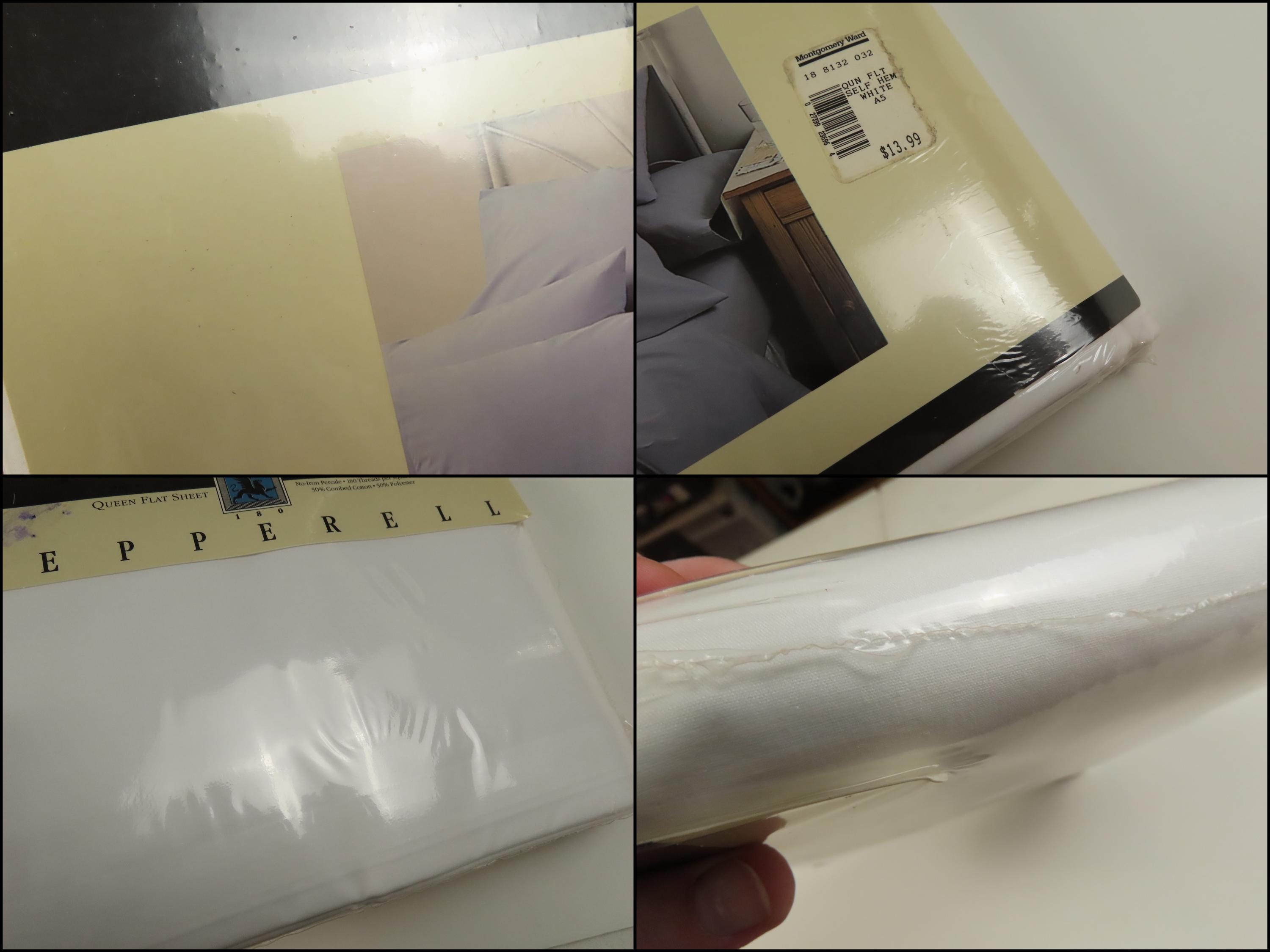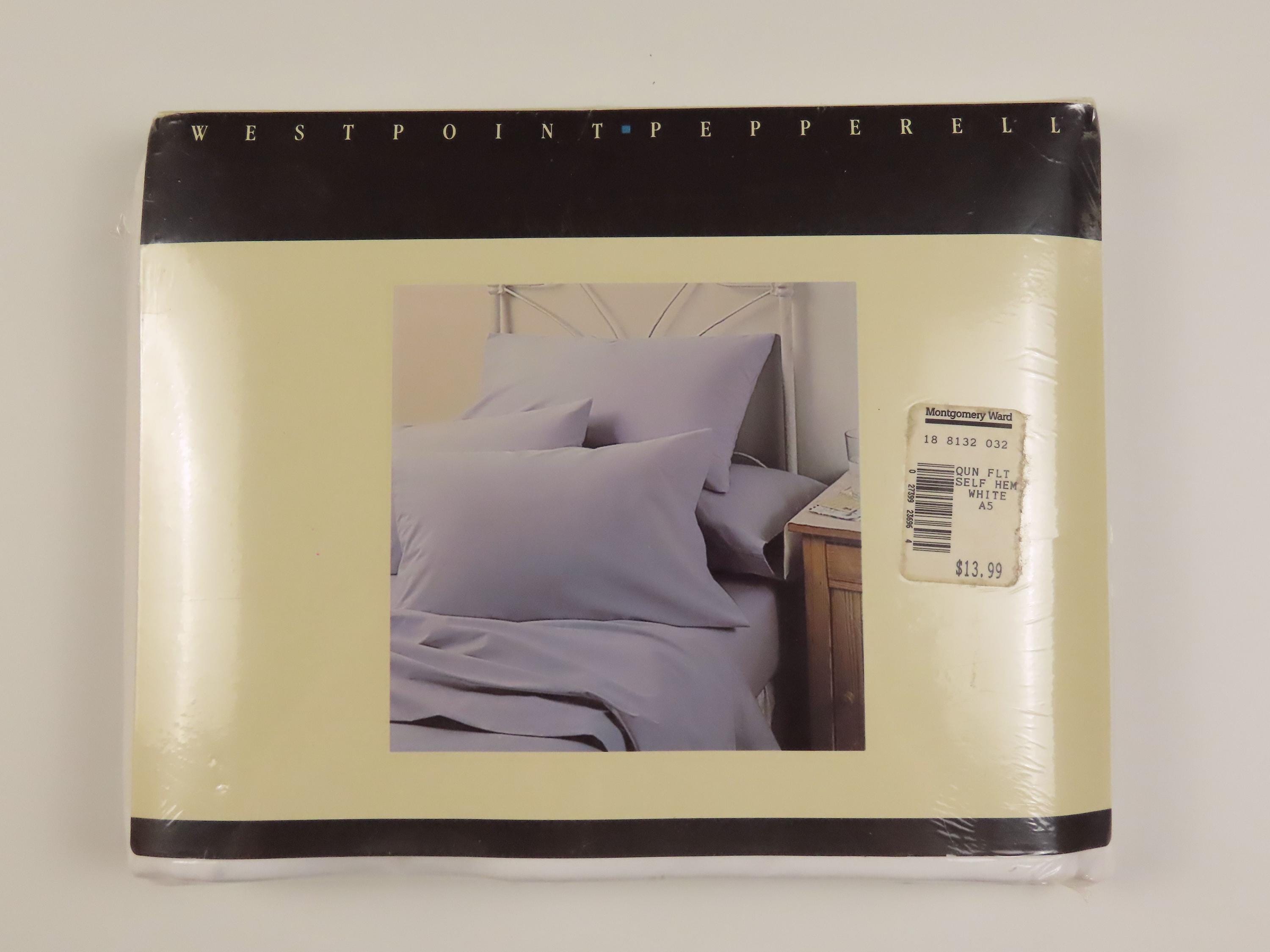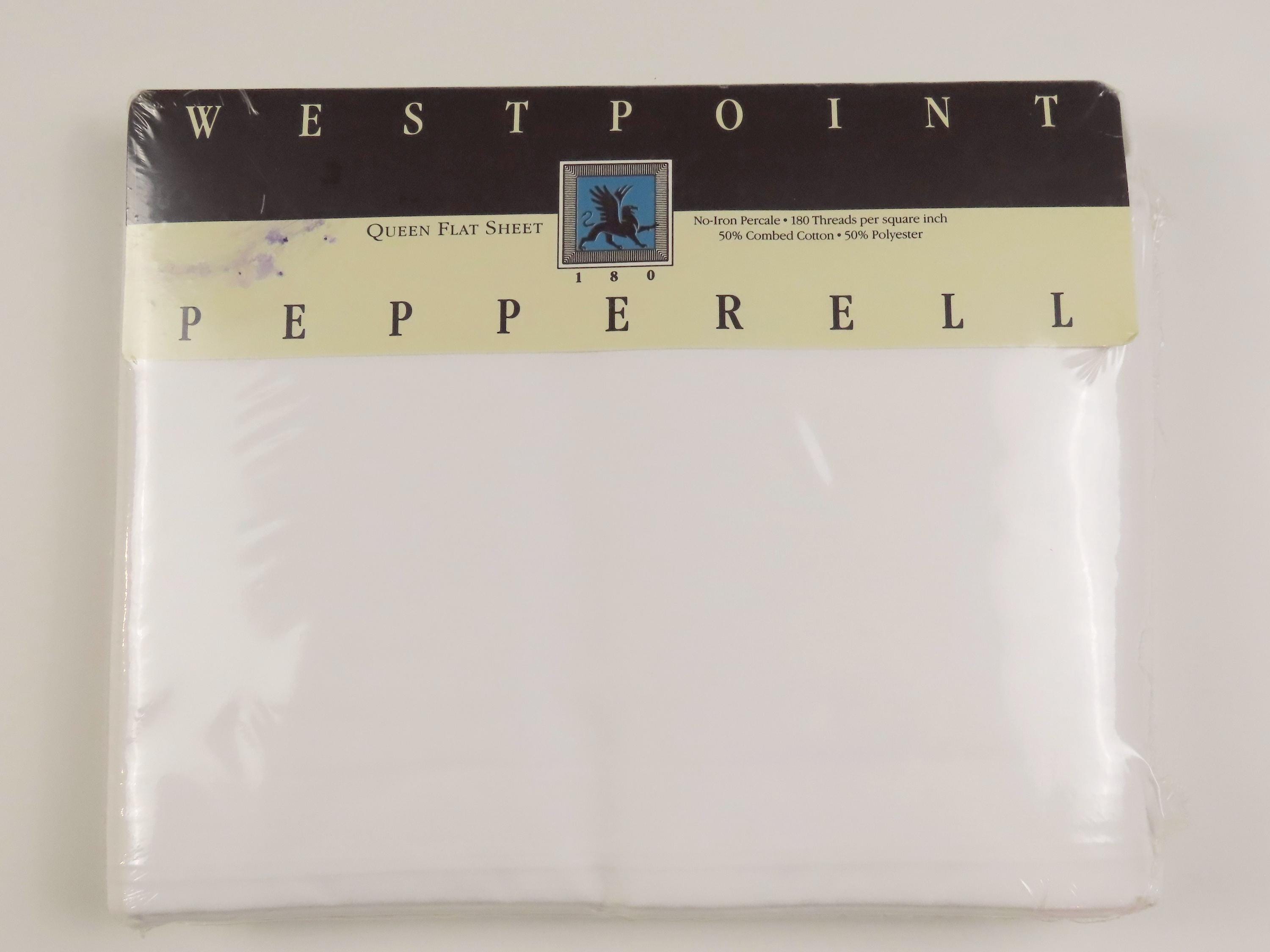Vintage WestPoint Pepperell solid white queen sized flat sheet which is new in the package. It is 50% cotton and 50% polyester with a 180 thread count. The plastic packaging is worn. The plastic has a small hole, and some scratches. There is some dust/debris inside the packaging, and the cardboard insert has dents.