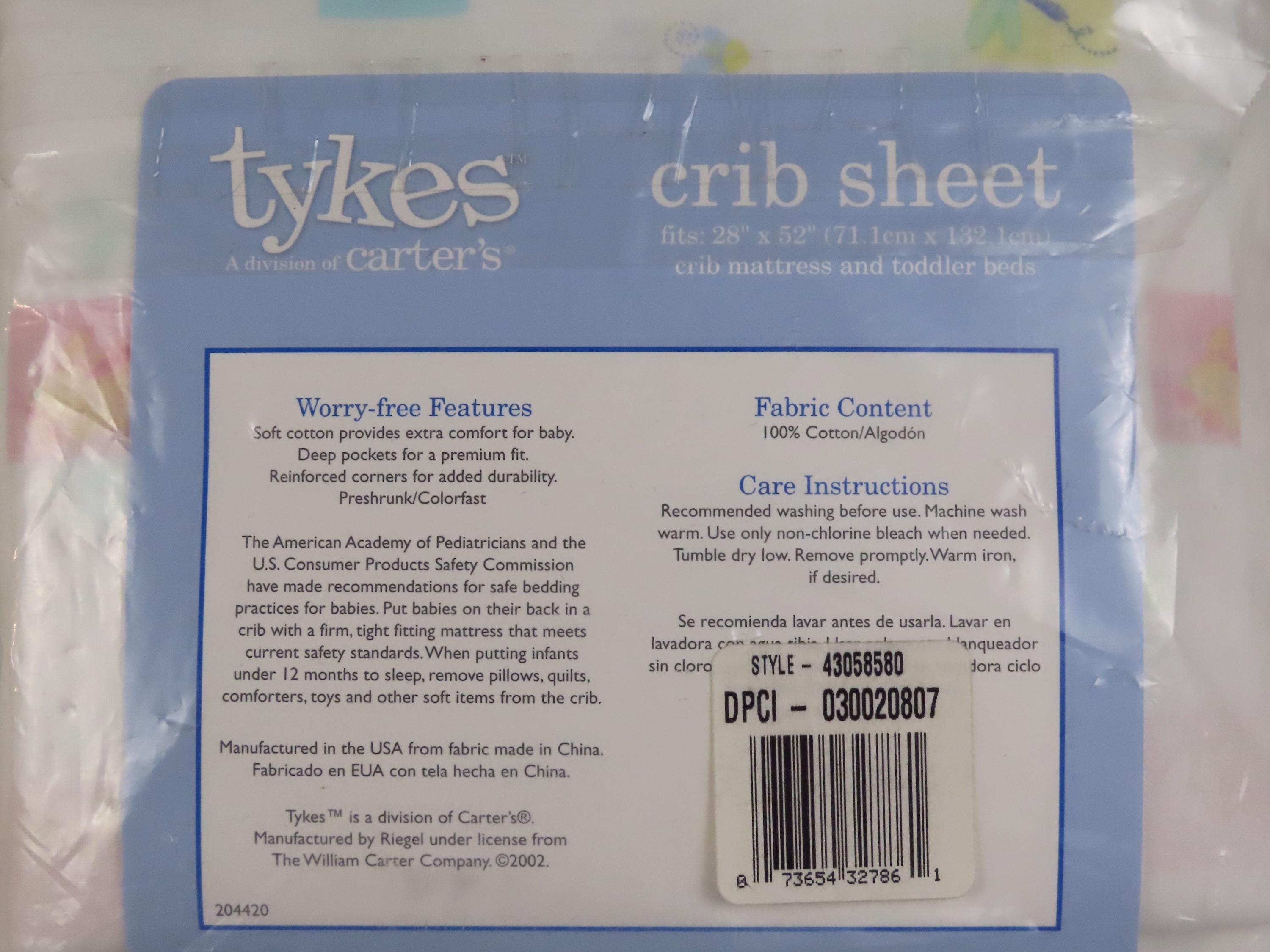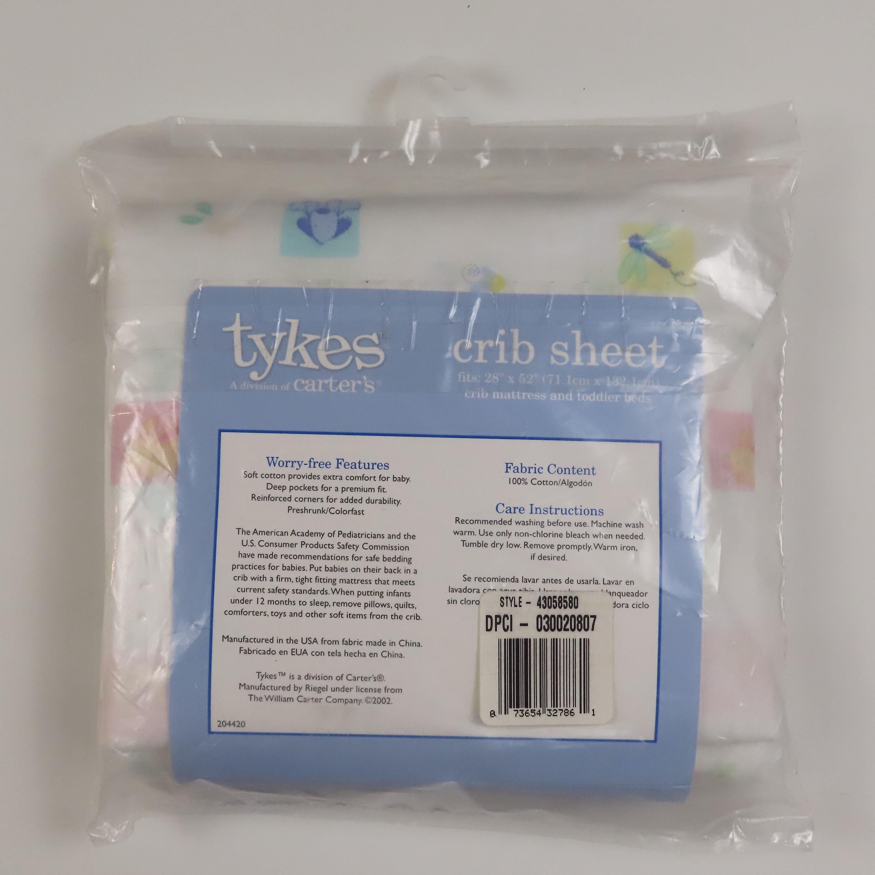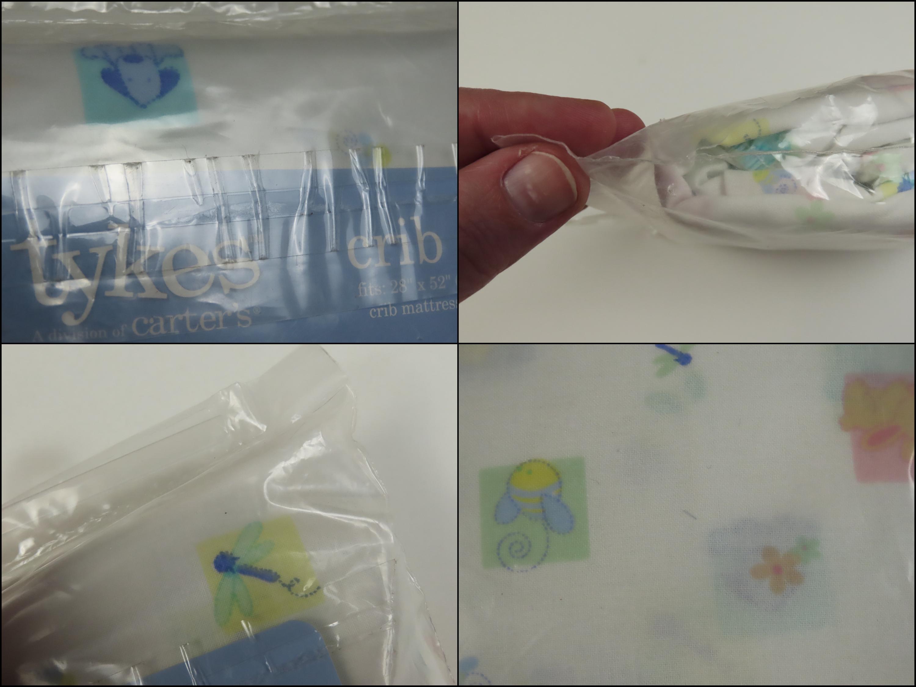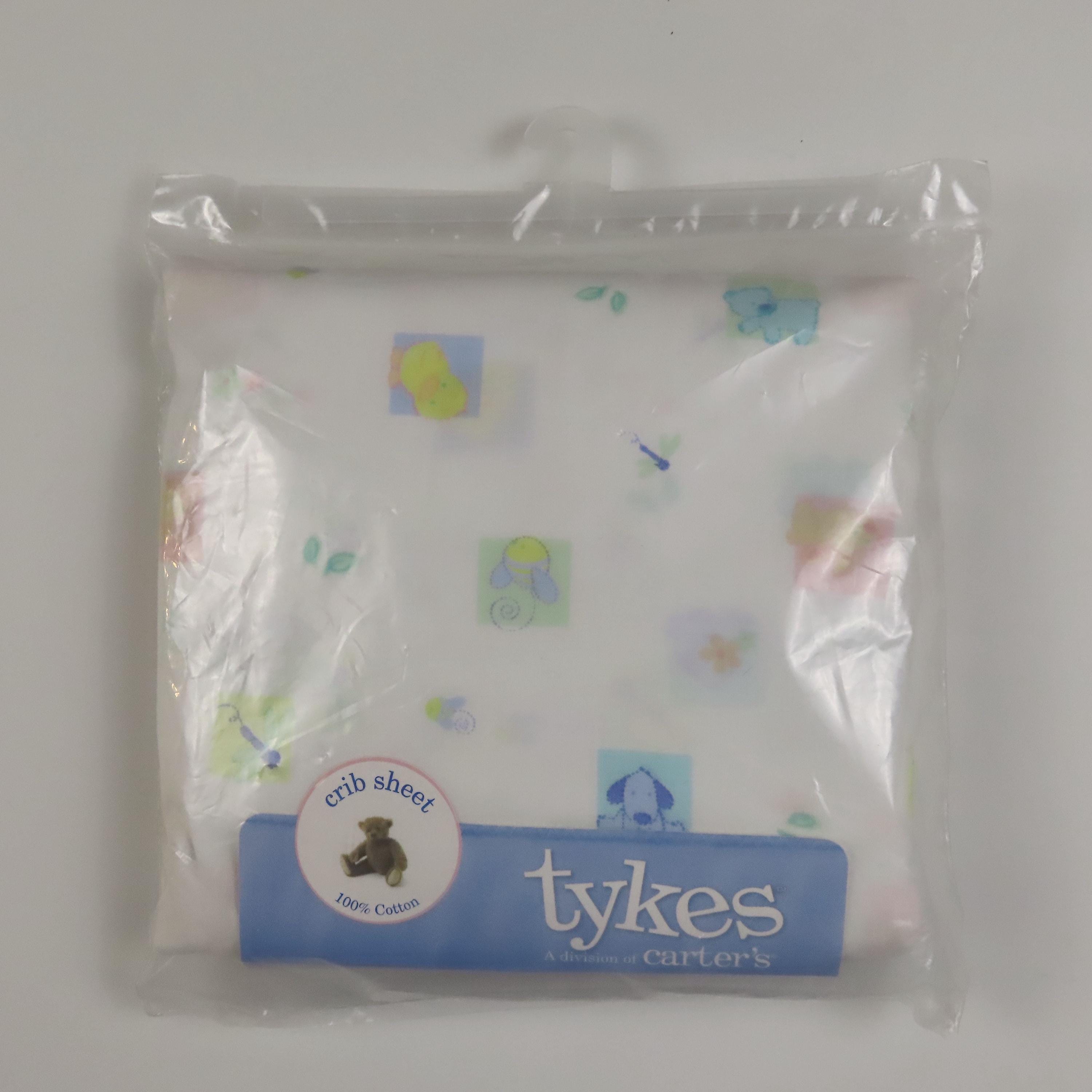 Vintage Carter's "Tykes" crib fitted sheet which is new in the package. It is 100% cotton and has deep pockets. The plastic packaging is worn with small/tiny holes, and scratches. There is some loose dust/debris inside the packaging, which looks like pieces of the cardboard insert.