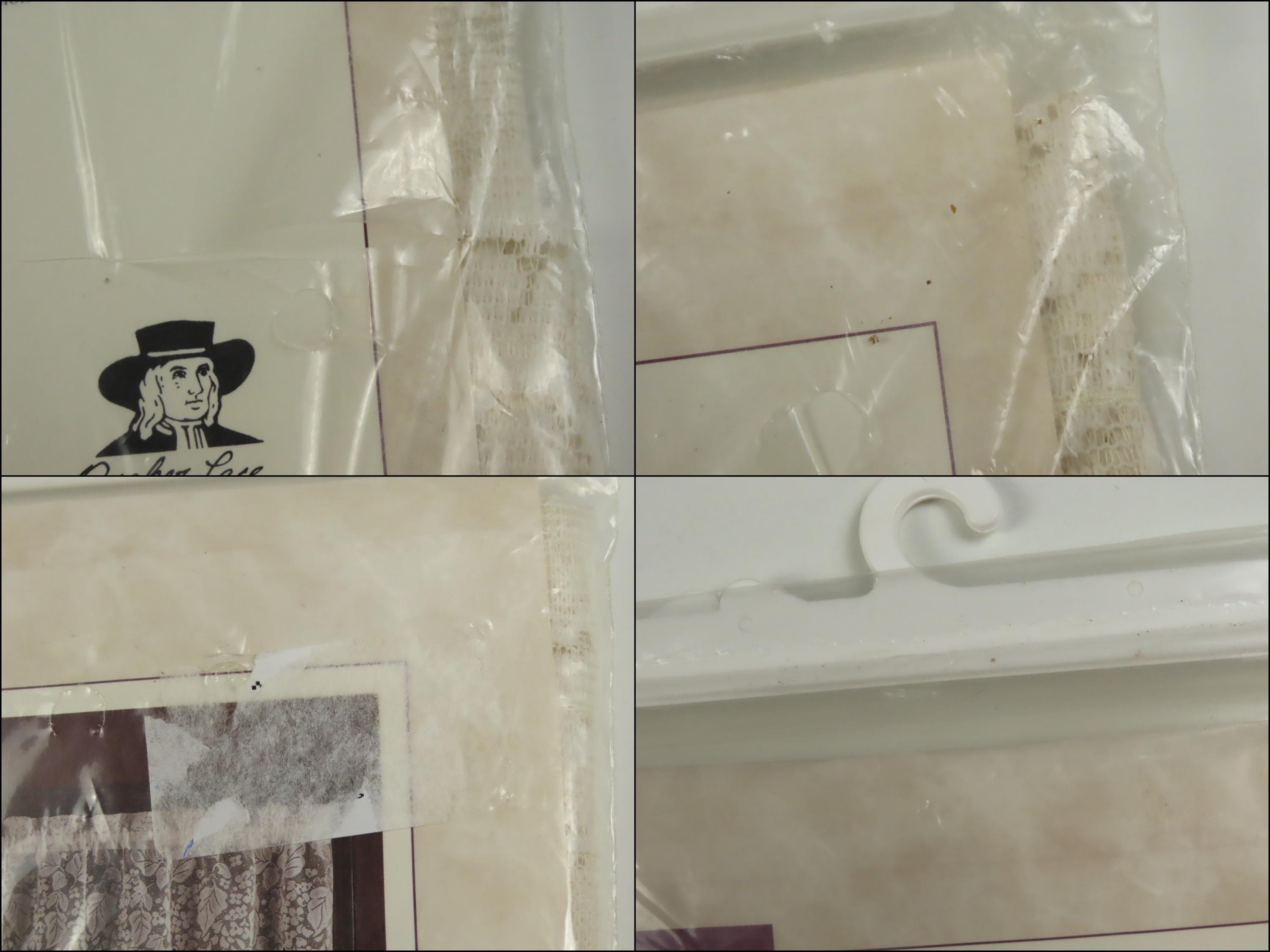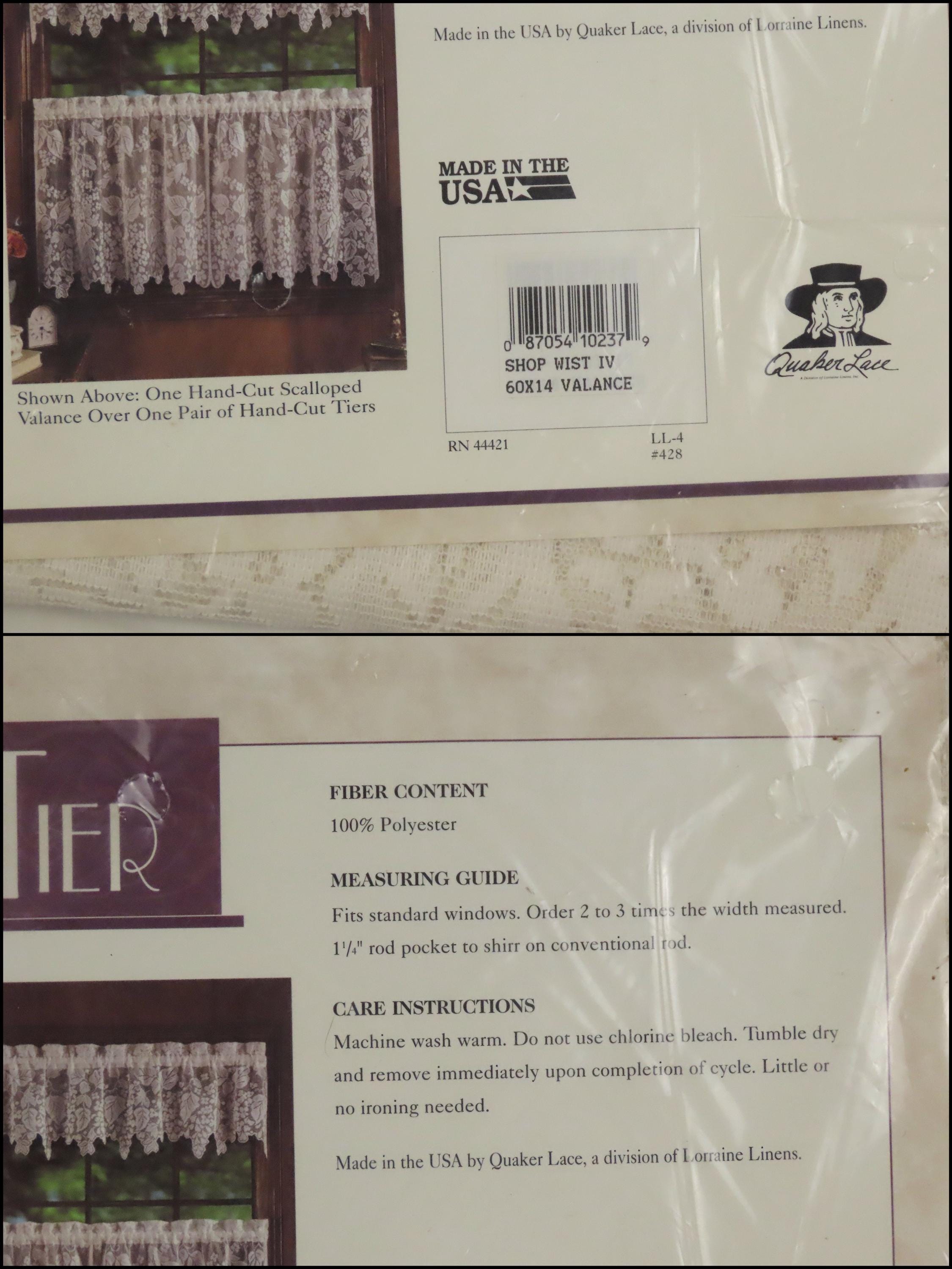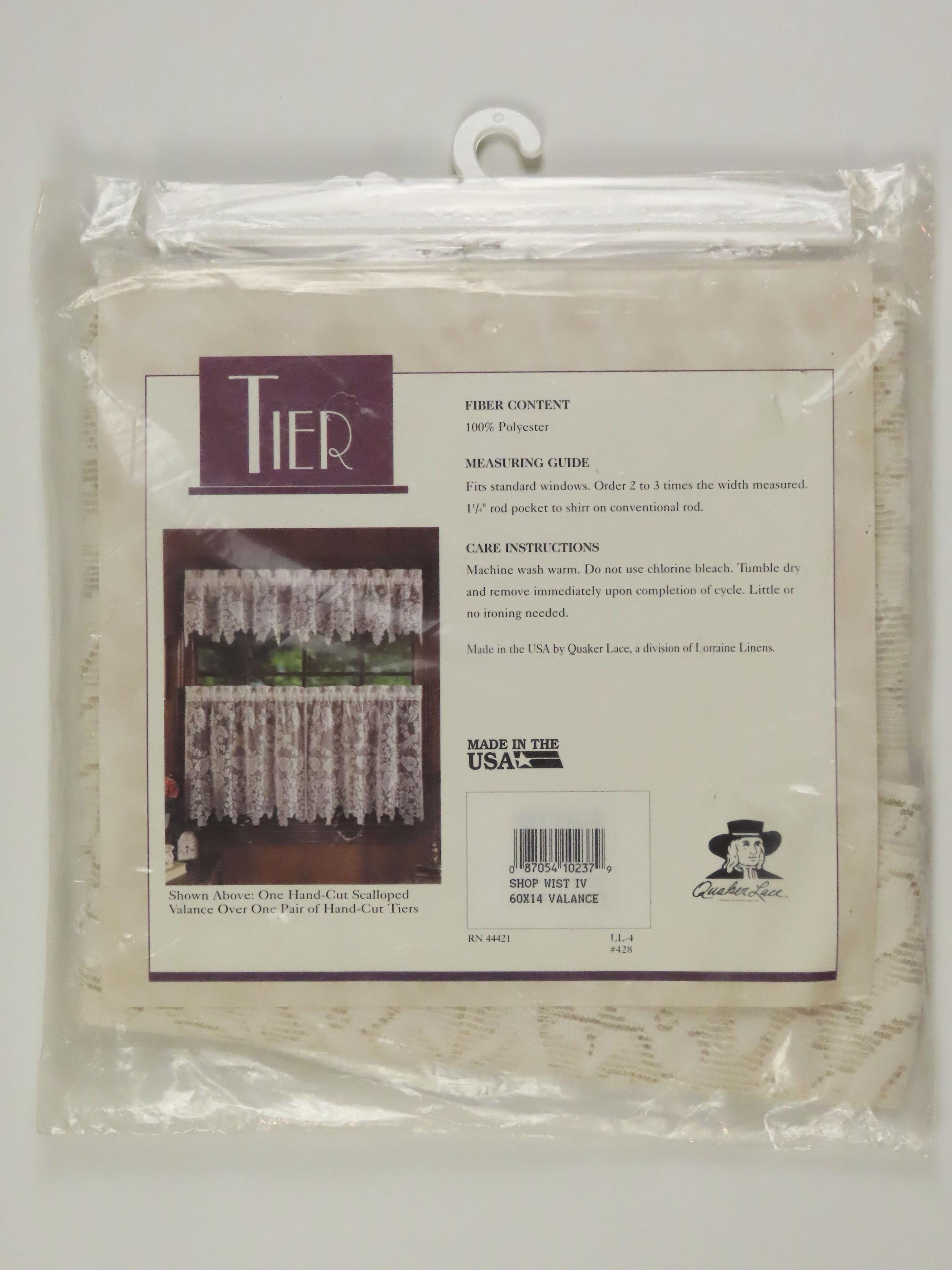 Vintage Quaker Lace "Wisteria" floral lace valance which is new in the package. It is 100% polyester and measures 60" by 14" with a 1 1/4 rod pocket. My camera had a hard time picking up the exact color, but it is an off-white or a light beige/cream. The plastic packaging is worn. It has a slit/hole, old sticker residue, and some tiny marks on the plastic. There is some loose dust/debris inside the packaging.