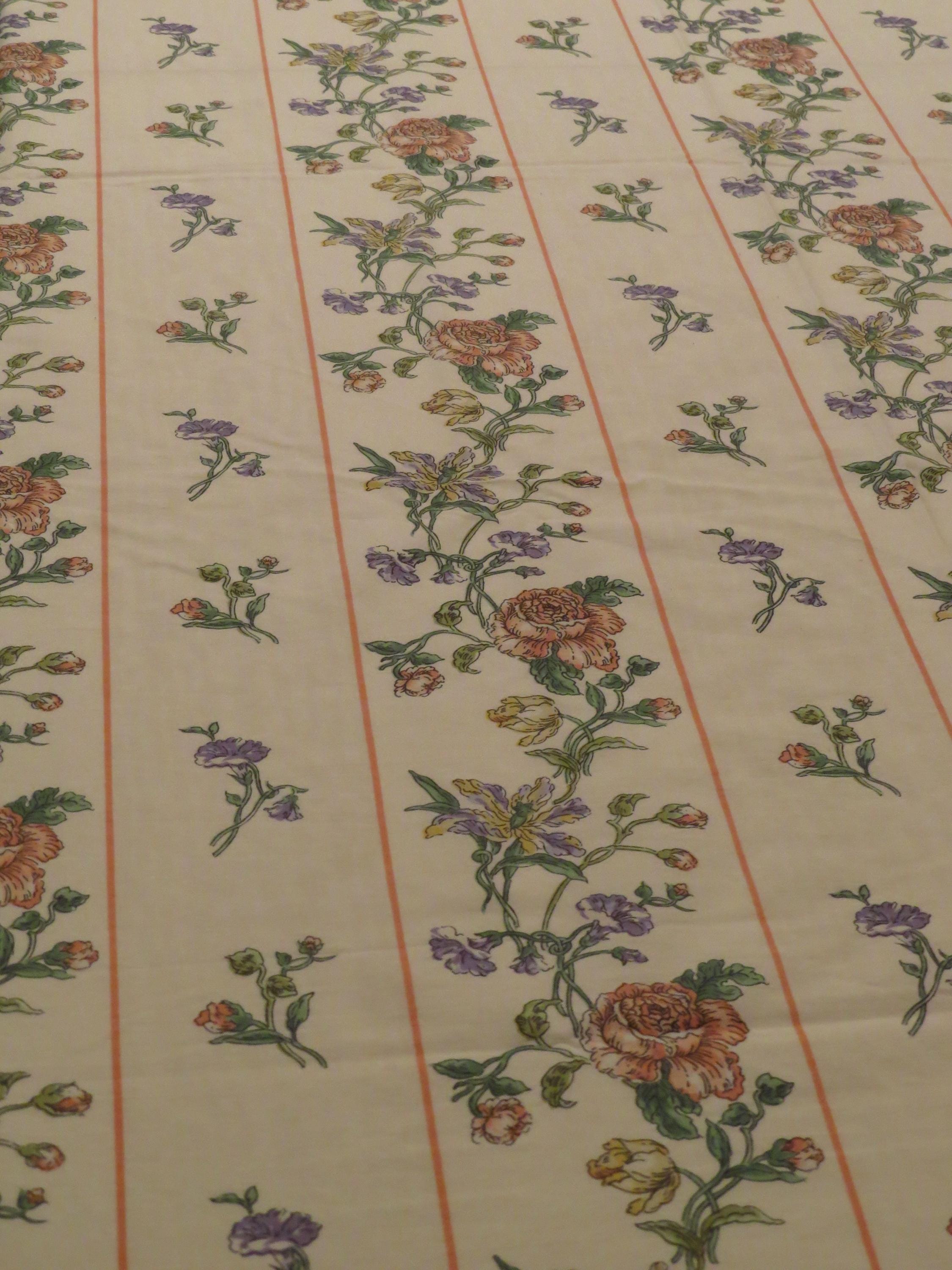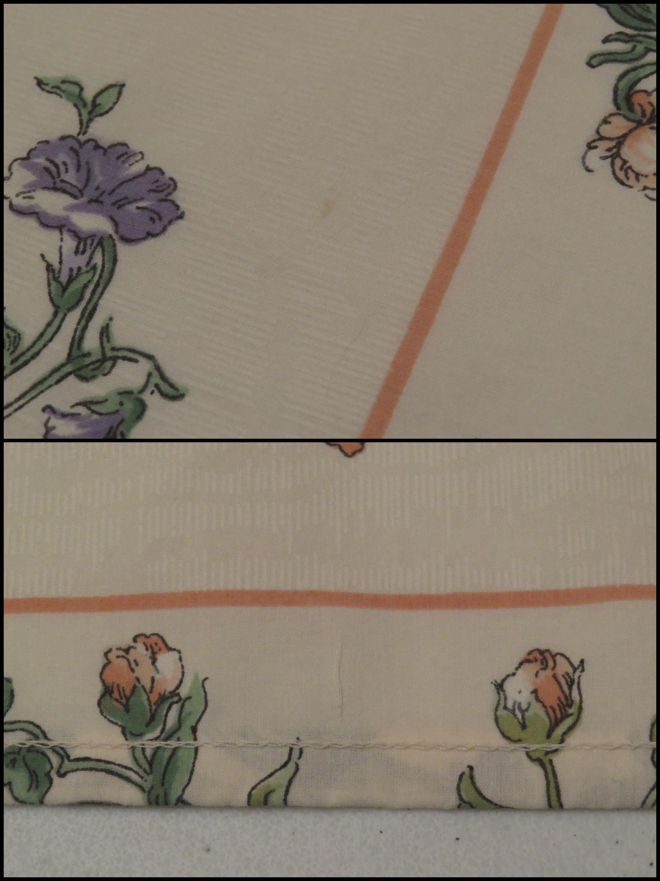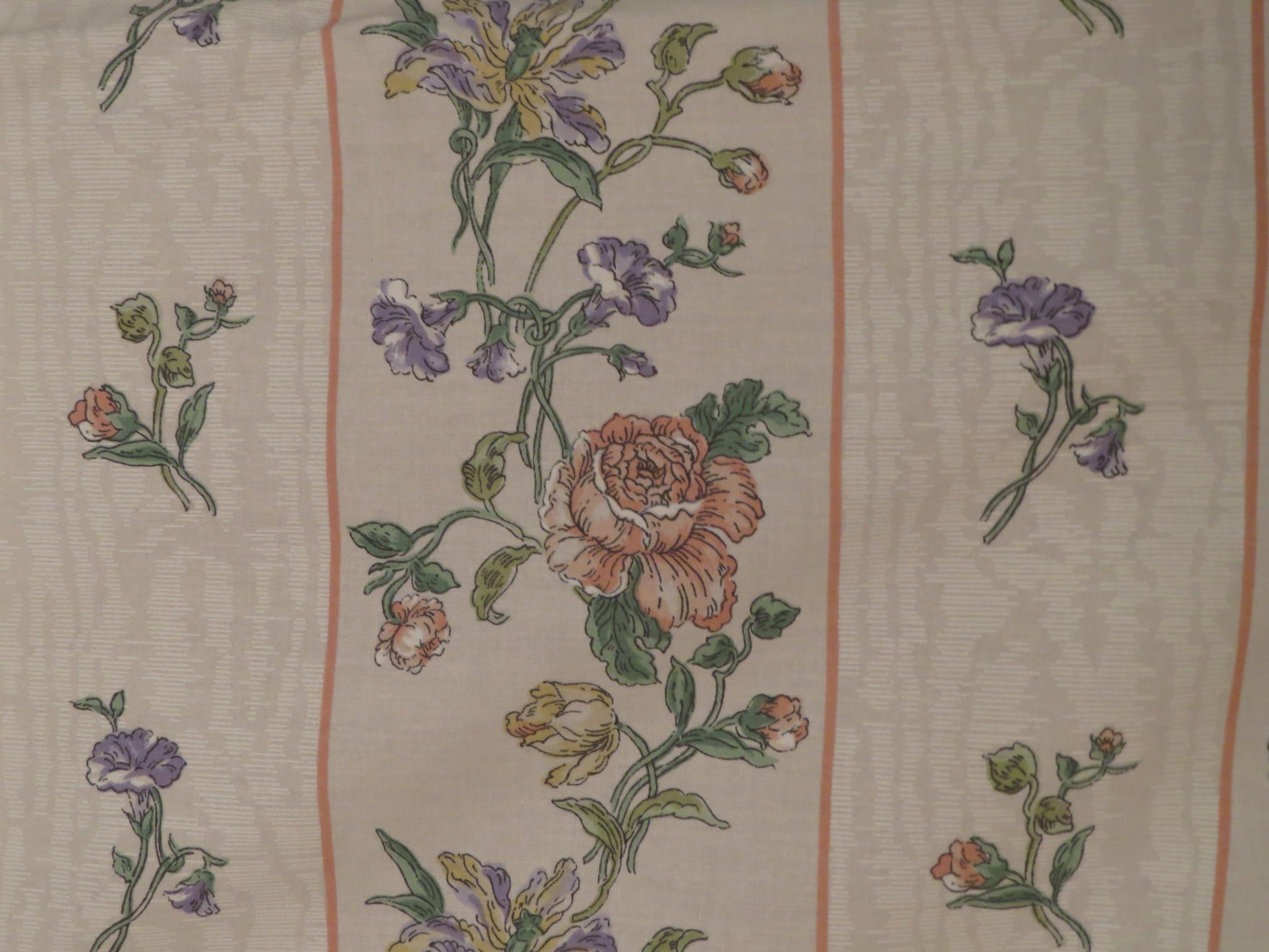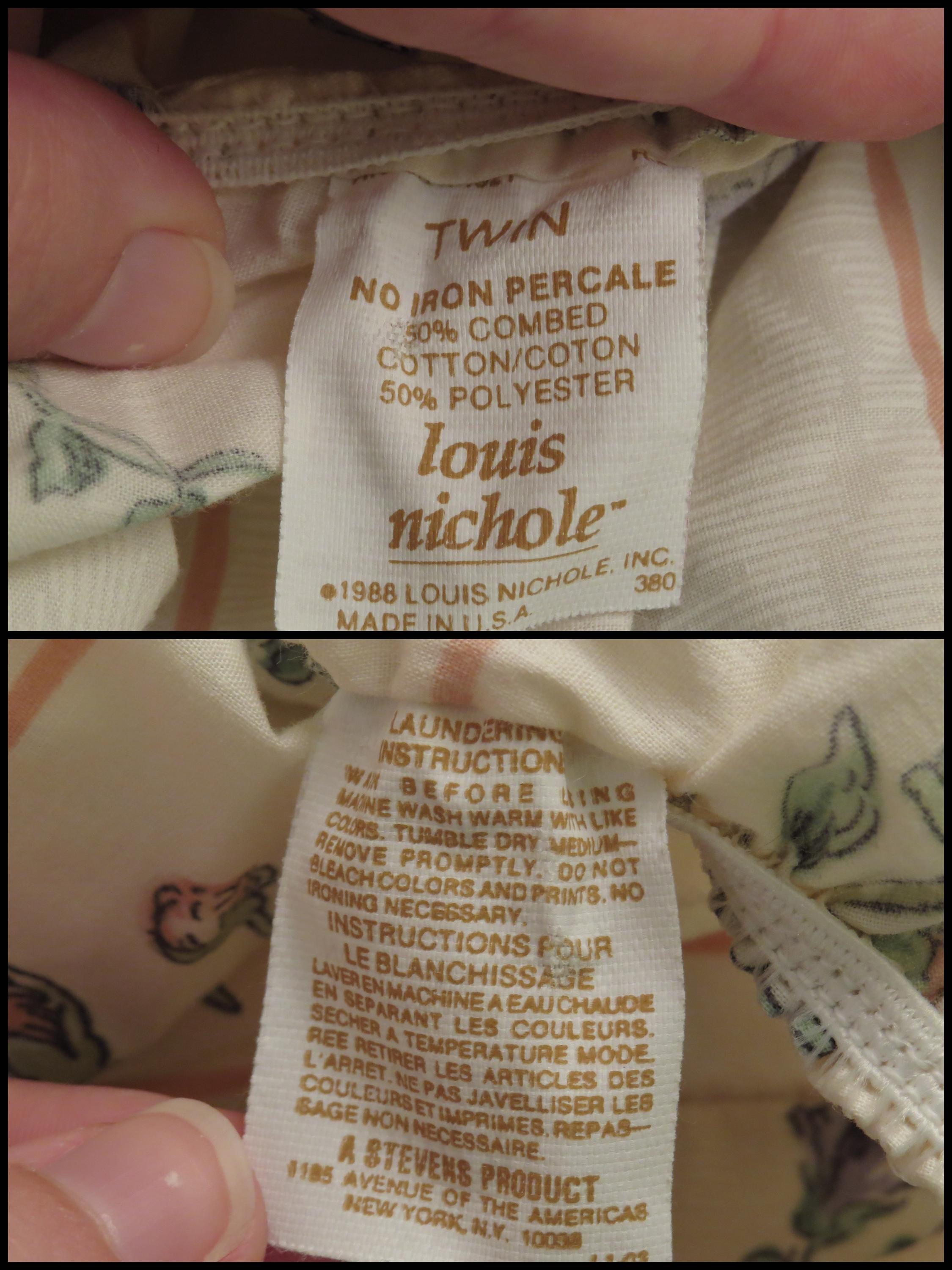 Vintage Louis Nichole floral flat and fitted sheets from 1988. They are 50% cotton and 50% polyester. The flat sheet has a small stain, and a missing thread spot (picture 4). The fitted sheet has multiple tiny marks/stains throughout the sheet (picture 5). The fitted sheet also has a small thread snag.